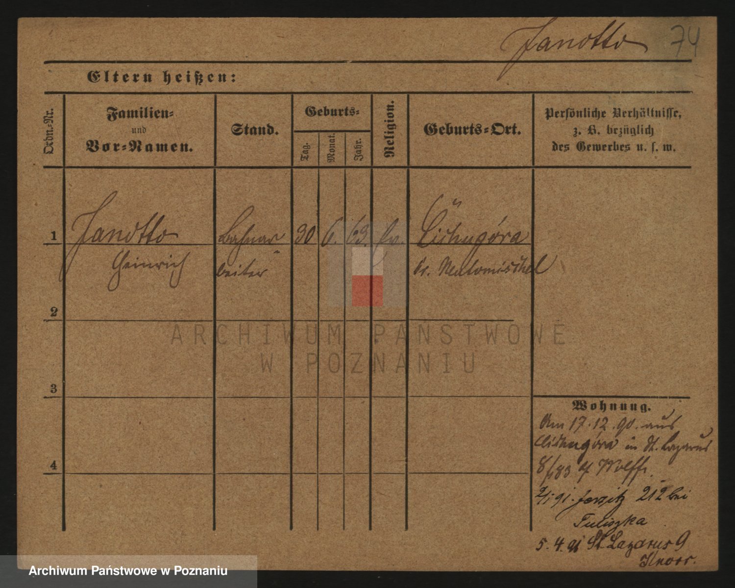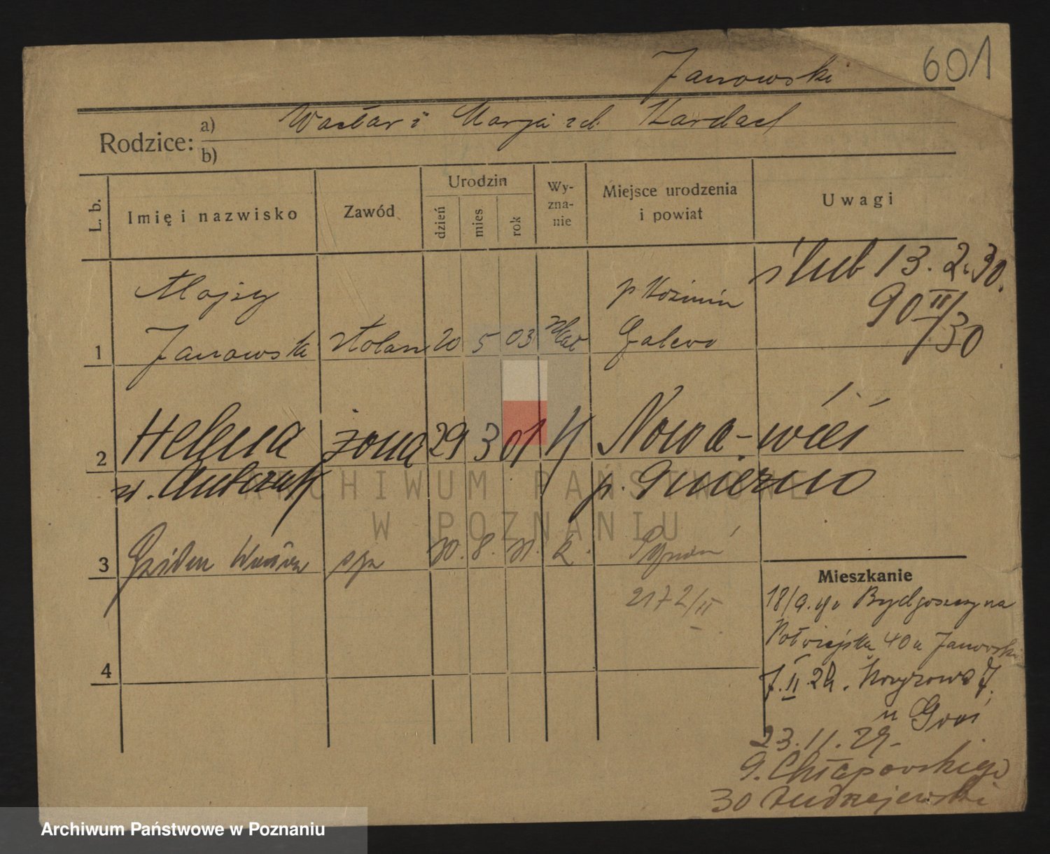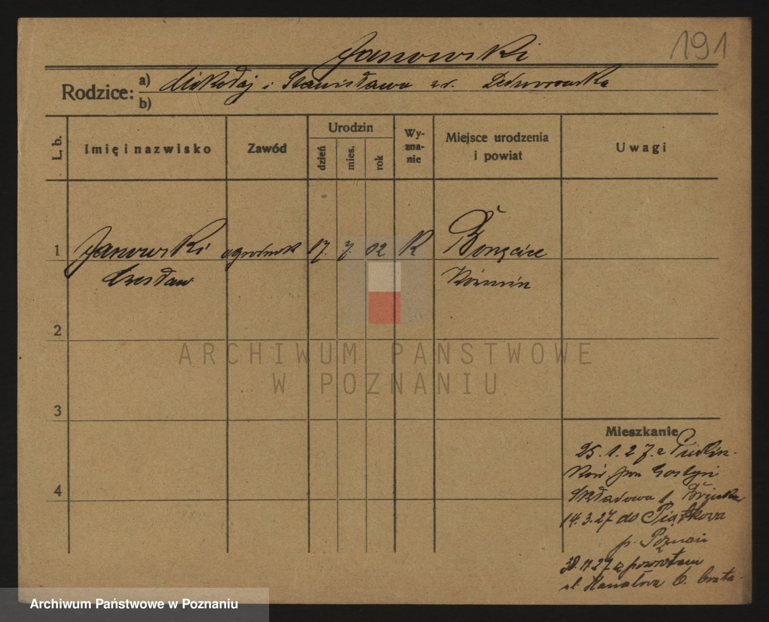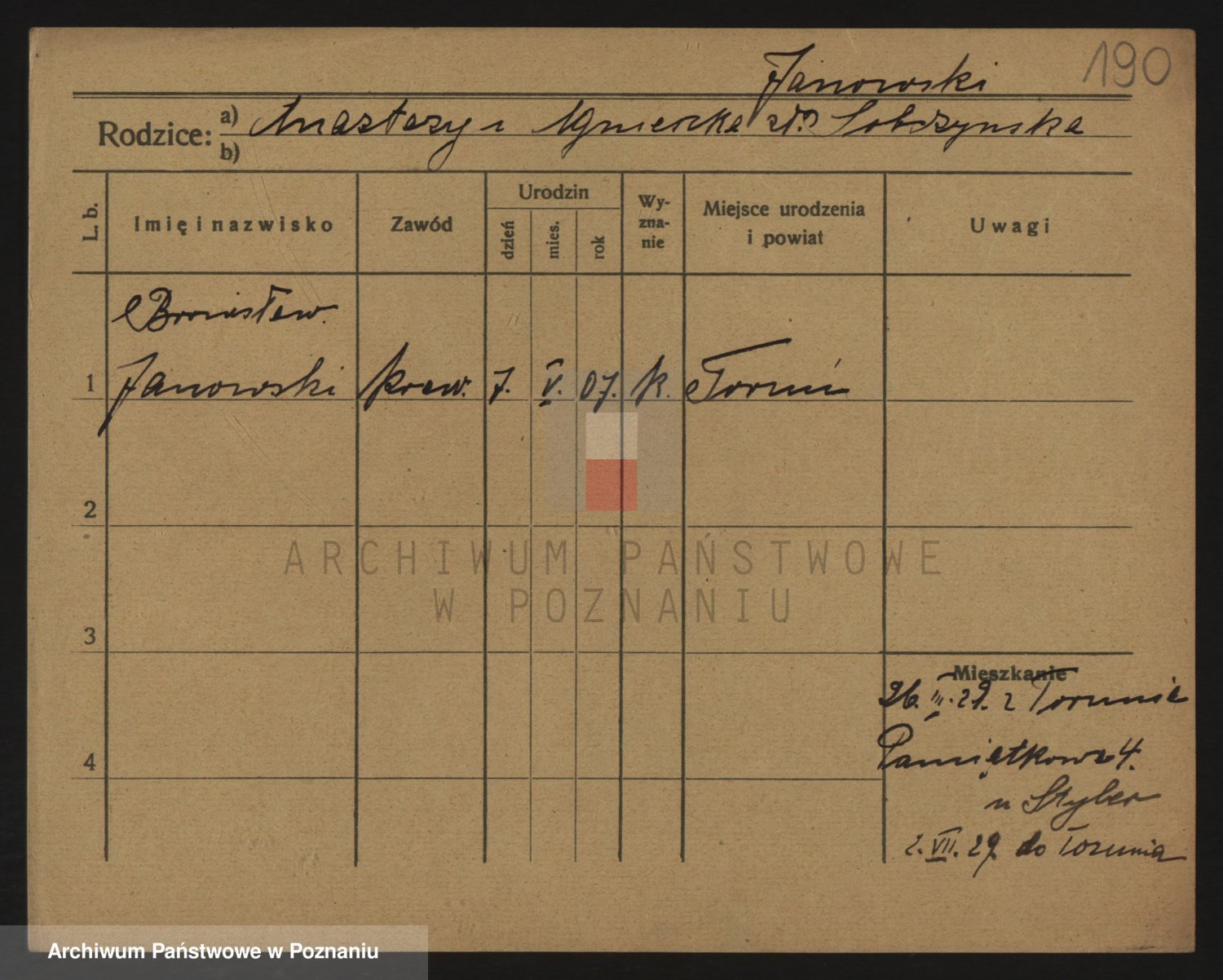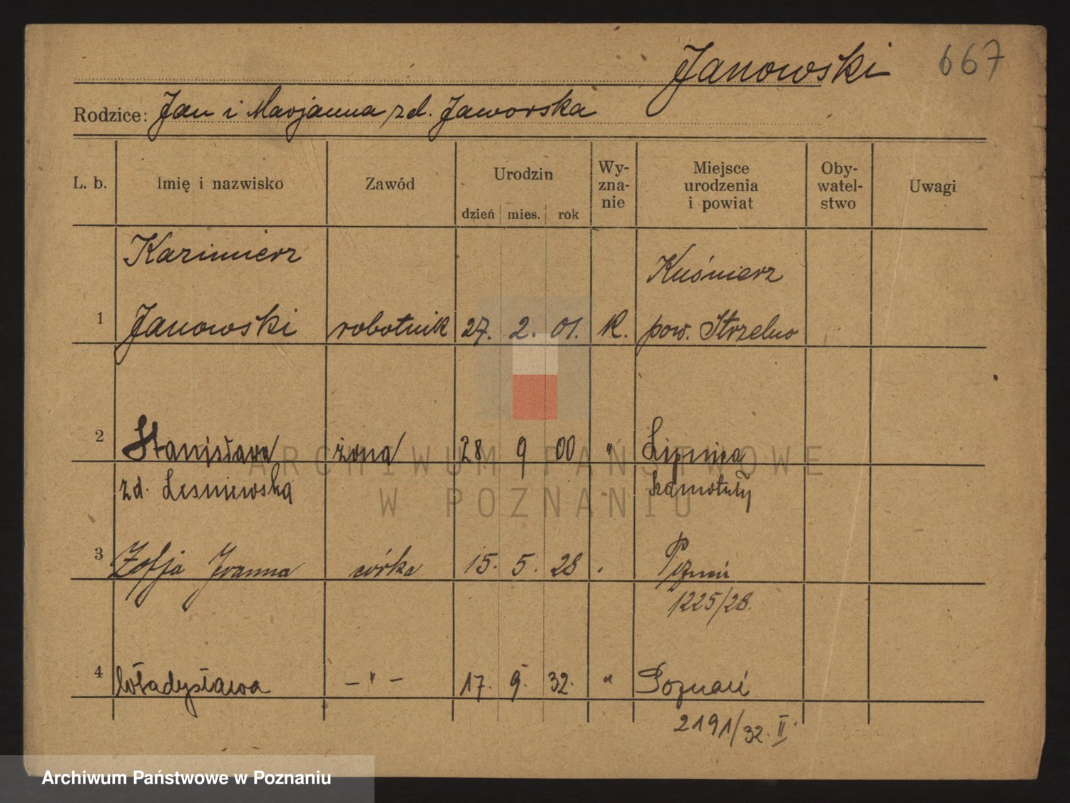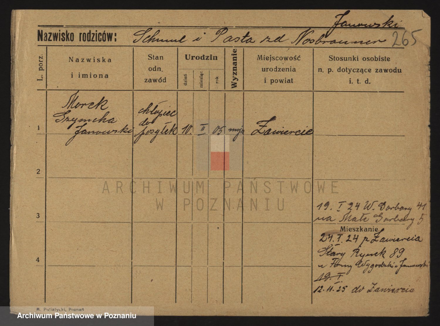 Podgląd karty osobowej dostępny jest po kliknięciu na nazwisko lub ikonkę karty. Można dokonywać powiększenia (ikony na górze) lub przechodzić między kolejnymi skanami (strzałki po bokach).