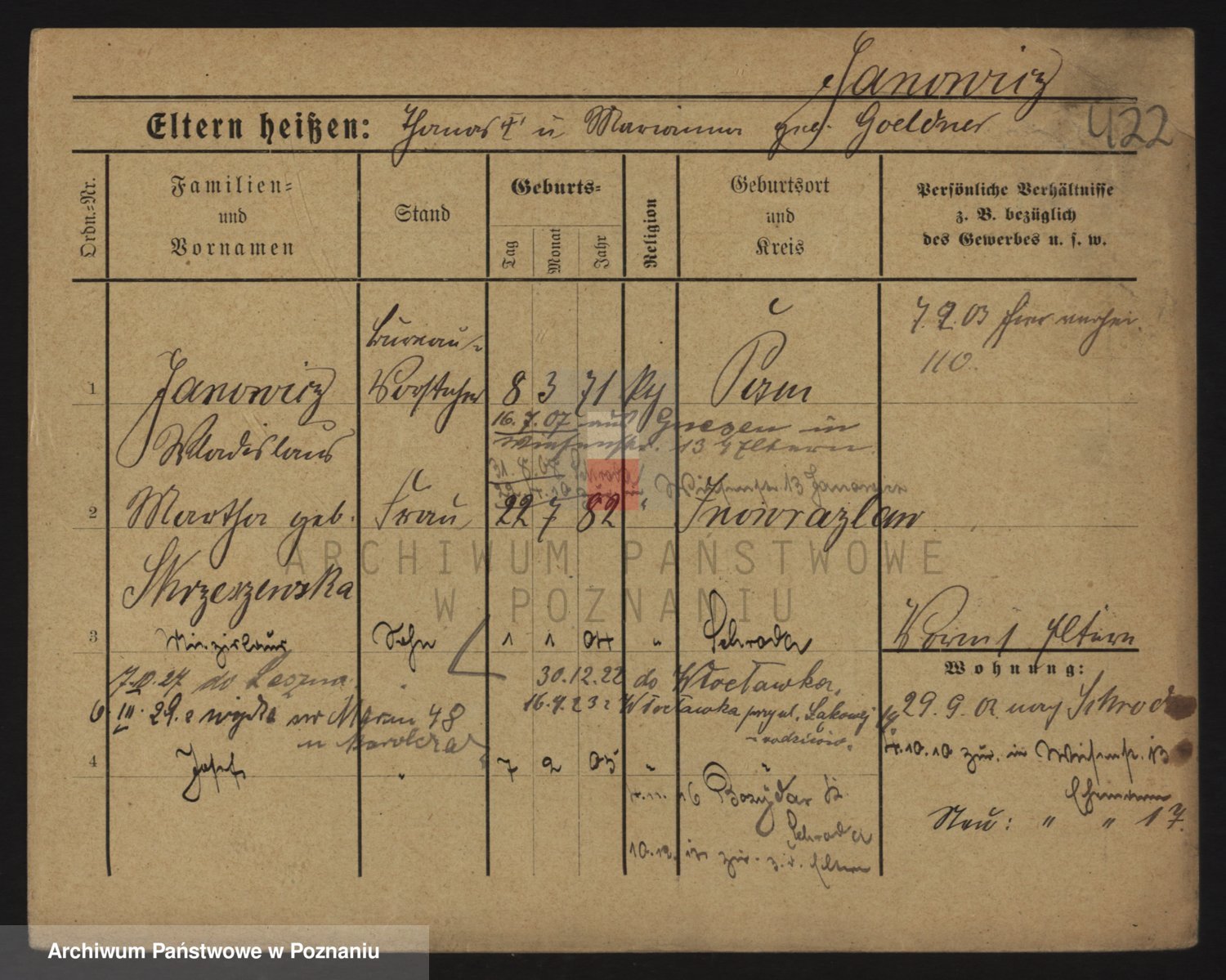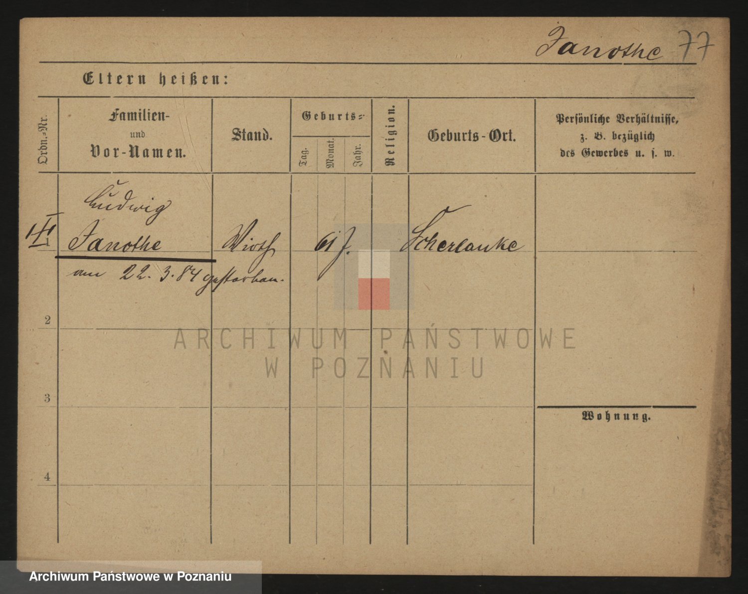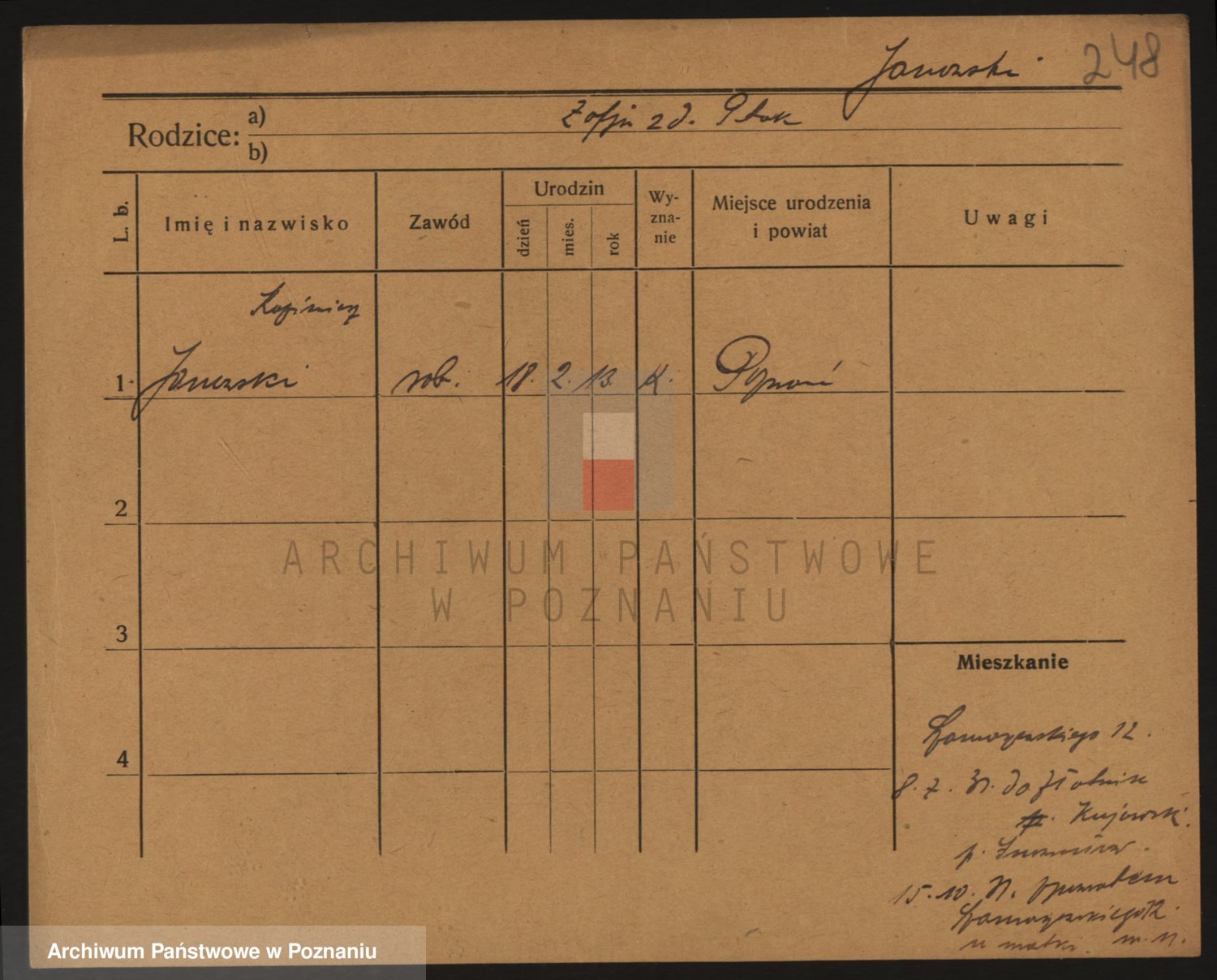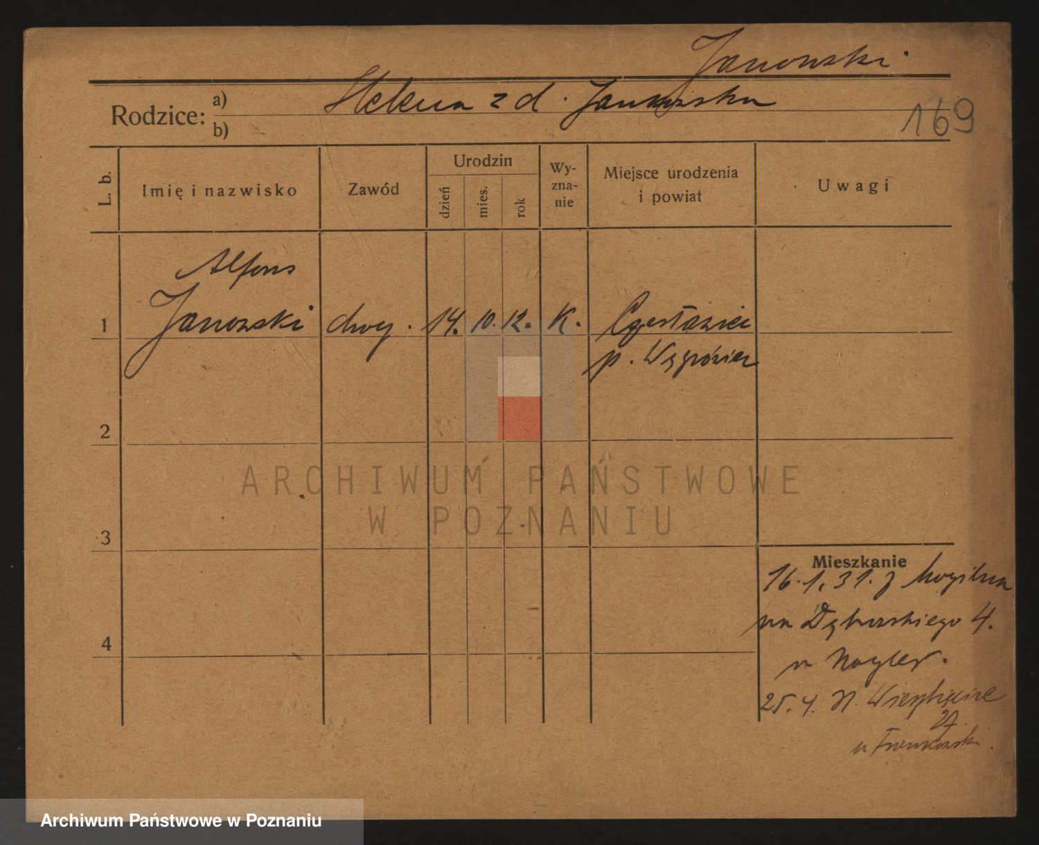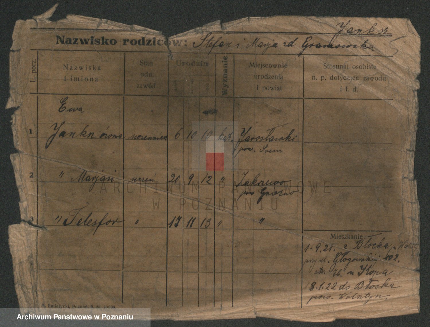 Podgląd karty osobowej dostępny jest po kliknięciu na nazwisko lub ikonkę karty. Można dokonywać powiększenia (ikony na górze) lub przechodzić między kolejnymi skanami (strzałki po bokach).