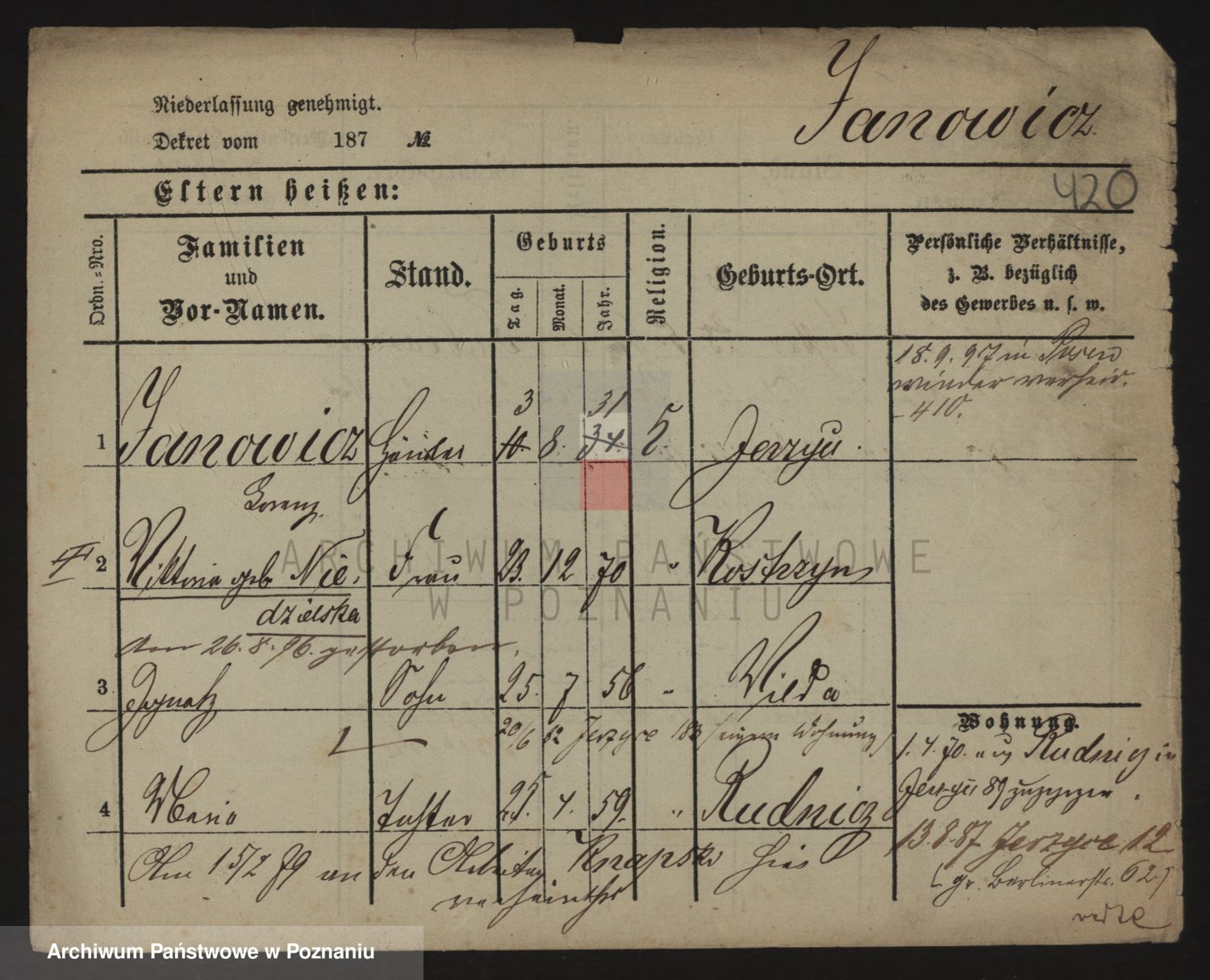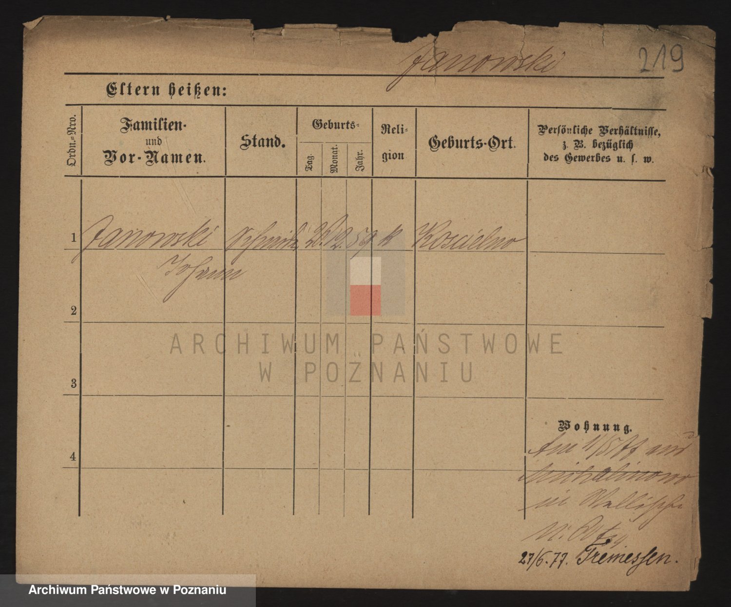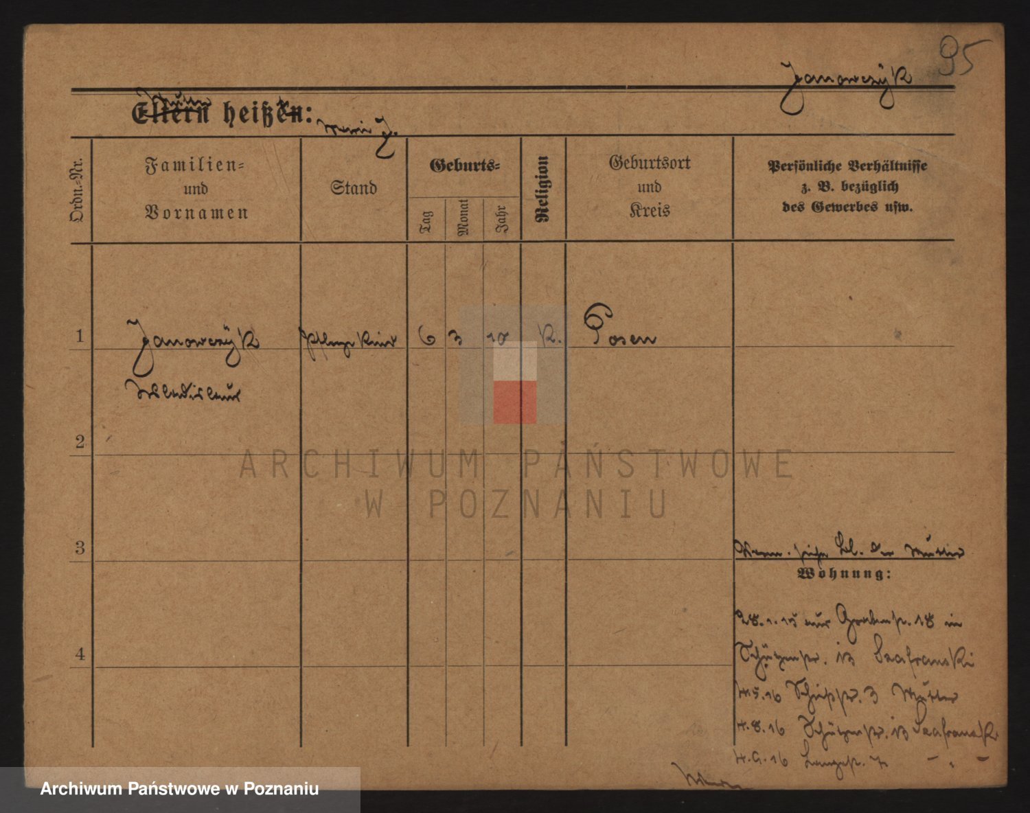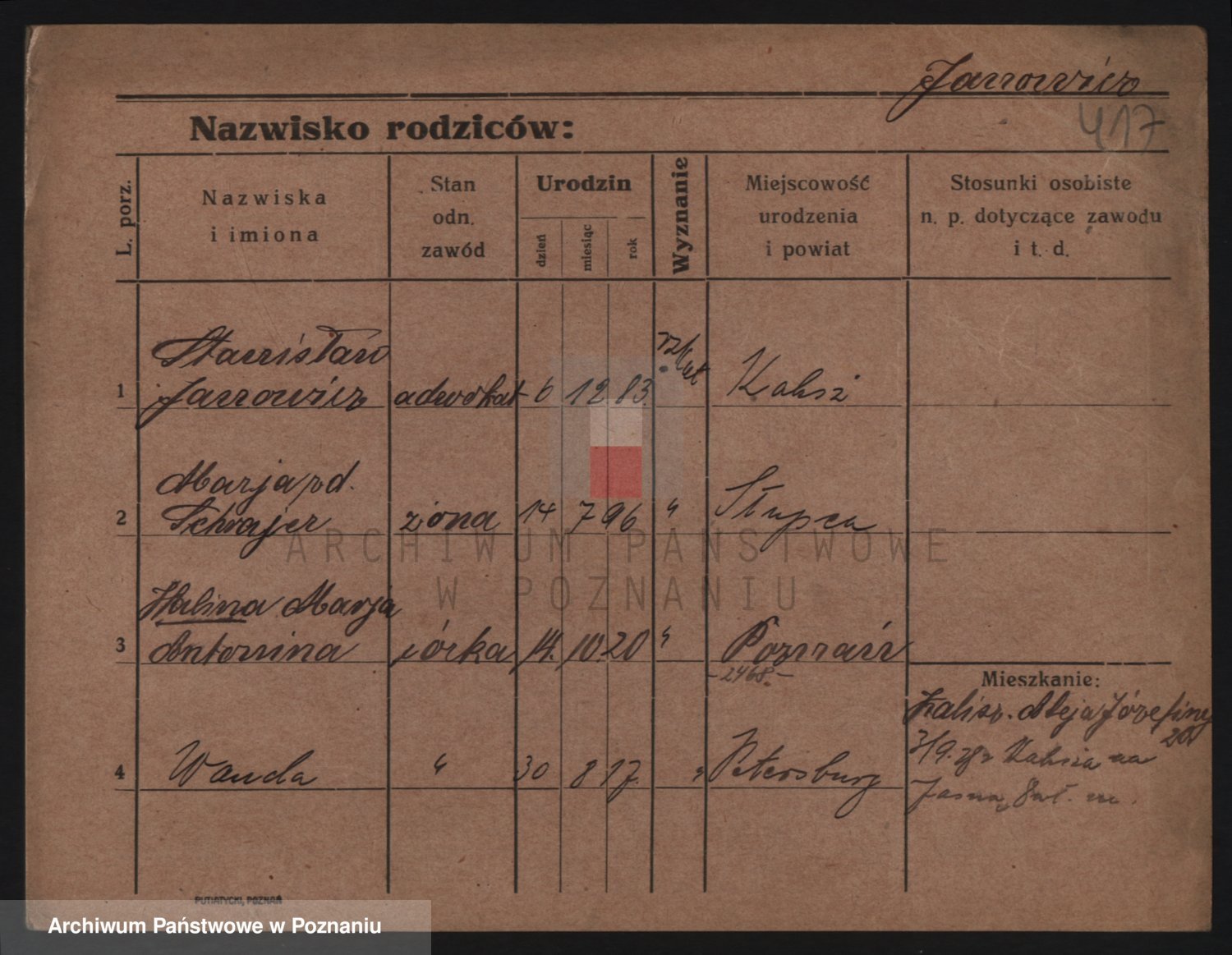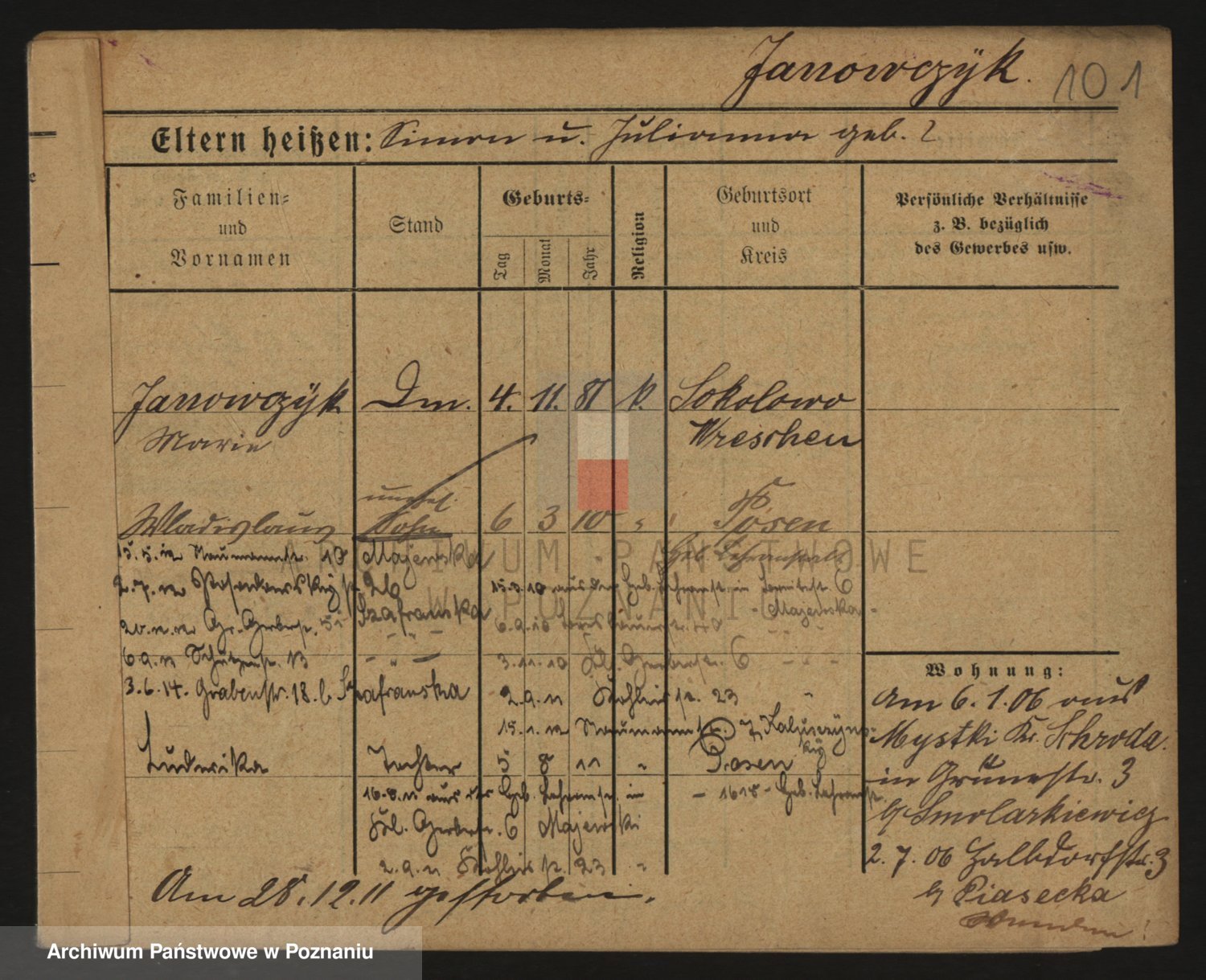 Podgląd karty osobowej dostępny jest po kliknięciu na nazwisko lub ikonkę karty. Można dokonywać powiększenia (ikony na górze) lub przechodzić między kolejnymi skanami (strzałki po bokach).