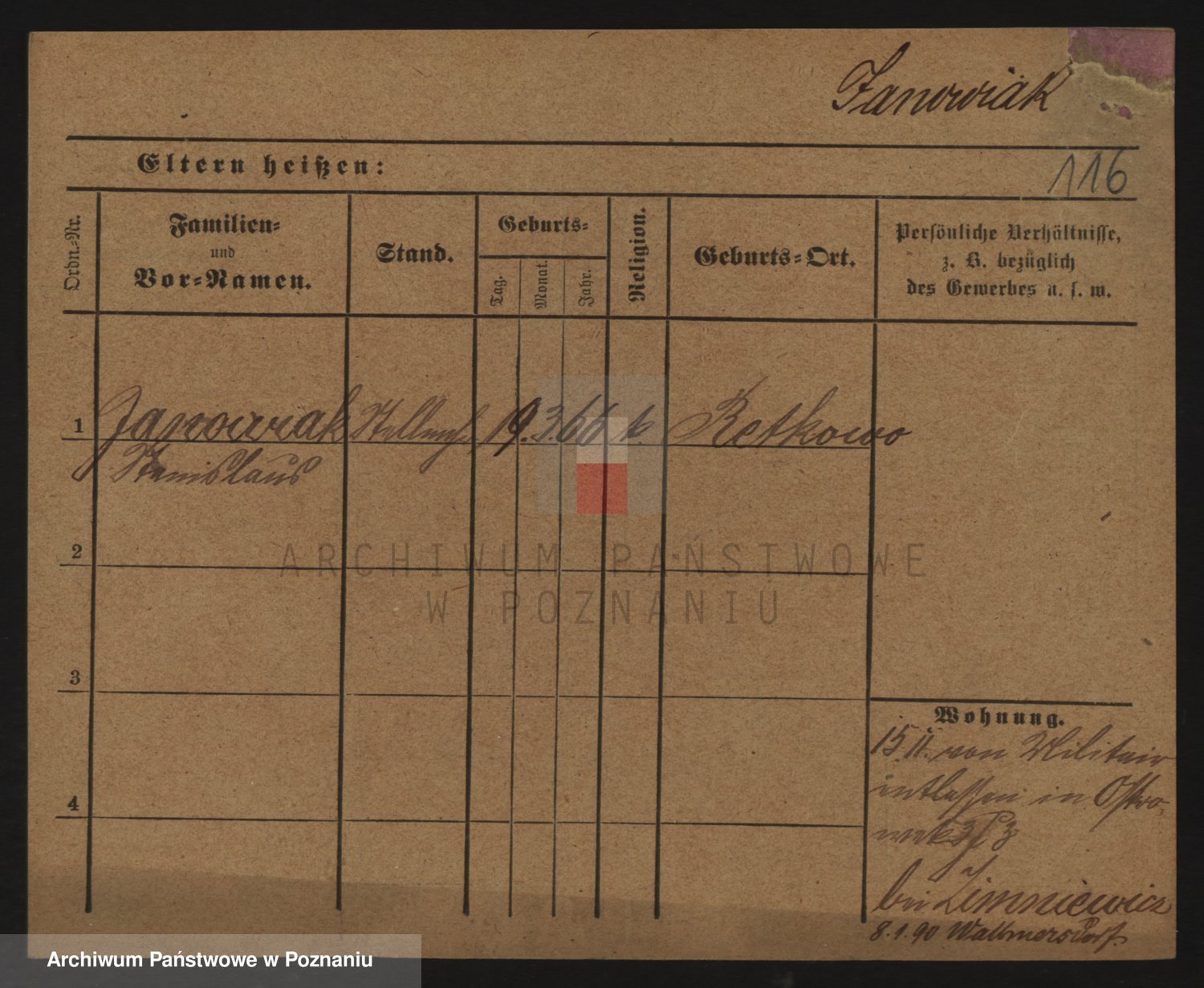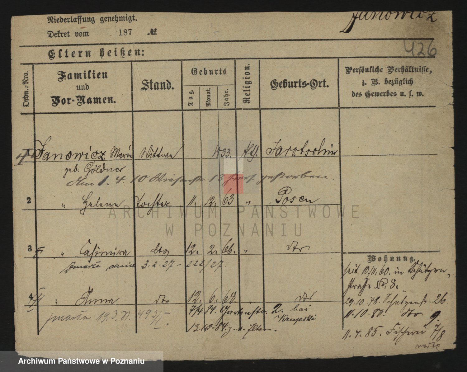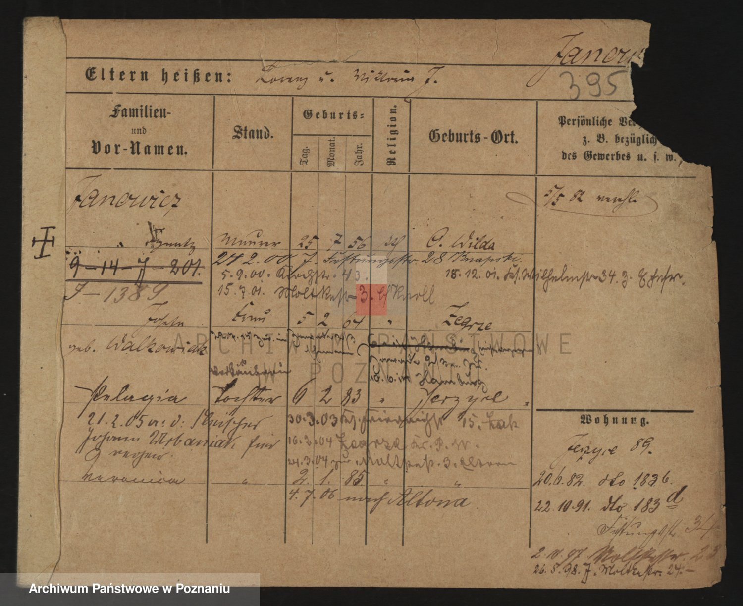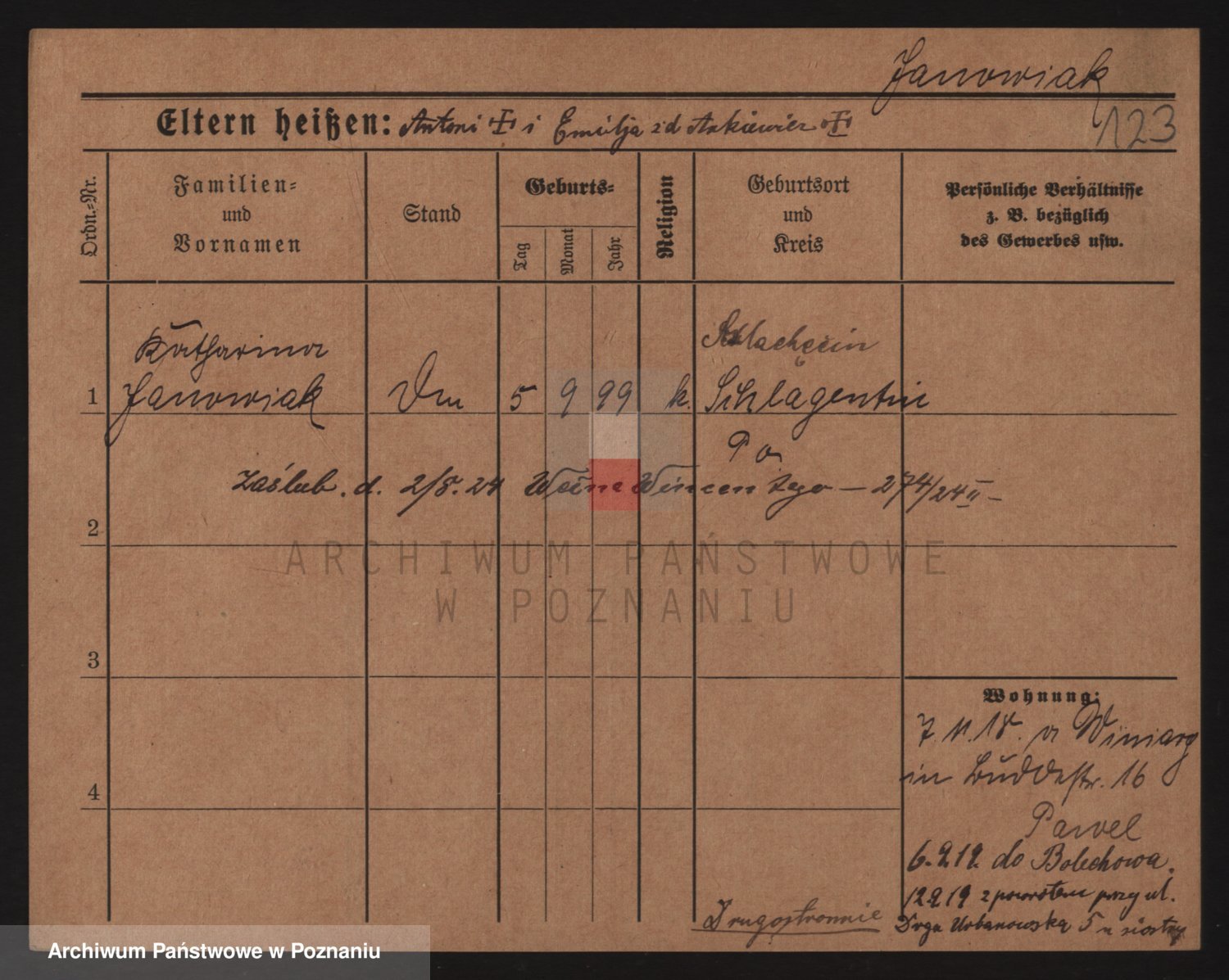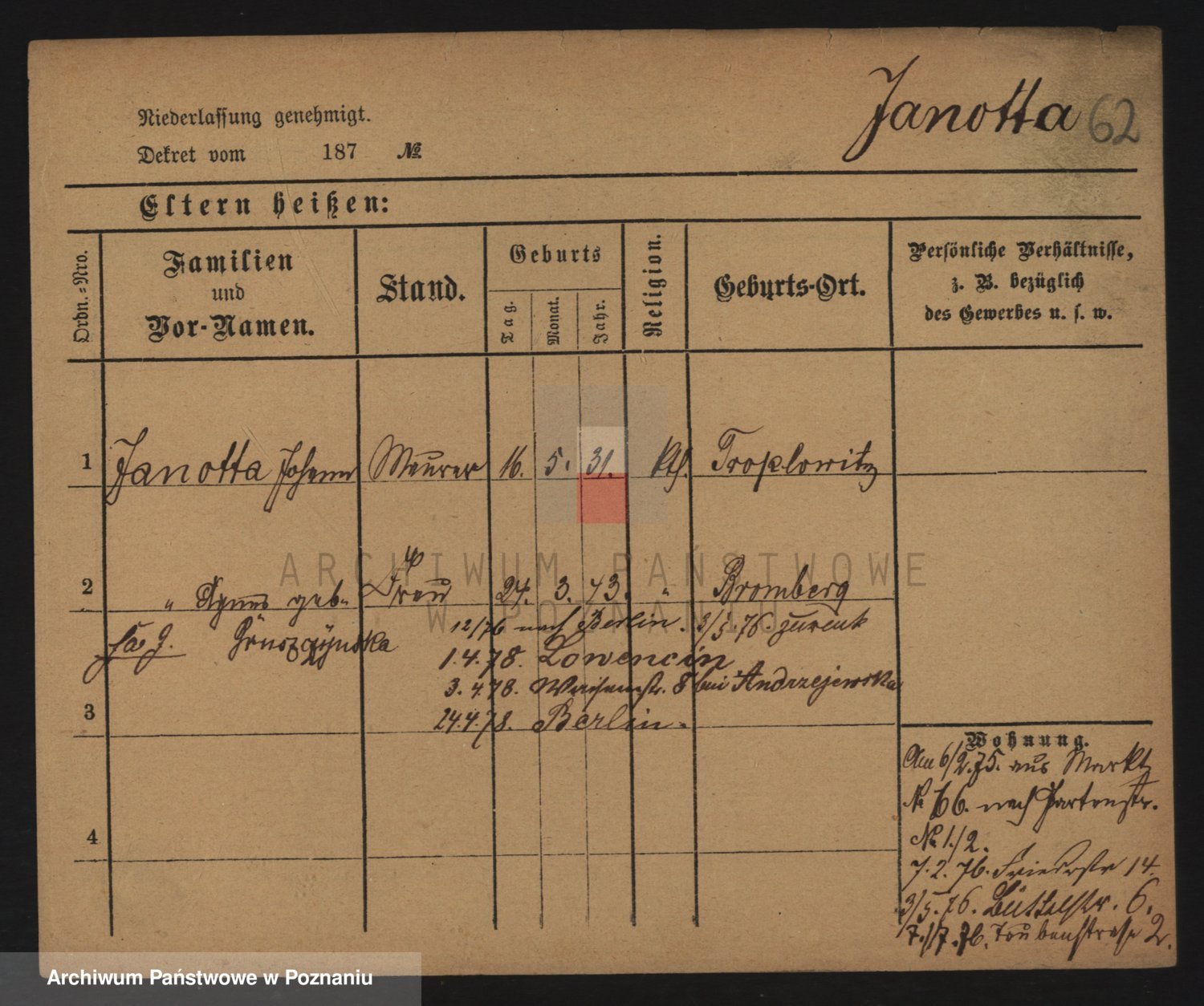 Podgląd karty osobowej dostępny jest po kliknięciu na nazwisko lub ikonkę karty. Można dokonywać powiększenia (ikony na górze) lub przechodzić między kolejnymi skanami (strzałki po bokach).