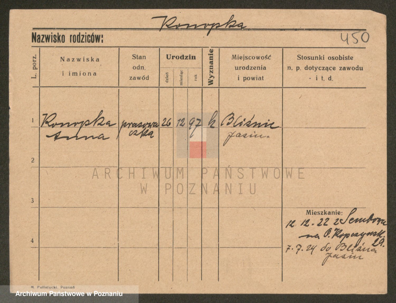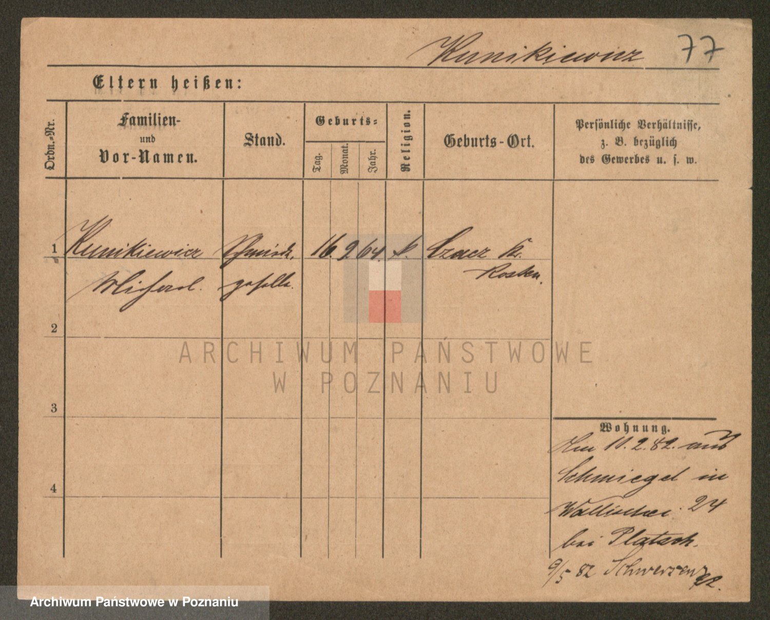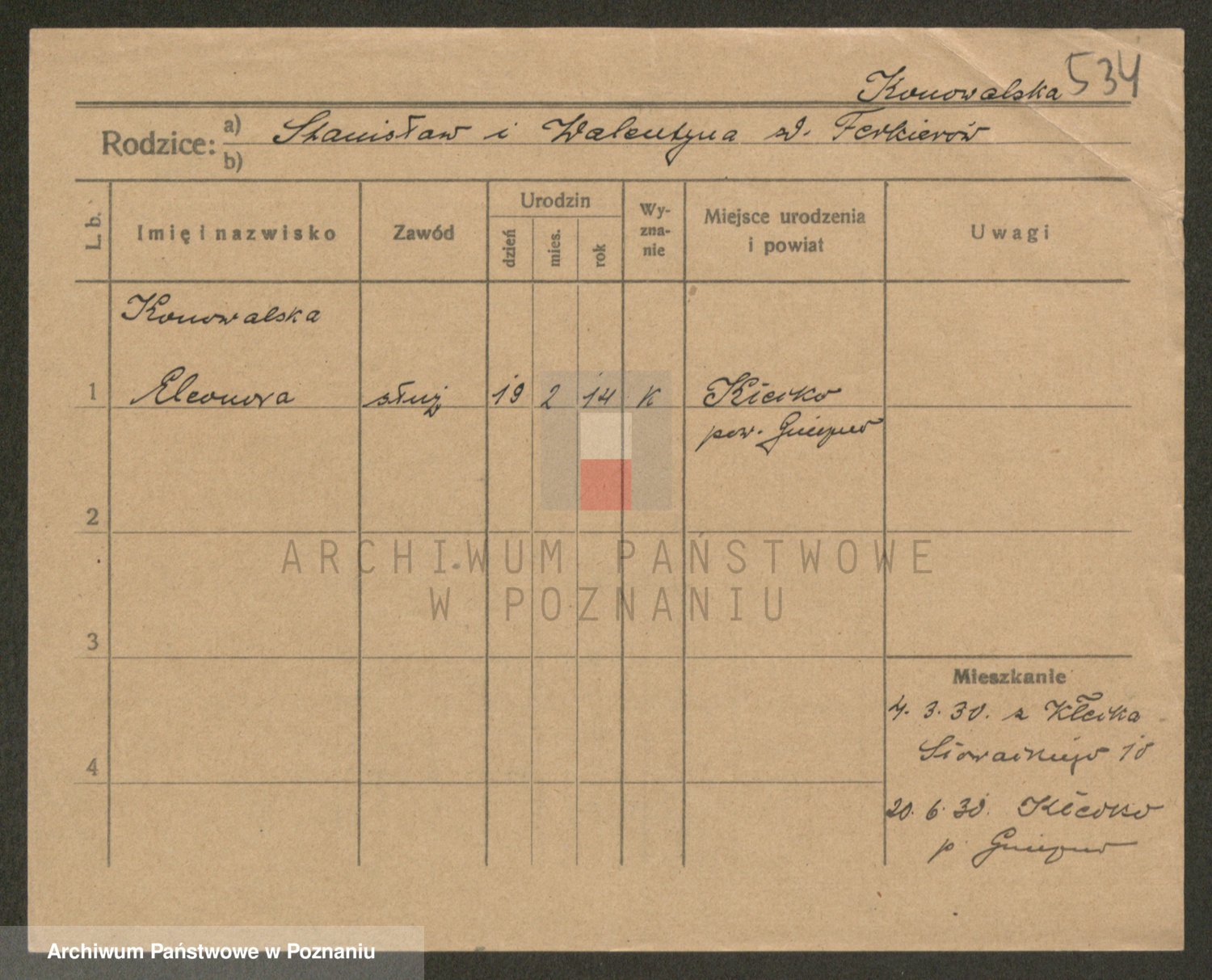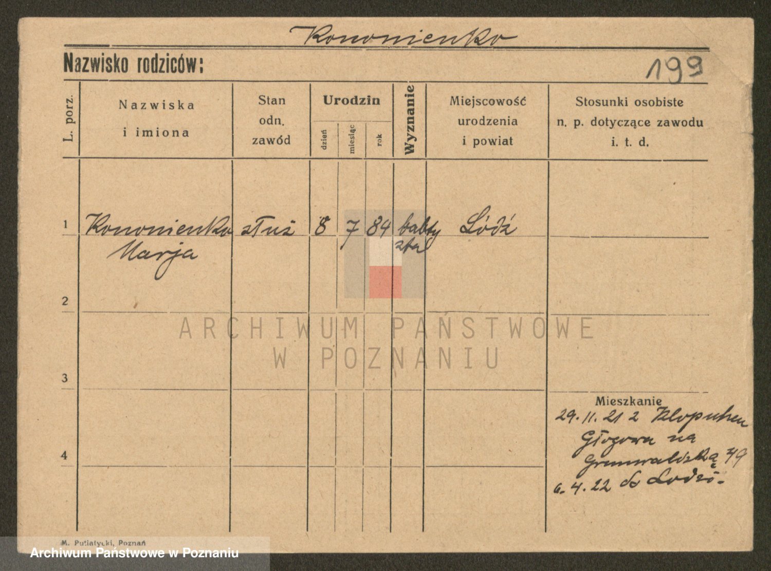 Podgląd karty osobowej dostępny jest po kliknięciu na nazwisko lub ikonkę karty. Można dokonywać powiększenia (ikony na górze) lub przechodzić między kolejnymi skanami (strzałki po bokach).