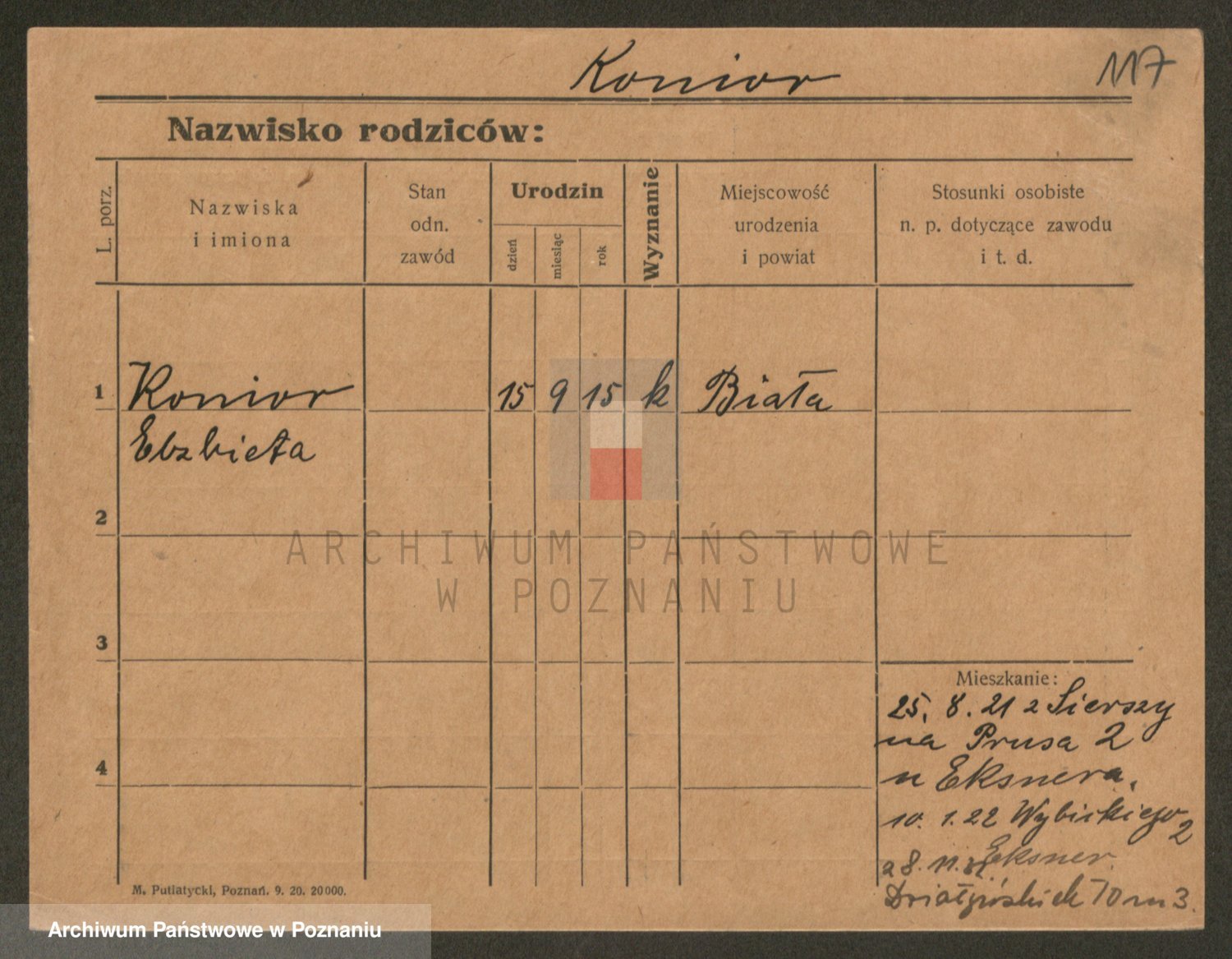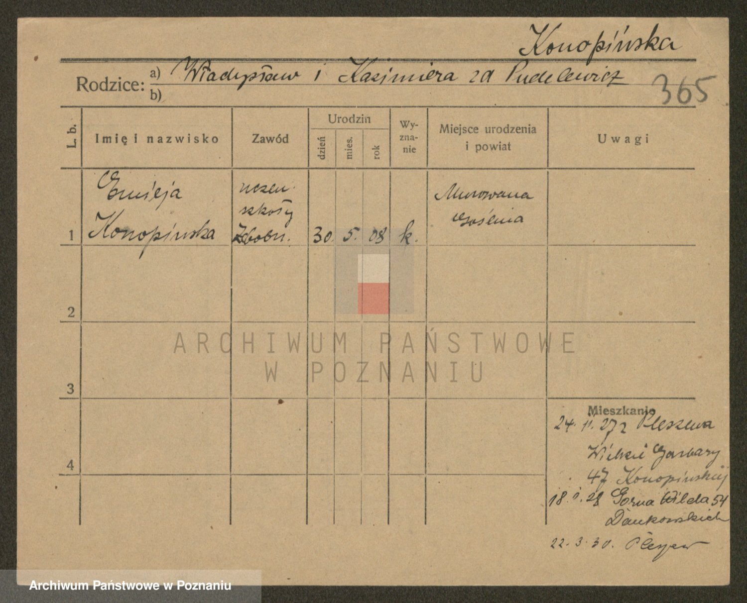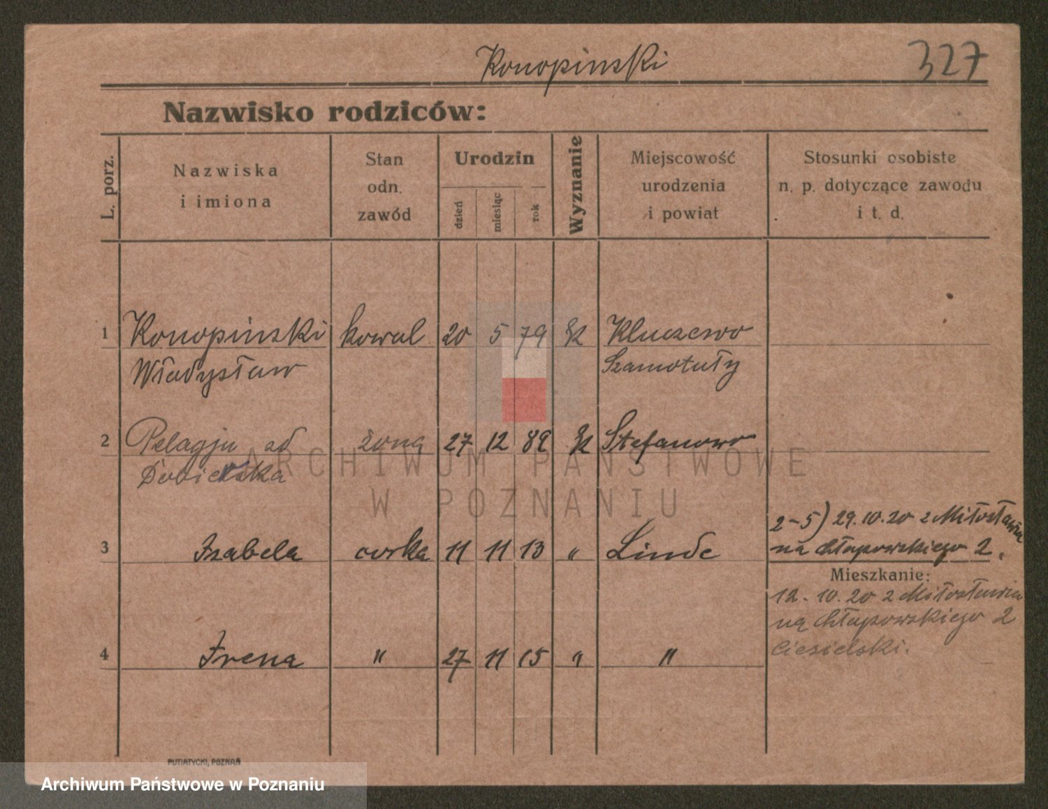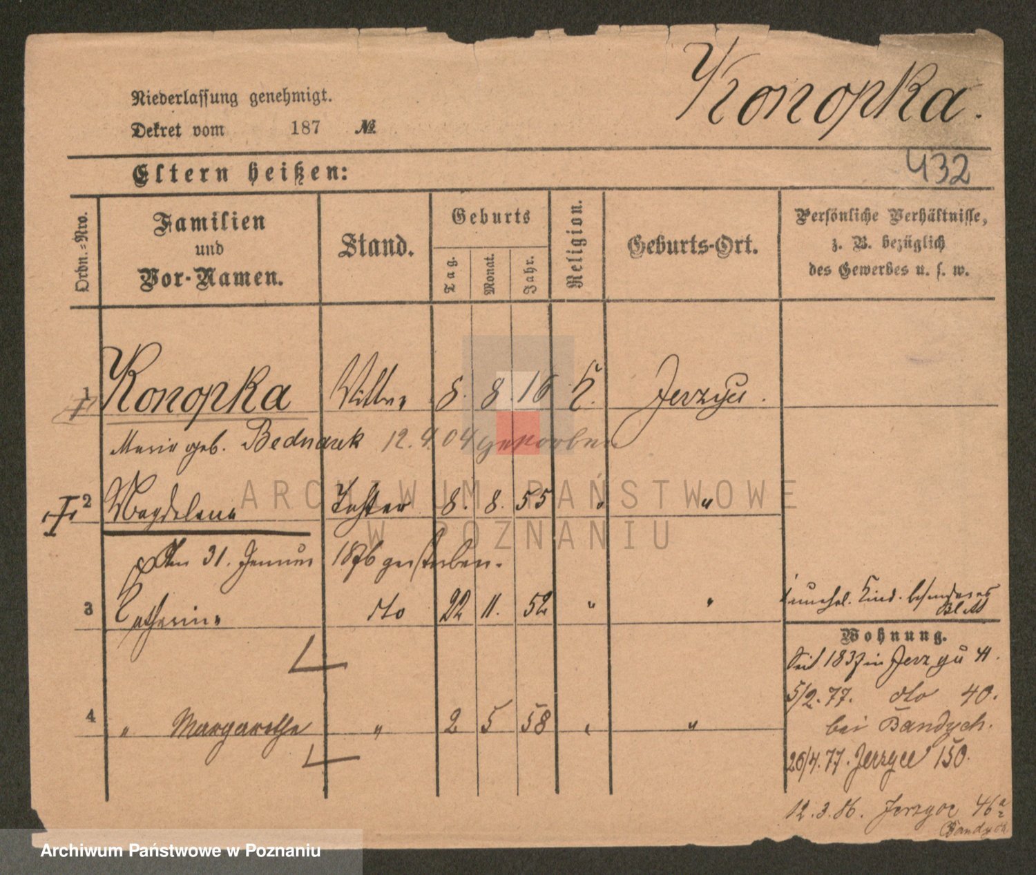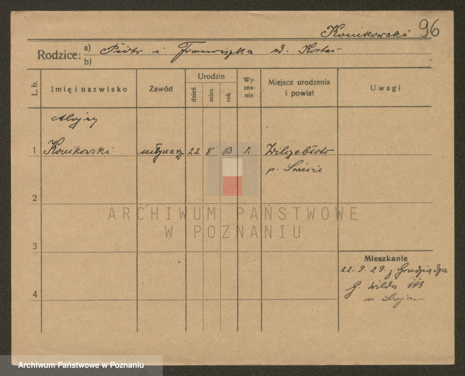 Podgląd karty osobowej dostępny jest po kliknięciu na nazwisko lub ikonkę karty. Można dokonywać powiększenia (ikony na górze) lub przechodzić między kolejnymi skanami (strzałki po bokach).