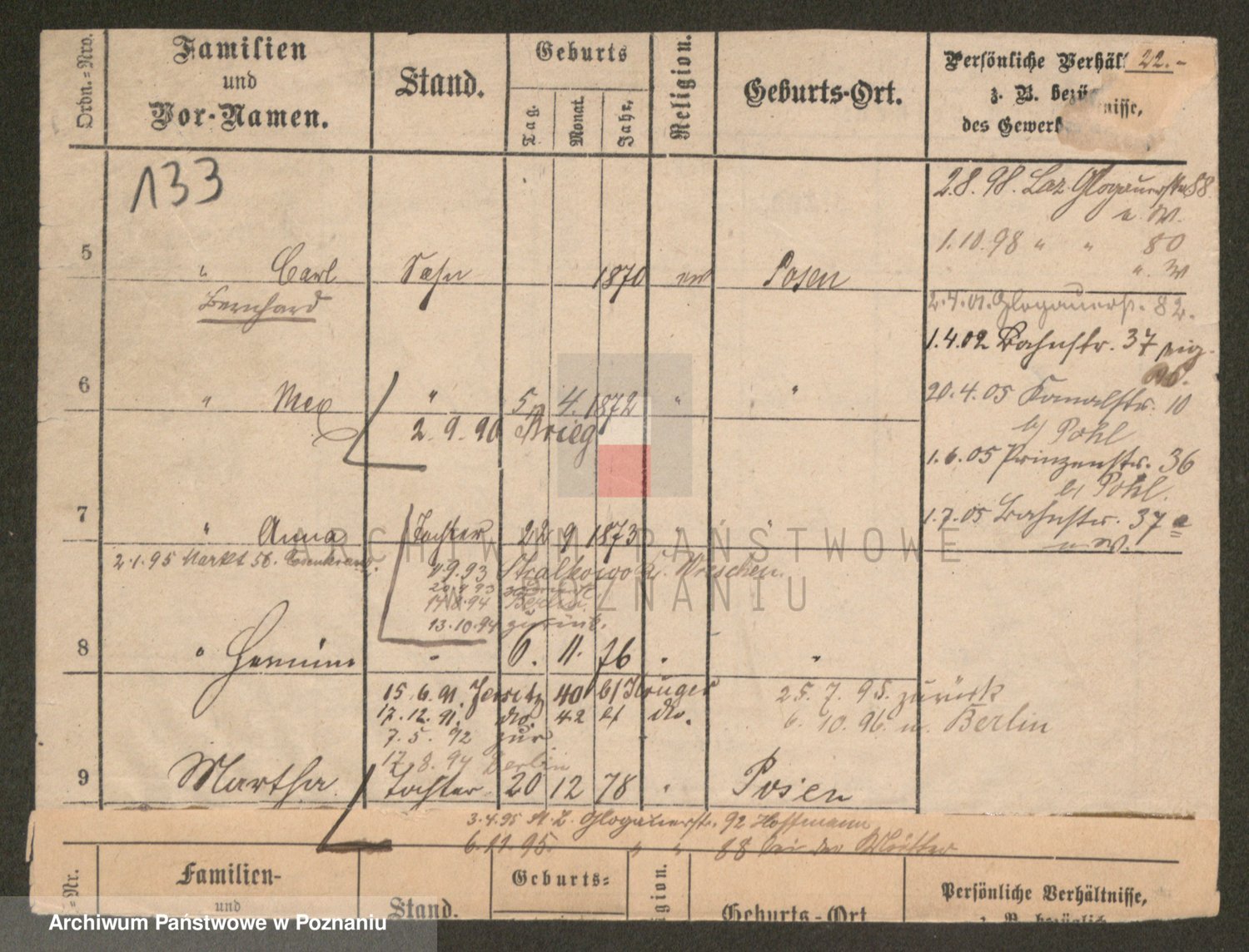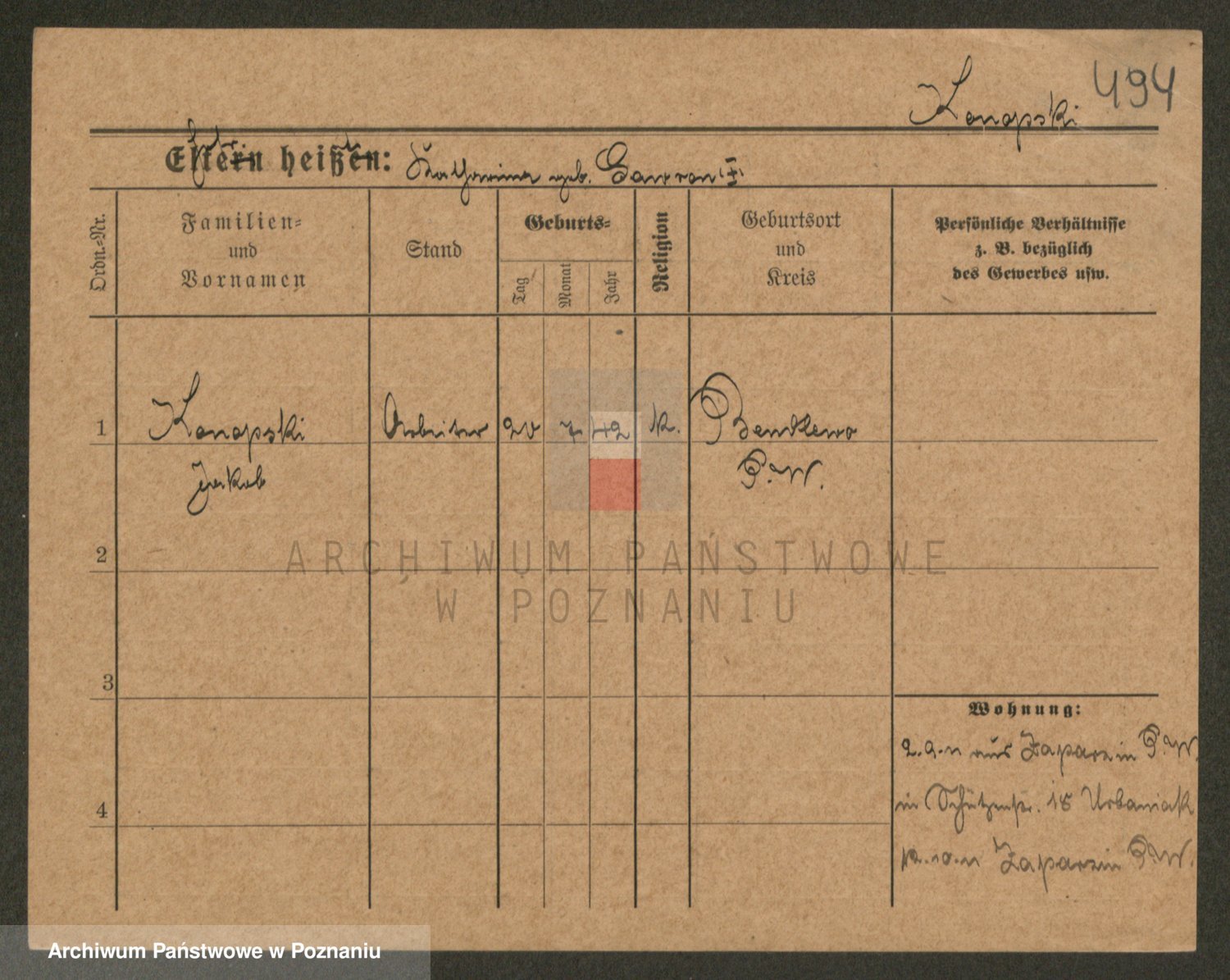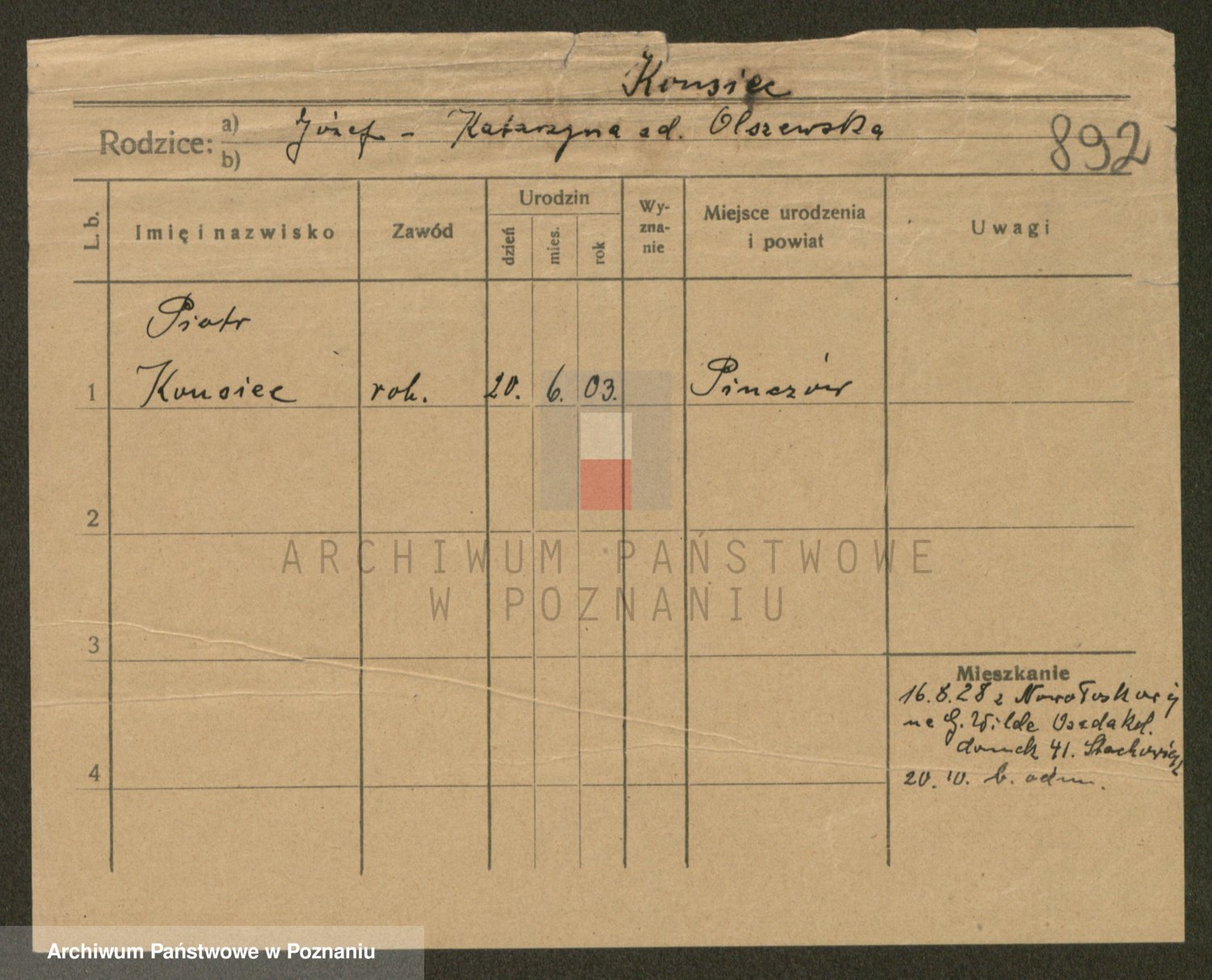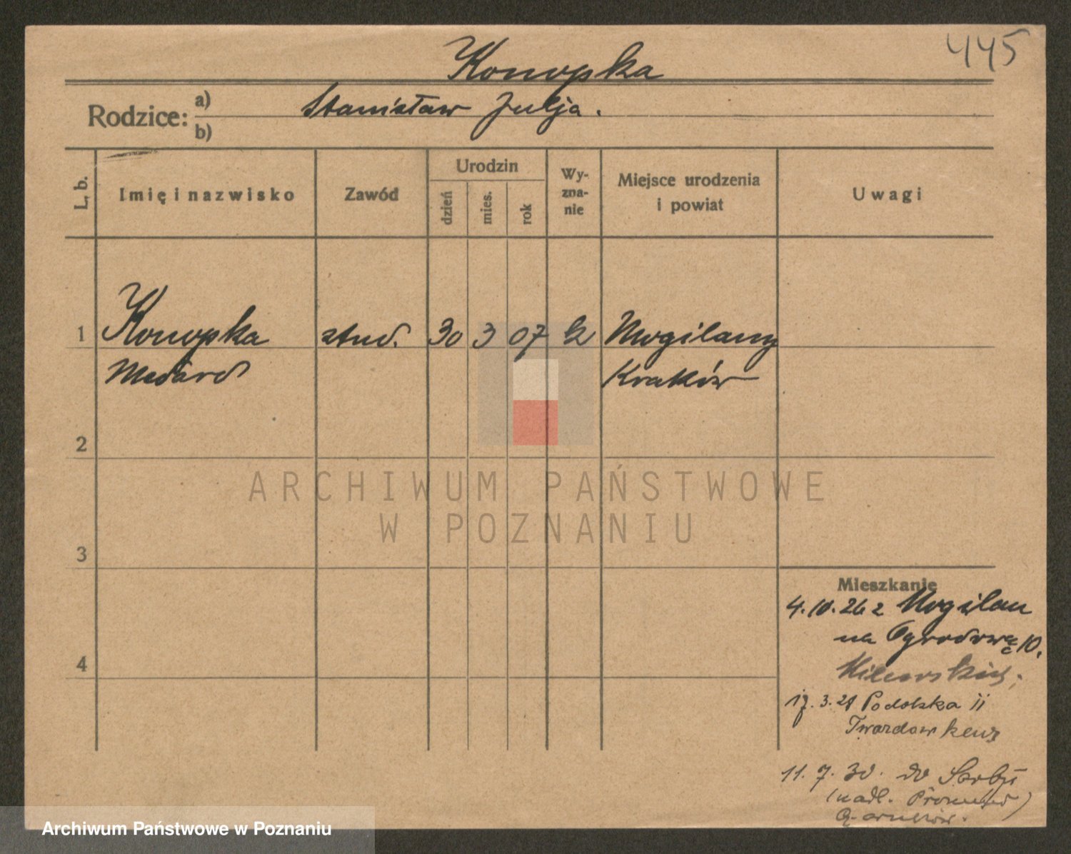 Podgląd karty osobowej dostępny jest po kliknięciu na nazwisko lub ikonkę karty. Można dokonywać powiększenia (ikony na górze) lub przechodzić między kolejnymi skanami (strzałki po bokach).