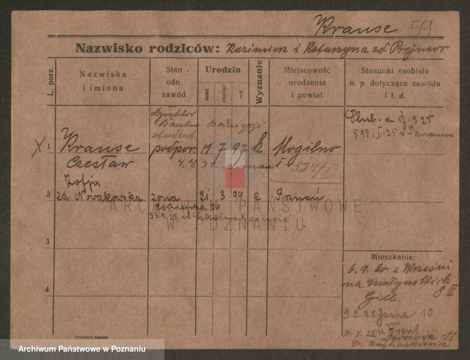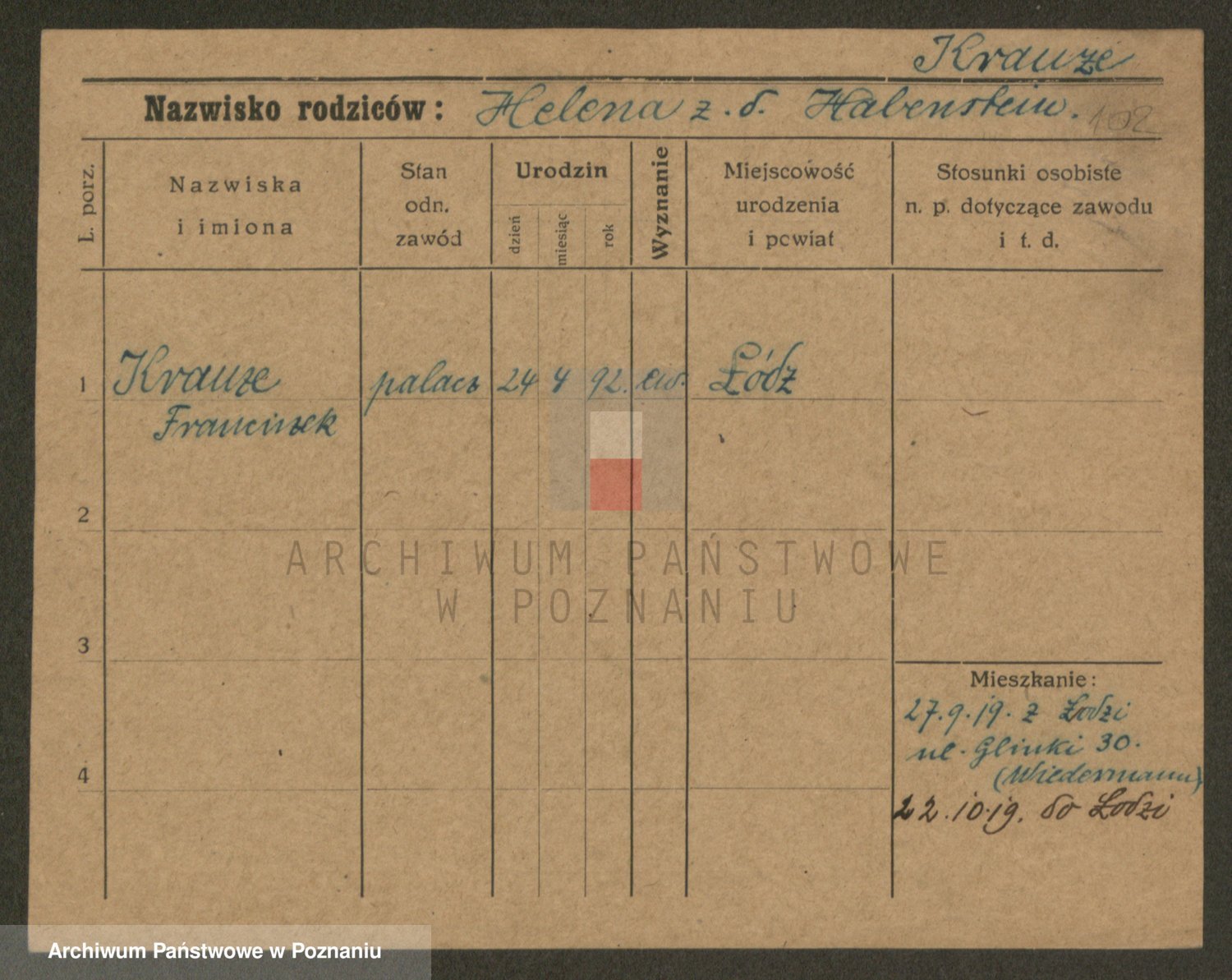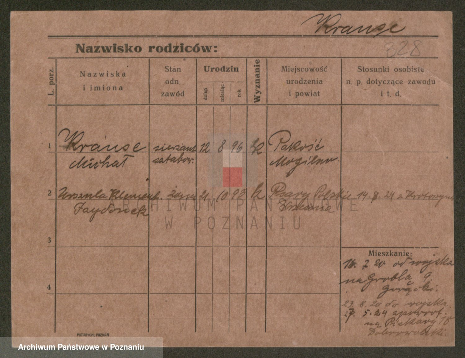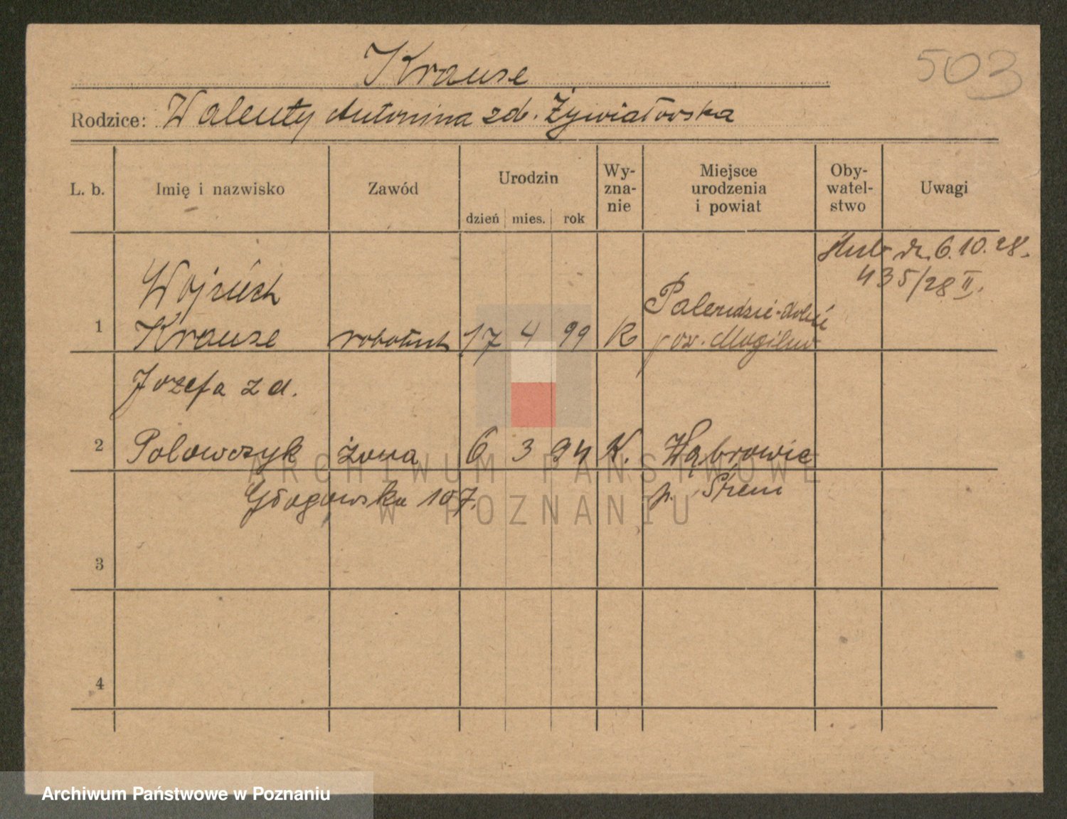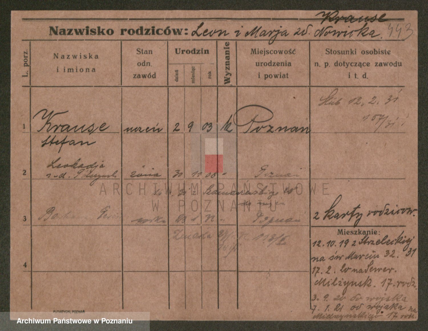 Podgląd karty osobowej dostępny jest po kliknięciu na nazwisko lub ikonkę karty. Można dokonywać powiększenia (ikony na górze) lub przechodzić między kolejnymi skanami (strzałki po bokach).
