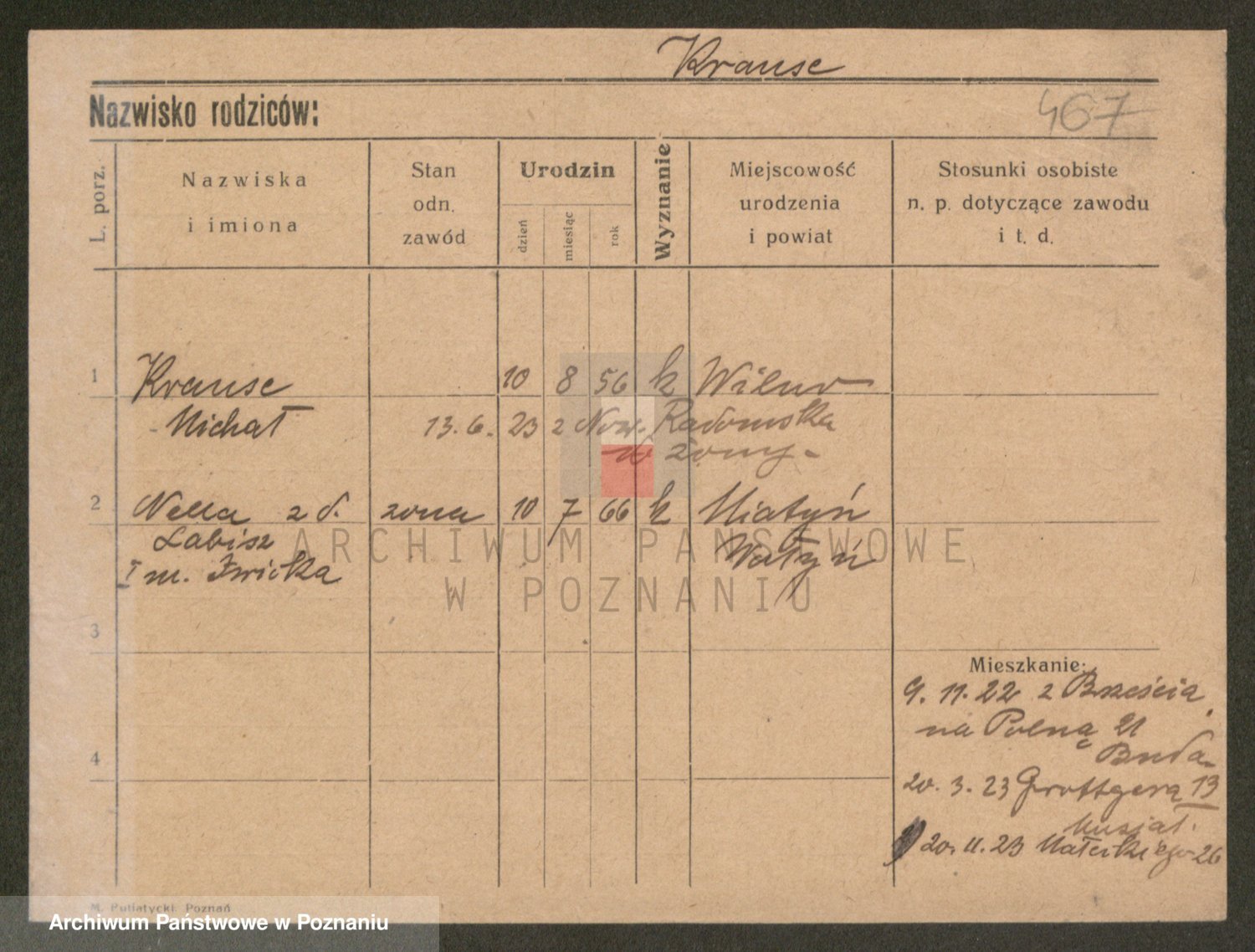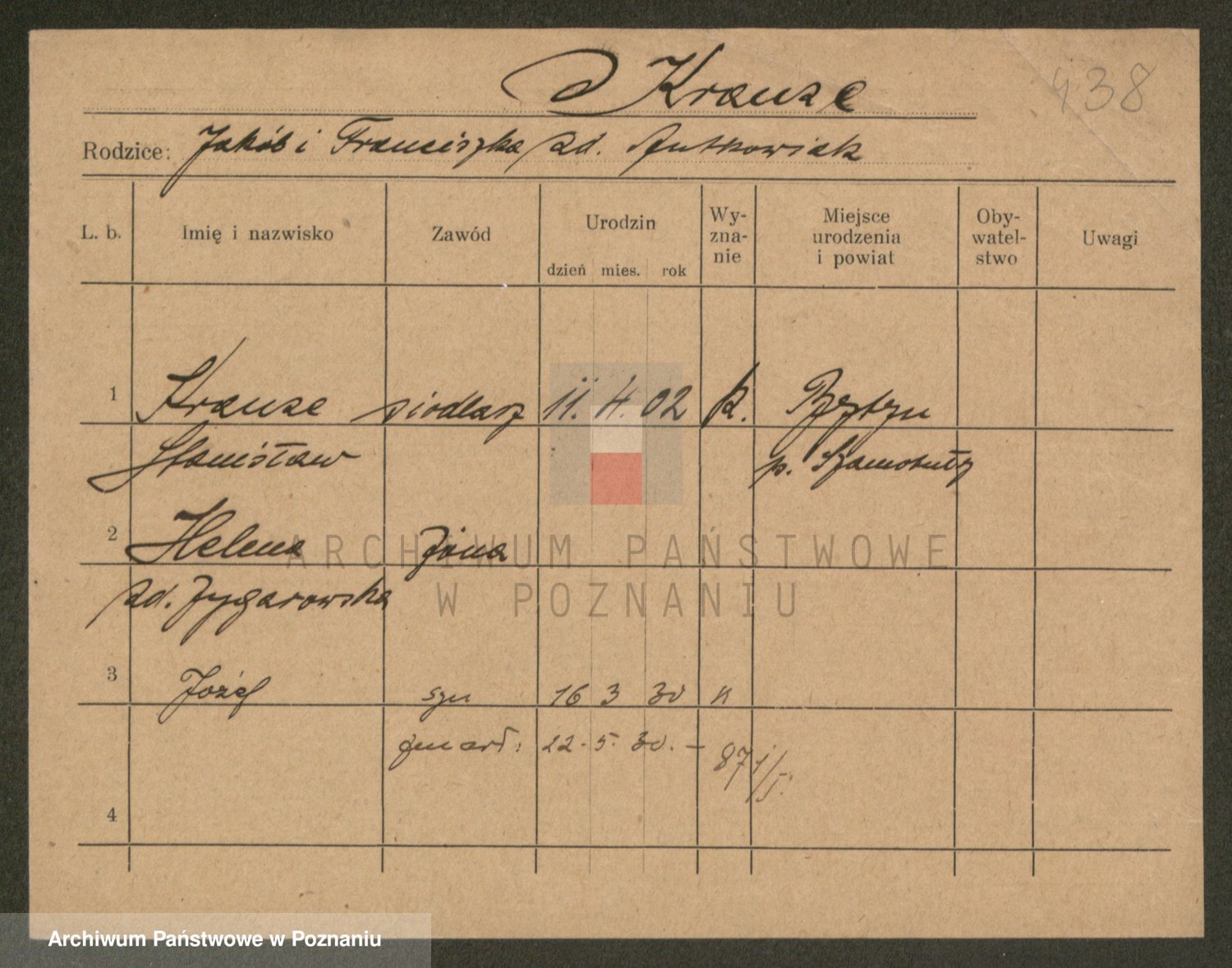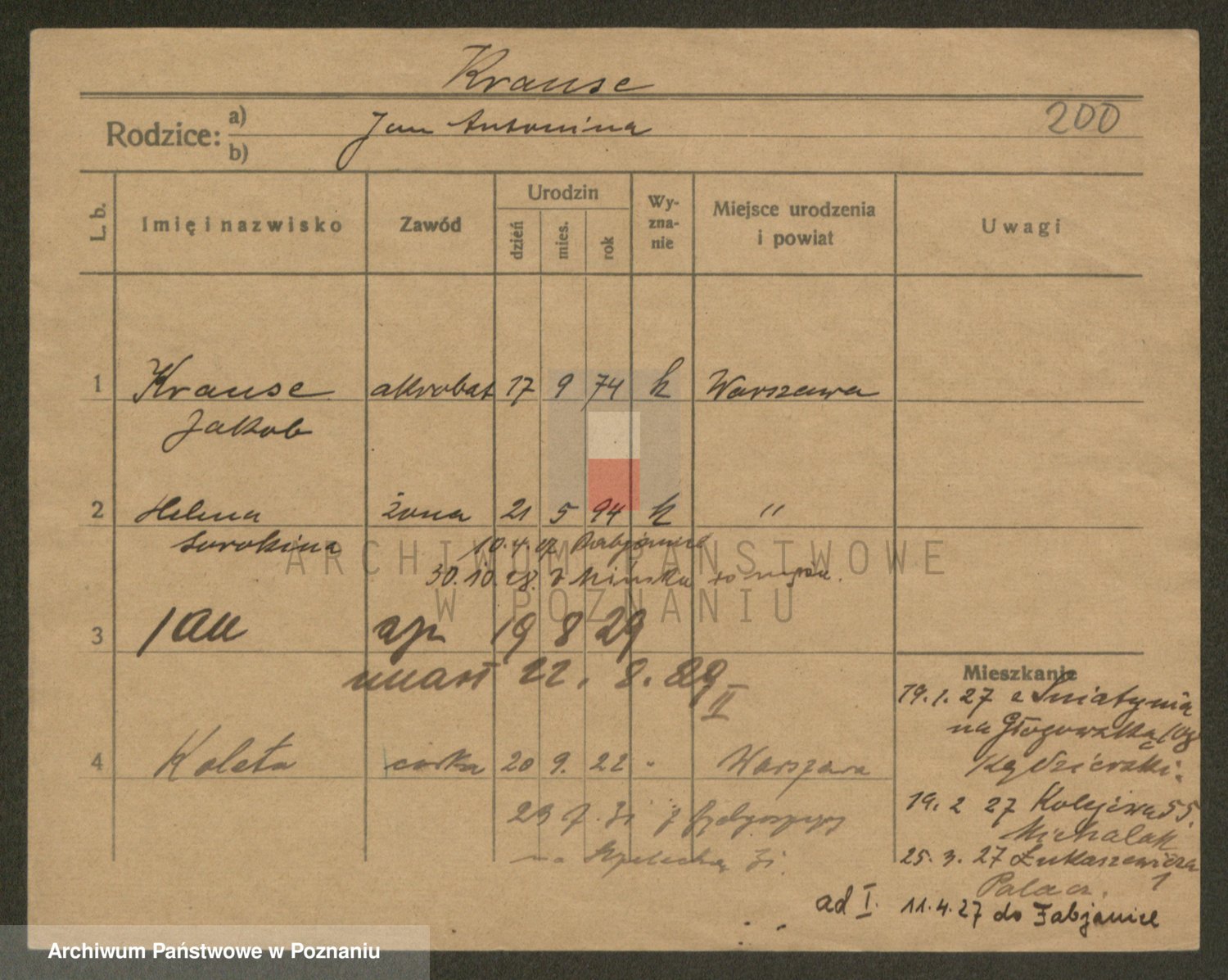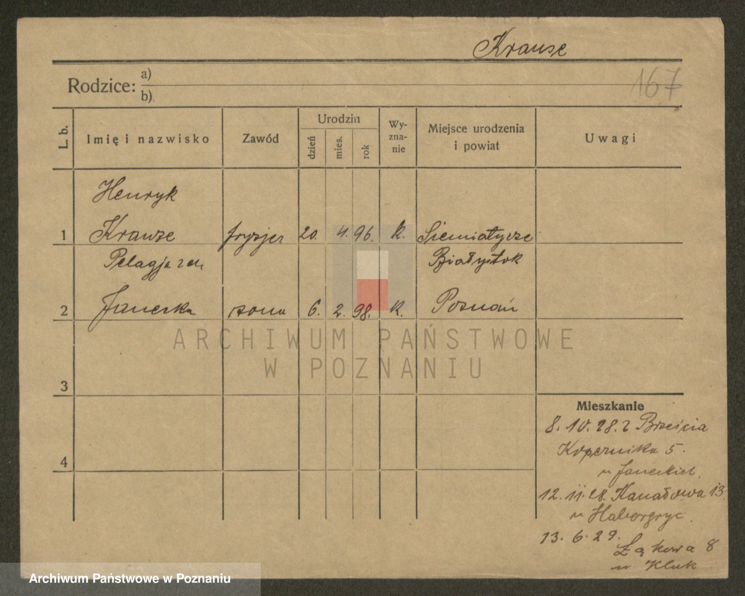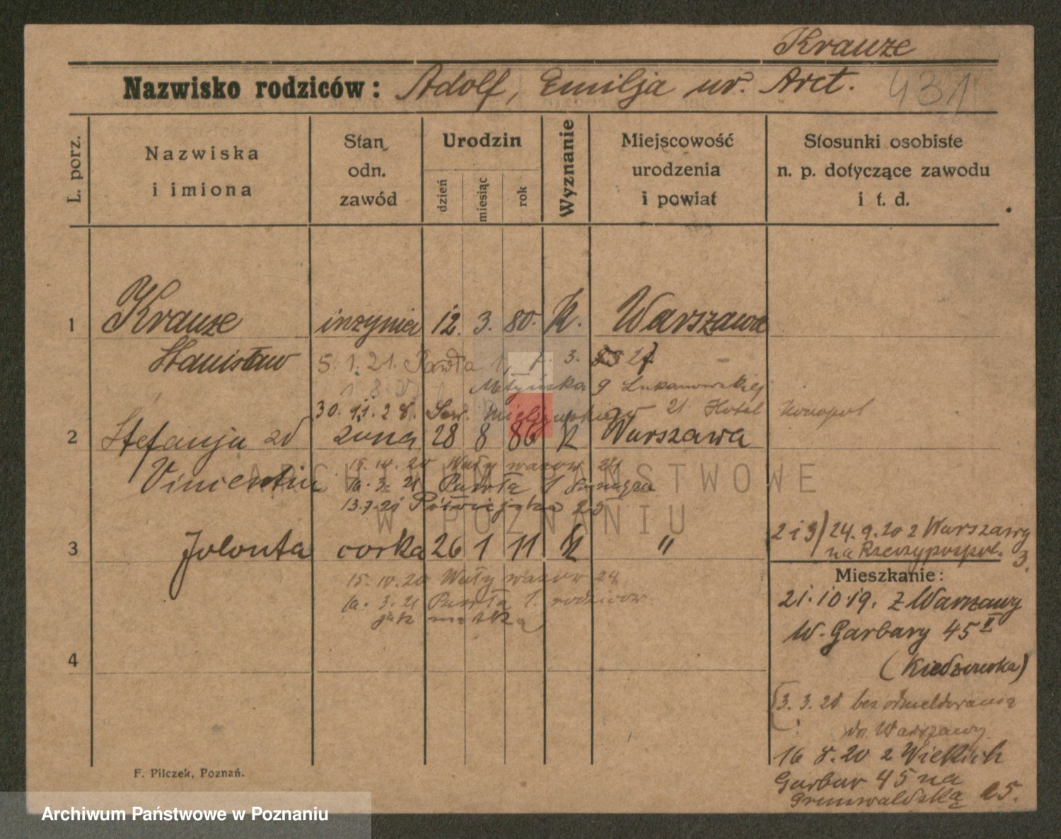 Podgląd karty osobowej dostępny jest po kliknięciu na nazwisko lub ikonkę karty. Można dokonywać powiększenia (ikony na górze) lub przechodzić między kolejnymi skanami (strzałki po bokach).