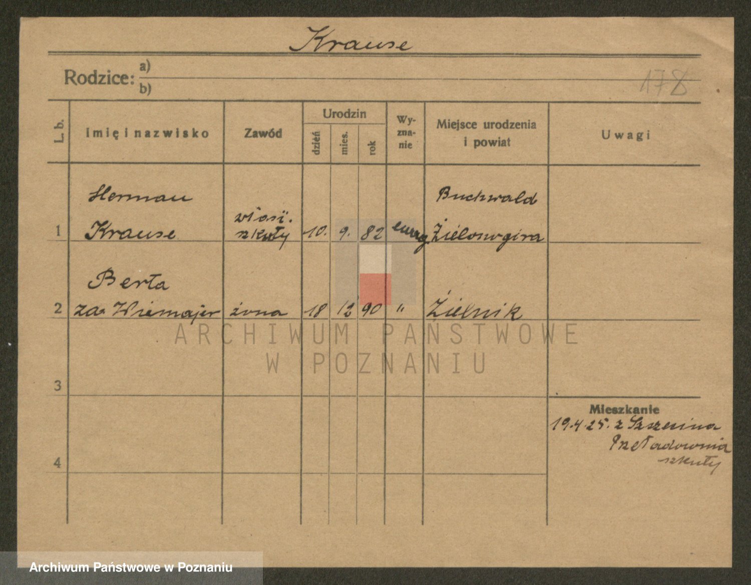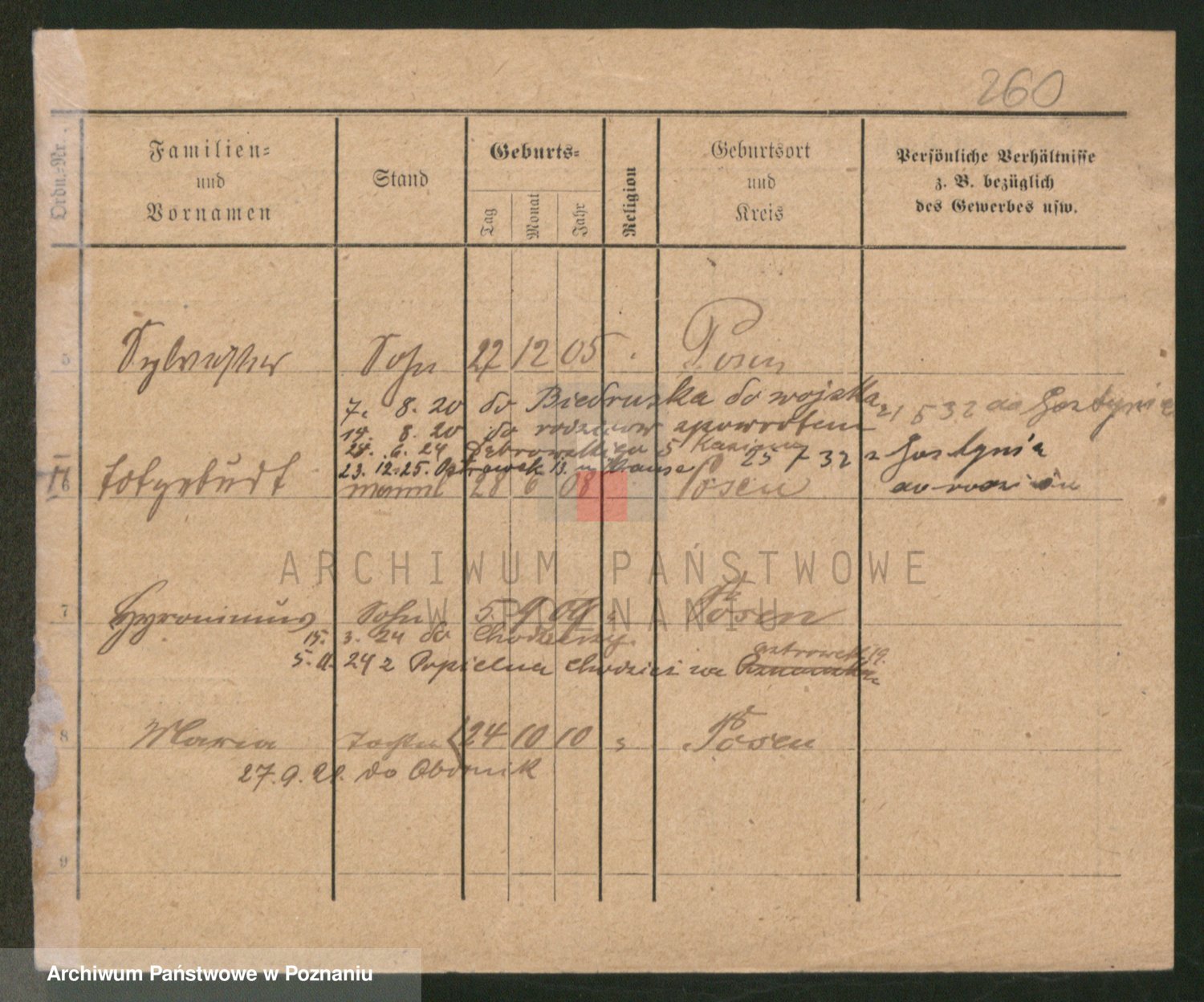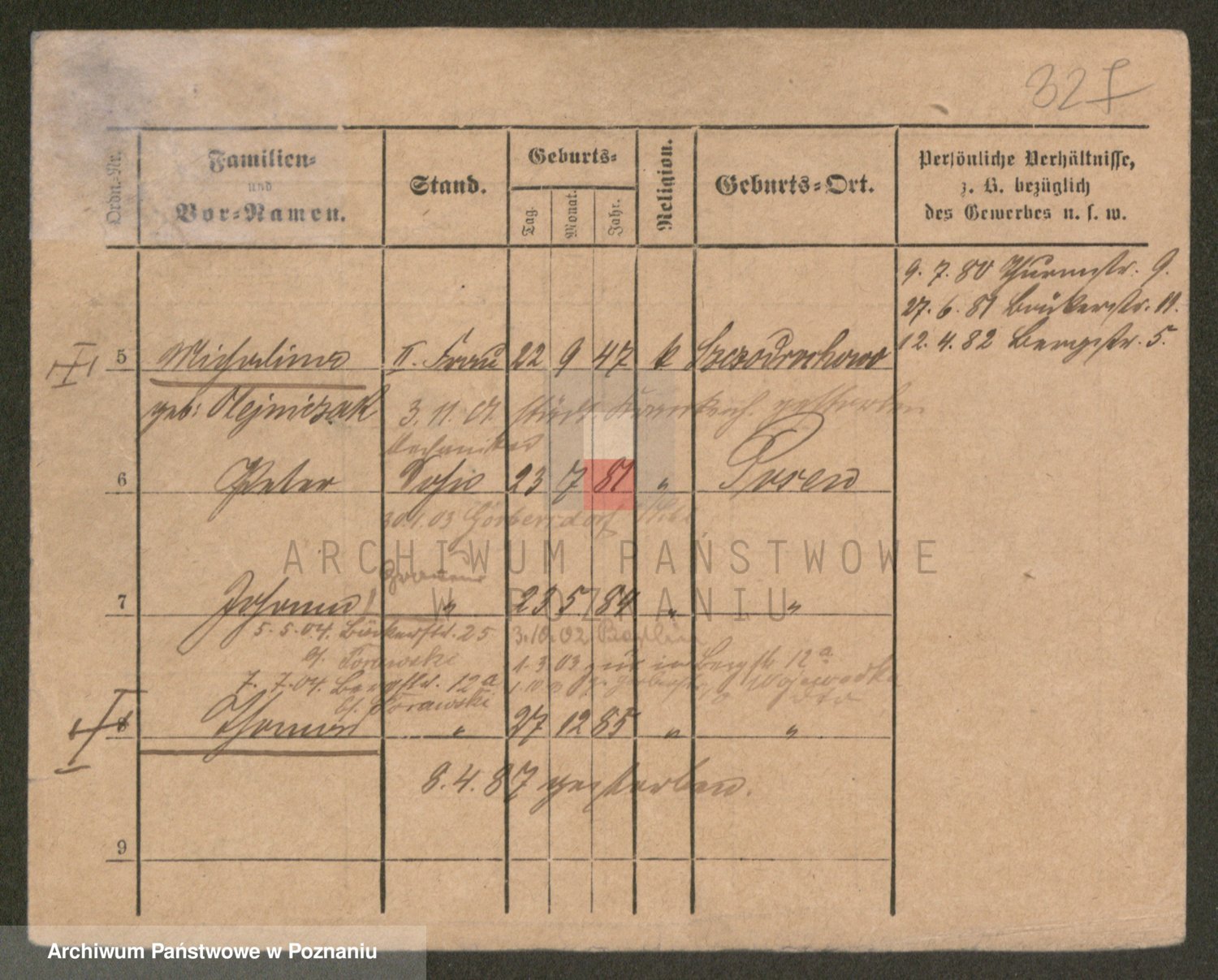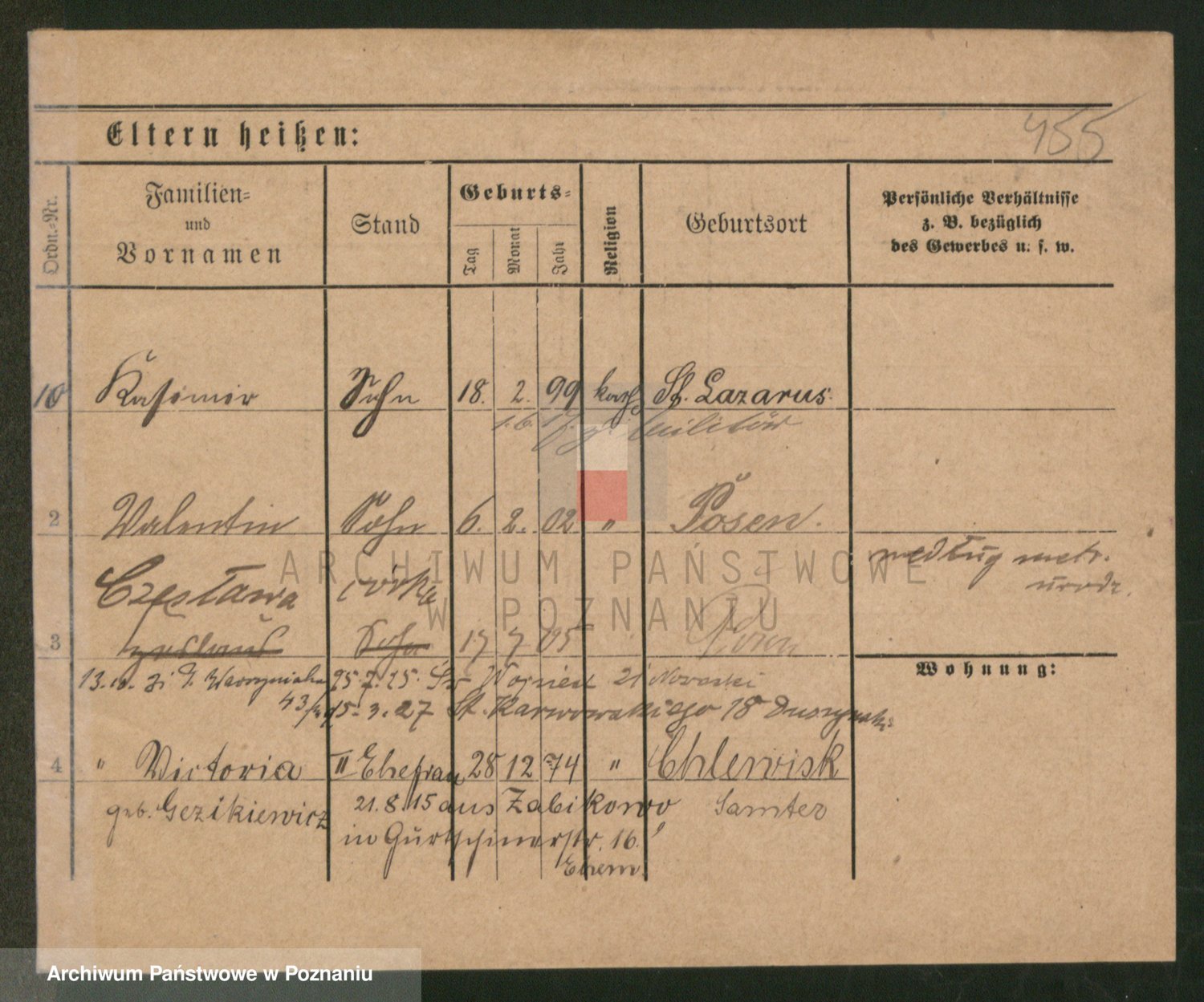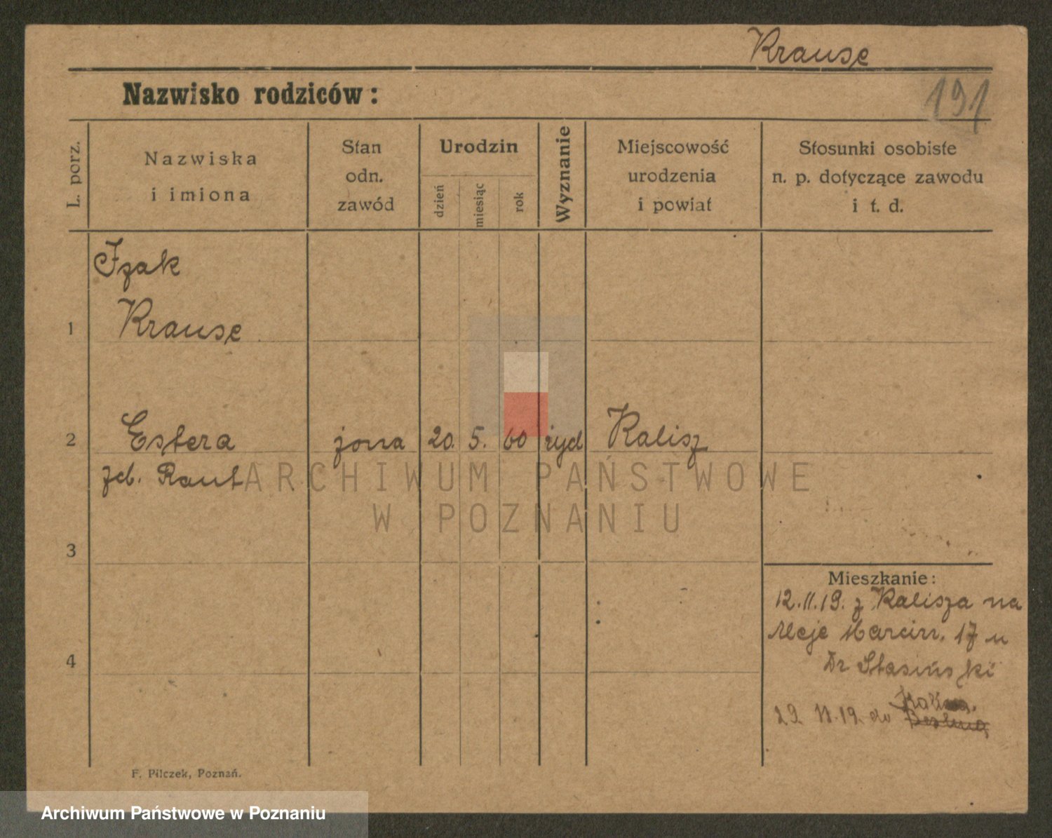 Podgląd karty osobowej dostępny jest po kliknięciu na nazwisko lub ikonkę karty. Można dokonywać powiększenia (ikony na górze) lub przechodzić między kolejnymi skanami (strzałki po bokach).