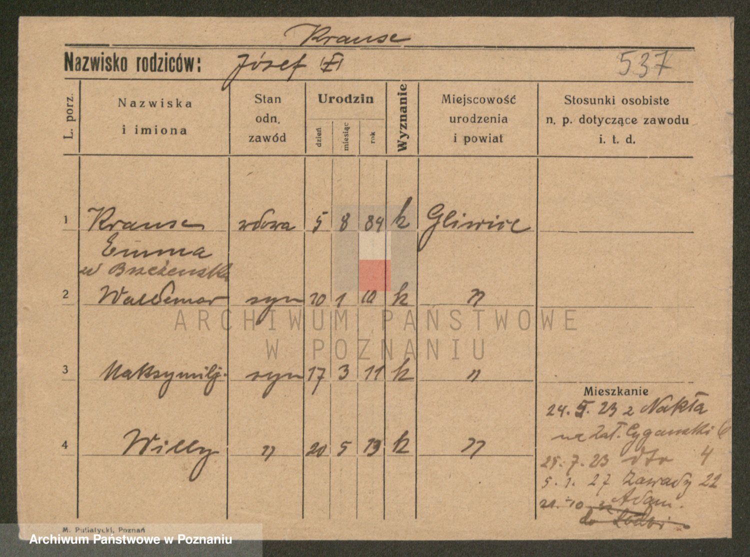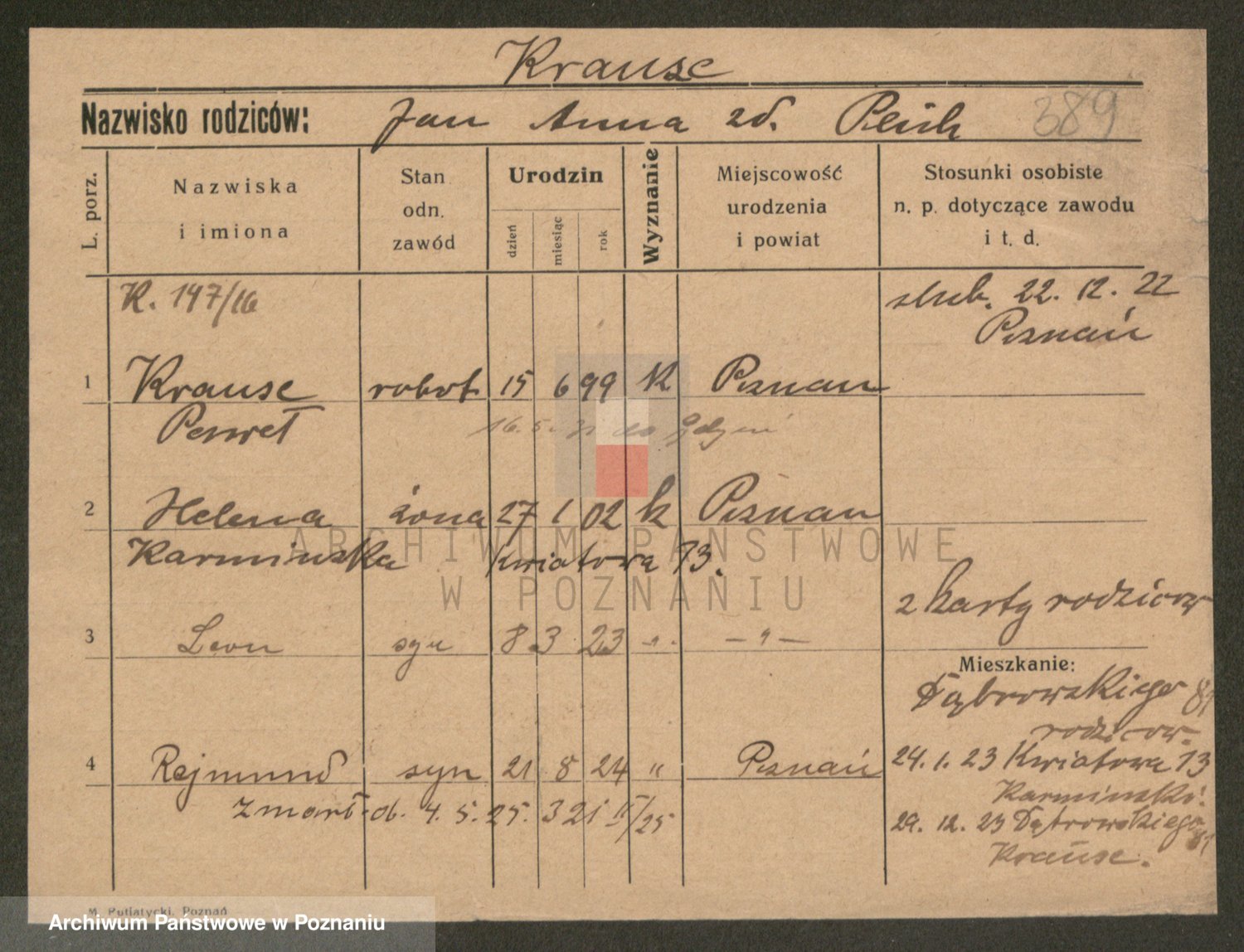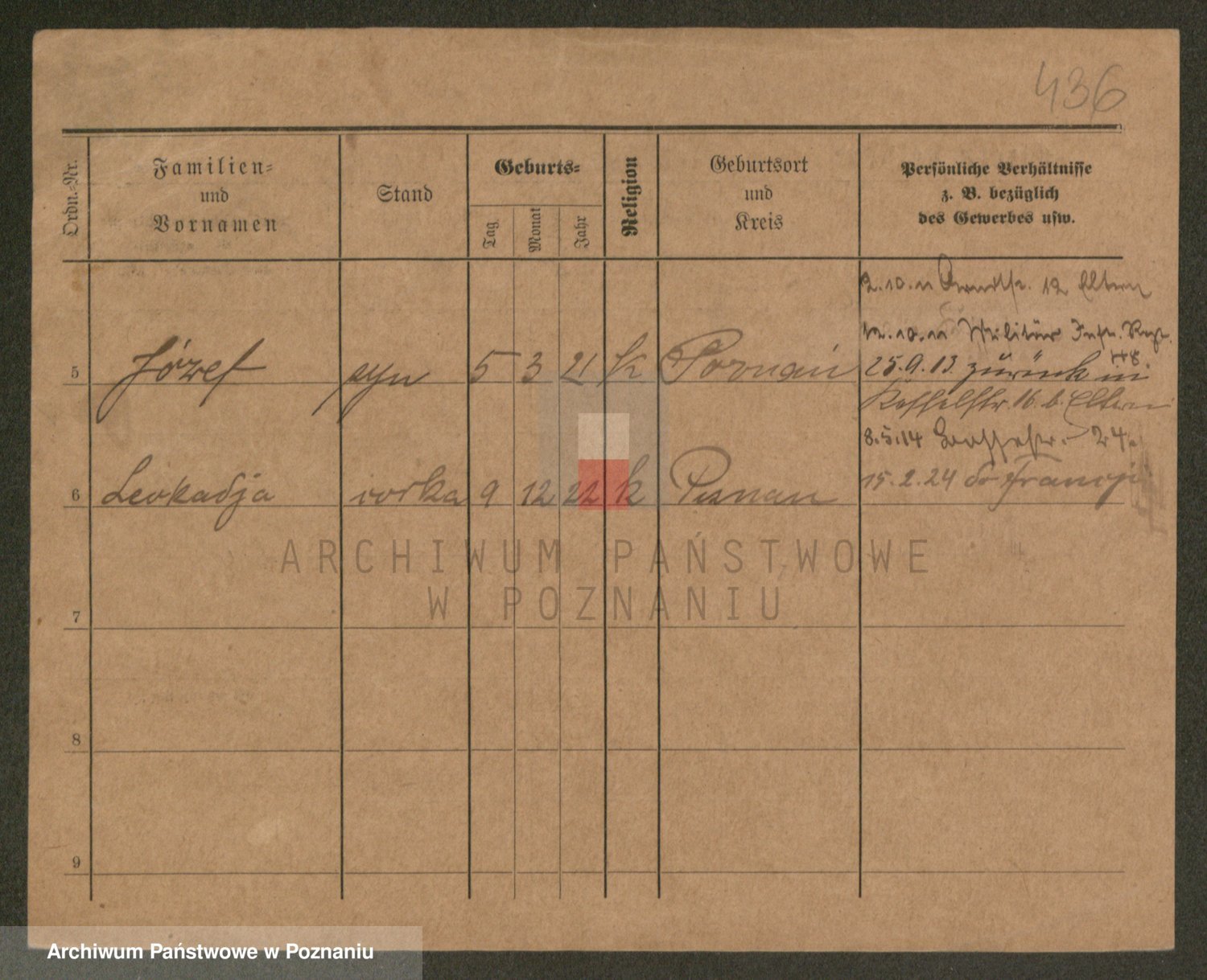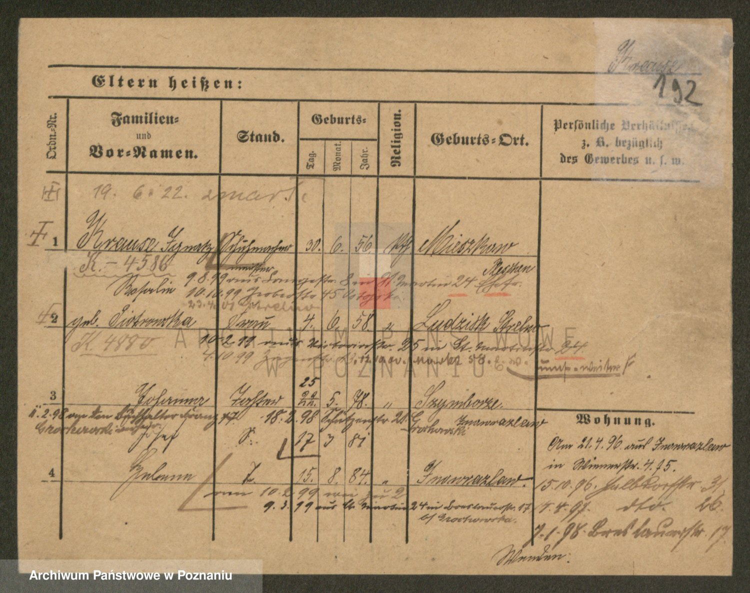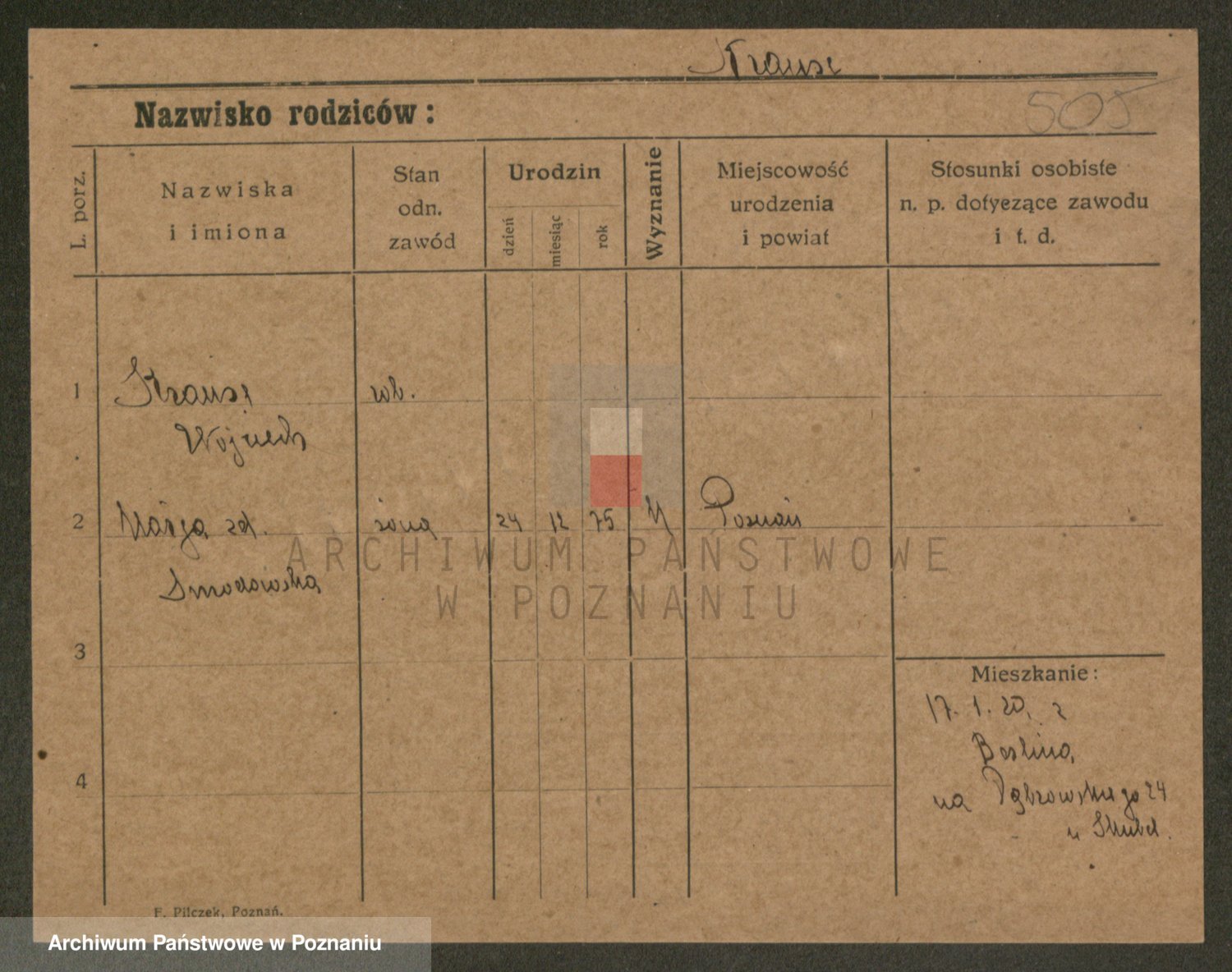 Podgląd karty osobowej dostępny jest po kliknięciu na nazwisko lub ikonkę karty. Można dokonywać powiększenia (ikony na górze) lub przechodzić między kolejnymi skanami (strzałki po bokach).