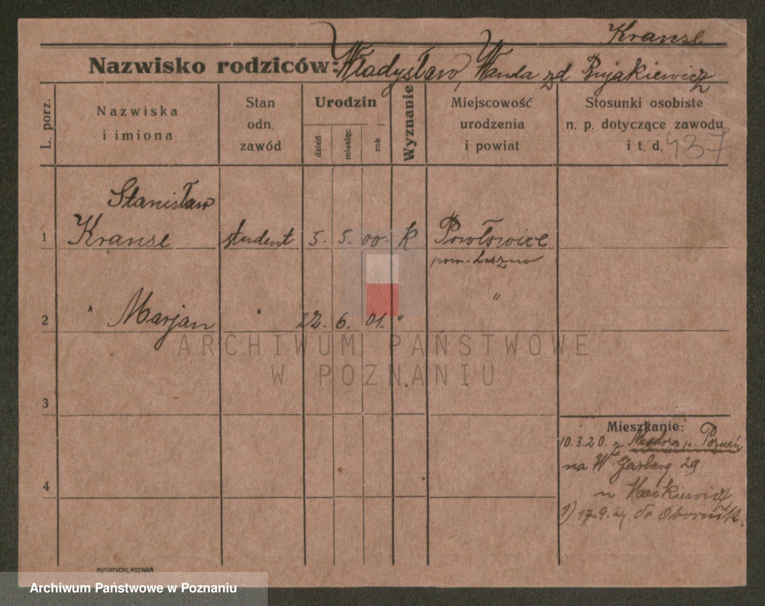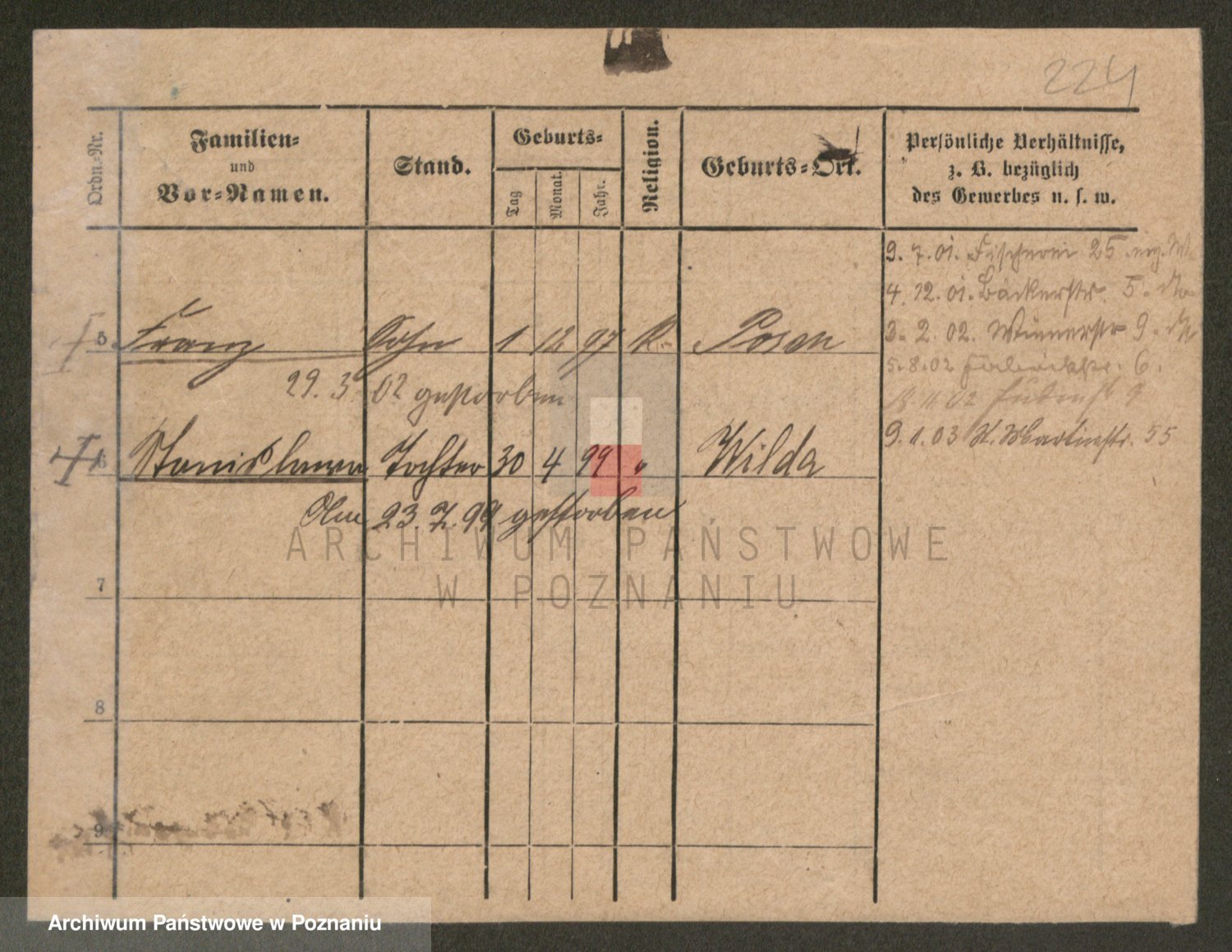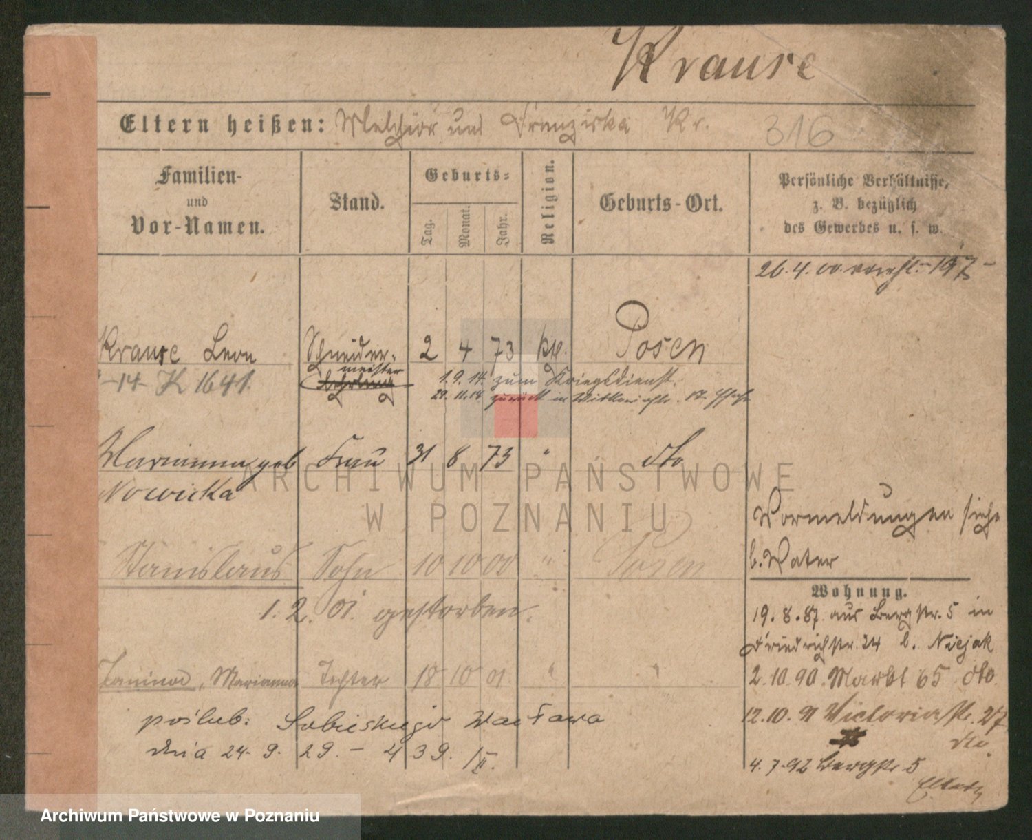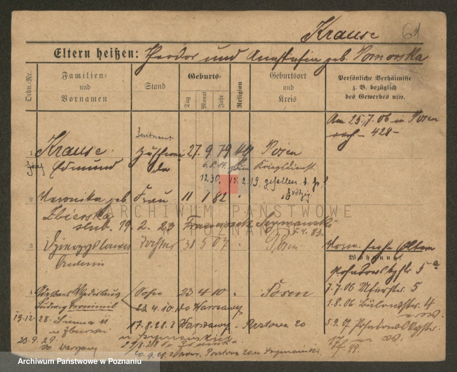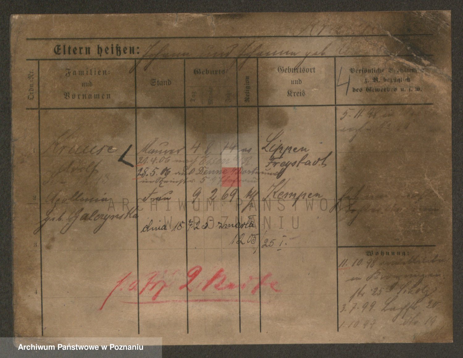 Podgląd karty osobowej dostępny jest po kliknięciu na nazwisko lub ikonkę karty. Można dokonywać powiększenia (ikony na górze) lub przechodzić między kolejnymi skanami (strzałki po bokach).