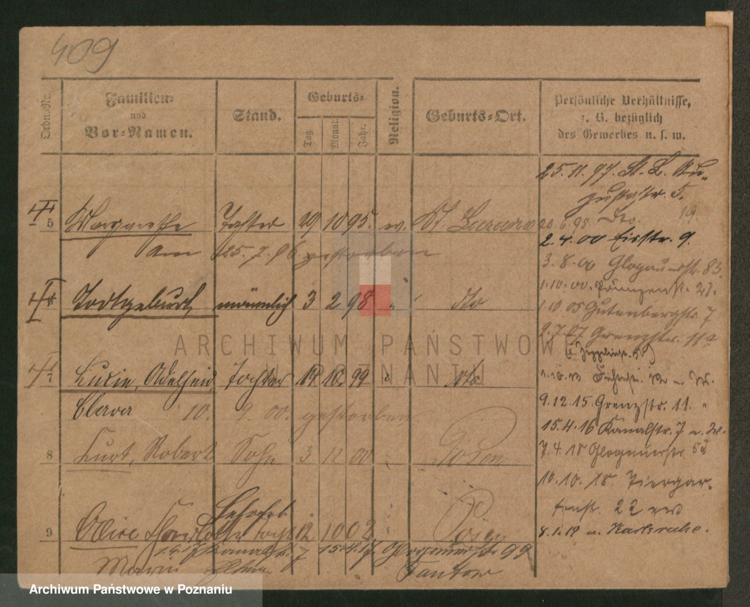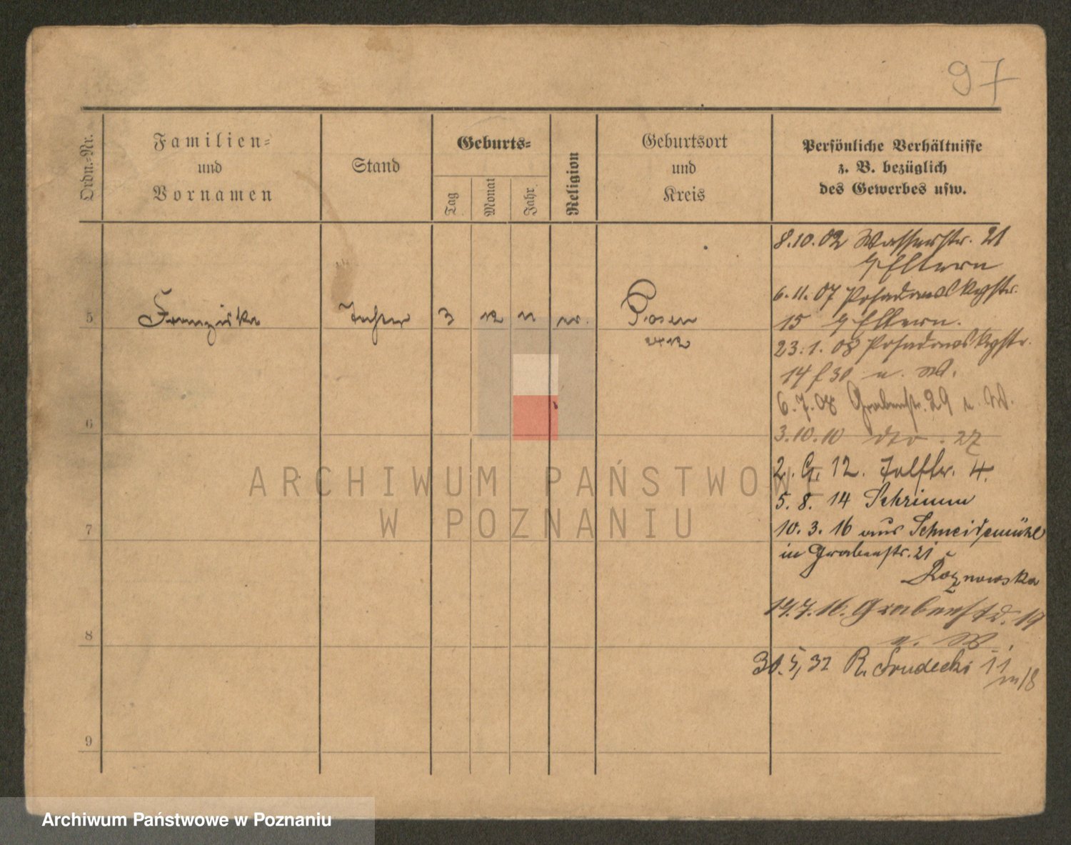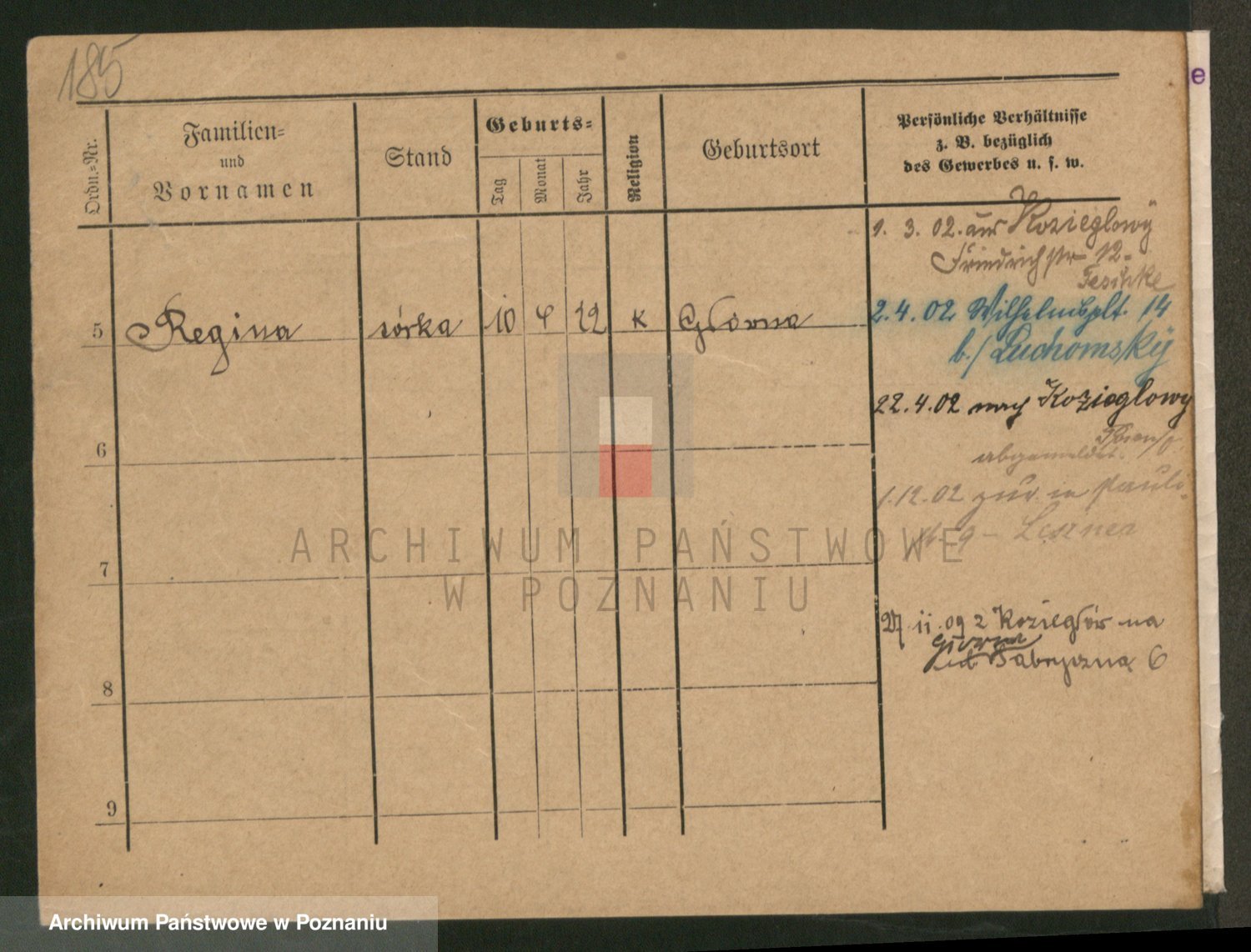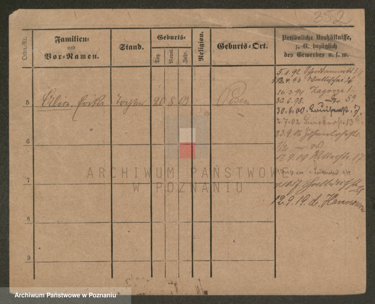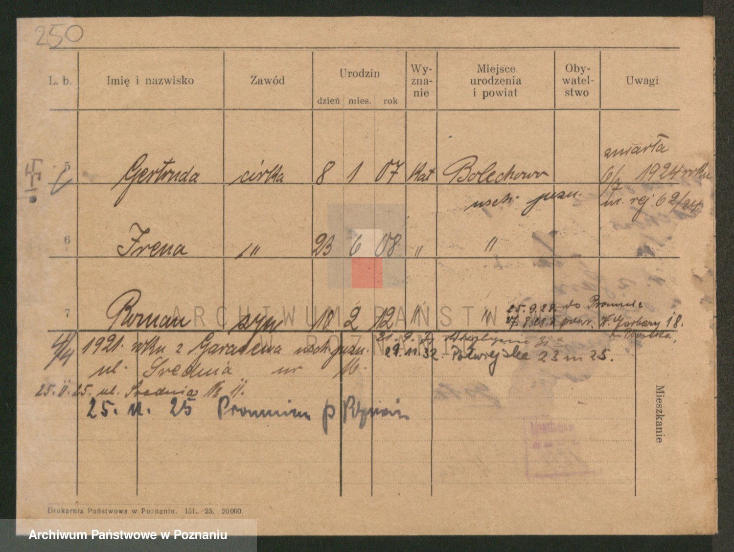 Podgląd karty osobowej dostępny jest po kliknięciu na nazwisko lub ikonkę karty. Można dokonywać powiększenia (ikony na górze) lub przechodzić między kolejnymi skanami (strzałki po bokach).