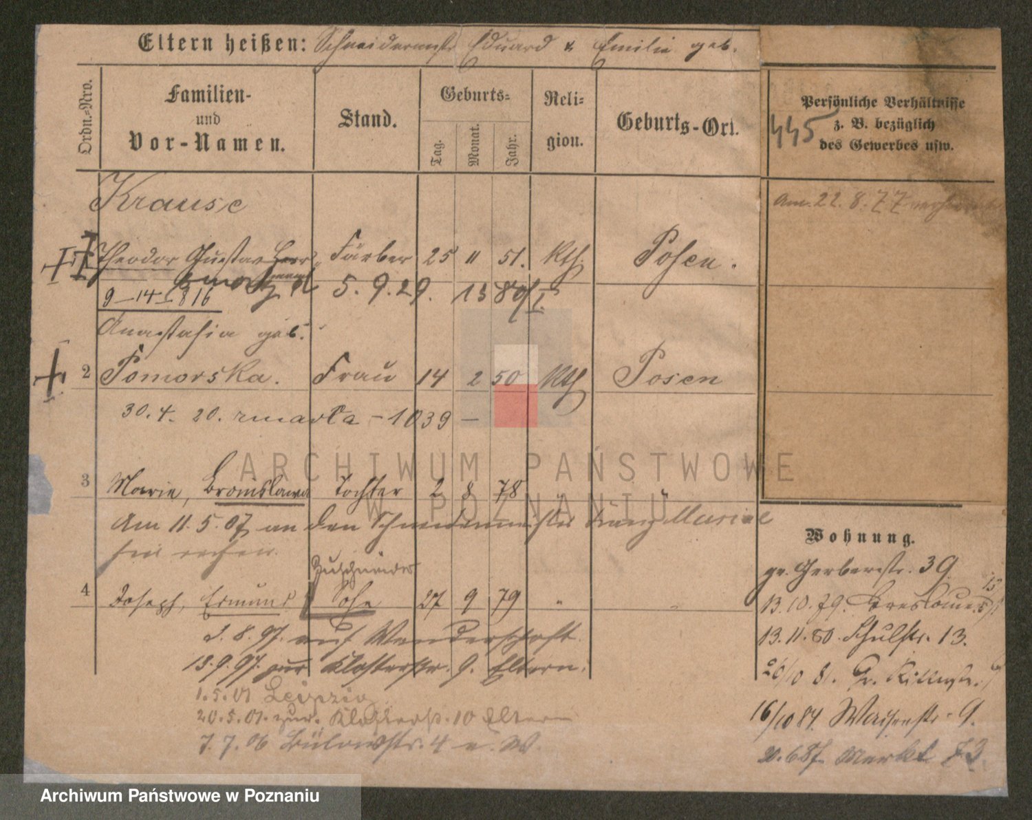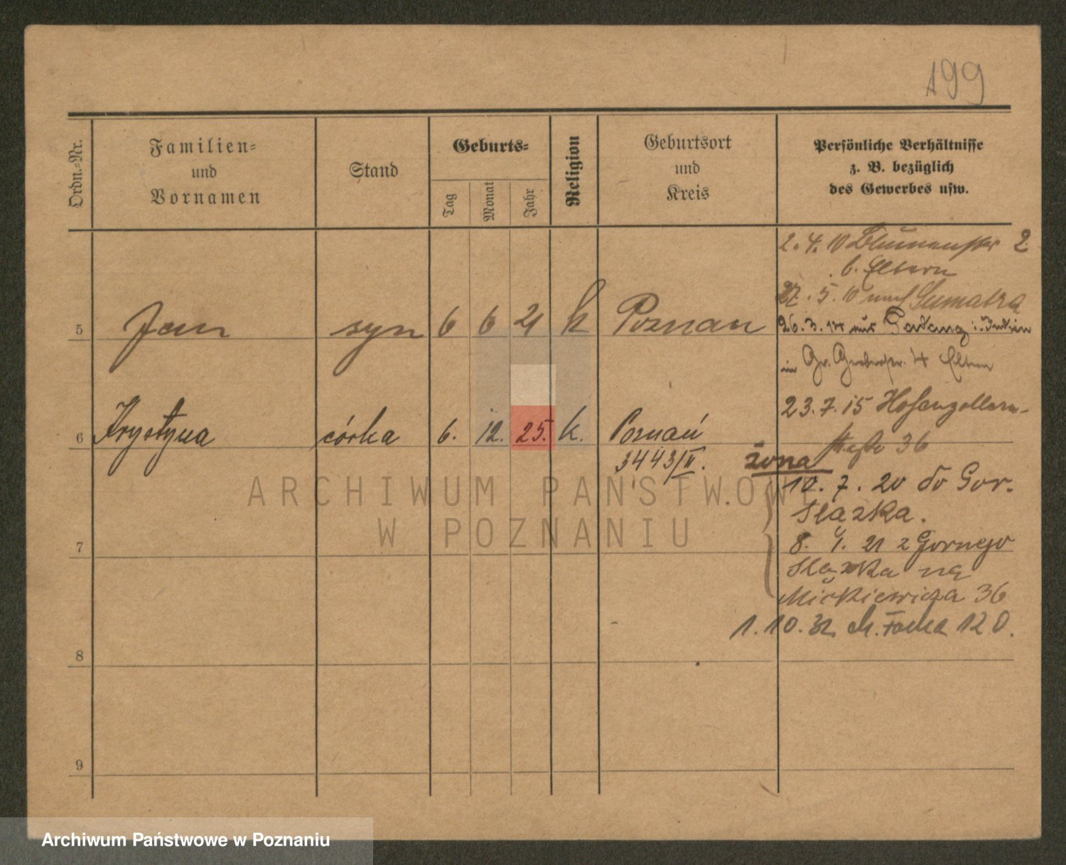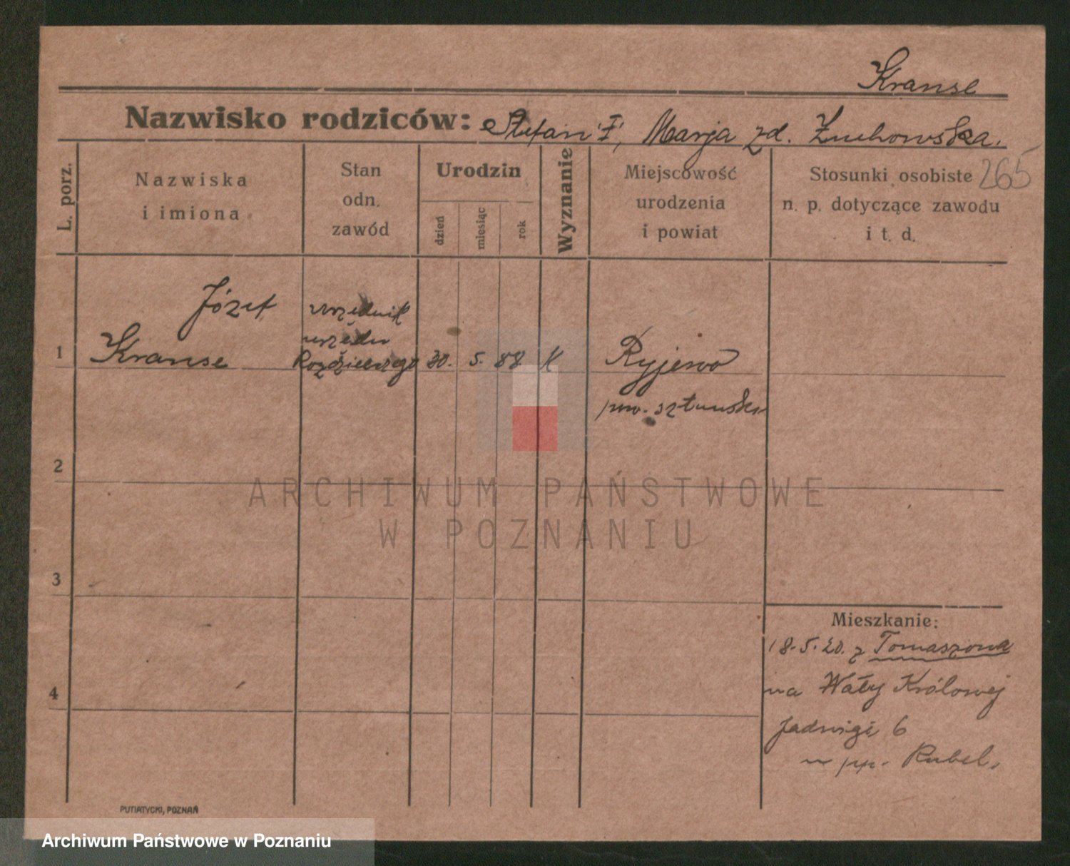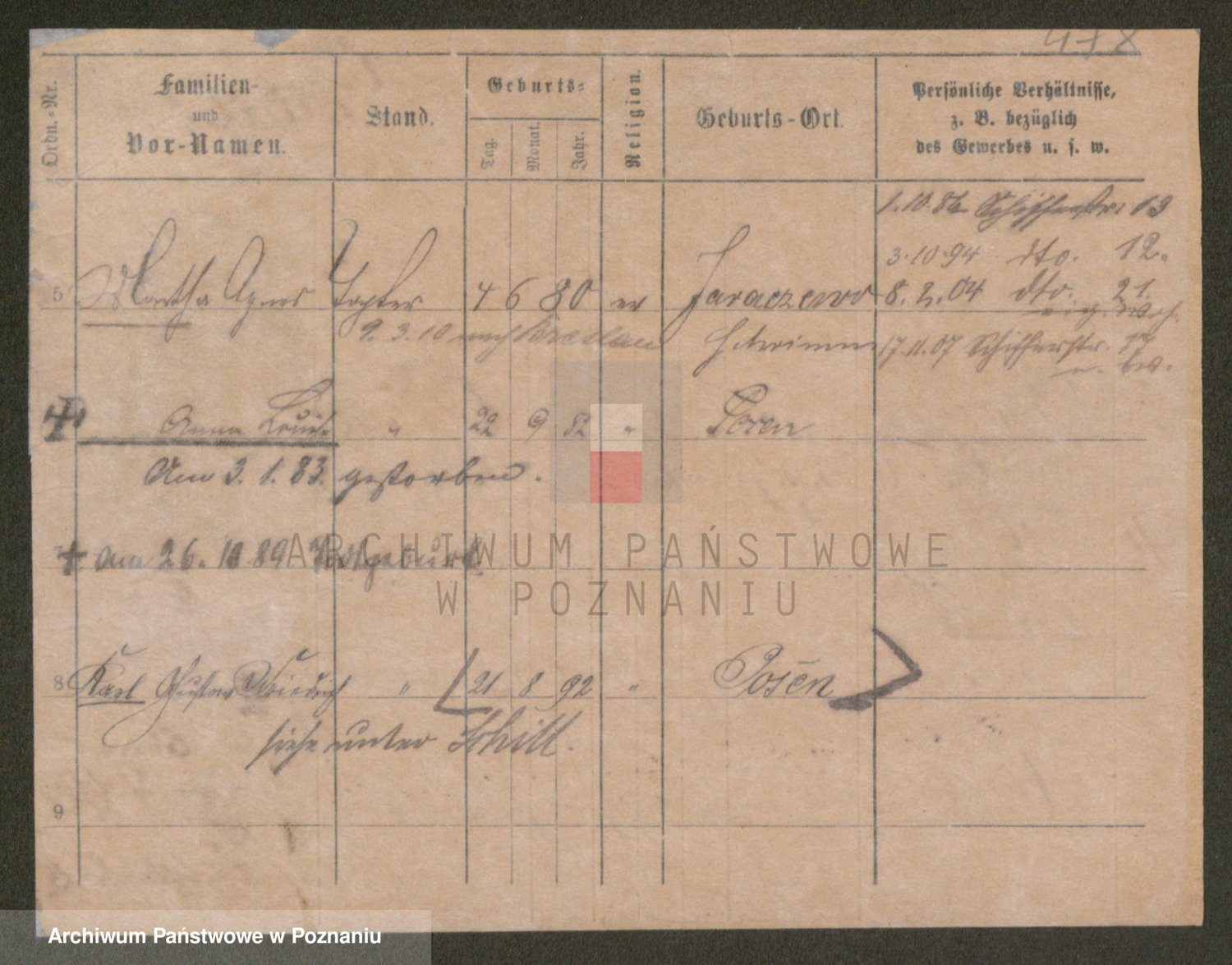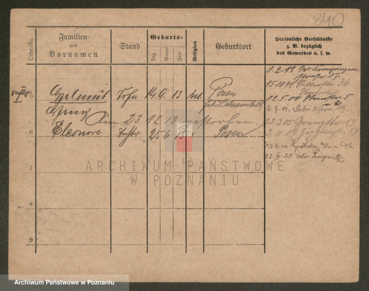 Podgląd karty osobowej dostępny jest po kliknięciu na nazwisko lub ikonkę karty. Można dokonywać powiększenia (ikony na górze) lub przechodzić między kolejnymi skanami (strzałki po bokach).
