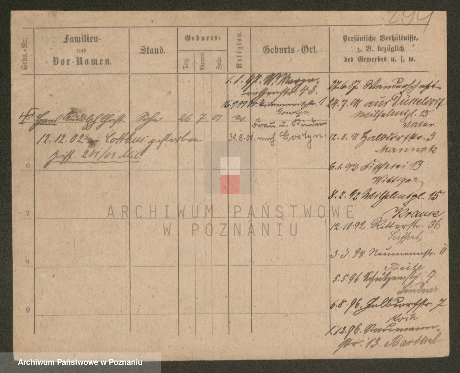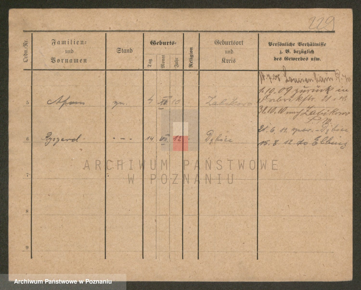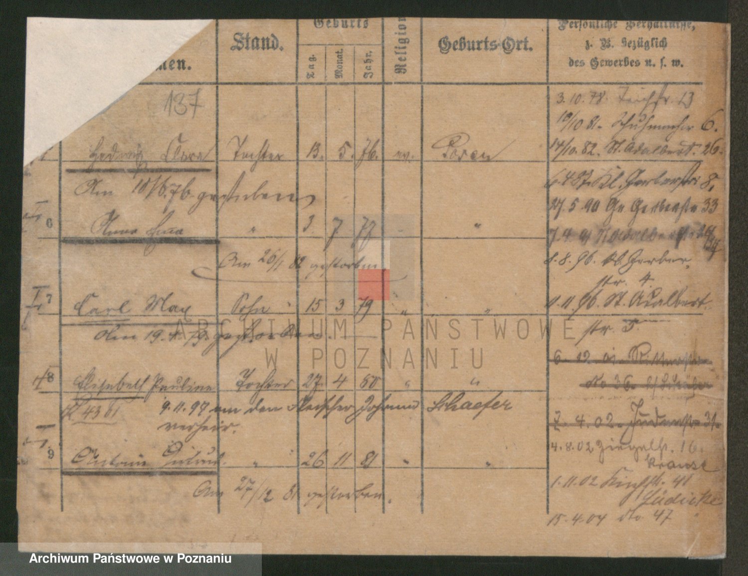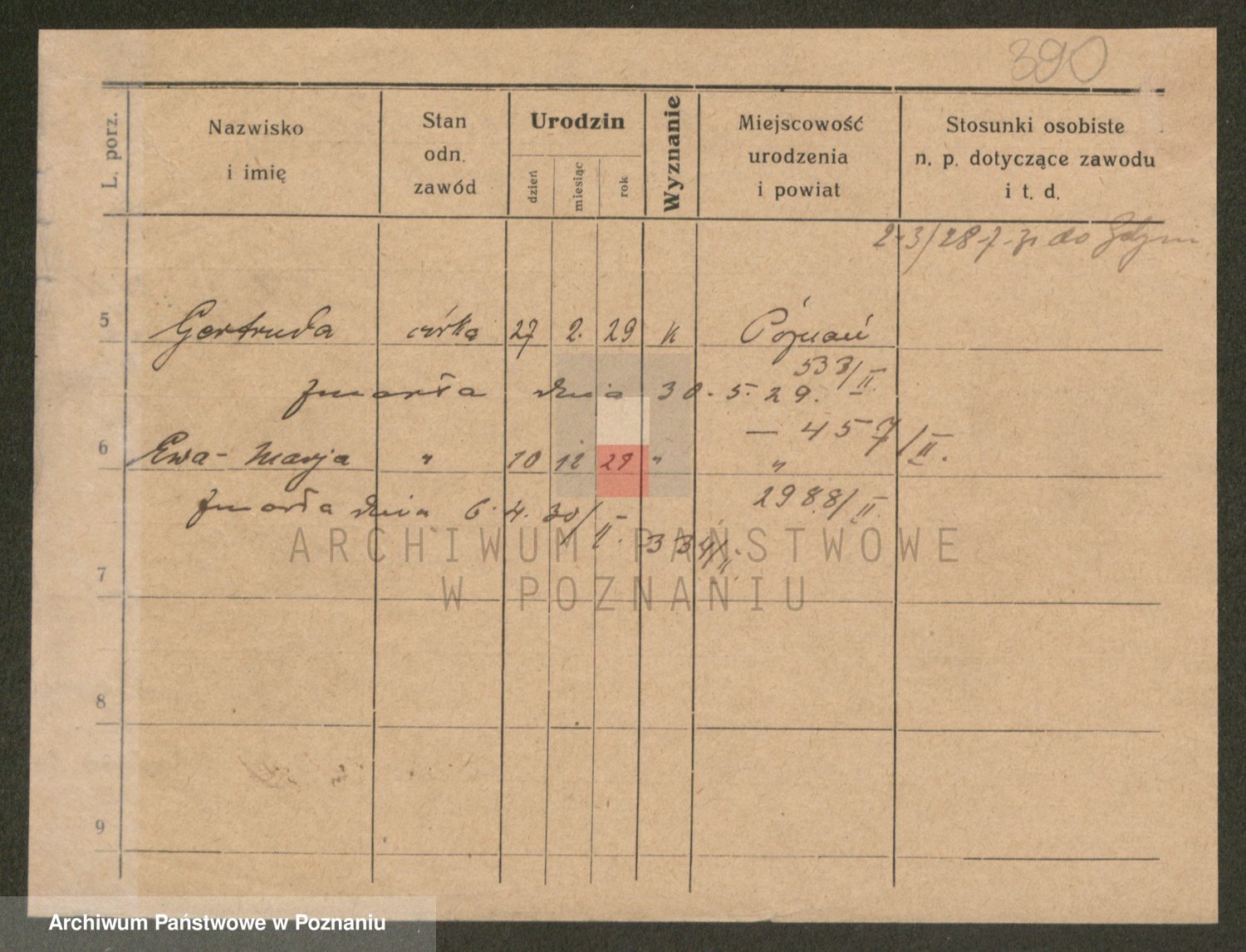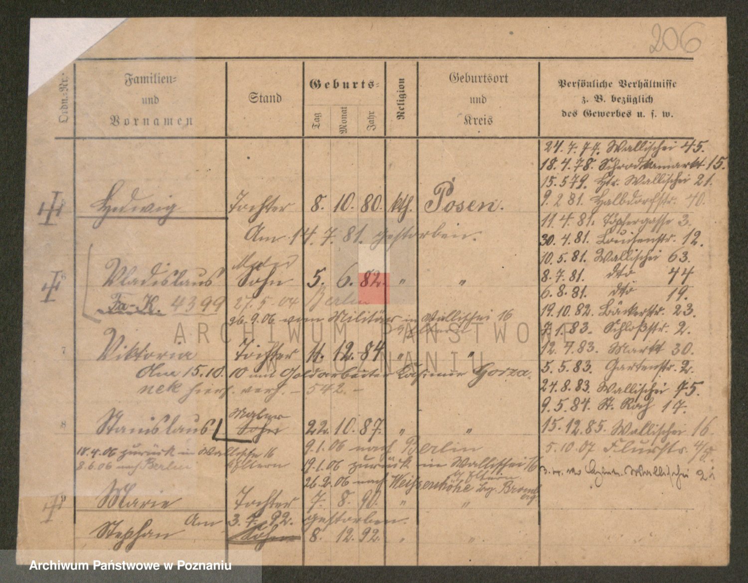 Podgląd karty osobowej dostępny jest po kliknięciu na nazwisko lub ikonkę karty. Można dokonywać powiększenia (ikony na górze) lub przechodzić między kolejnymi skanami (strzałki po bokach).