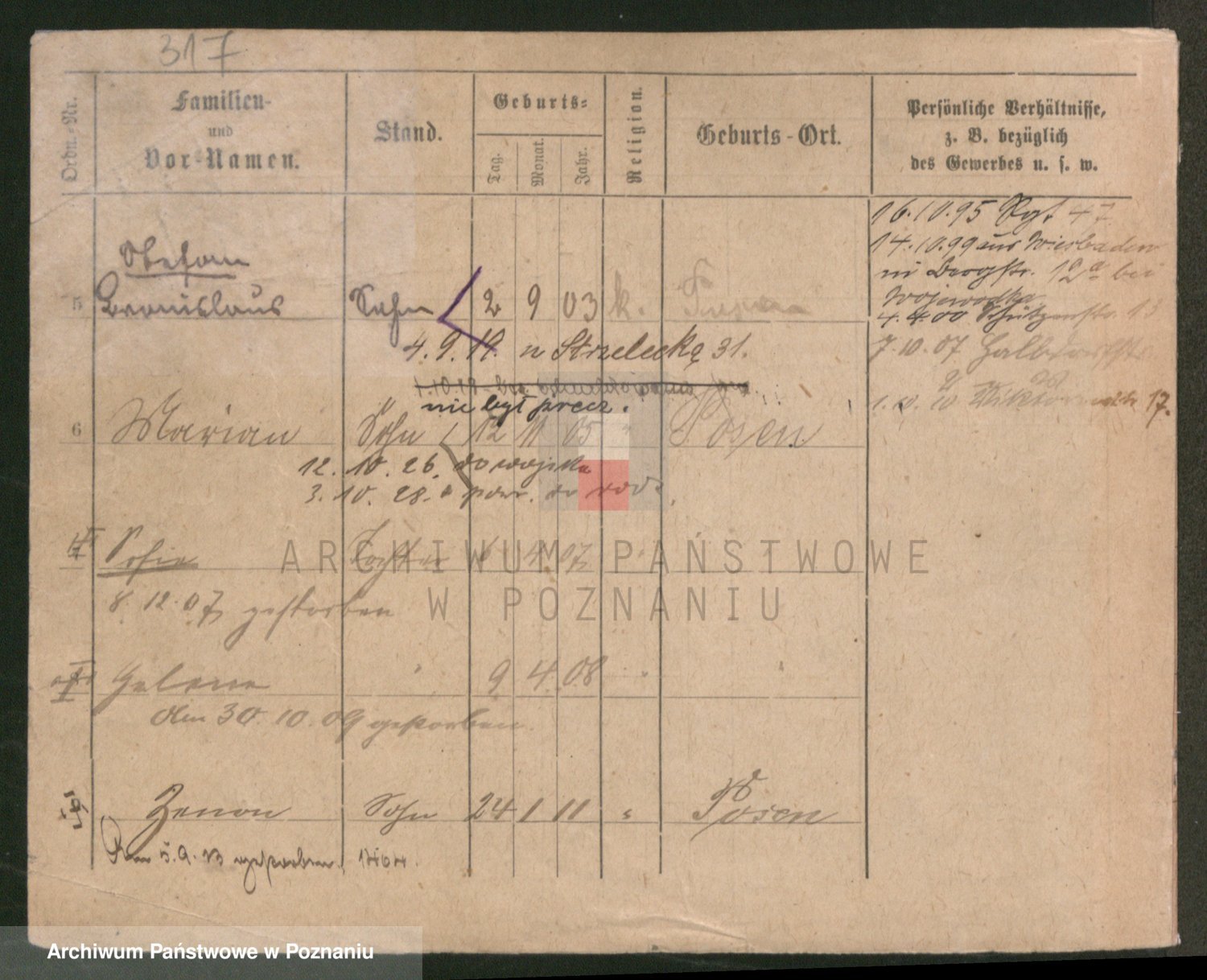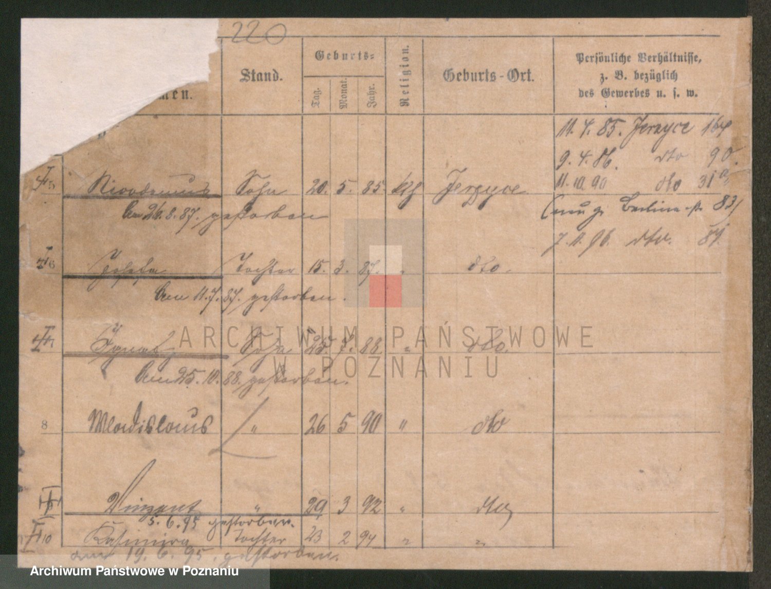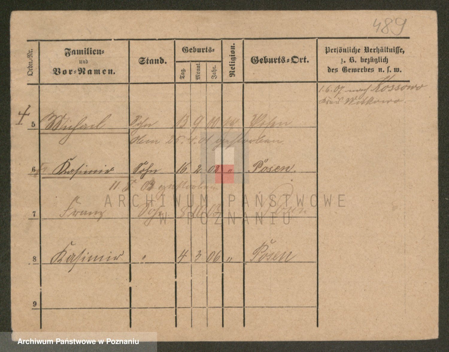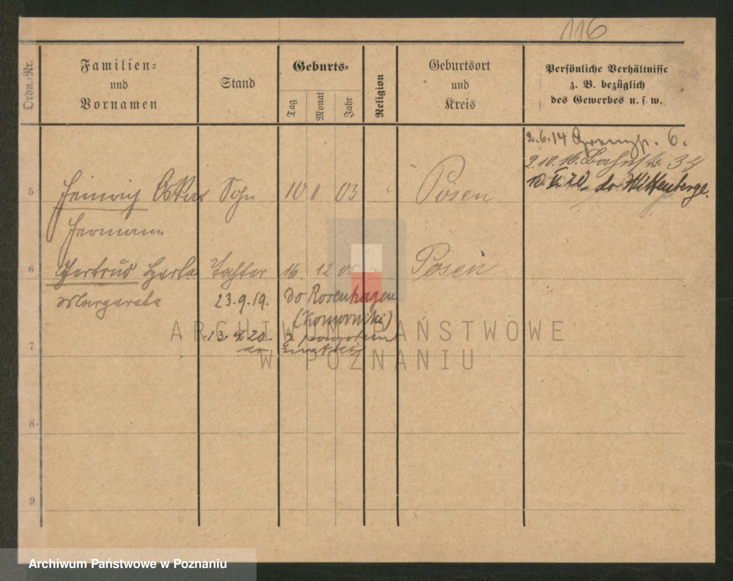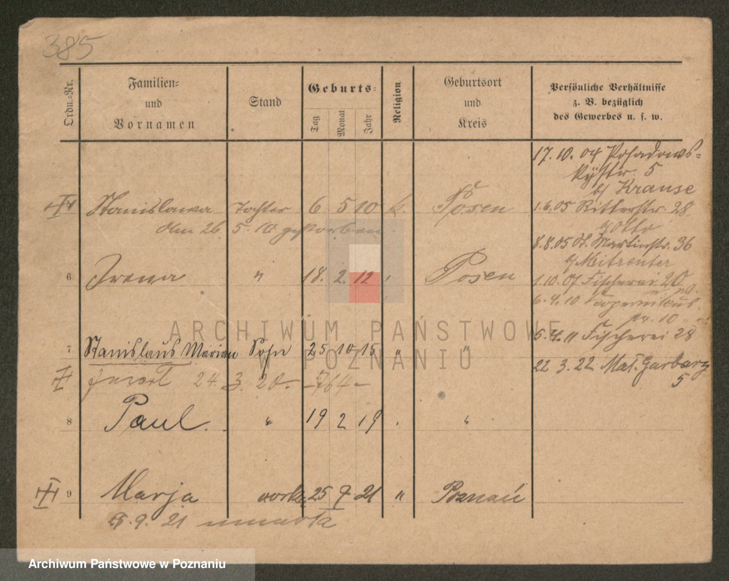 Podgląd karty osobowej dostępny jest po kliknięciu na nazwisko lub ikonkę karty. Można dokonywać powiększenia (ikony na górze) lub przechodzić między kolejnymi skanami (strzałki po bokach).