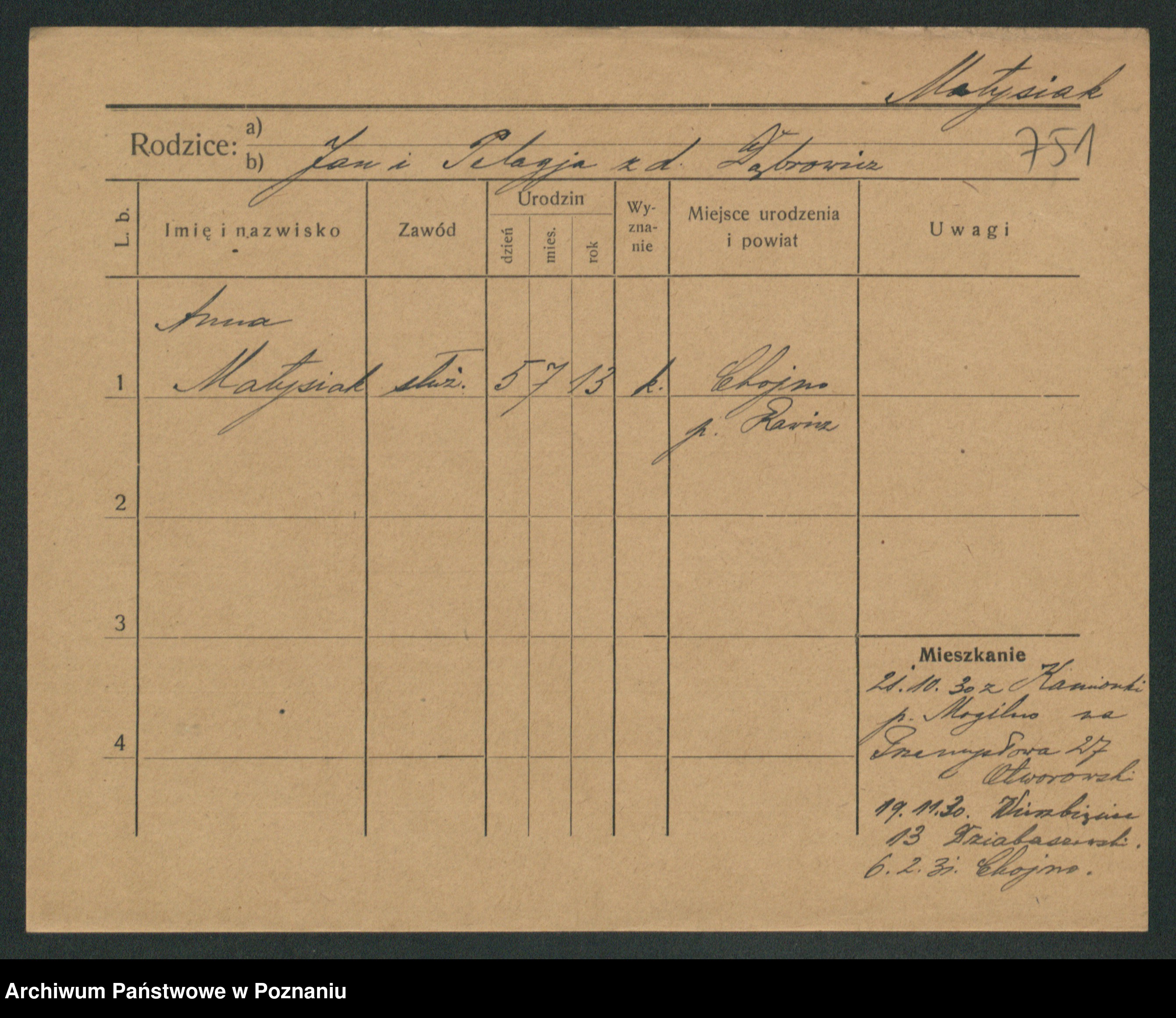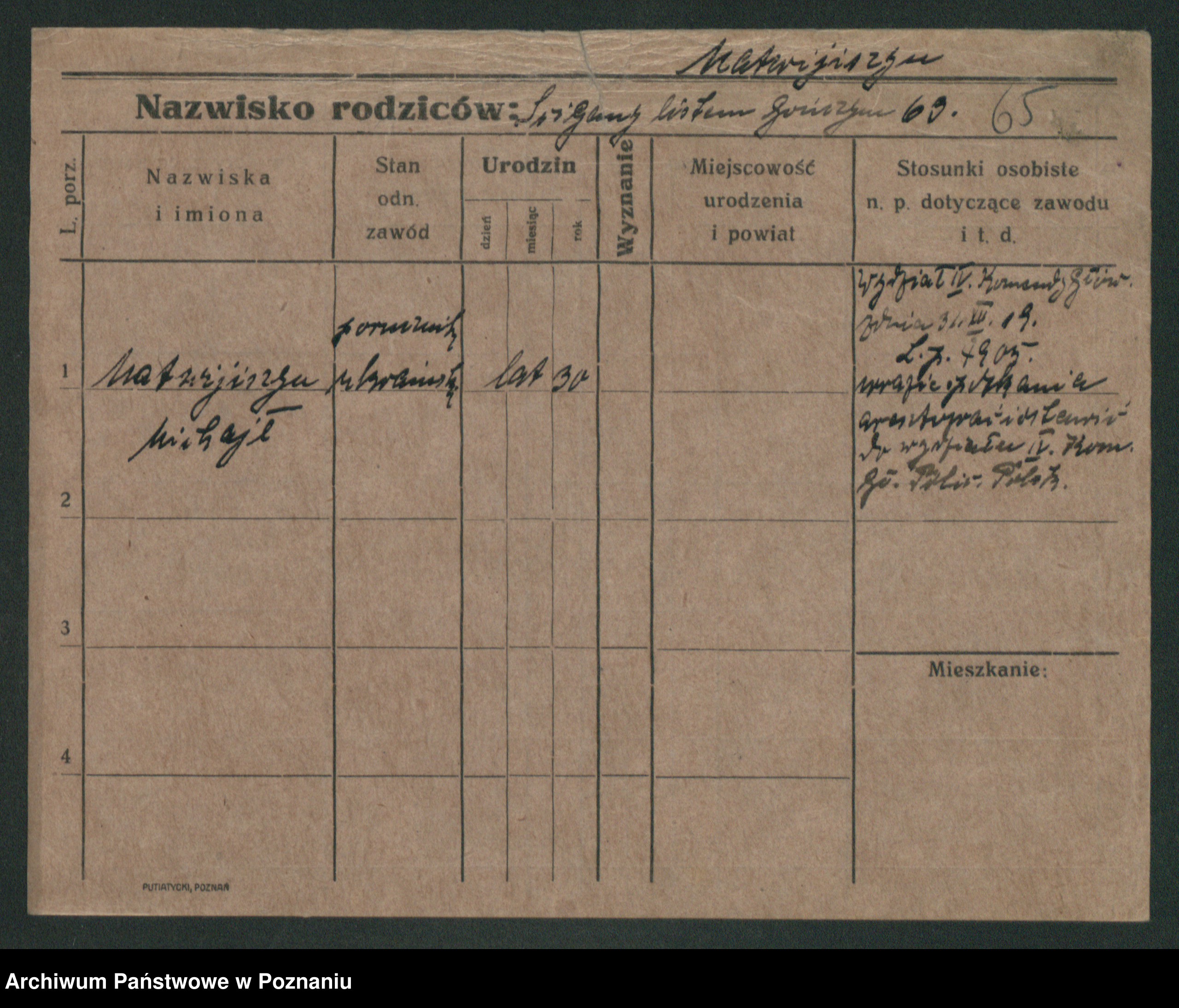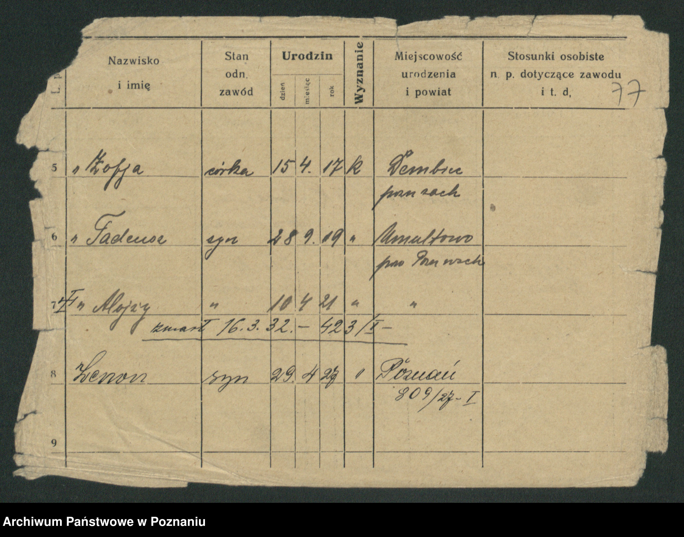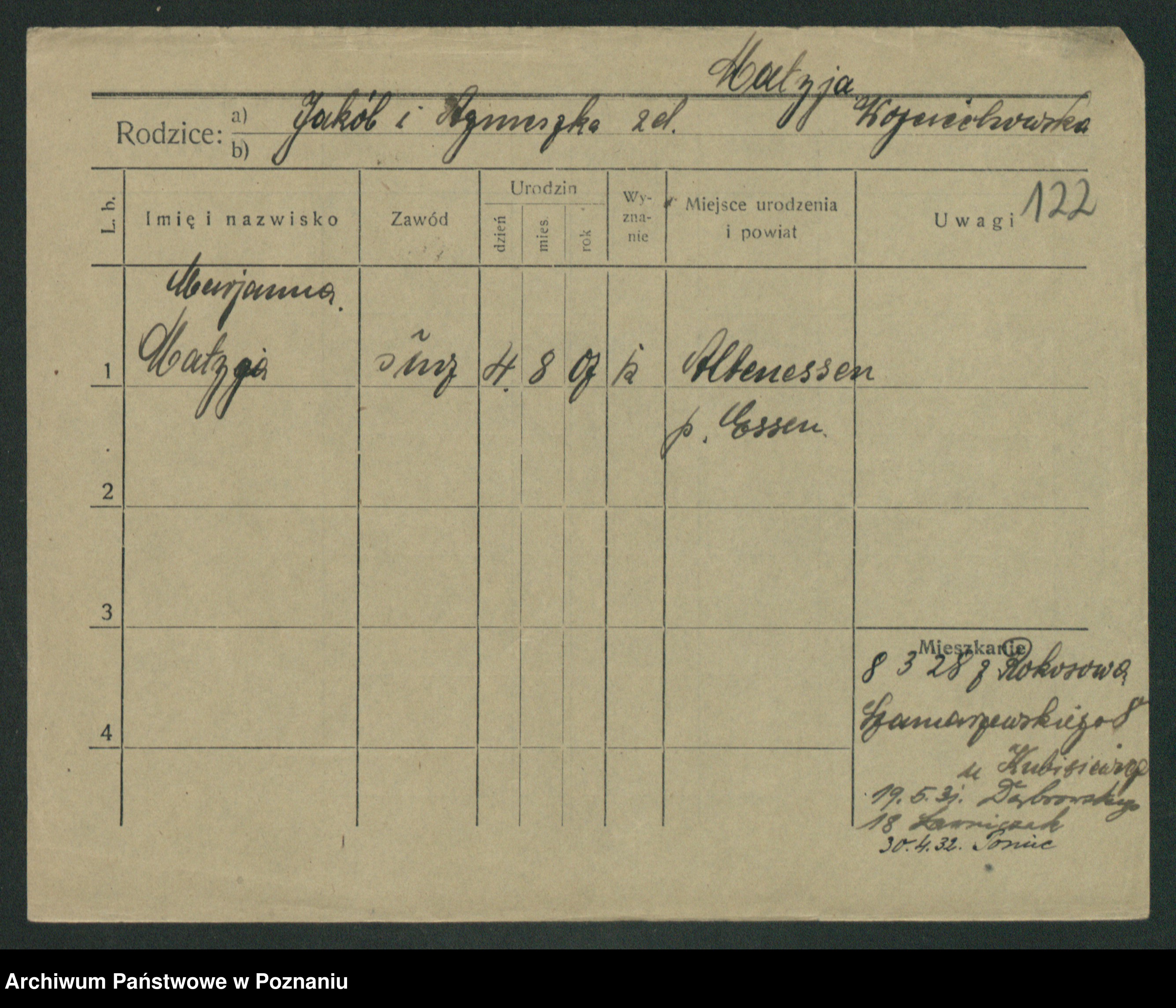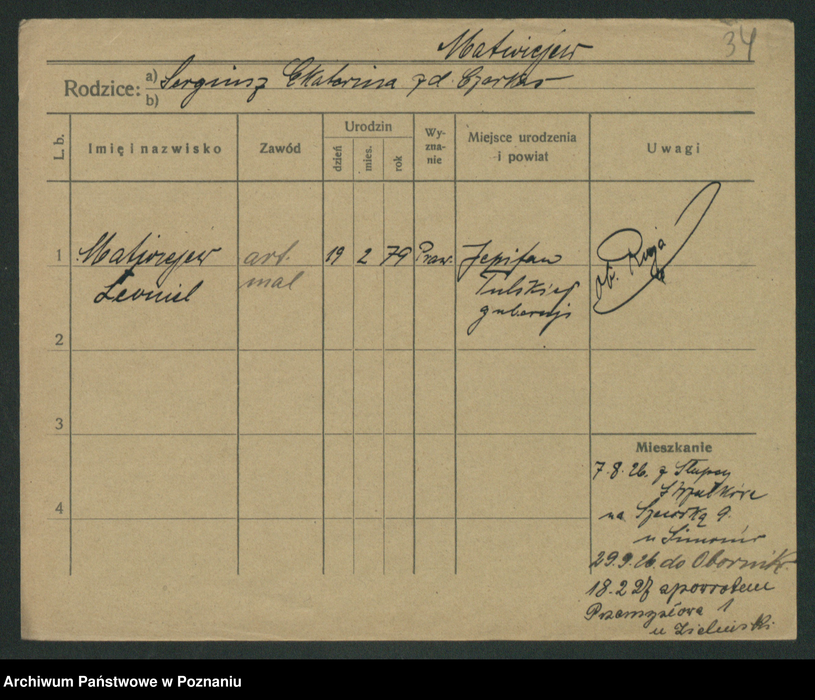 Podgląd karty osobowej dostępny jest po kliknięciu na nazwisko lub ikonkę karty. Można dokonywać powiększenia (ikony na górze) lub przechodzić między kolejnymi skanami (strzałki po bokach).