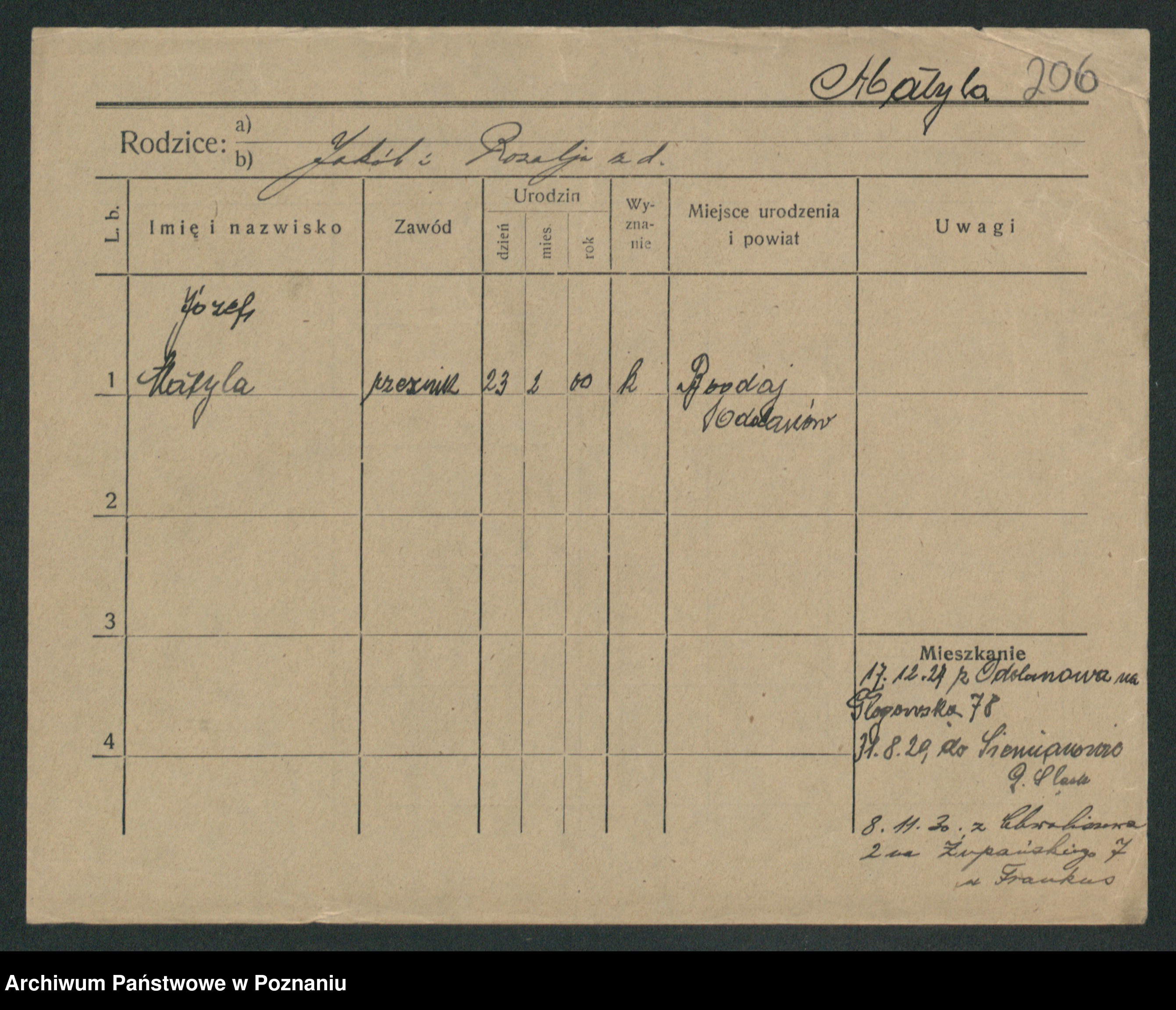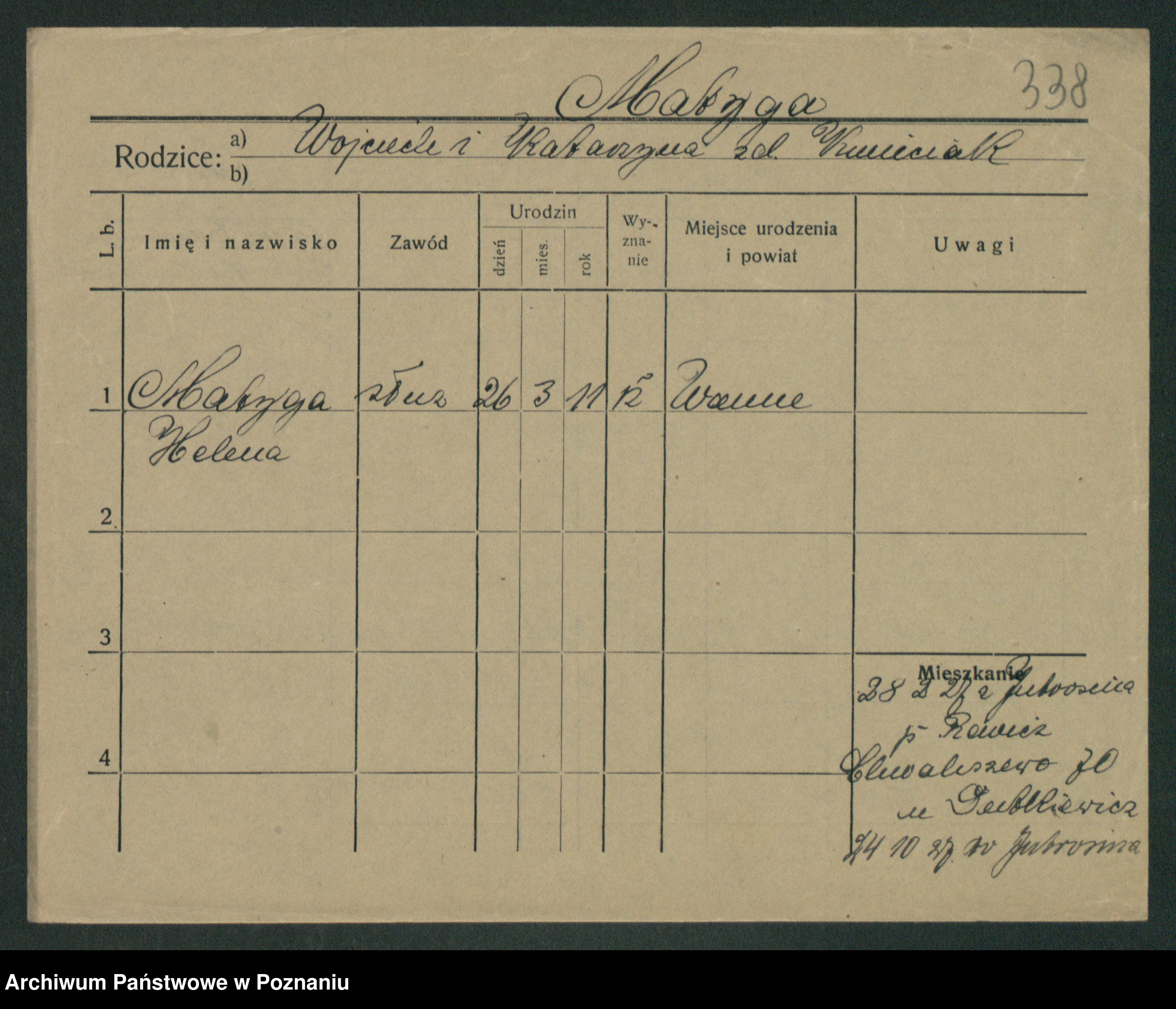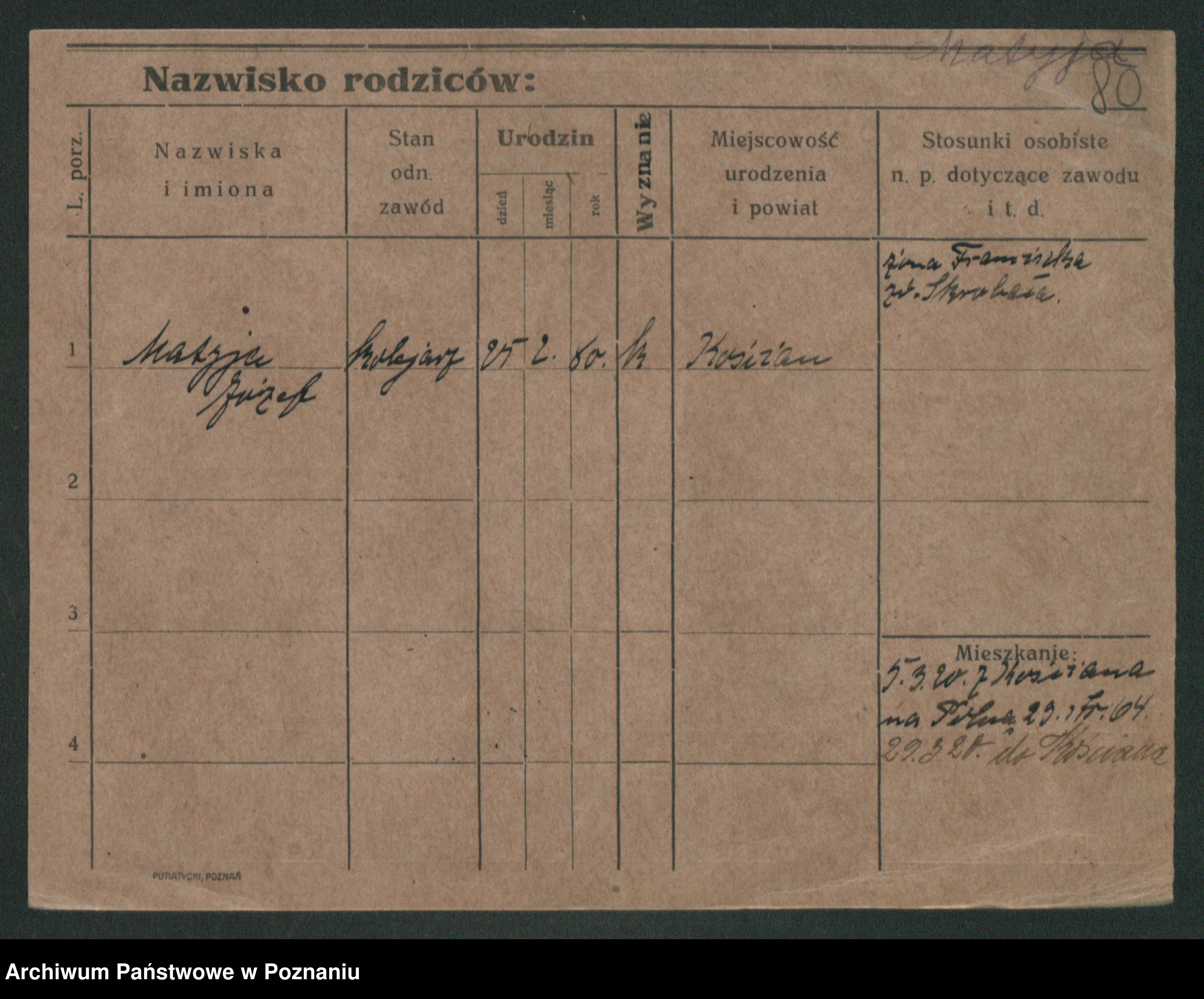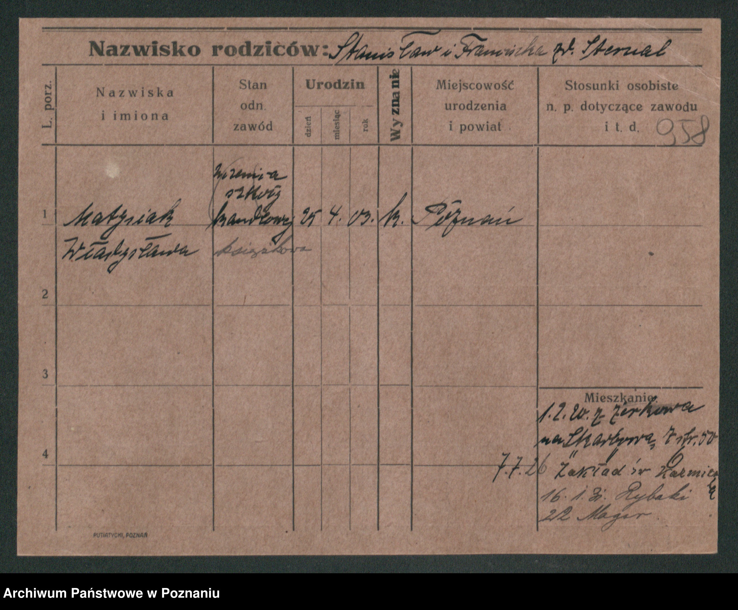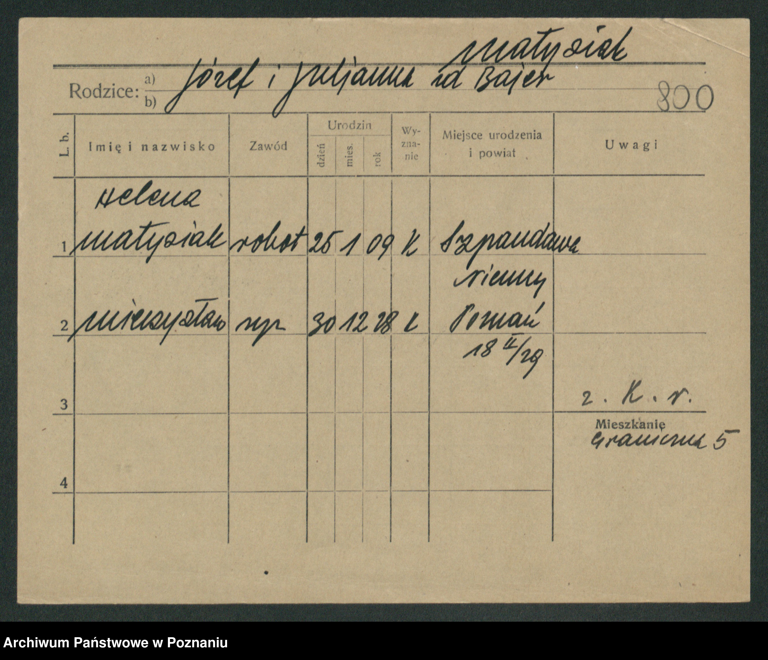 Podgląd karty osobowej dostępny jest po kliknięciu na nazwisko lub ikonkę karty. Można dokonywać powiększenia (ikony na górze) lub przechodzić między kolejnymi skanami (strzałki po bokach).
