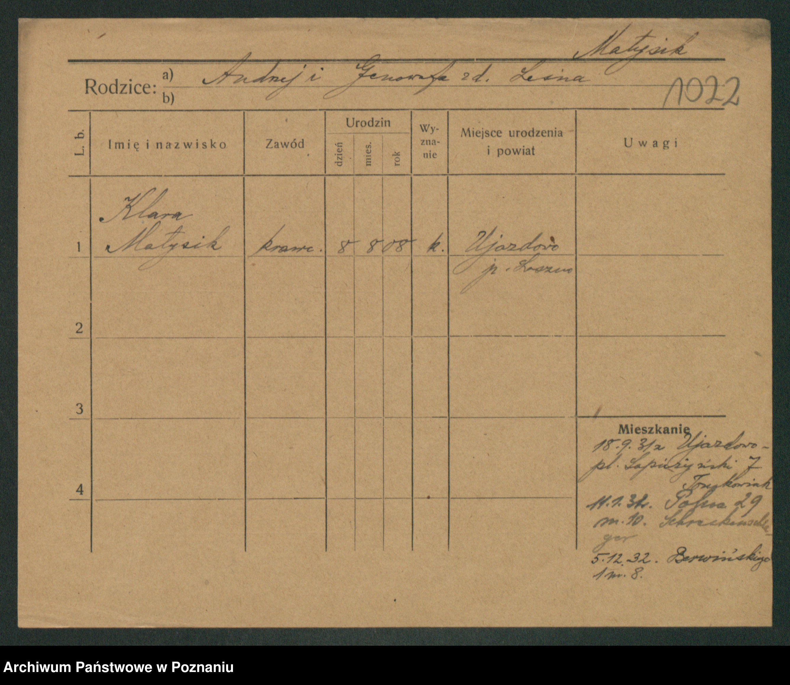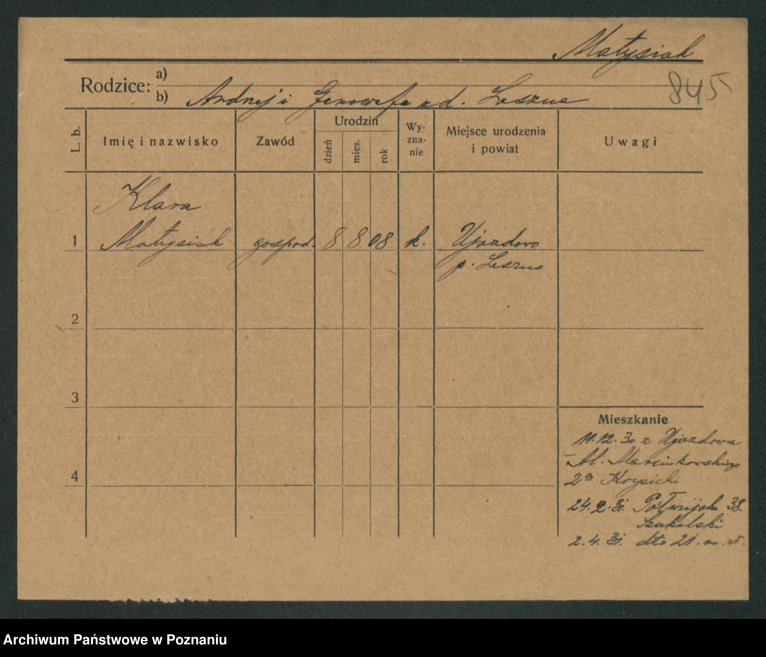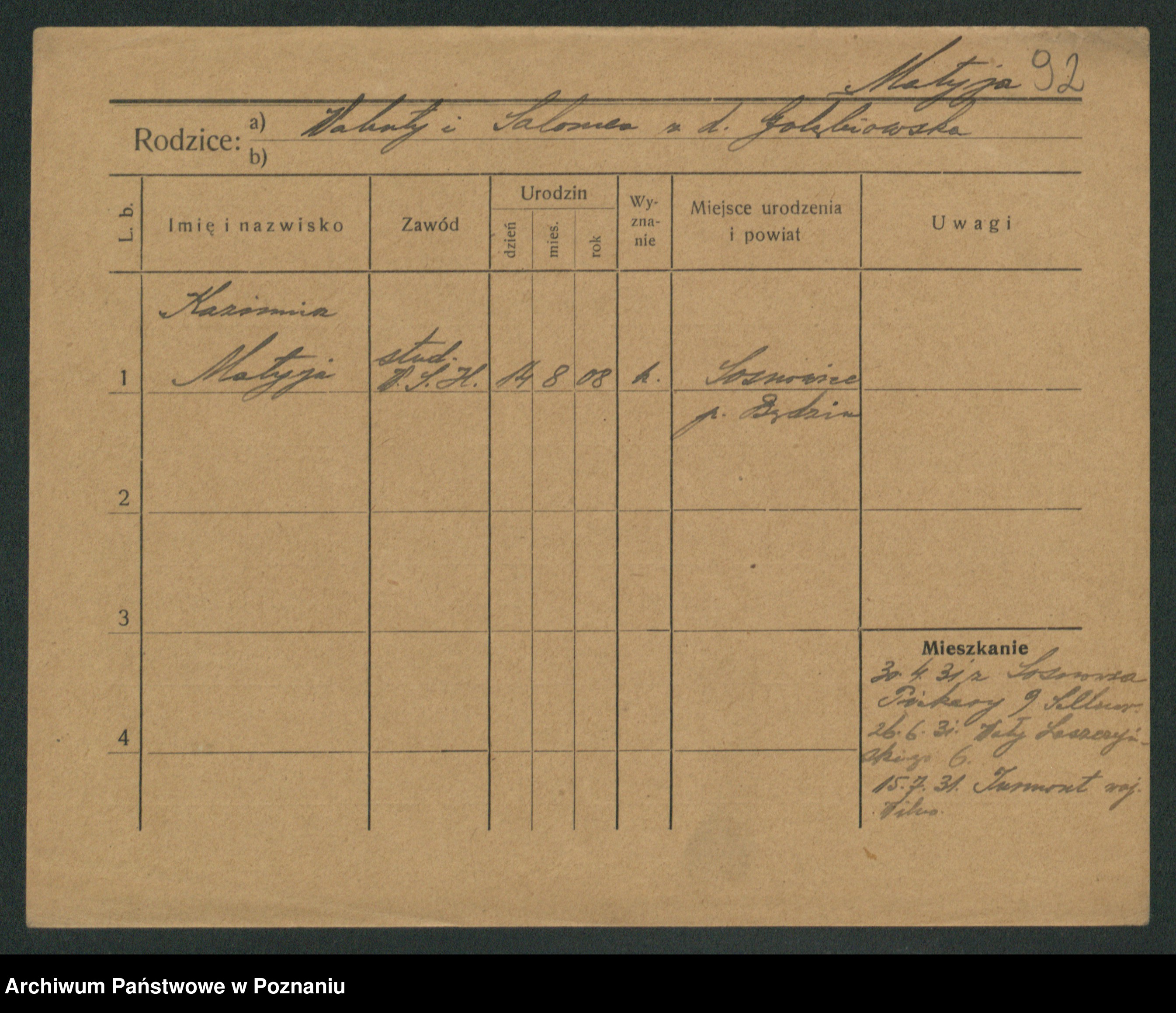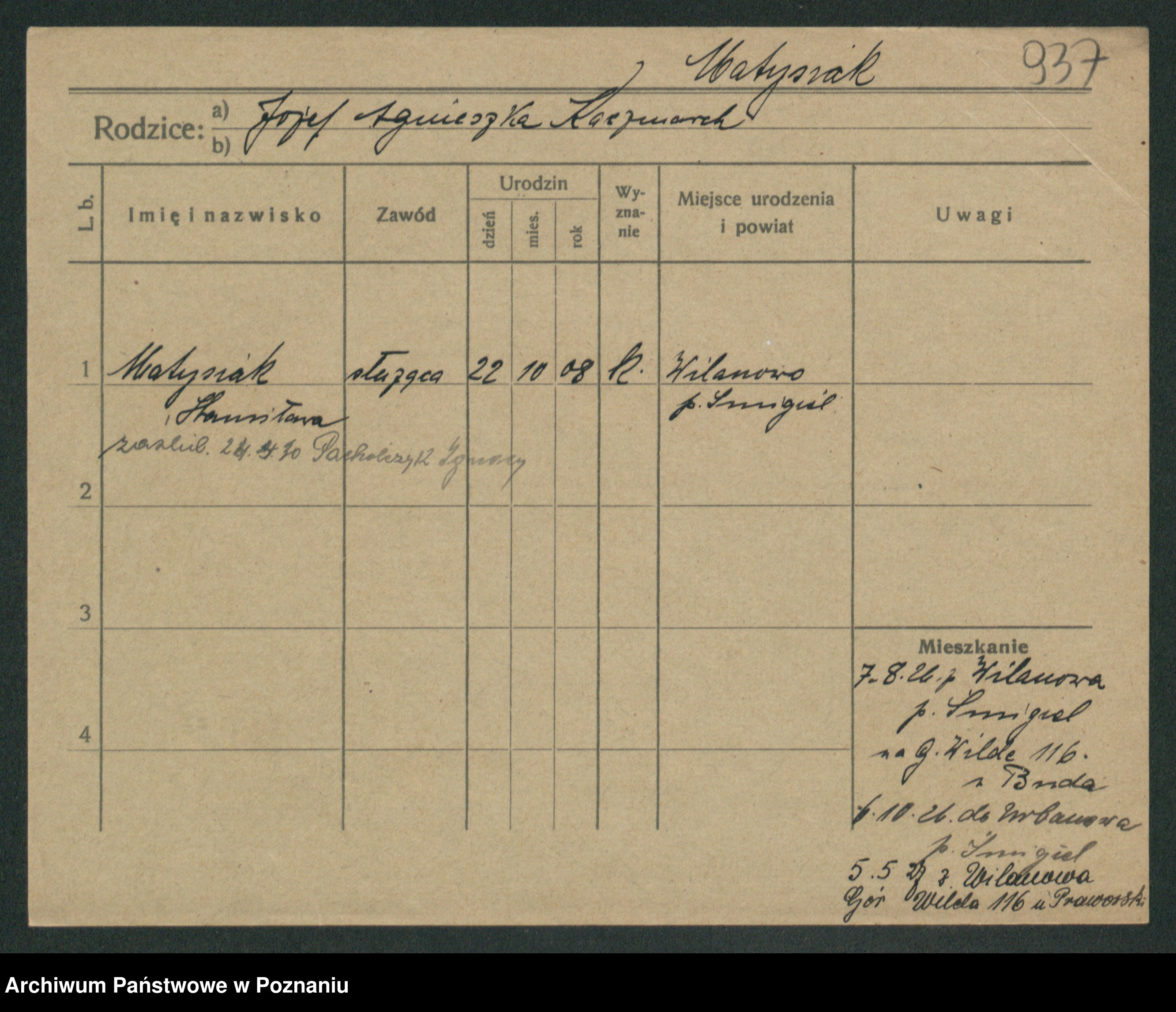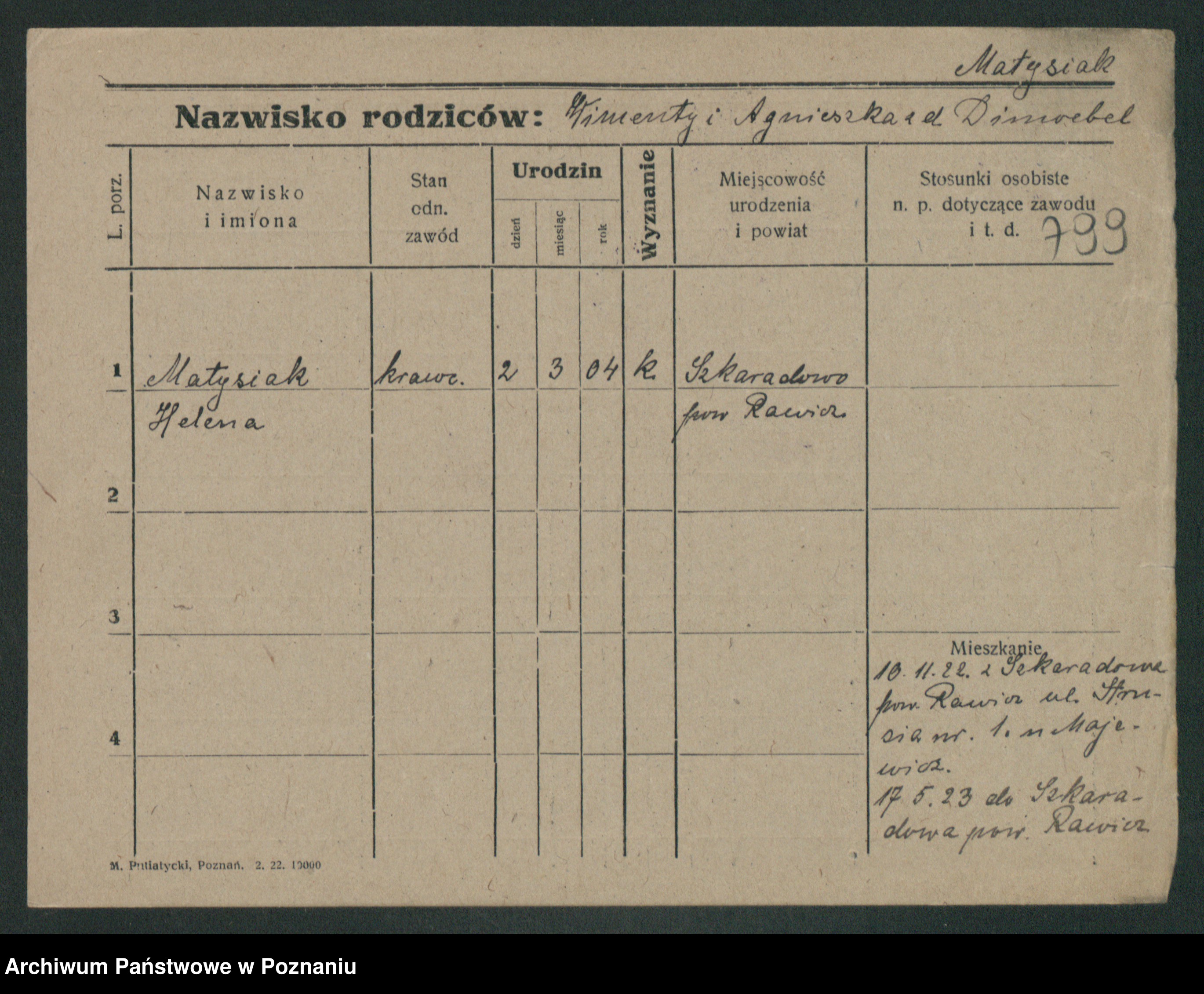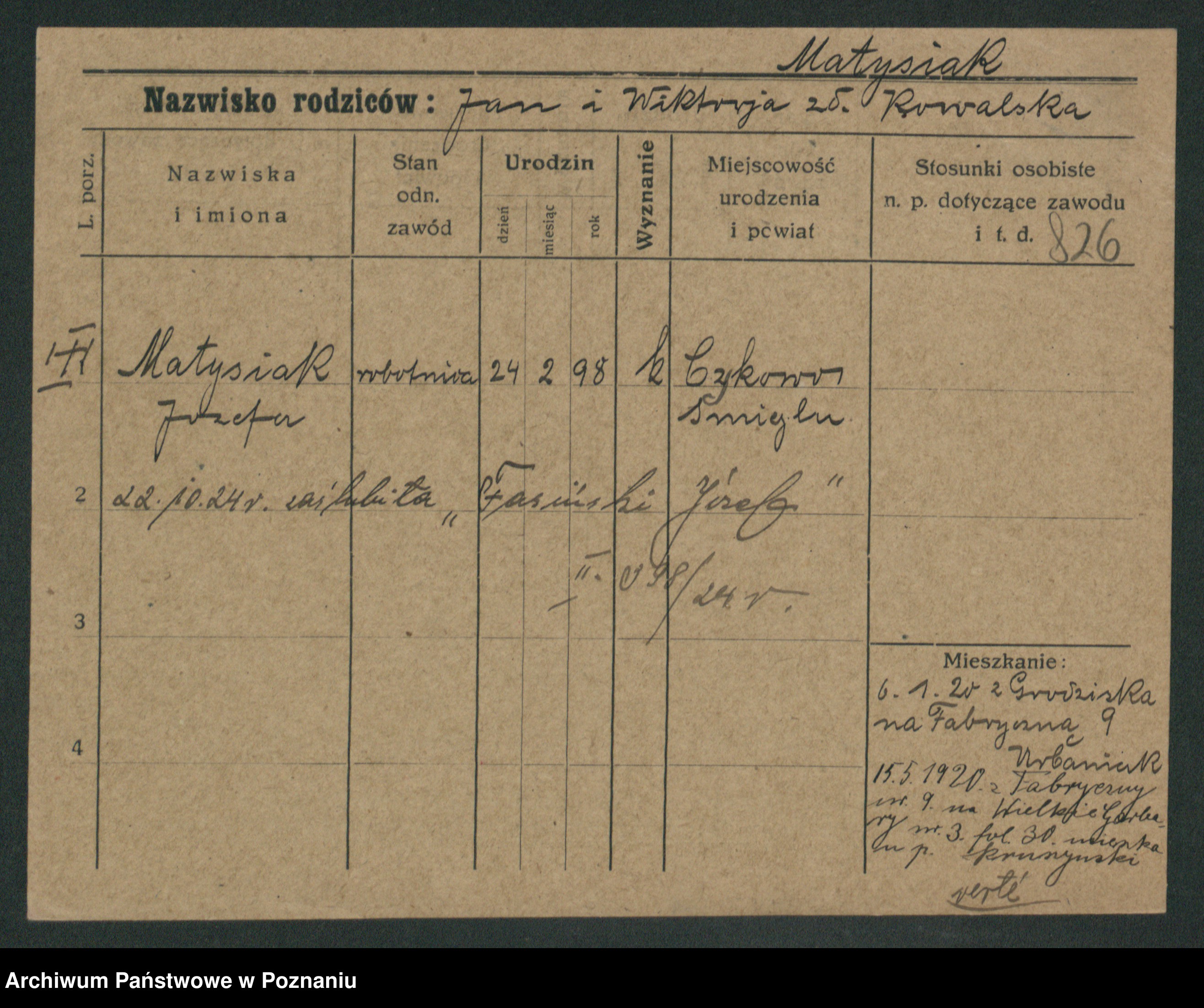 Podgląd karty osobowej dostępny jest po kliknięciu na nazwisko lub ikonkę karty. Można dokonywać powiększenia (ikony na górze) lub przechodzić między kolejnymi skanami (strzałki po bokach).