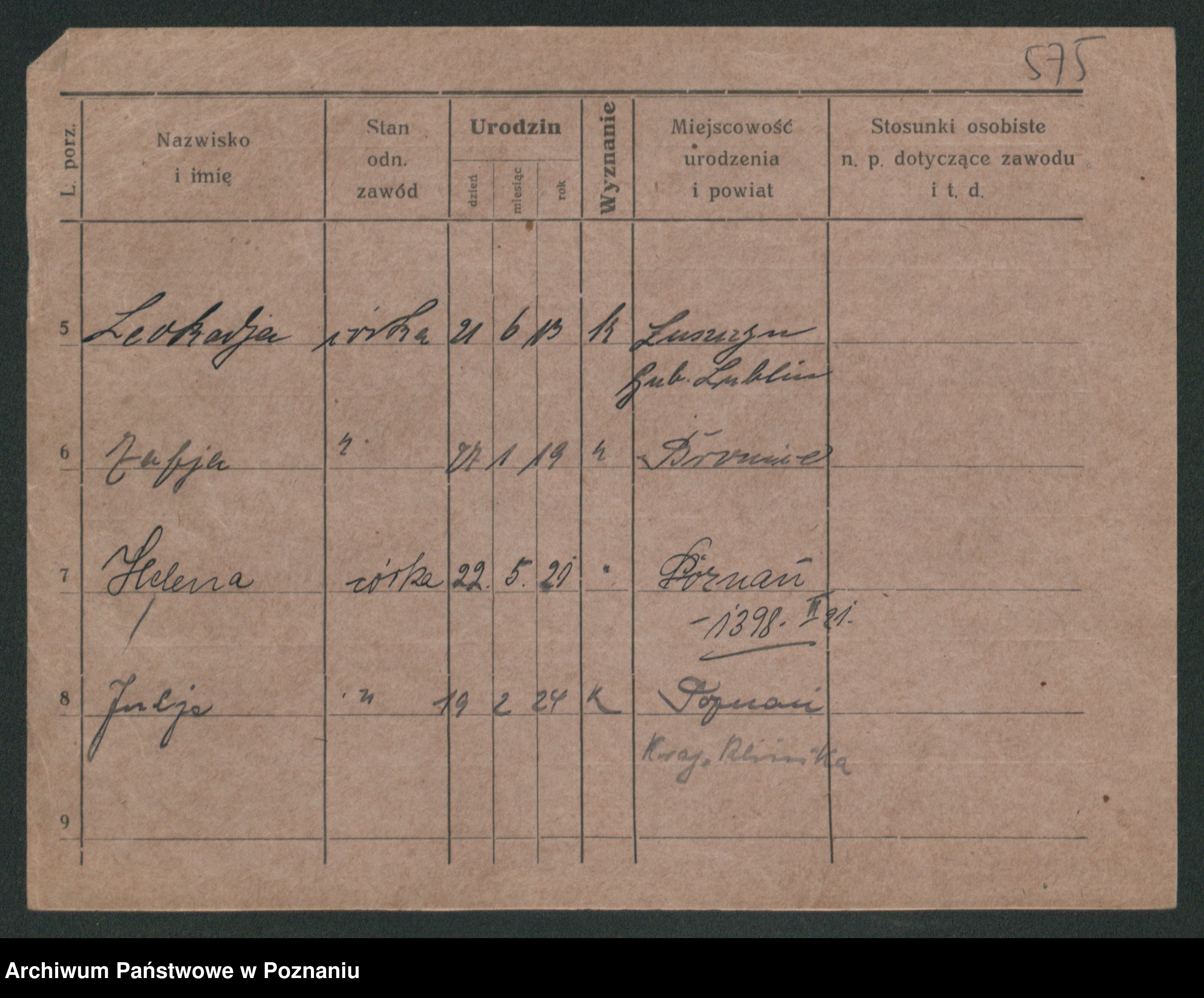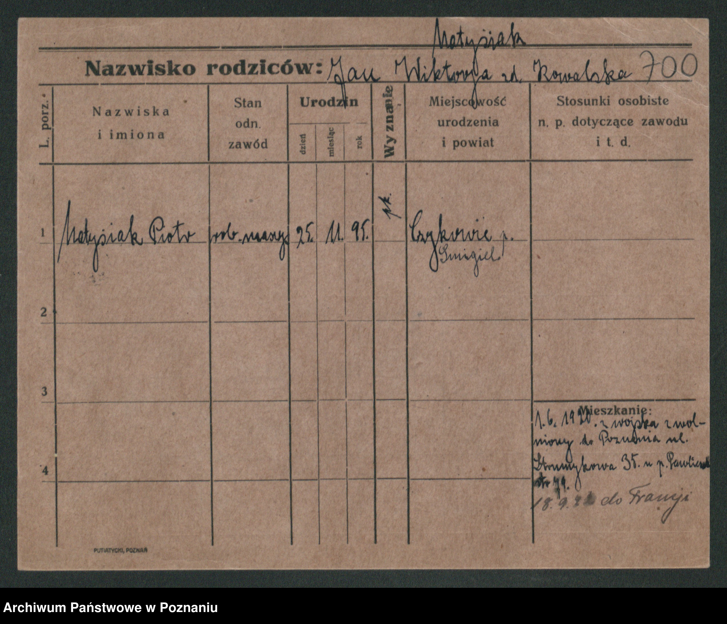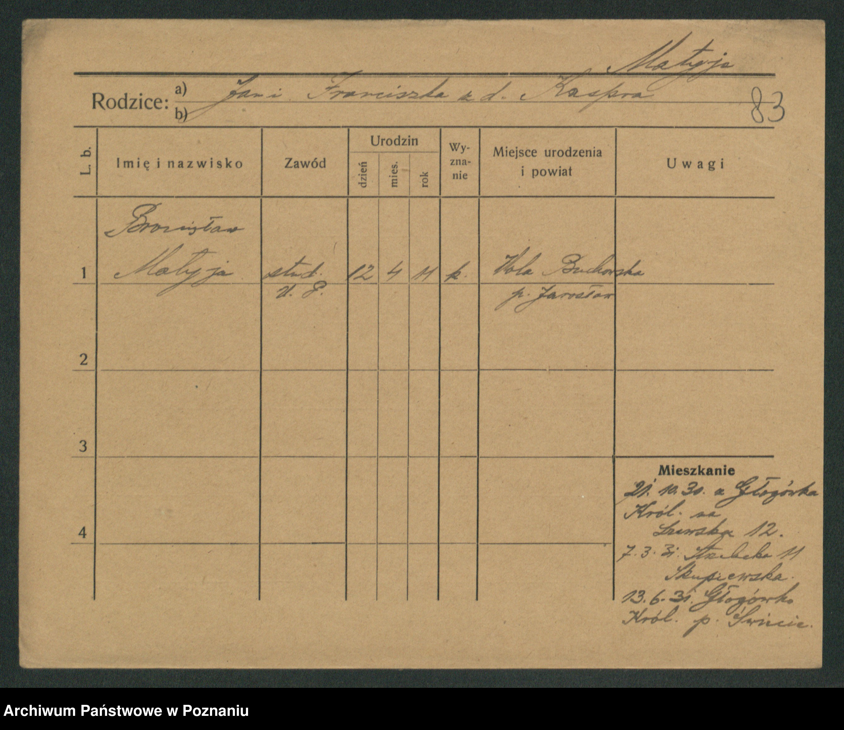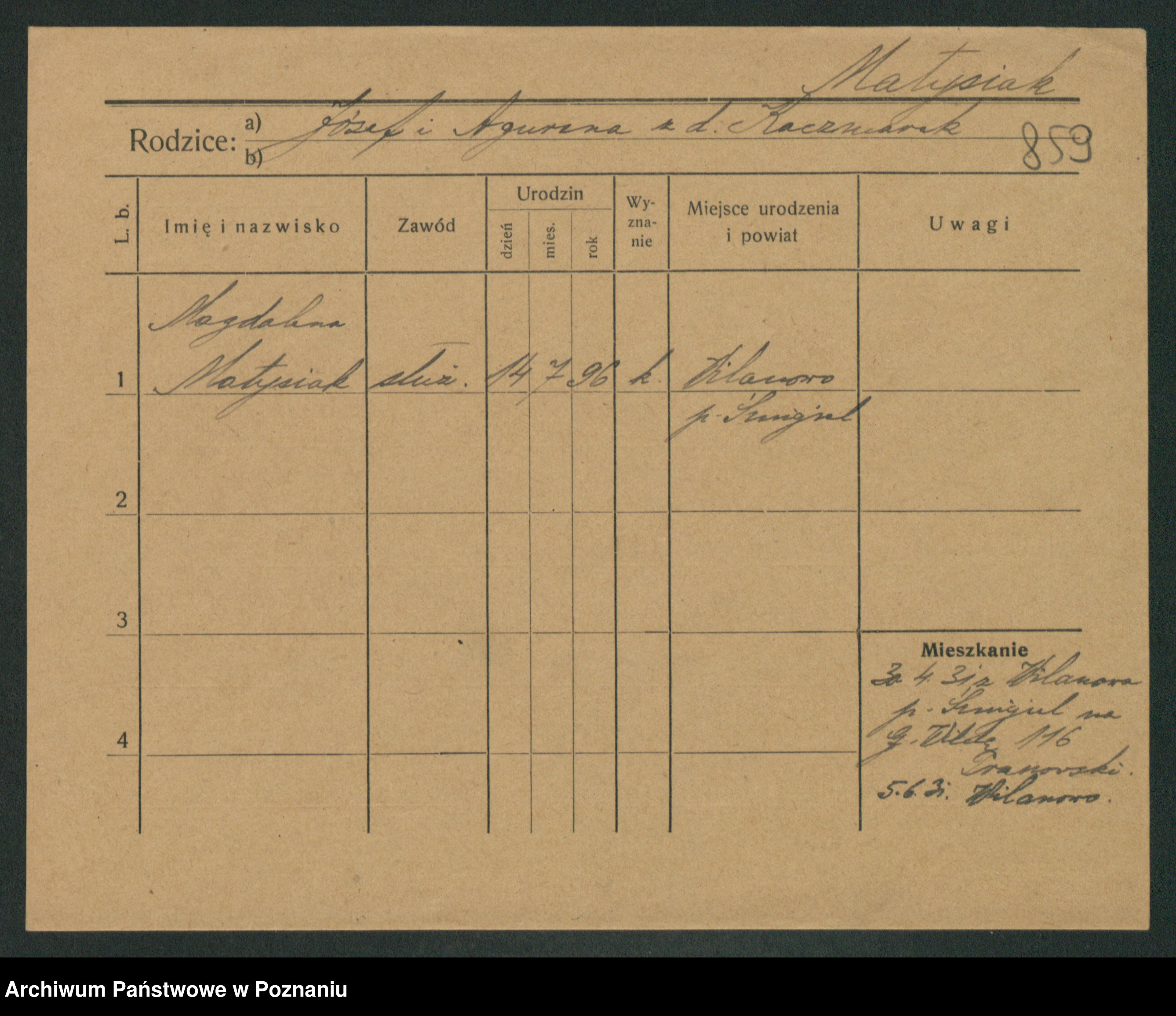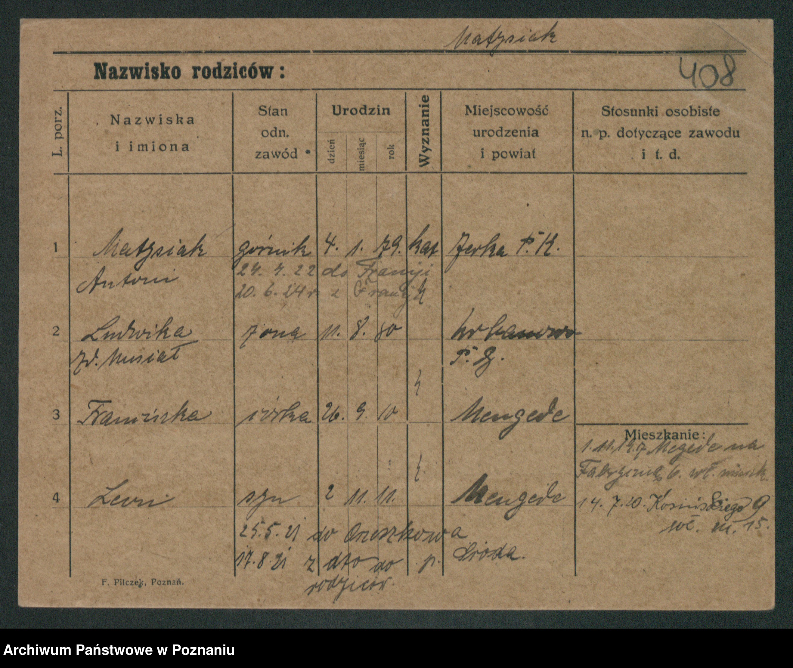 Podgląd karty osobowej dostępny jest po kliknięciu na nazwisko lub ikonkę karty. Można dokonywać powiększenia (ikony na górze) lub przechodzić między kolejnymi skanami (strzałki po bokach).