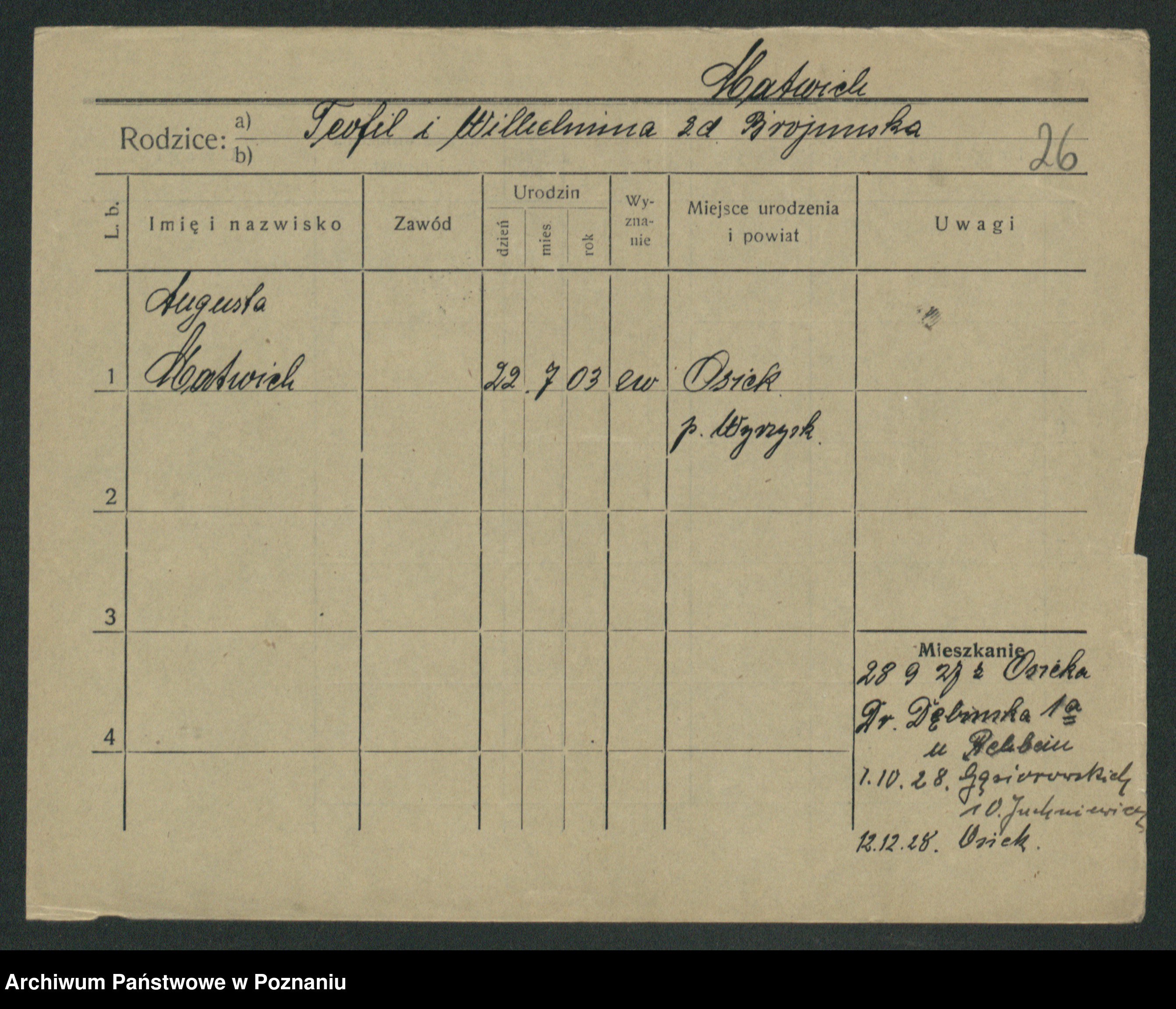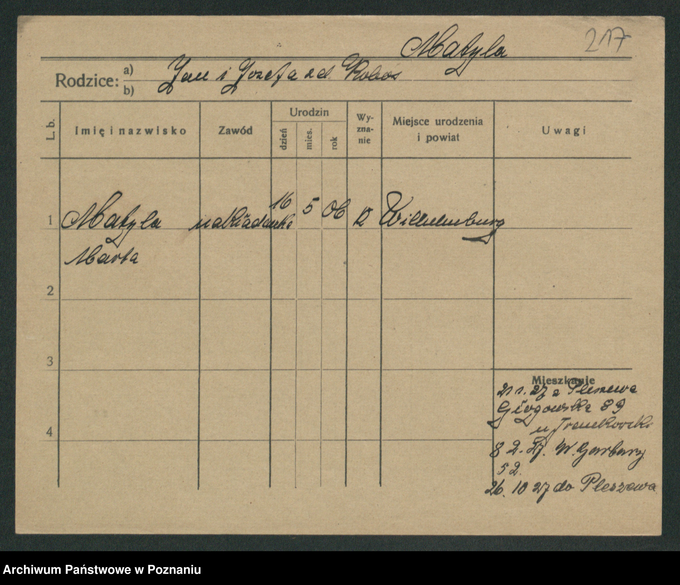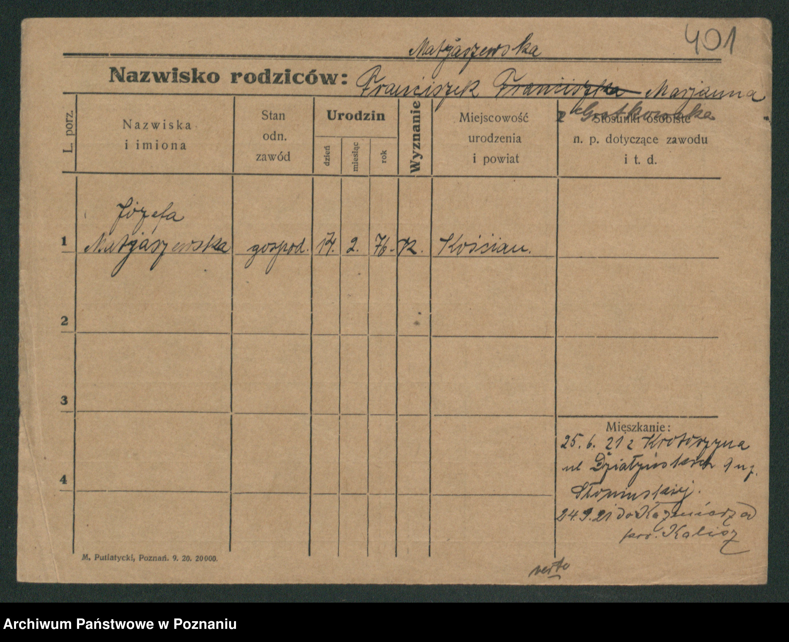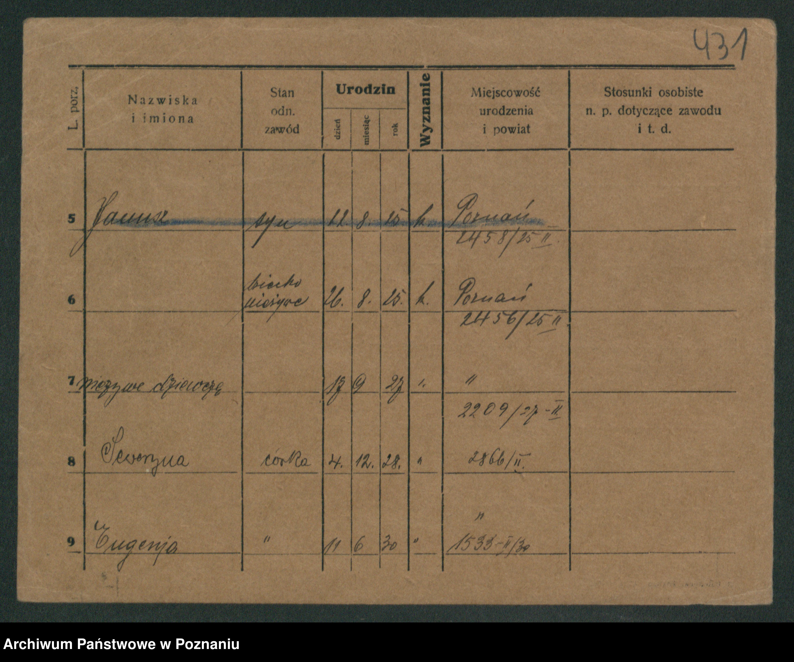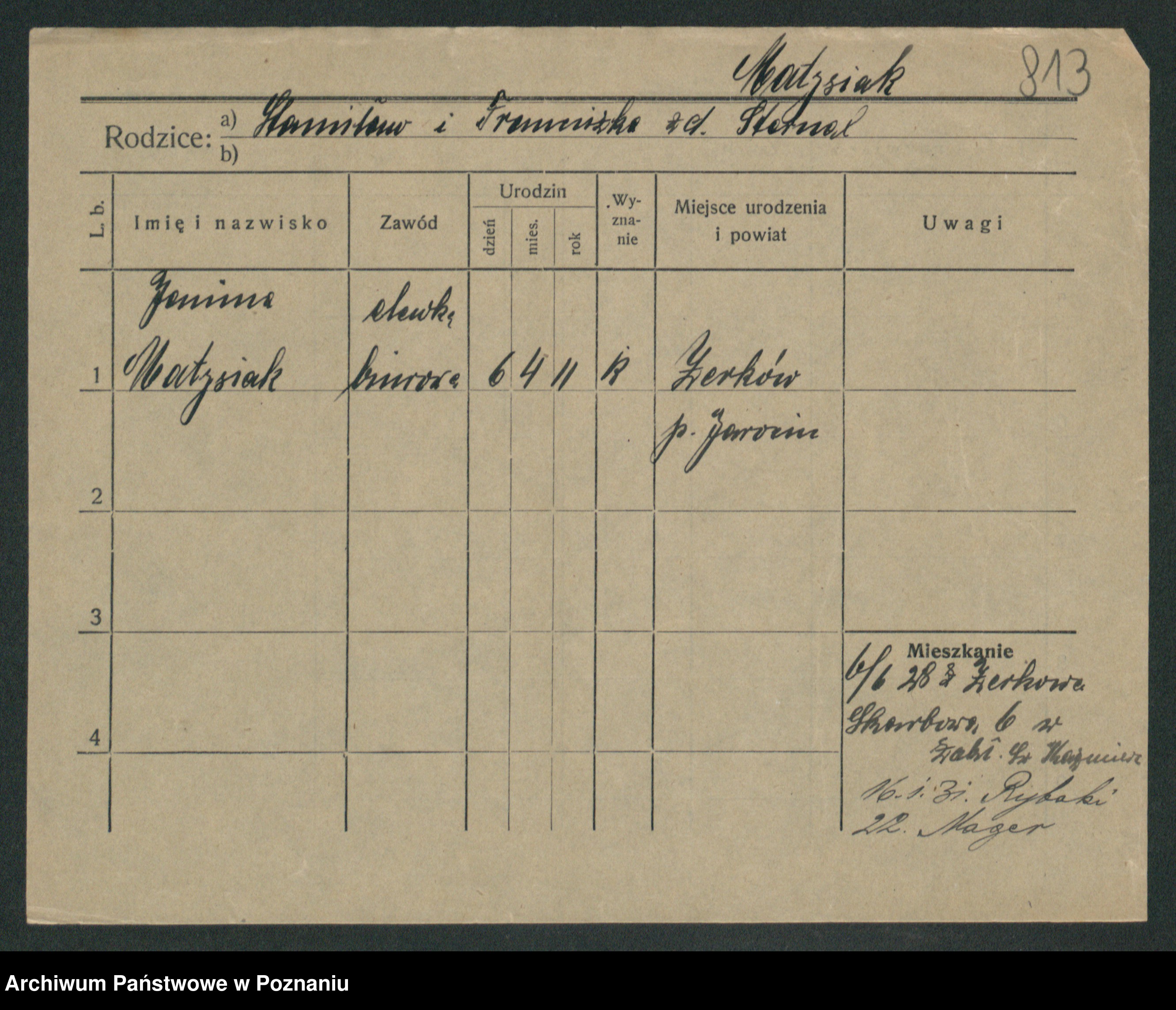 Podgląd karty osobowej dostępny jest po kliknięciu na nazwisko lub ikonkę karty. Można dokonywać powiększenia (ikony na górze) lub przechodzić między kolejnymi skanami (strzałki po bokach).