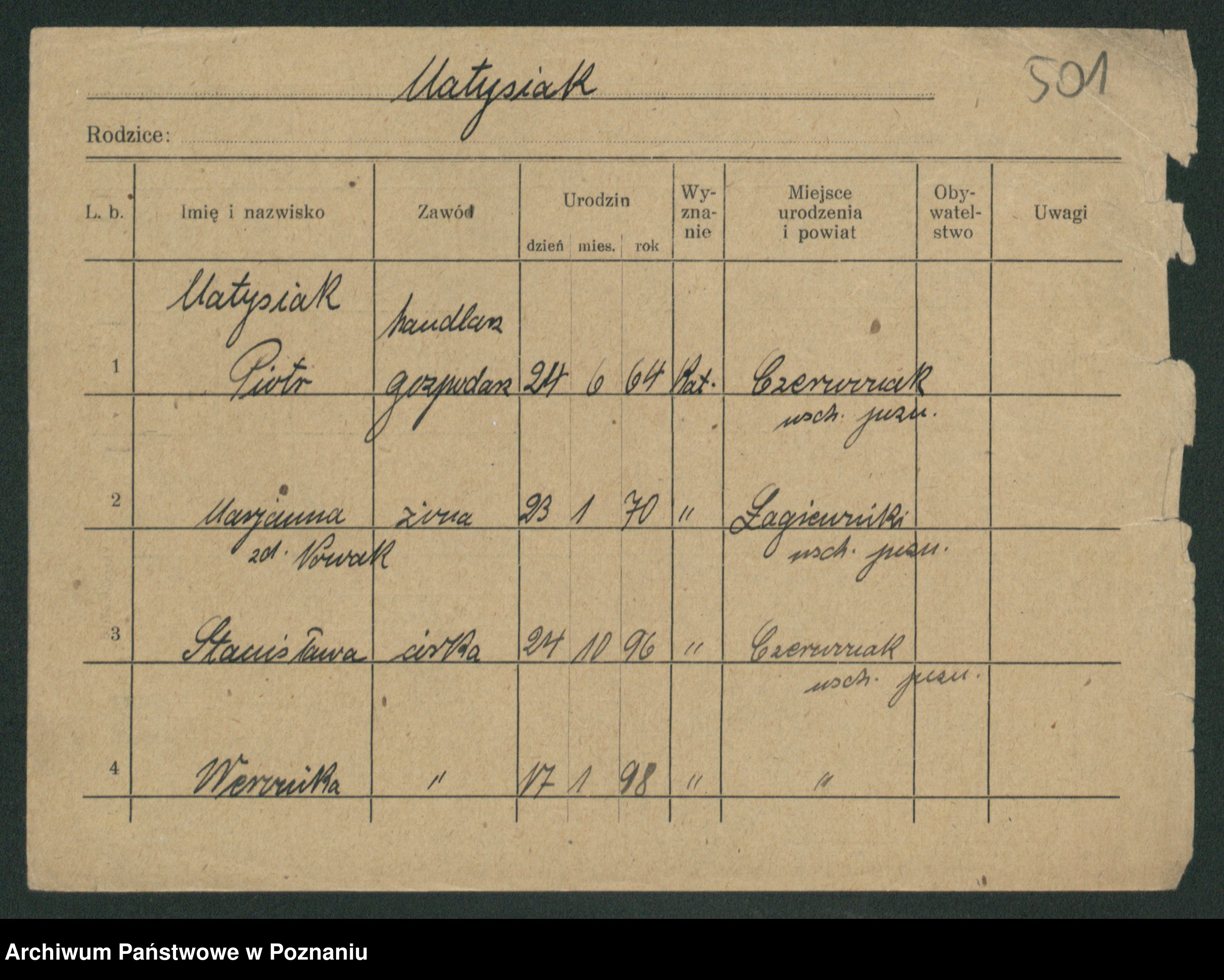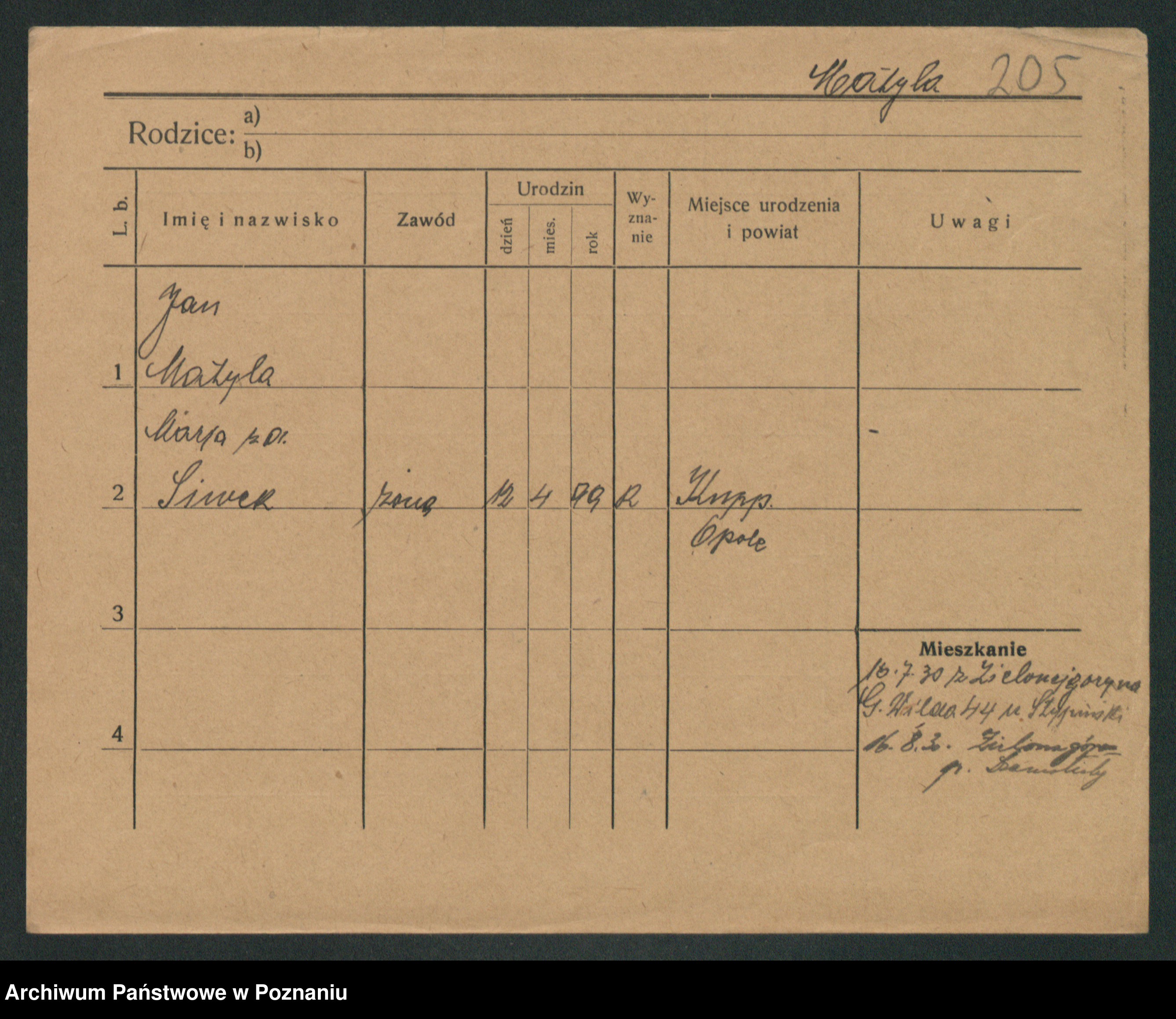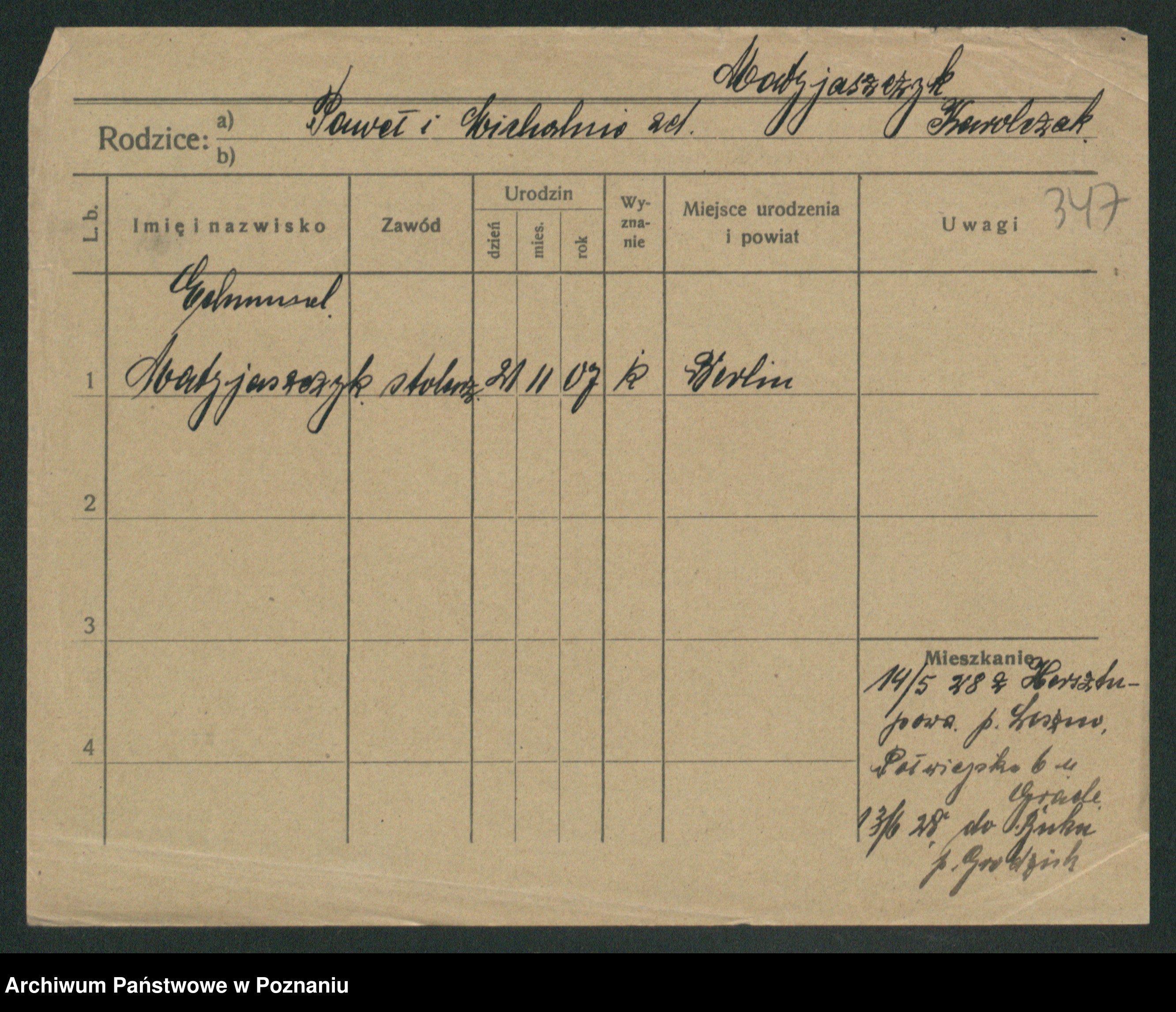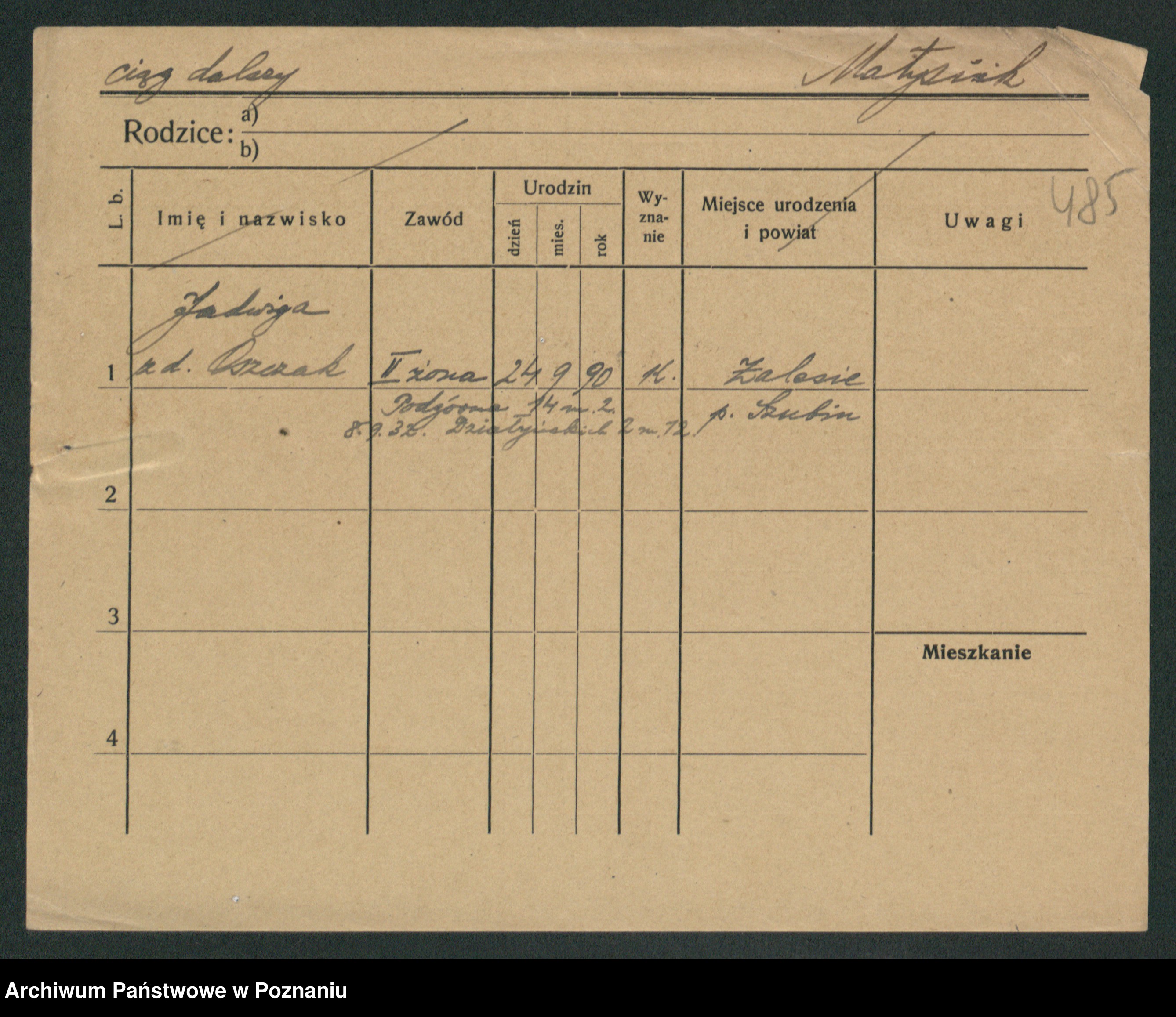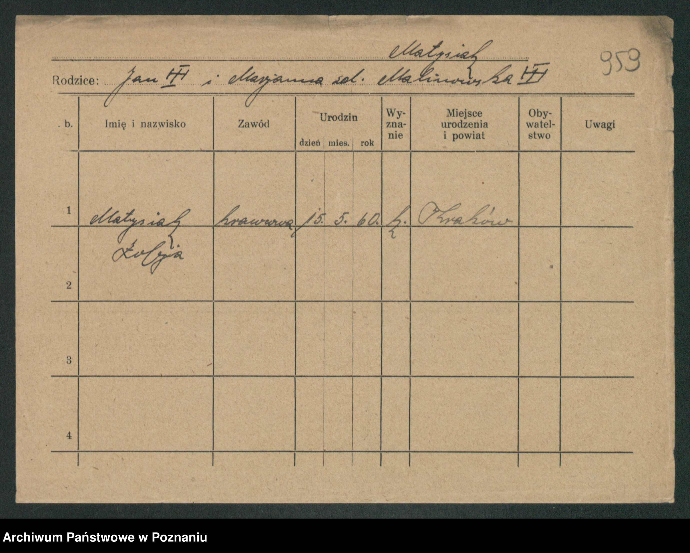 Podgląd karty osobowej dostępny jest po kliknięciu na nazwisko lub ikonkę karty. Można dokonywać powiększenia (ikony na górze) lub przechodzić między kolejnymi skanami (strzałki po bokach).