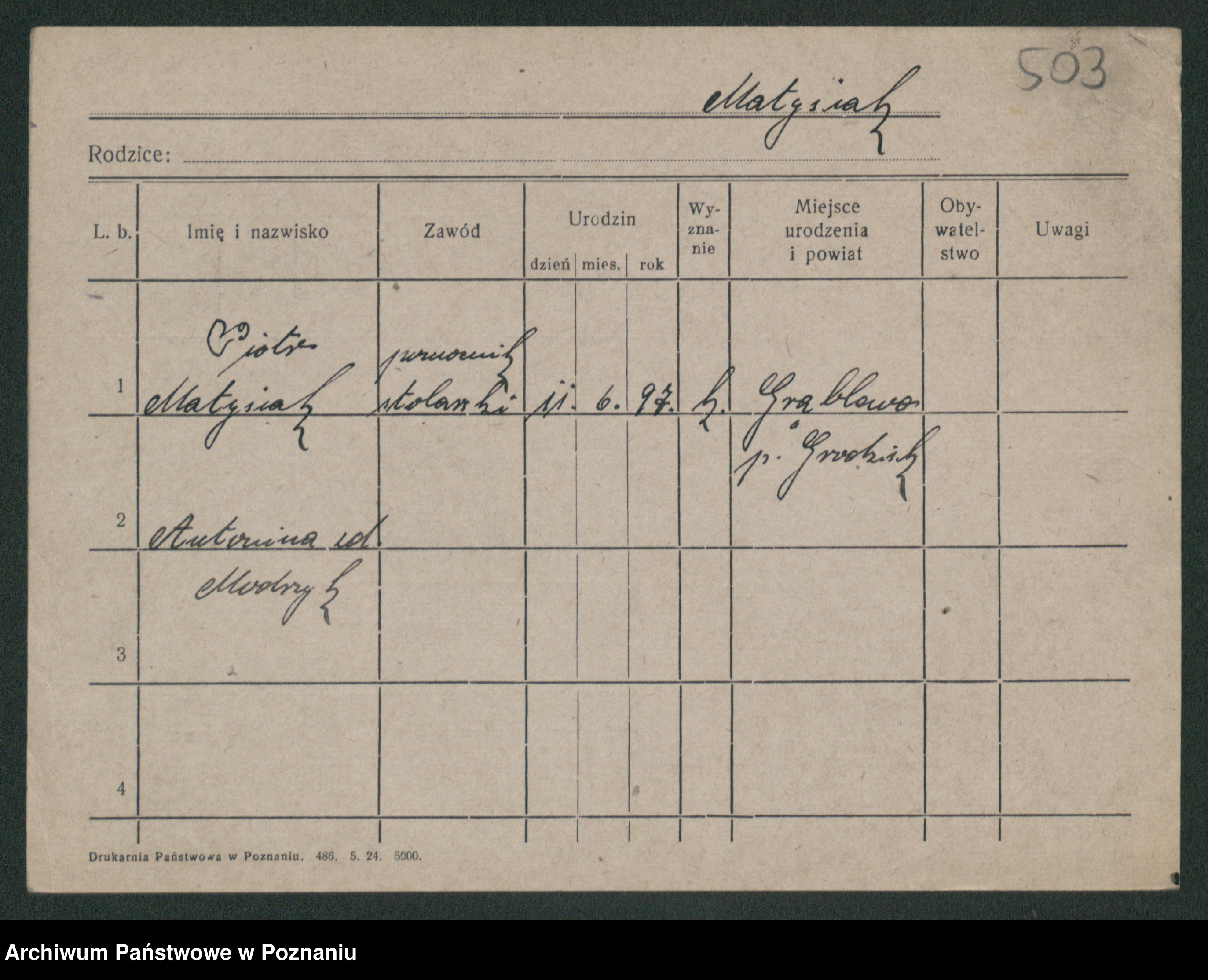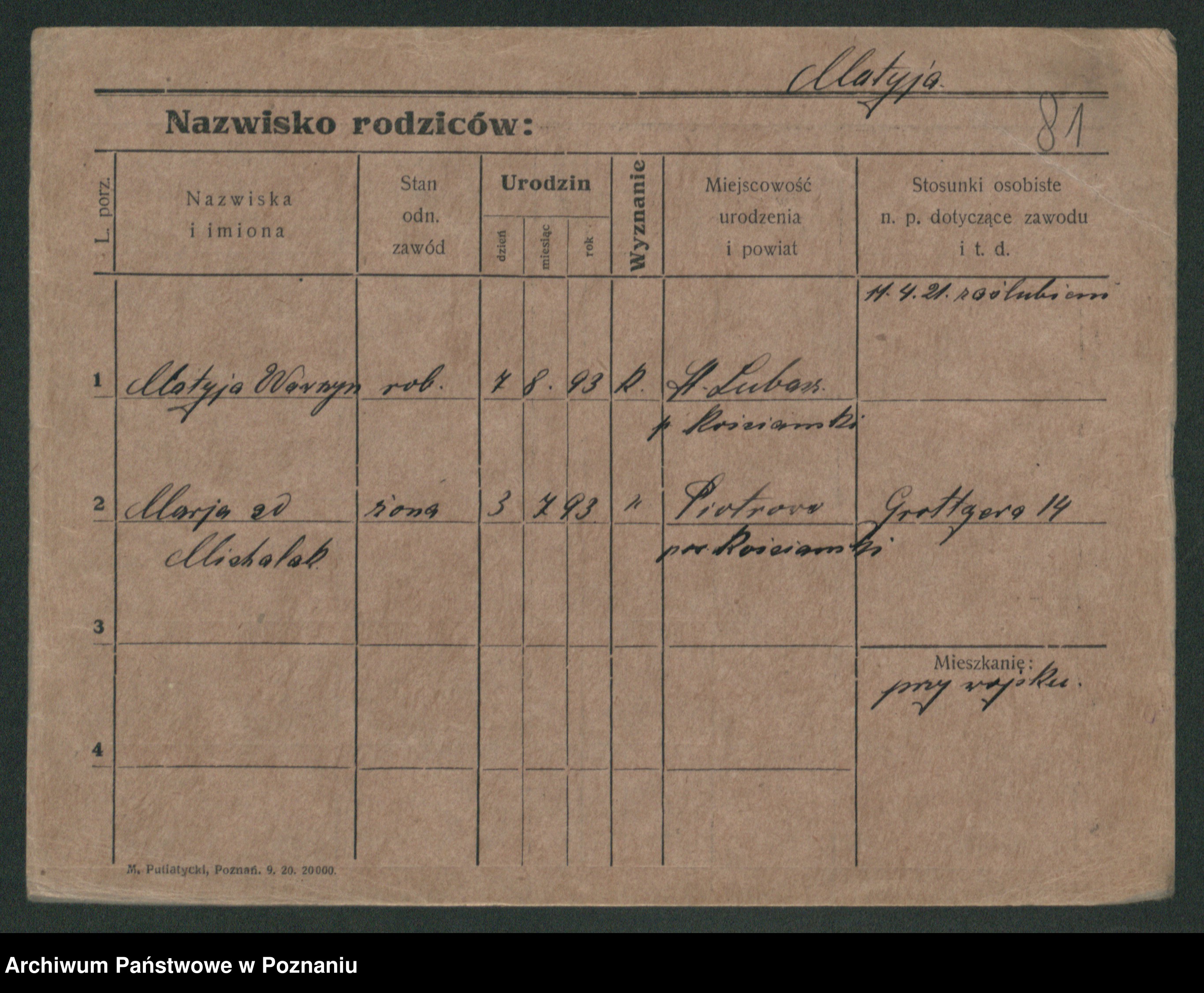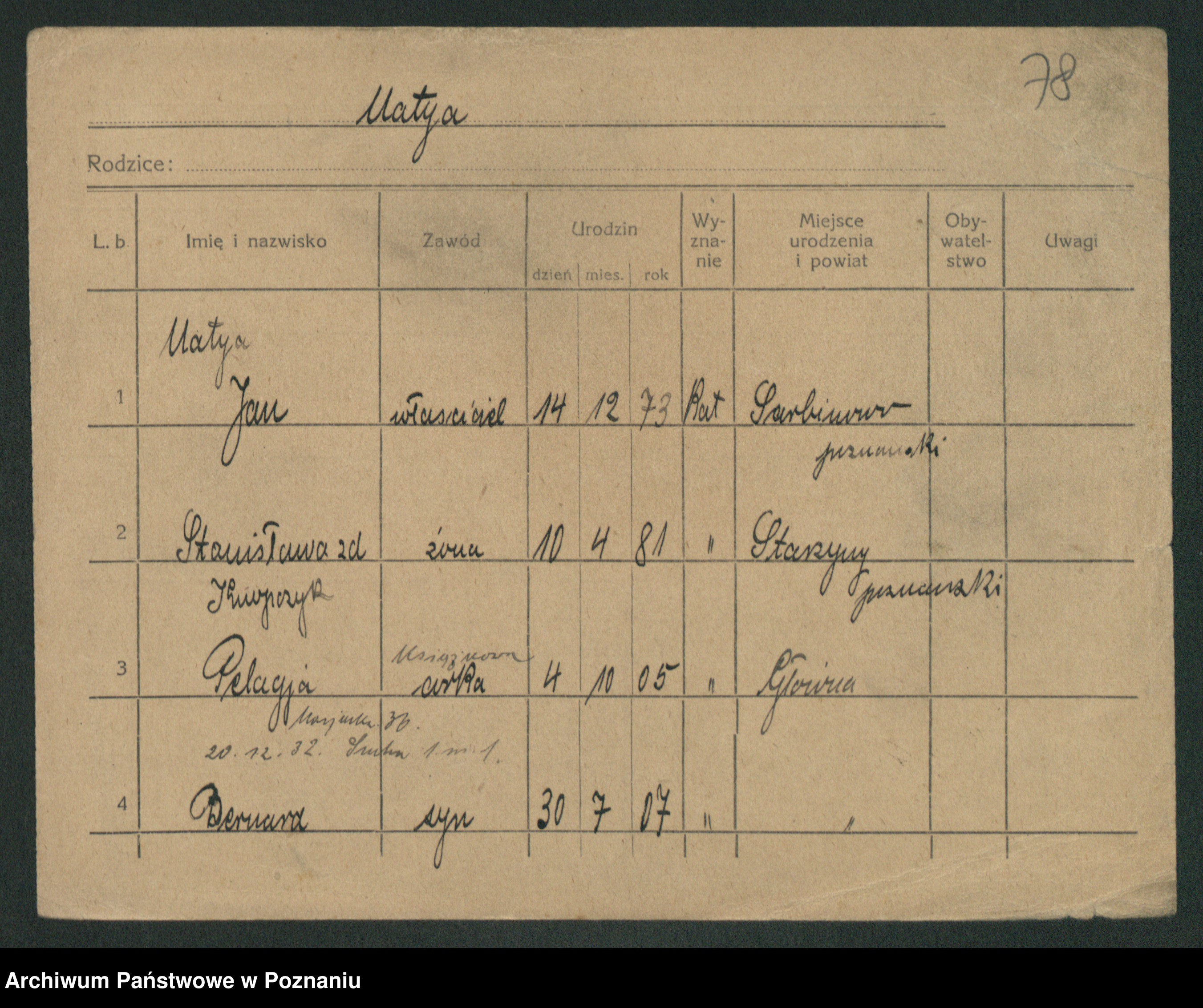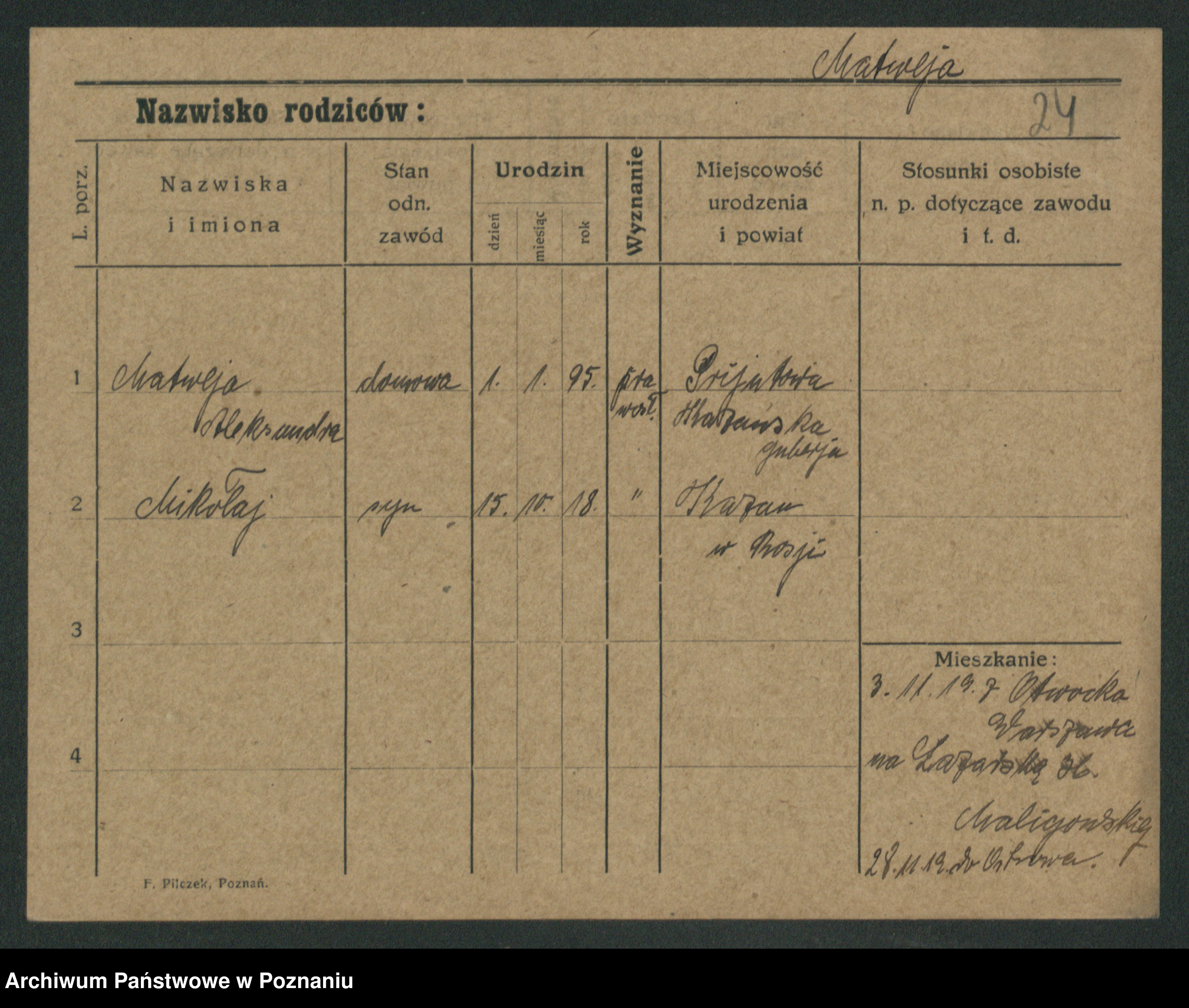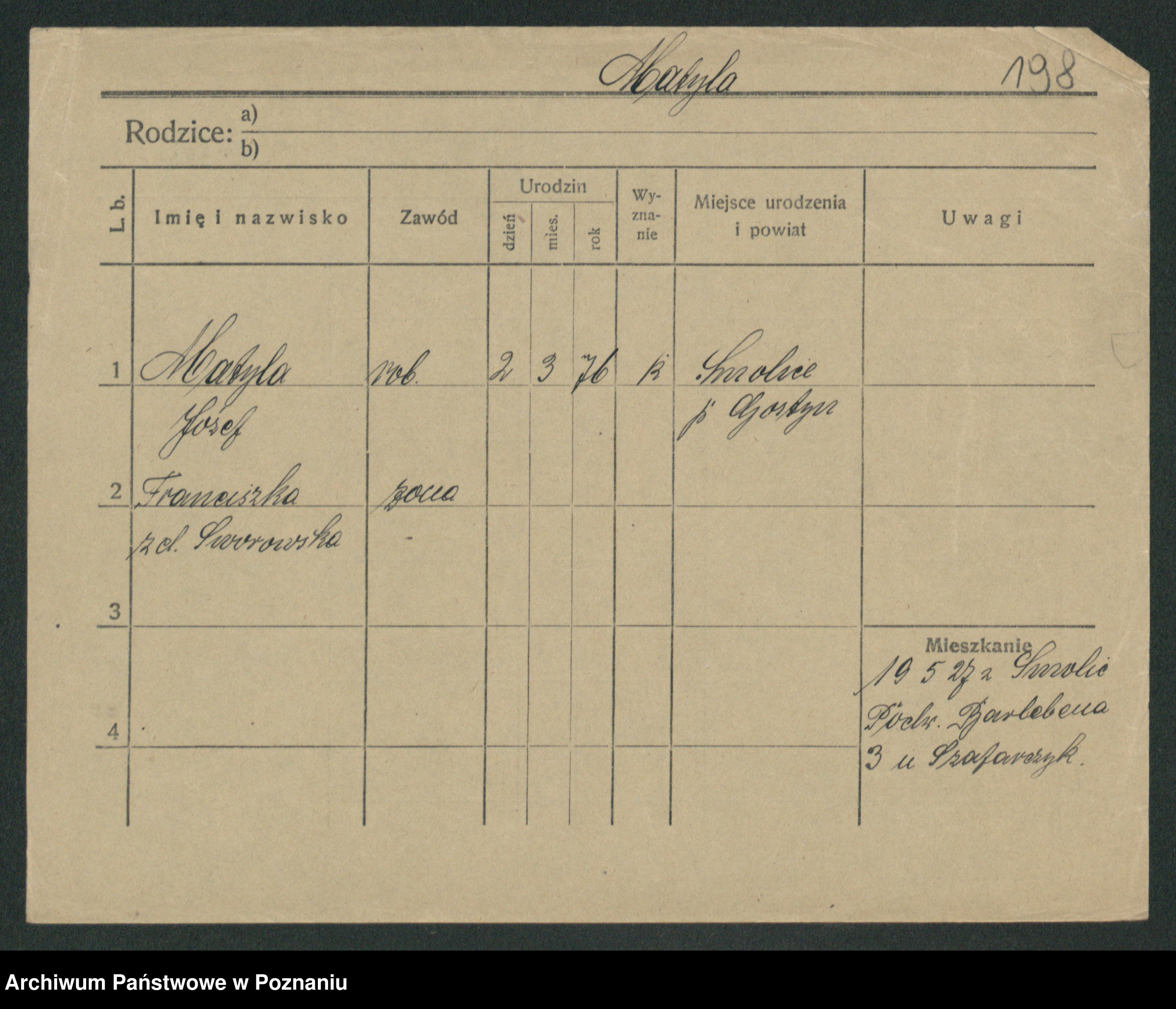 Podgląd karty osobowej dostępny jest po kliknięciu na nazwisko lub ikonkę karty. Można dokonywać powiększenia (ikony na górze) lub przechodzić między kolejnymi skanami (strzałki po bokach).