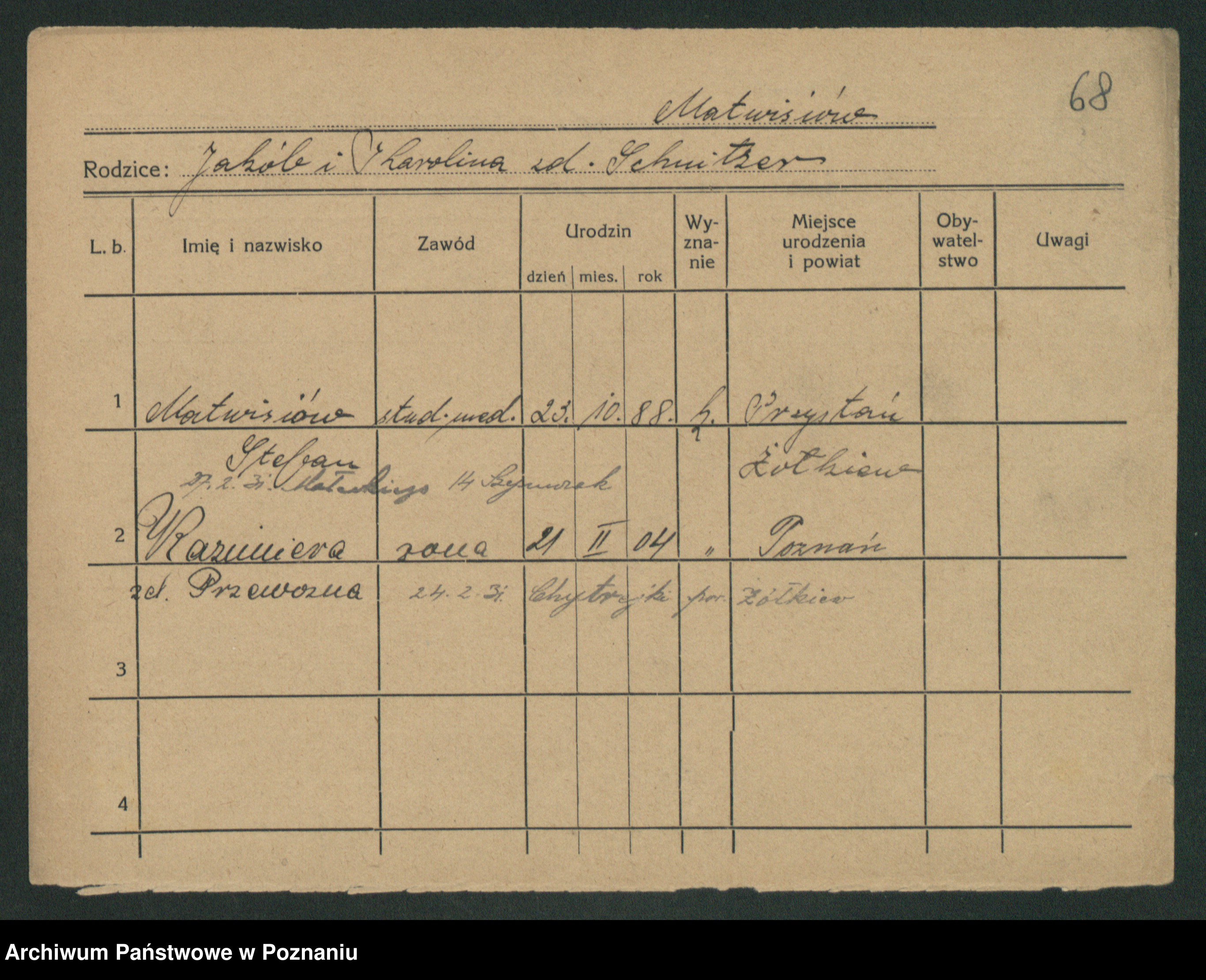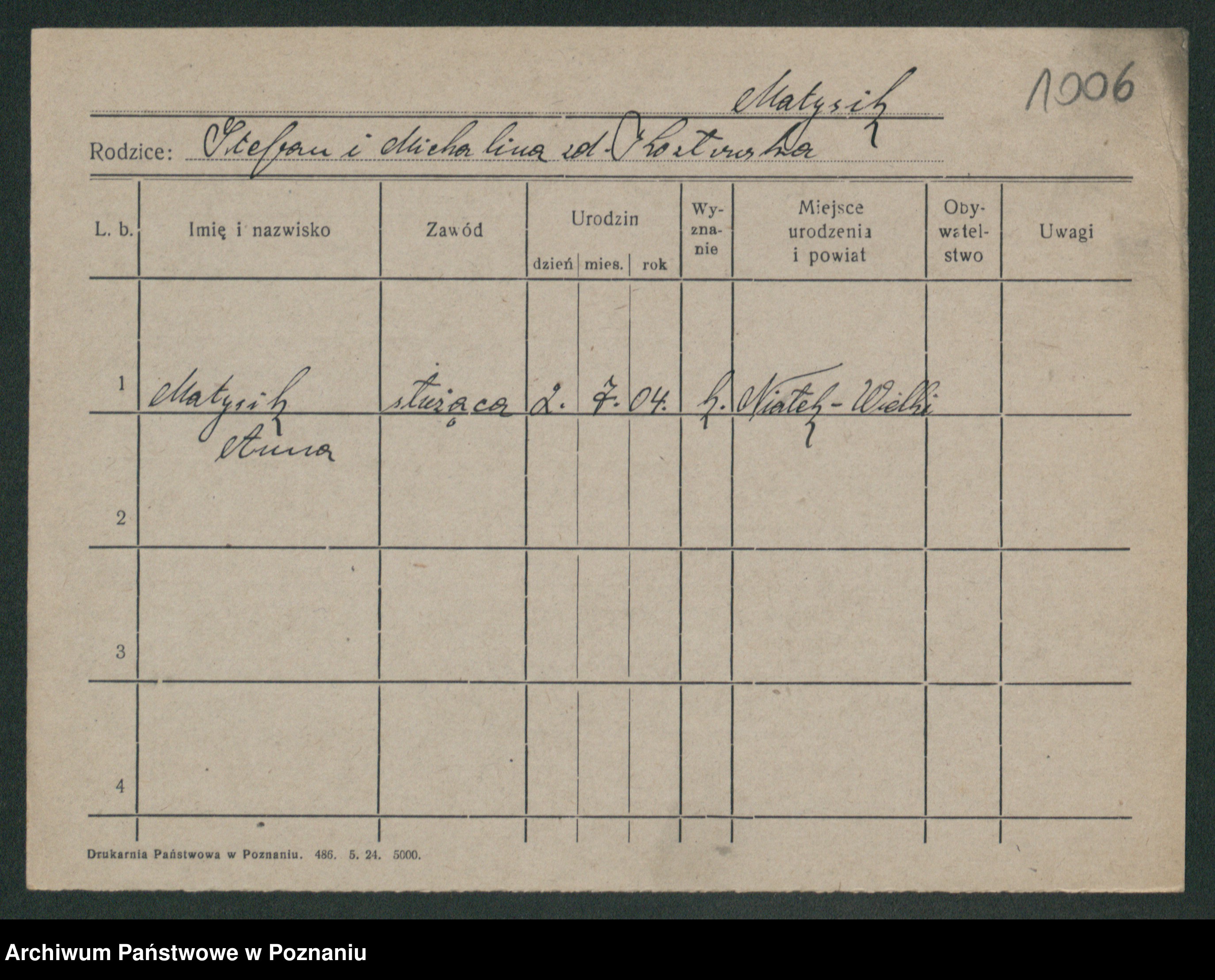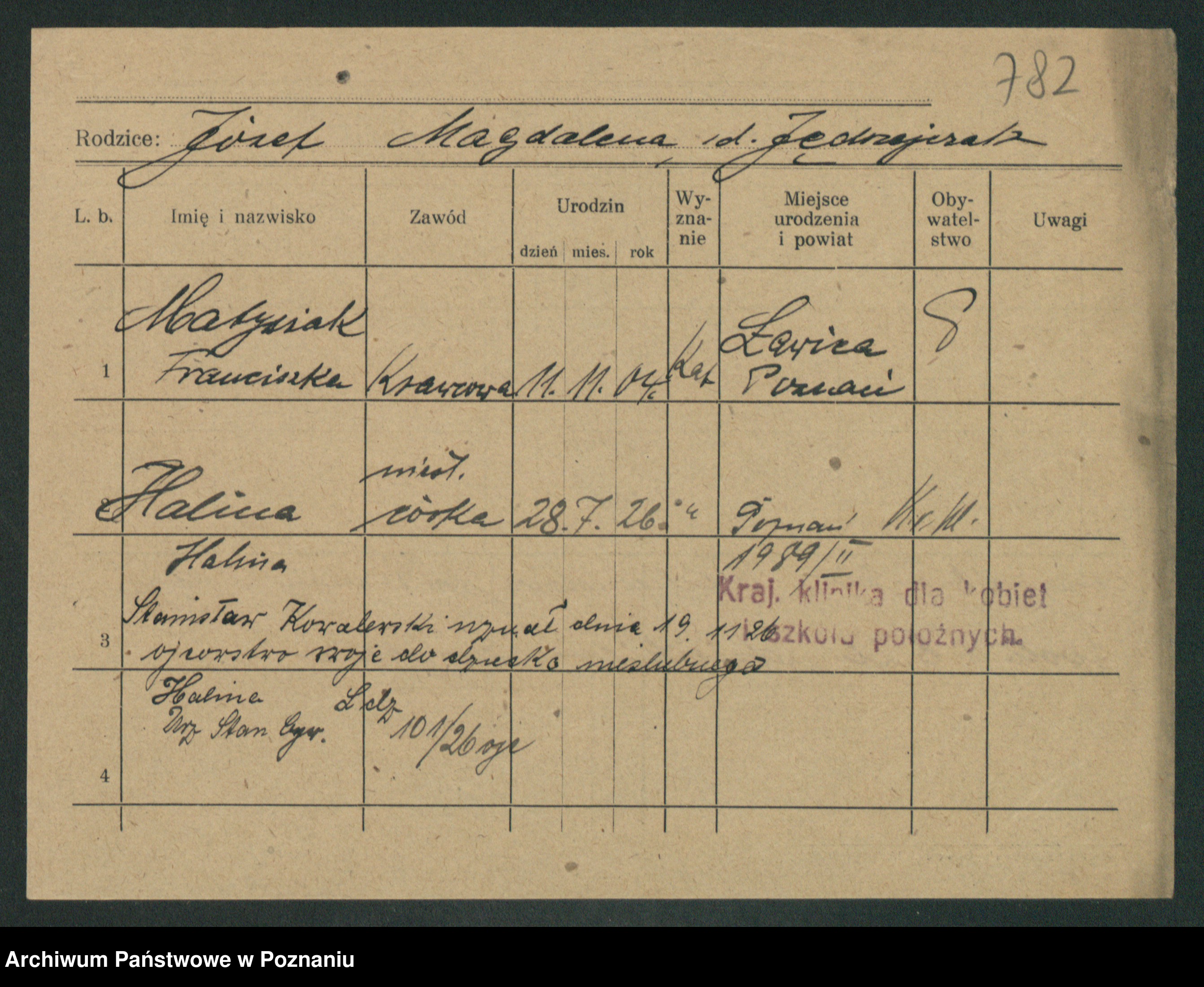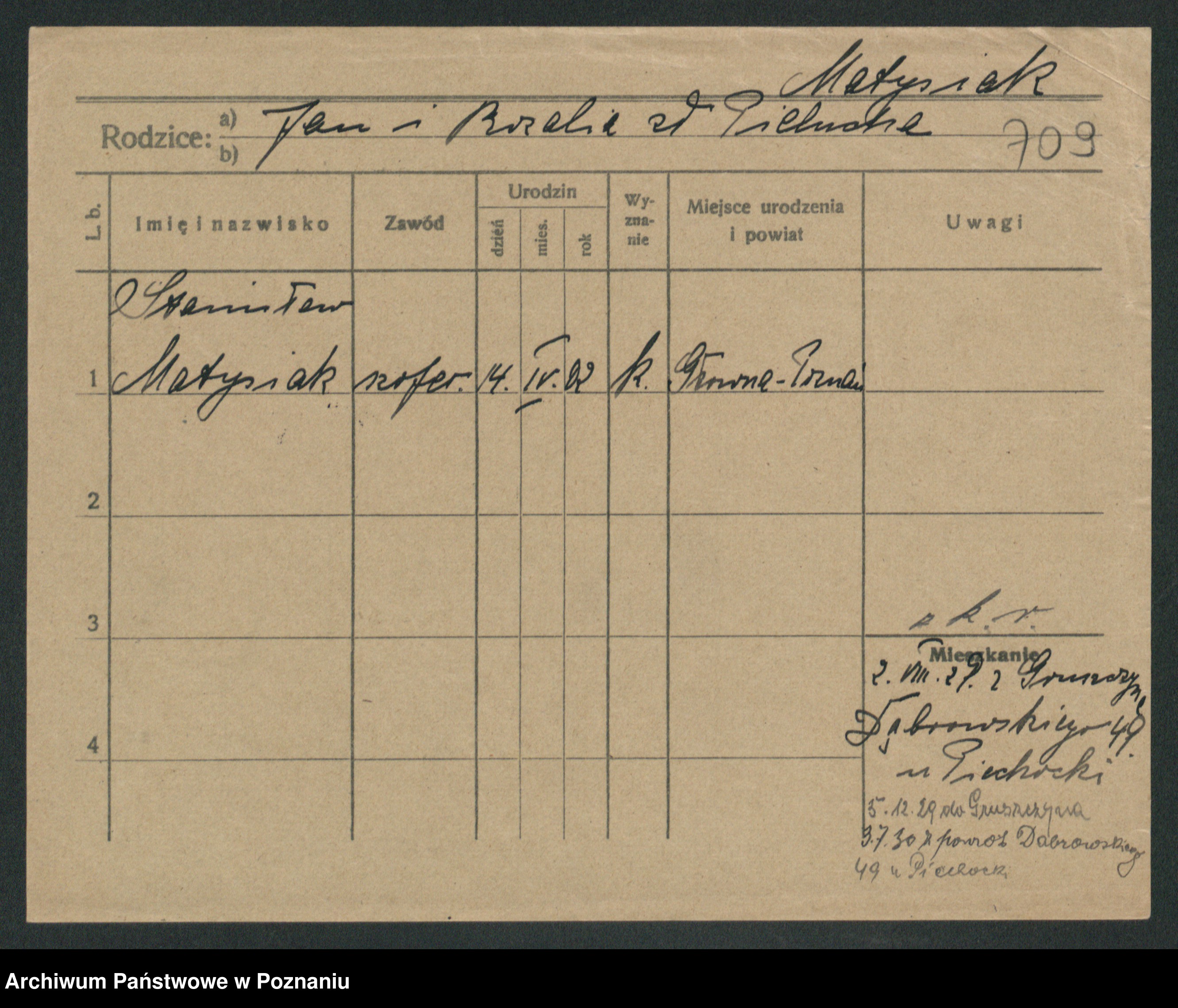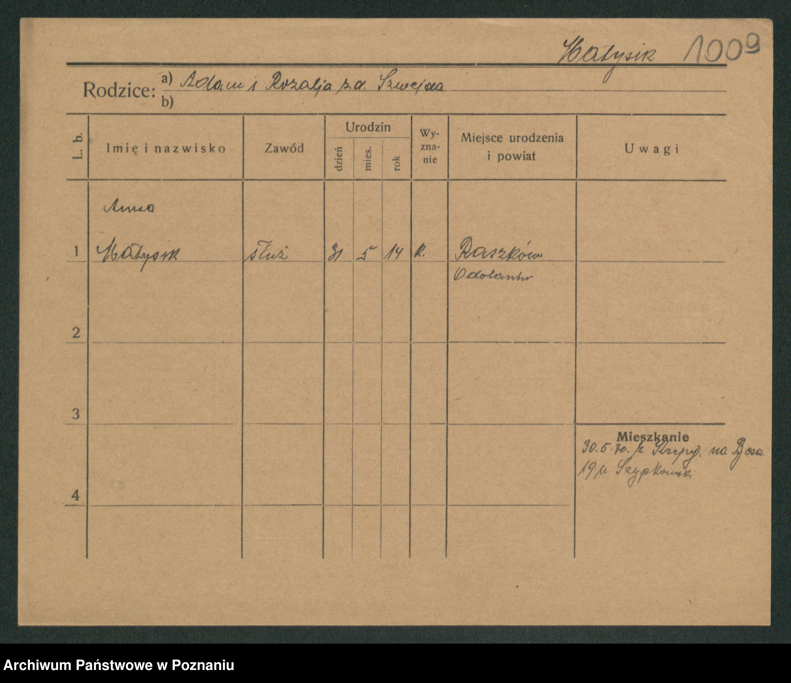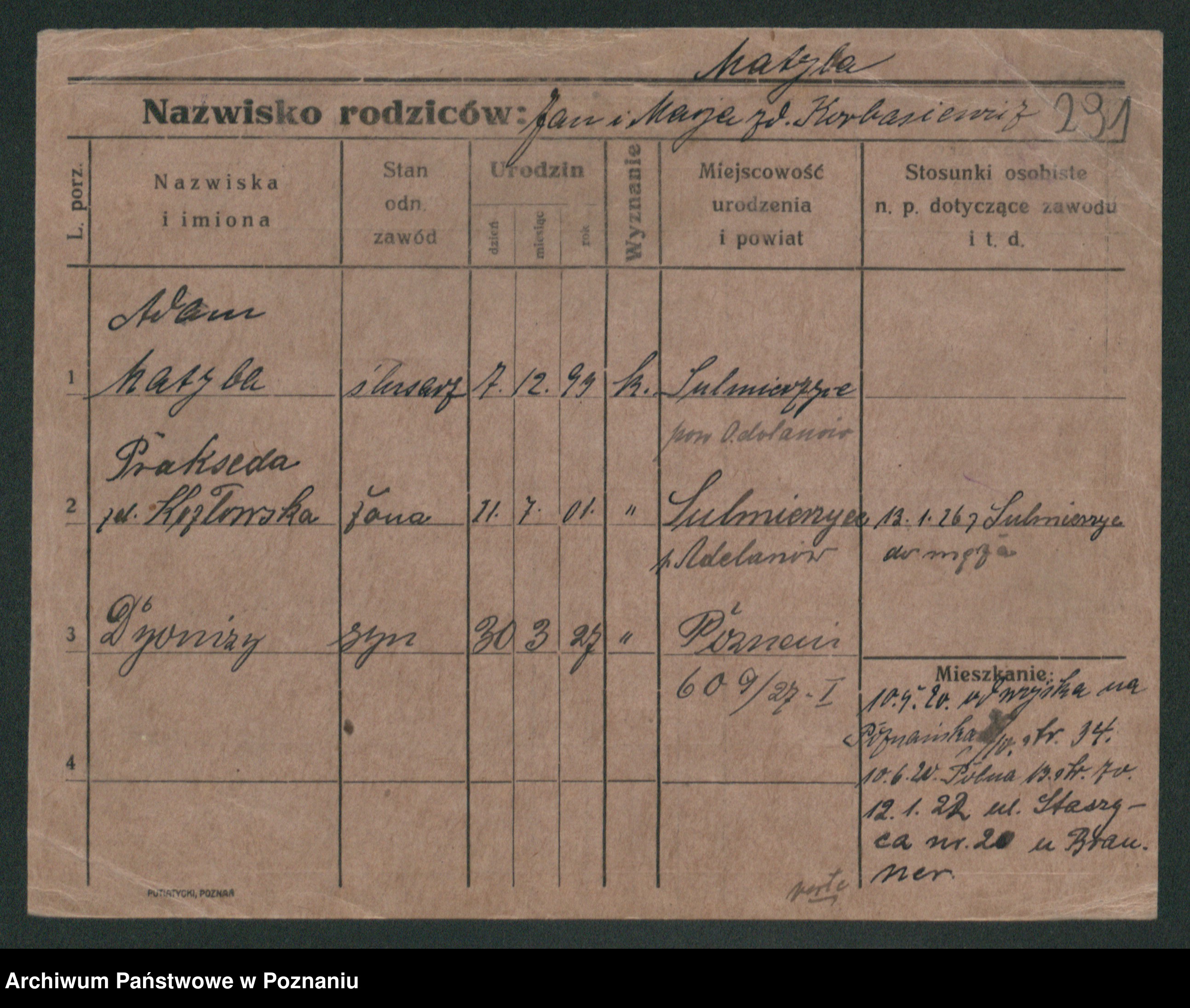 Podgląd karty osobowej dostępny jest po kliknięciu na nazwisko lub ikonkę karty. Można dokonywać powiększenia (ikony na górze) lub przechodzić między kolejnymi skanami (strzałki po bokach).