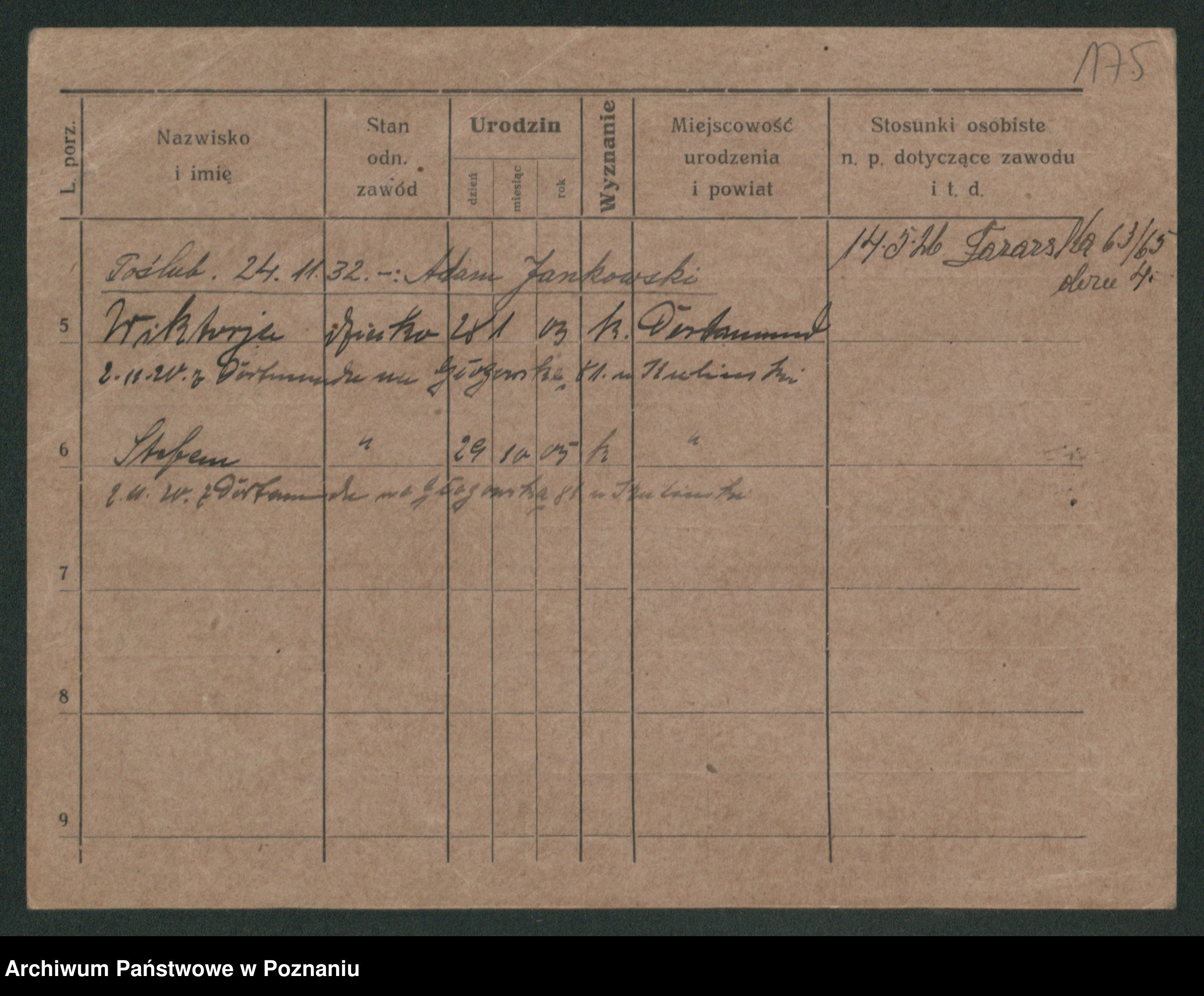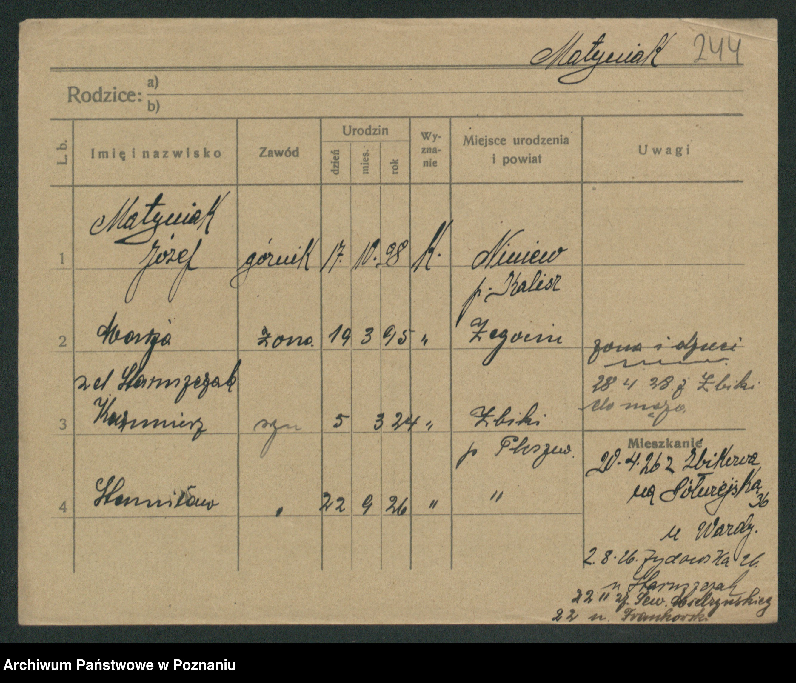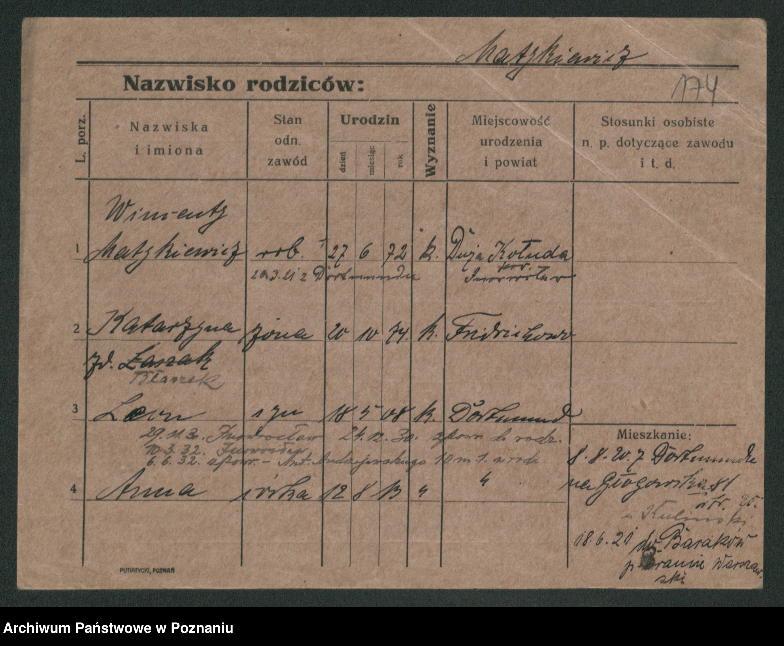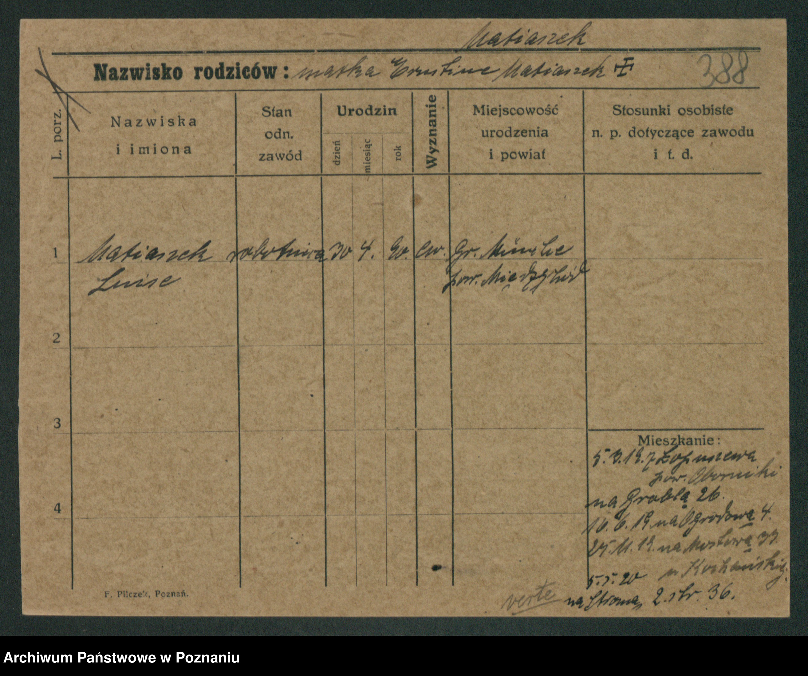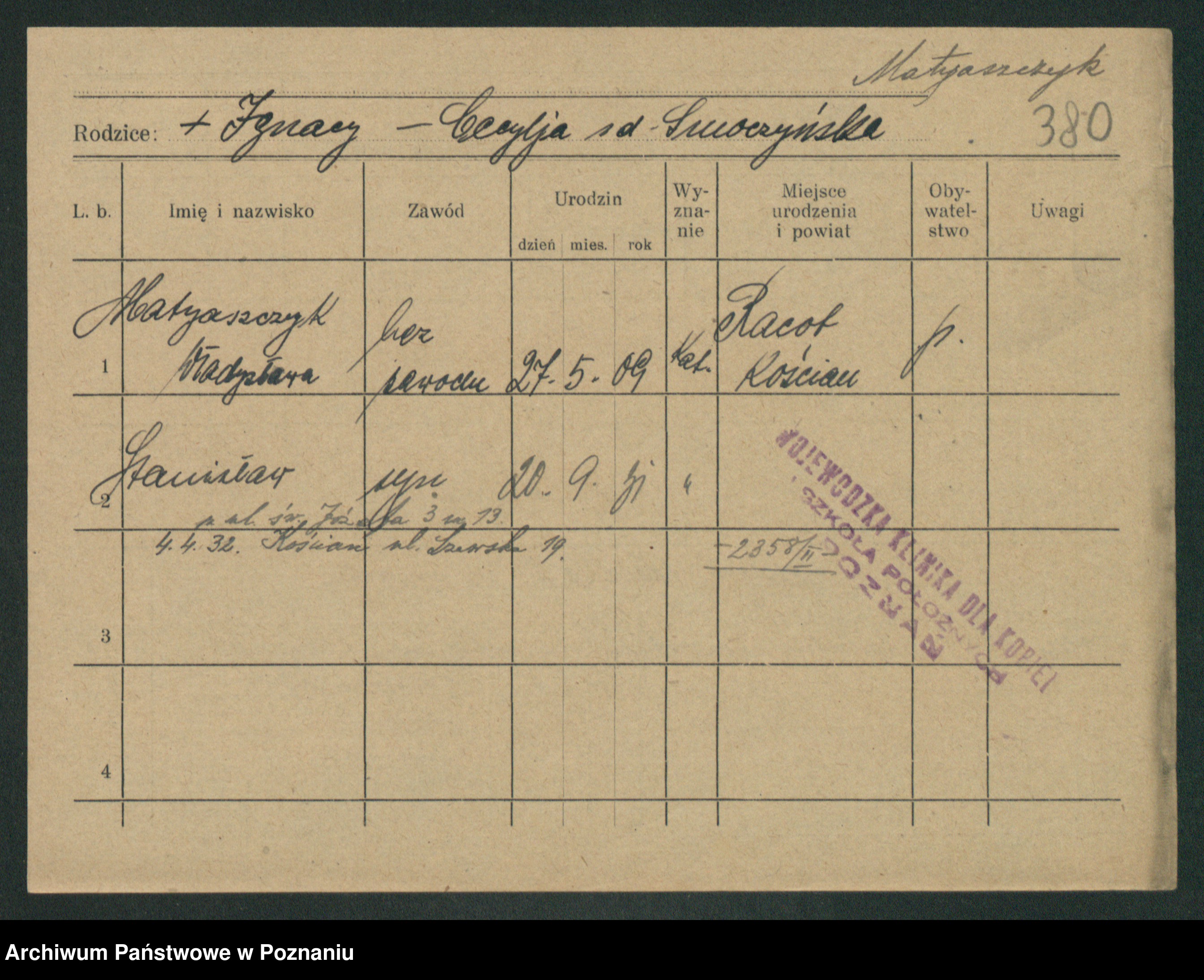 Podgląd karty osobowej dostępny jest po kliknięciu na nazwisko lub ikonkę karty. Można dokonywać powiększenia (ikony na górze) lub przechodzić między kolejnymi skanami (strzałki po bokach).