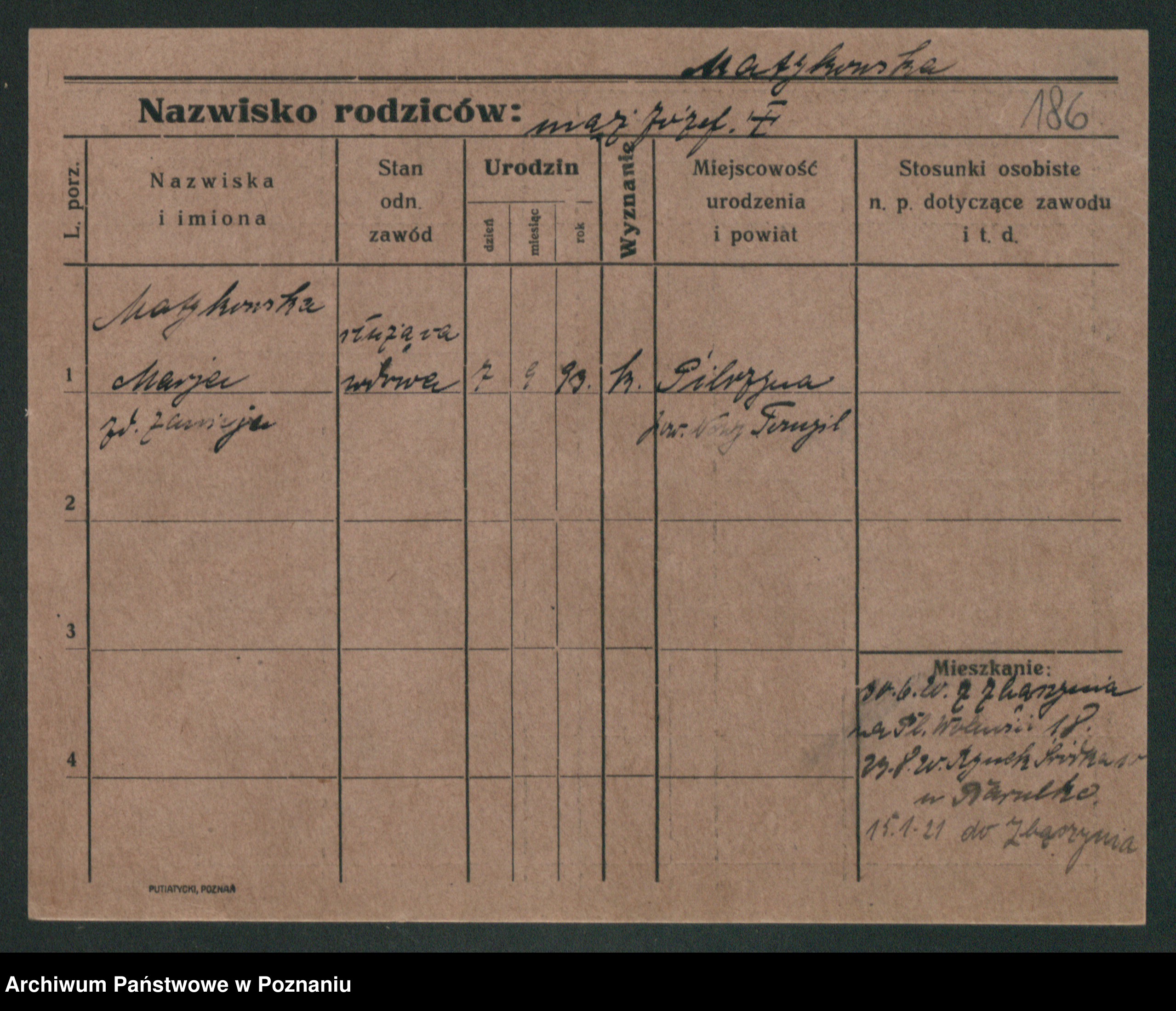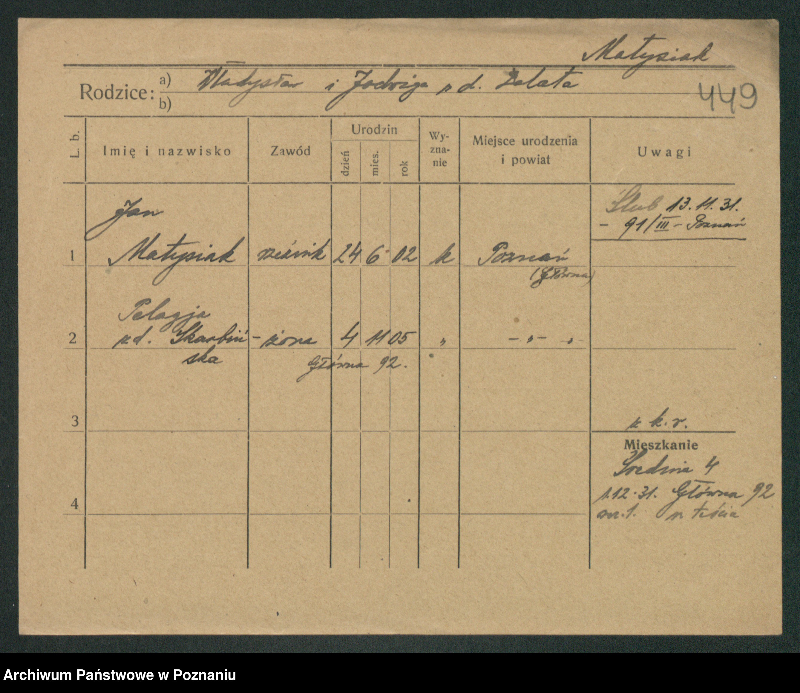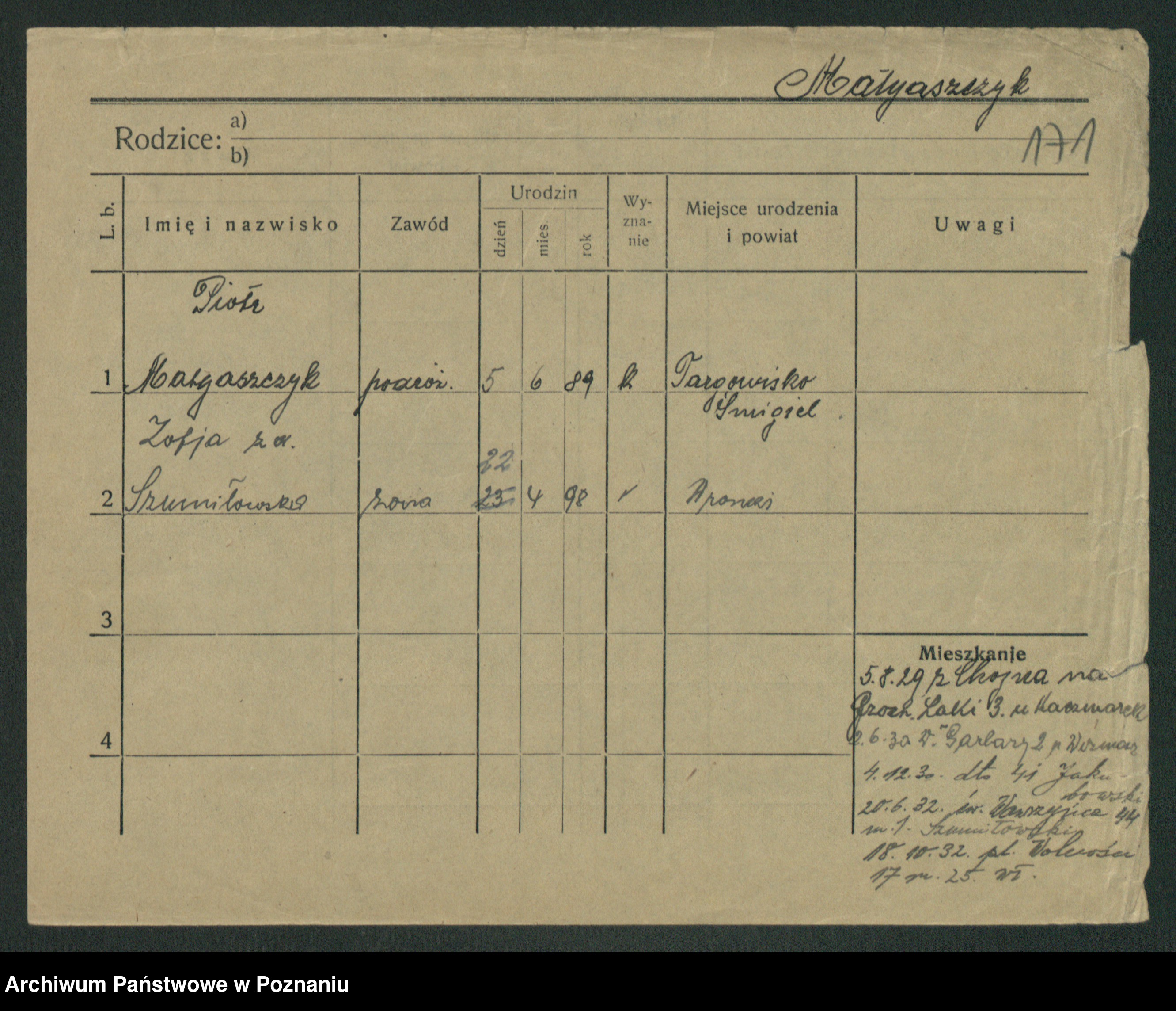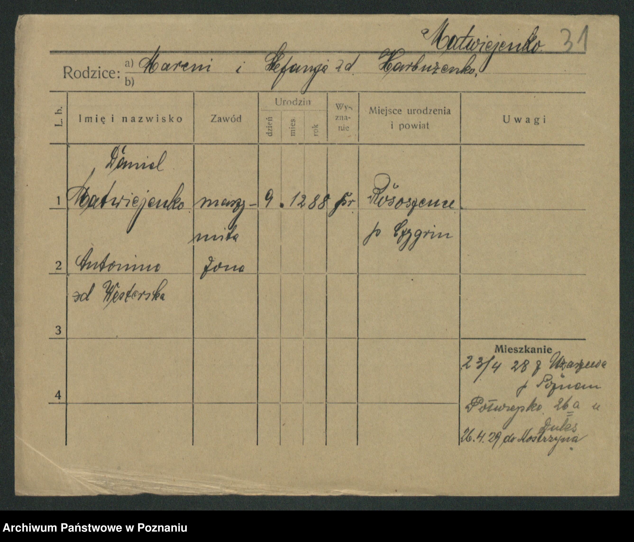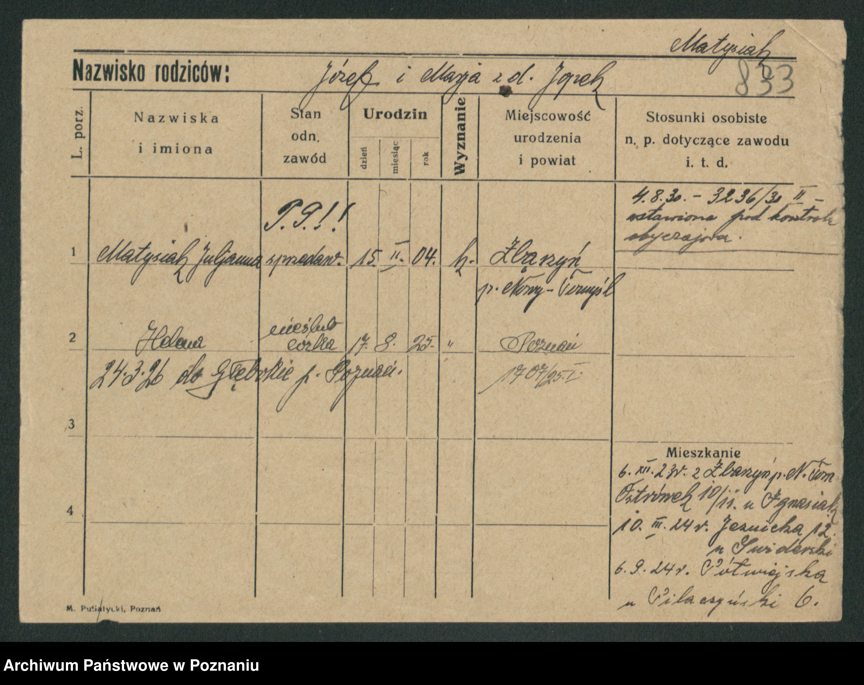 Podgląd karty osobowej dostępny jest po kliknięciu na nazwisko lub ikonkę karty. Można dokonywać powiększenia (ikony na górze) lub przechodzić między kolejnymi skanami (strzałki po bokach).