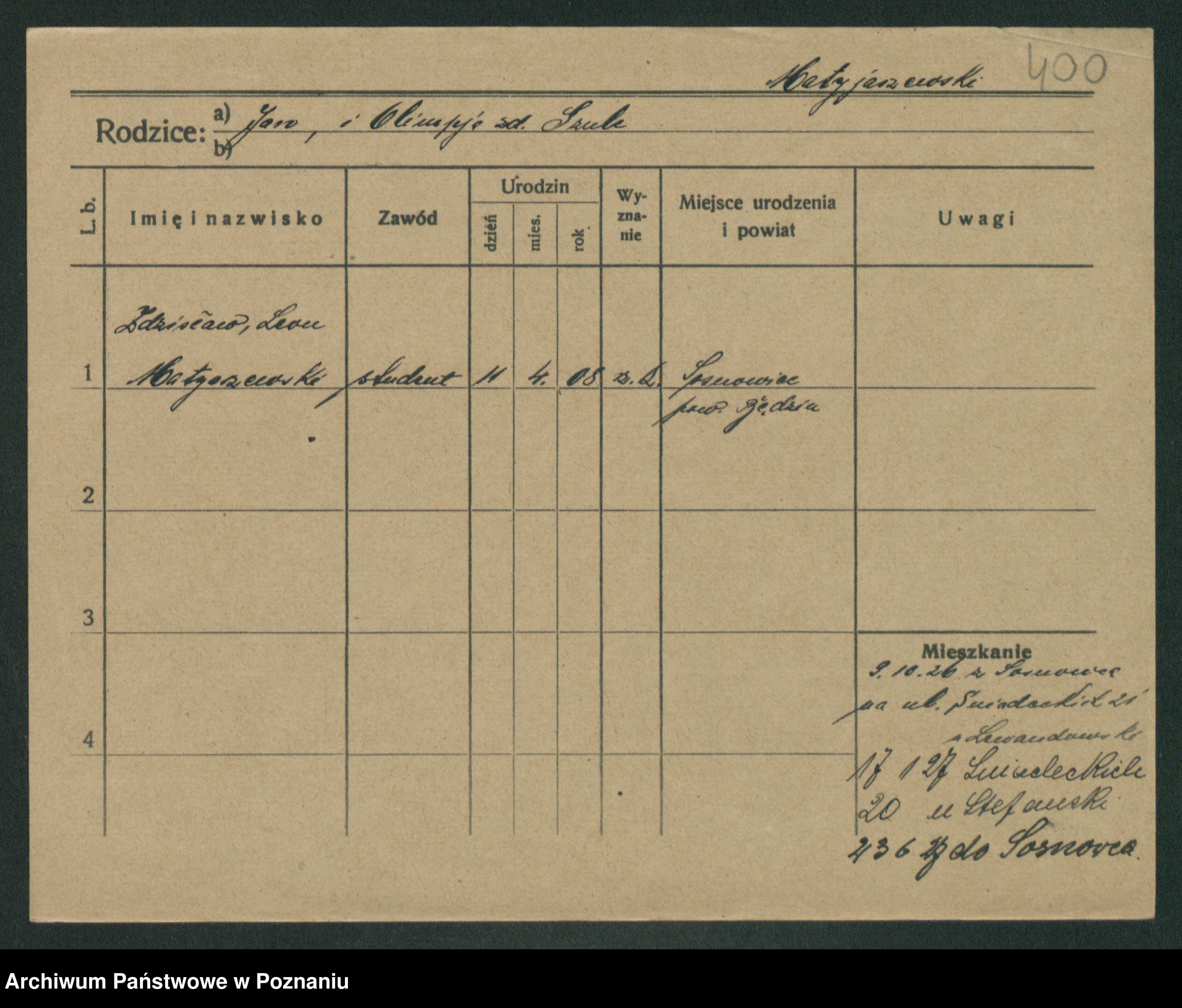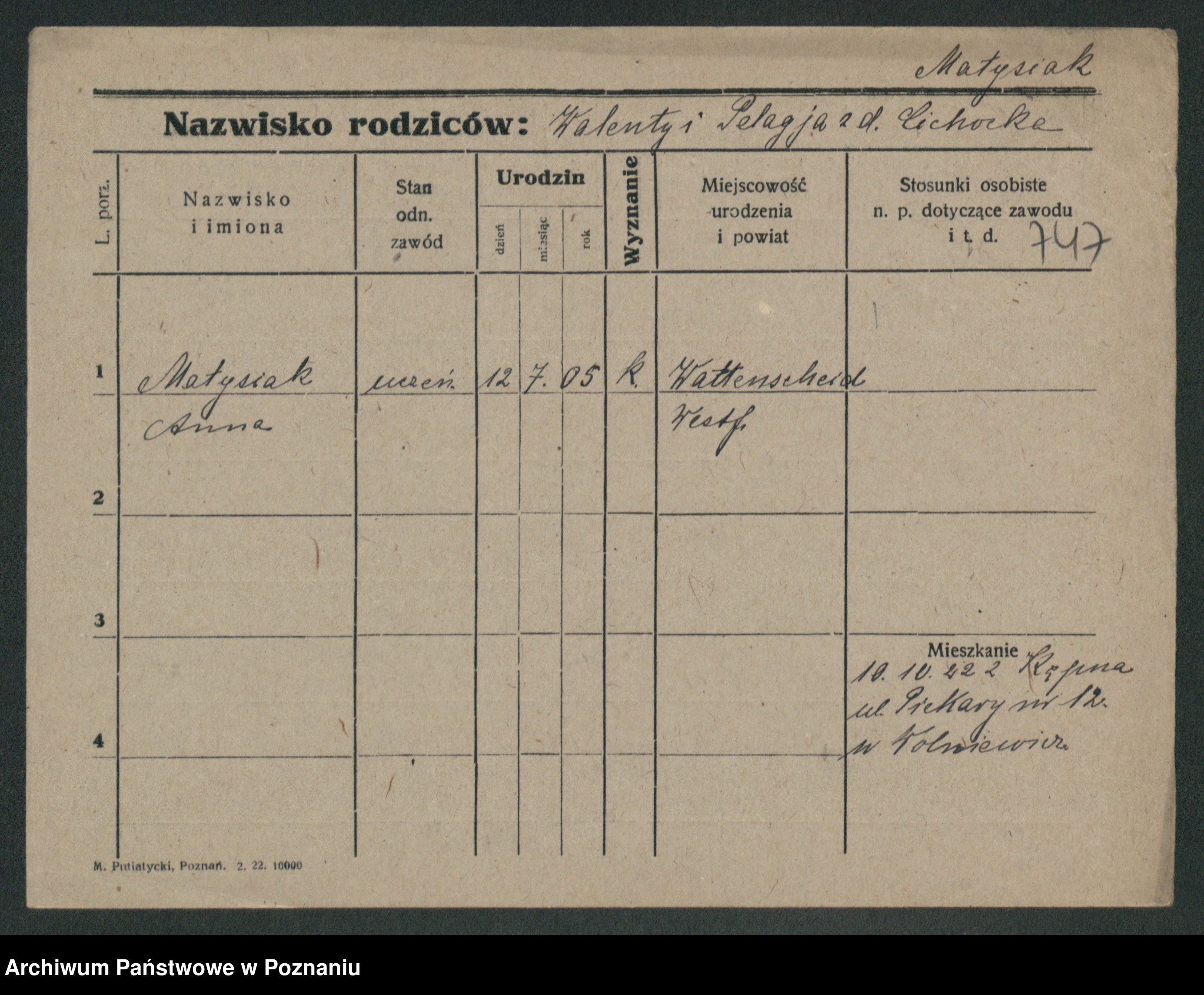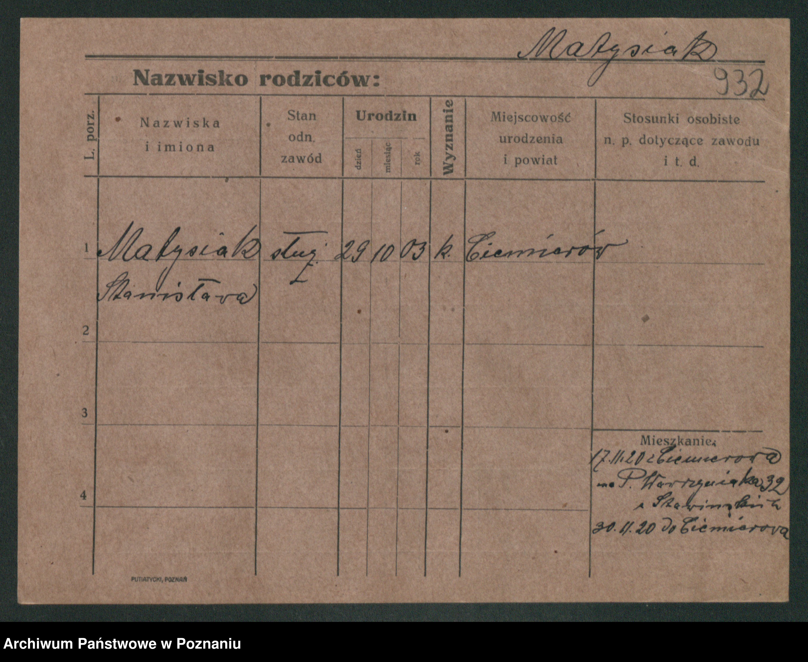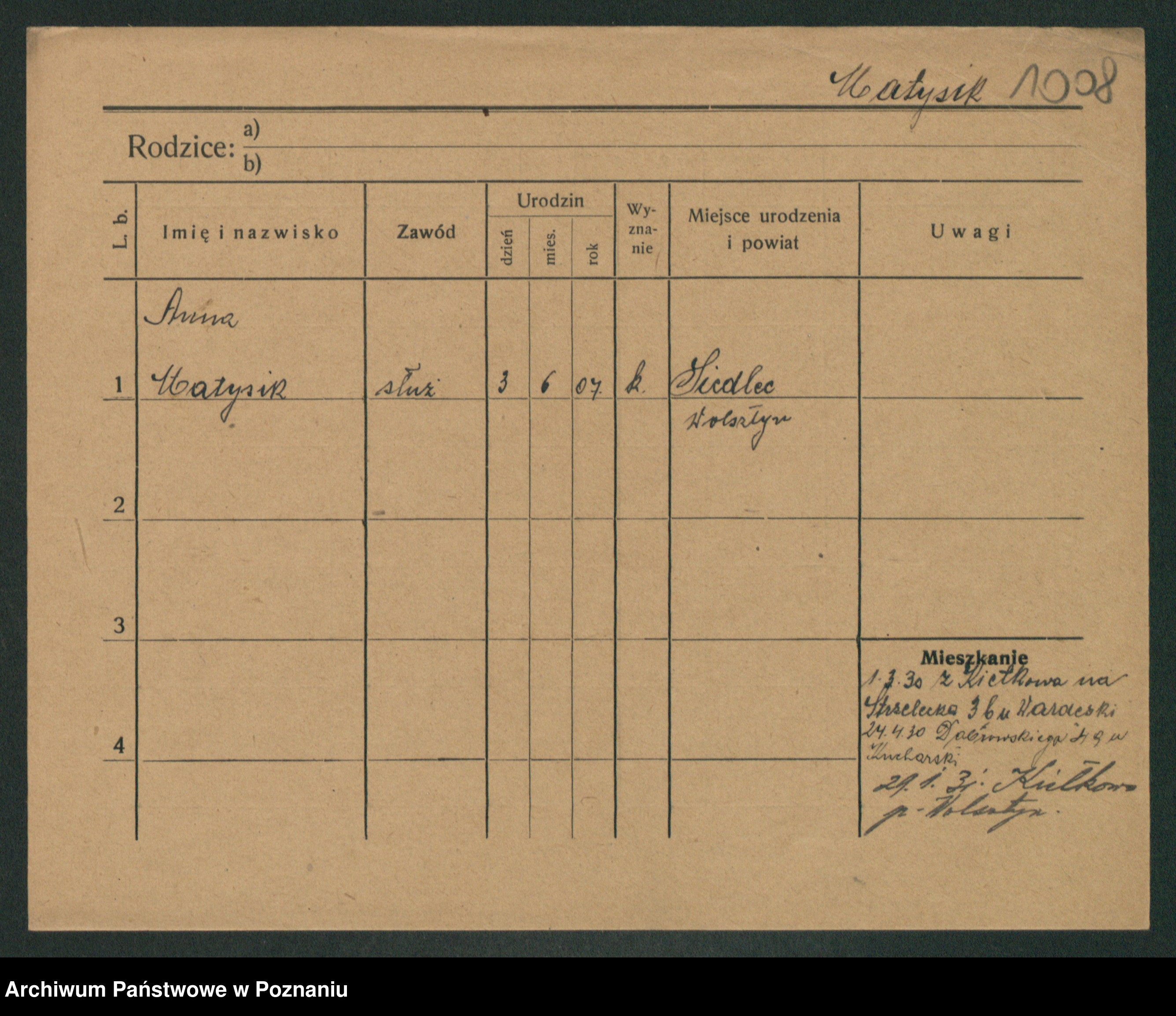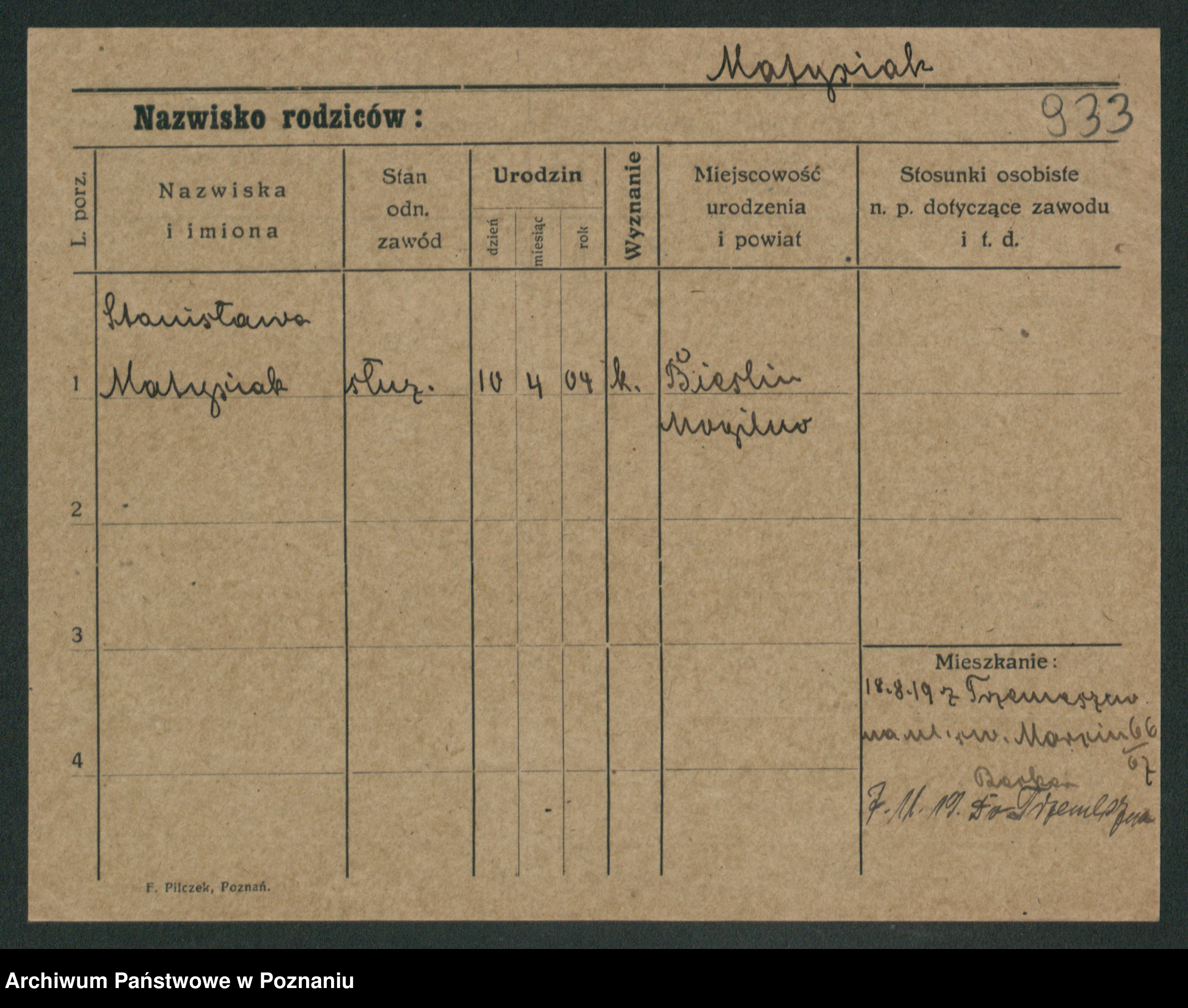 Podgląd karty osobowej dostępny jest po kliknięciu na nazwisko lub ikonkę karty. Można dokonywać powiększenia (ikony na górze) lub przechodzić między kolejnymi skanami (strzałki po bokach).