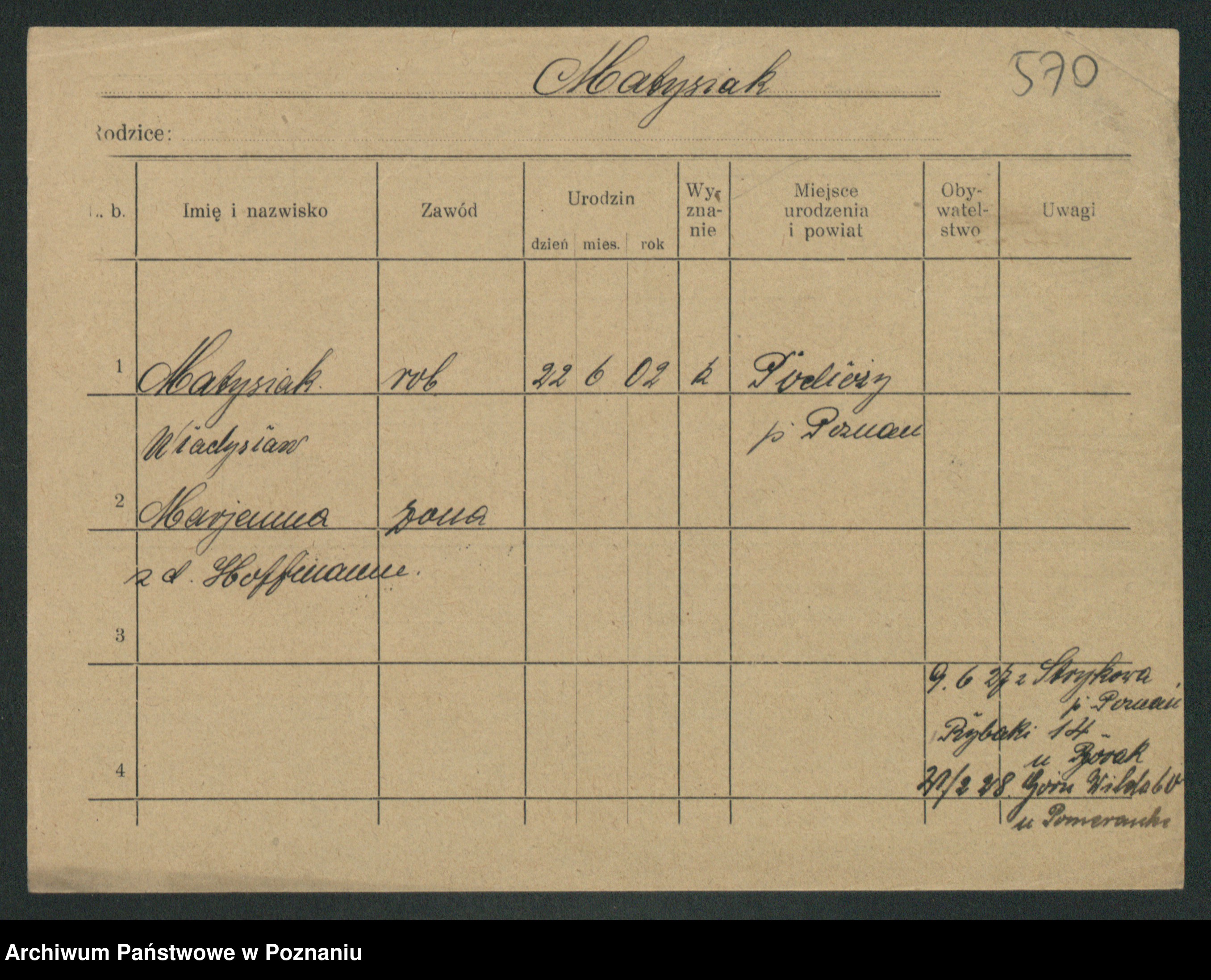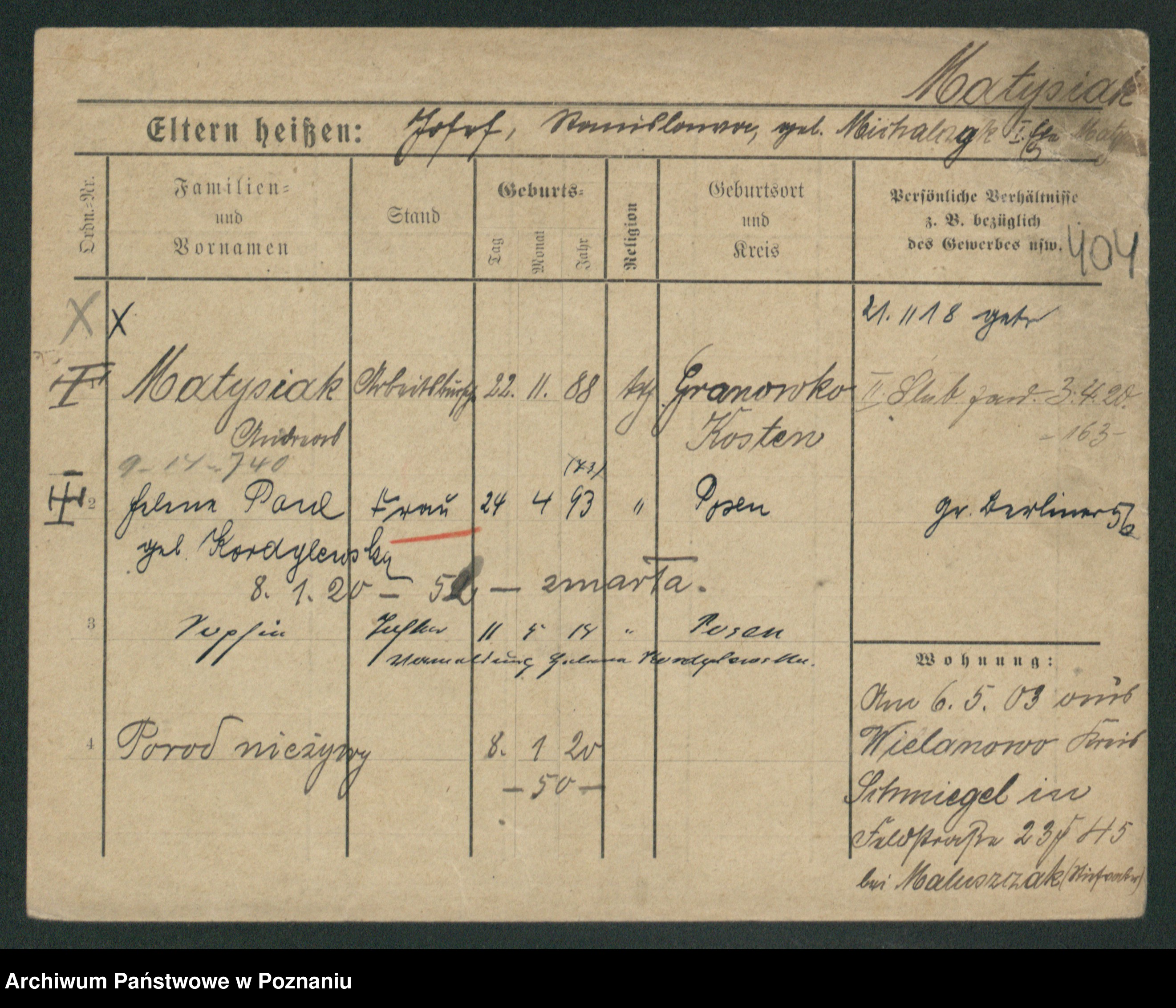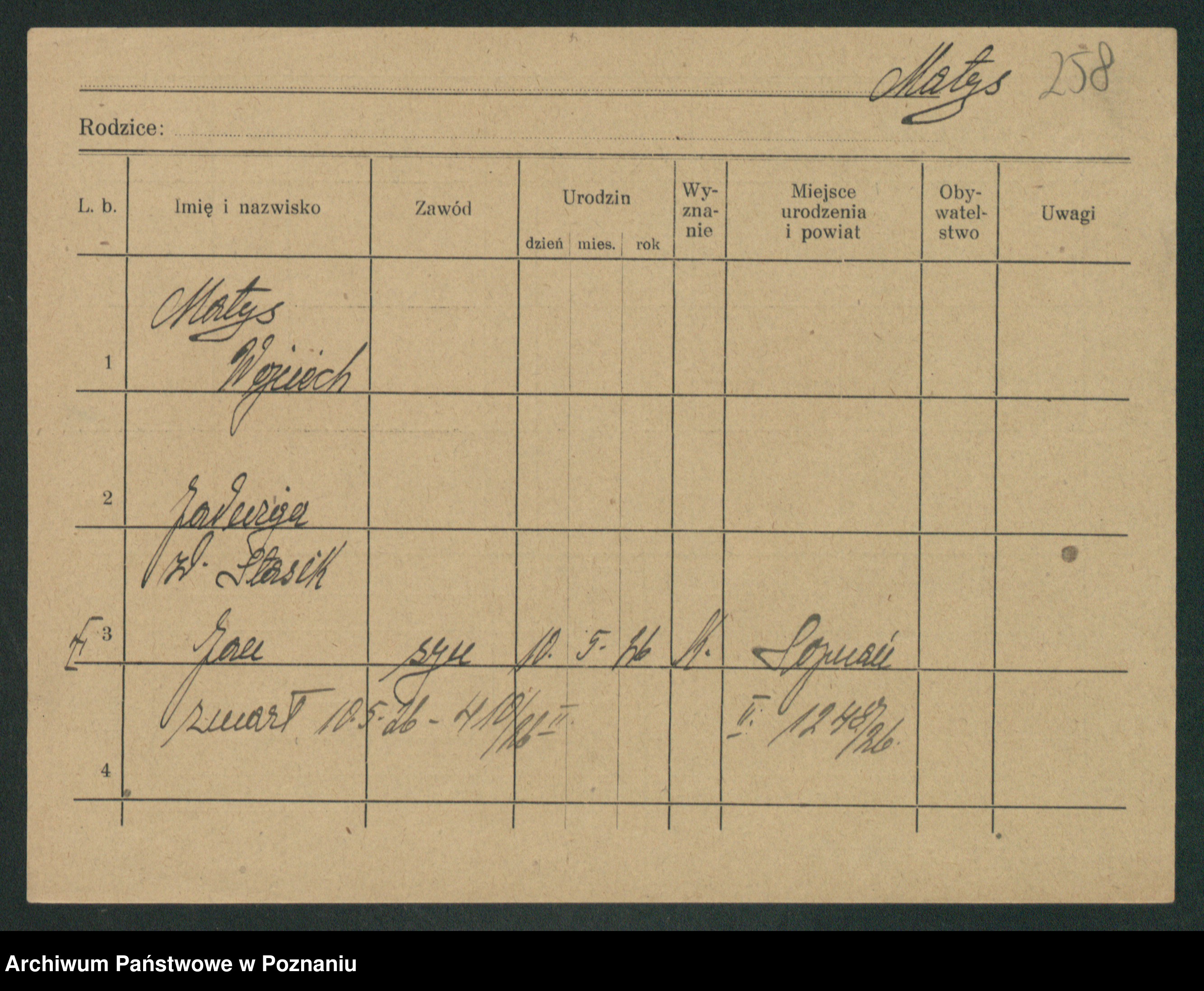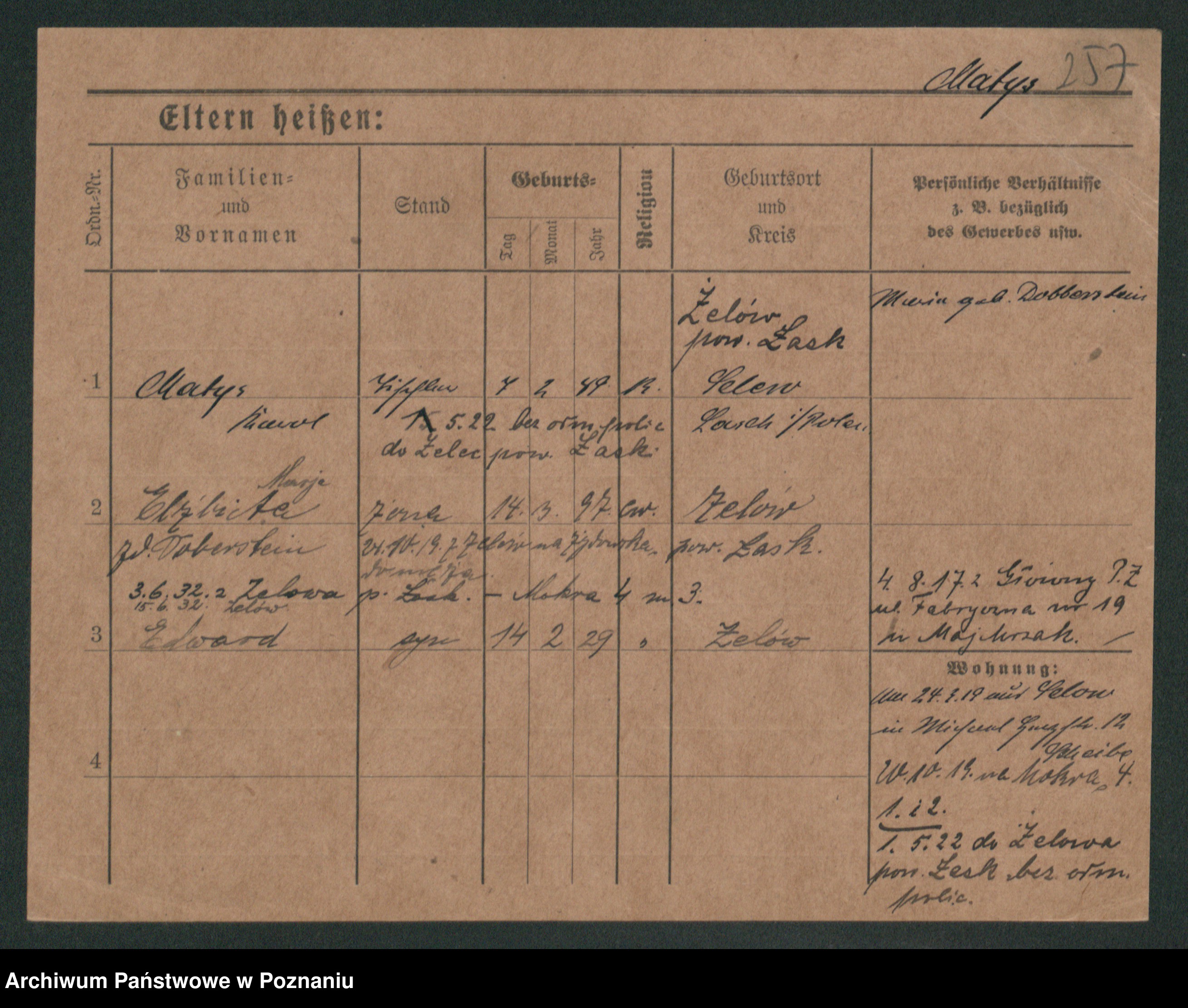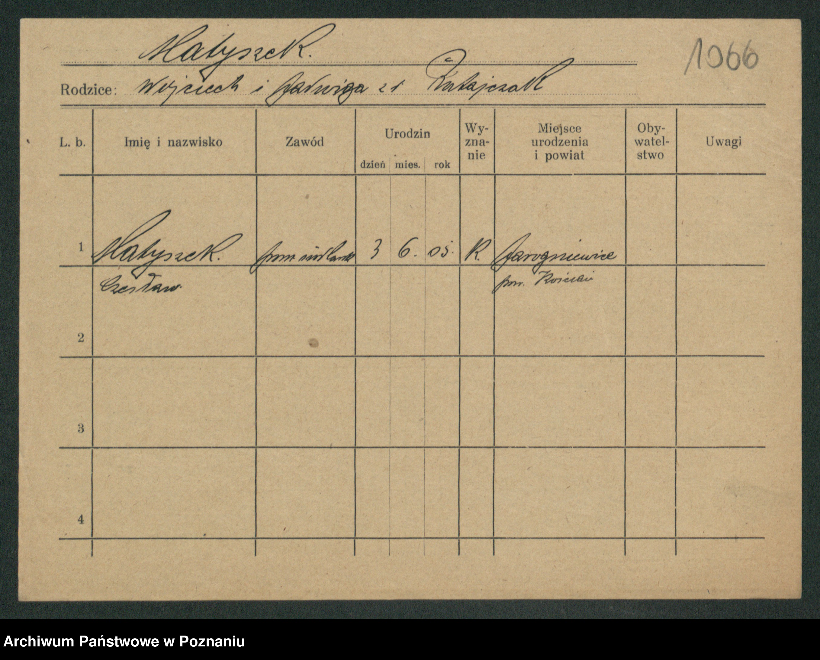 Podgląd karty osobowej dostępny jest po kliknięciu na nazwisko lub ikonkę karty. Można dokonywać powiększenia (ikony na górze) lub przechodzić między kolejnymi skanami (strzałki po bokach).