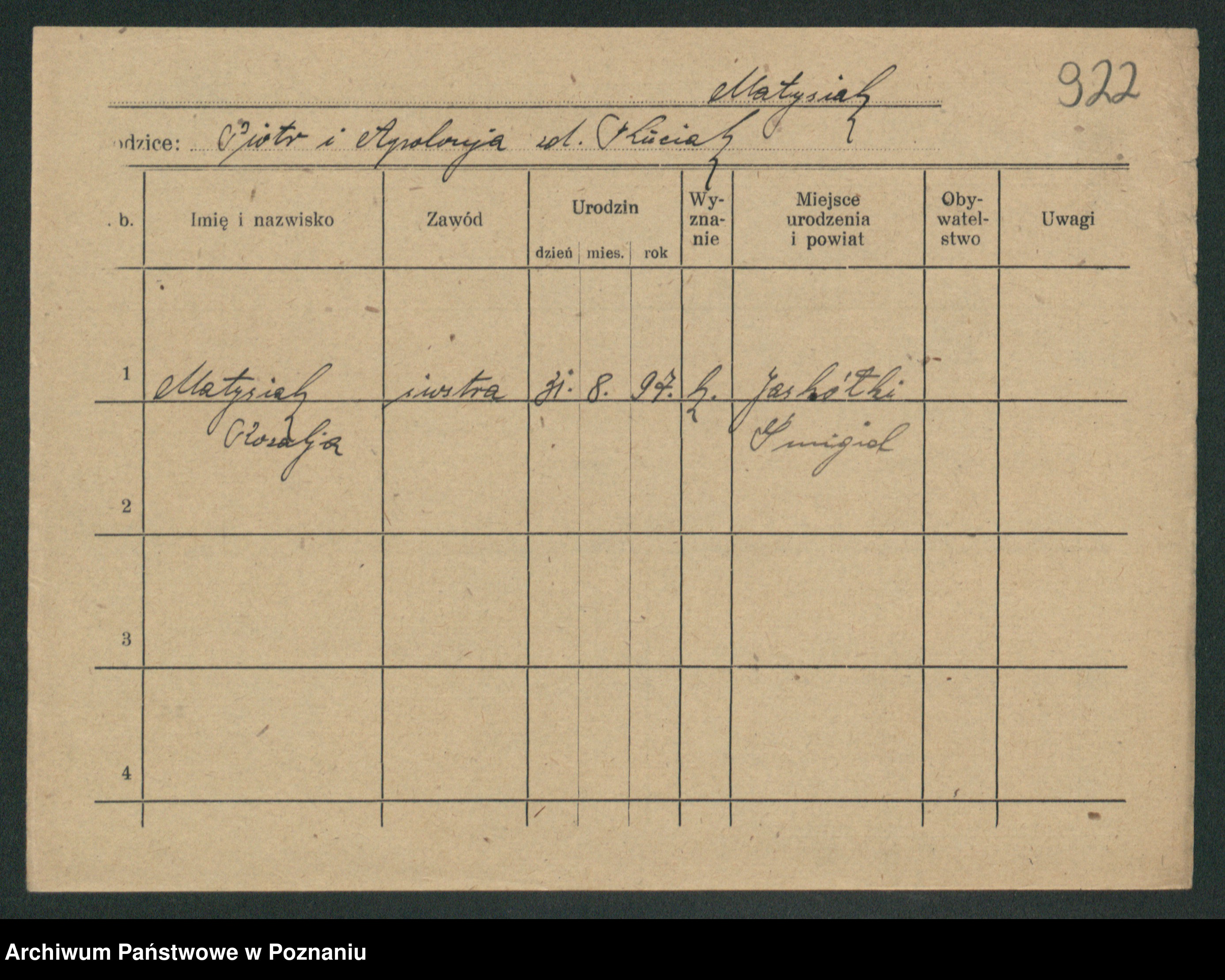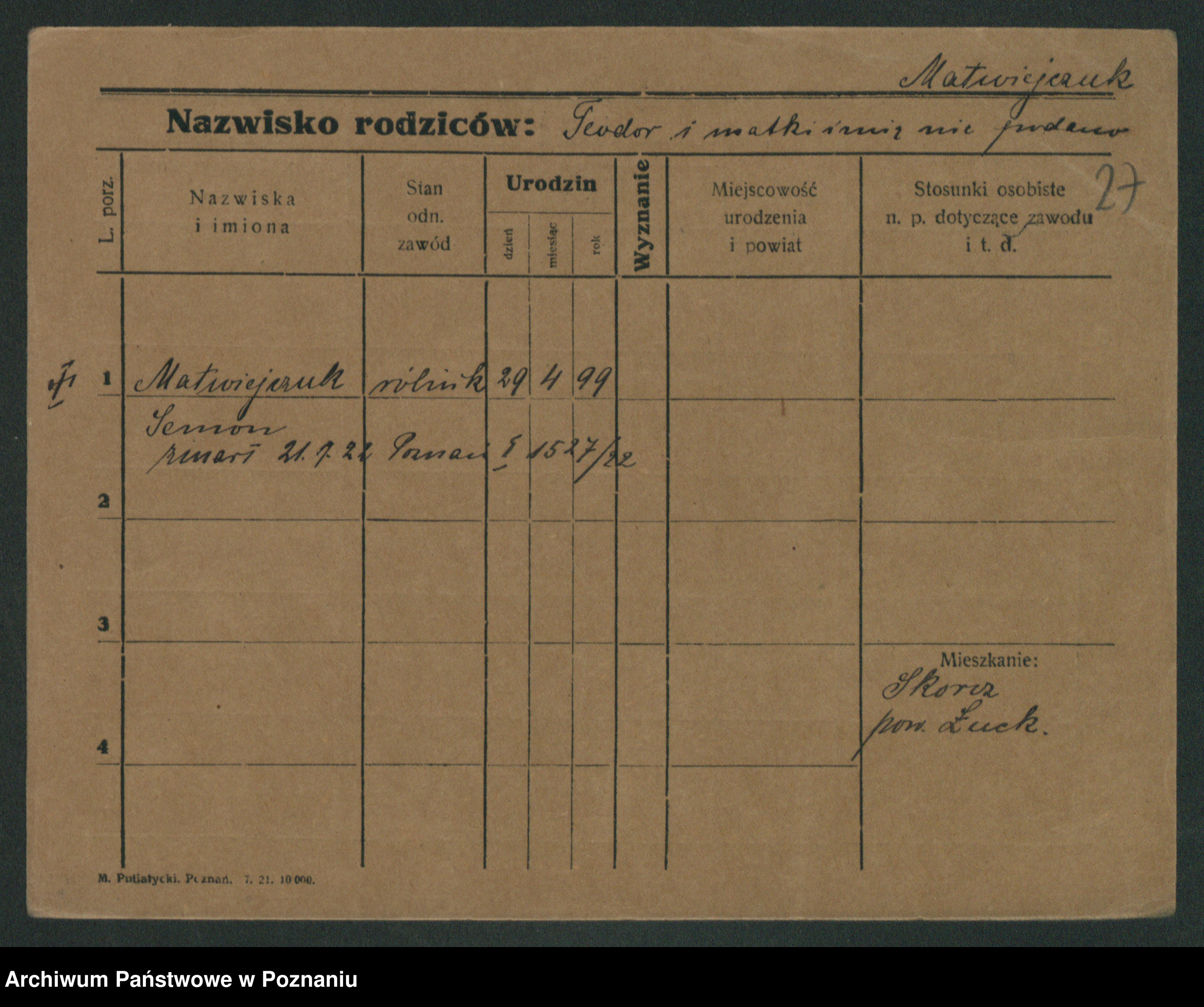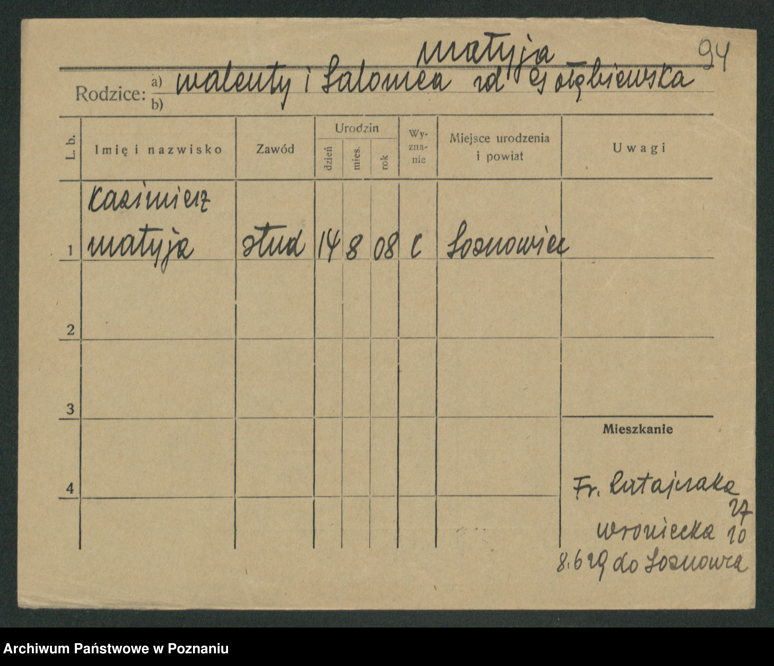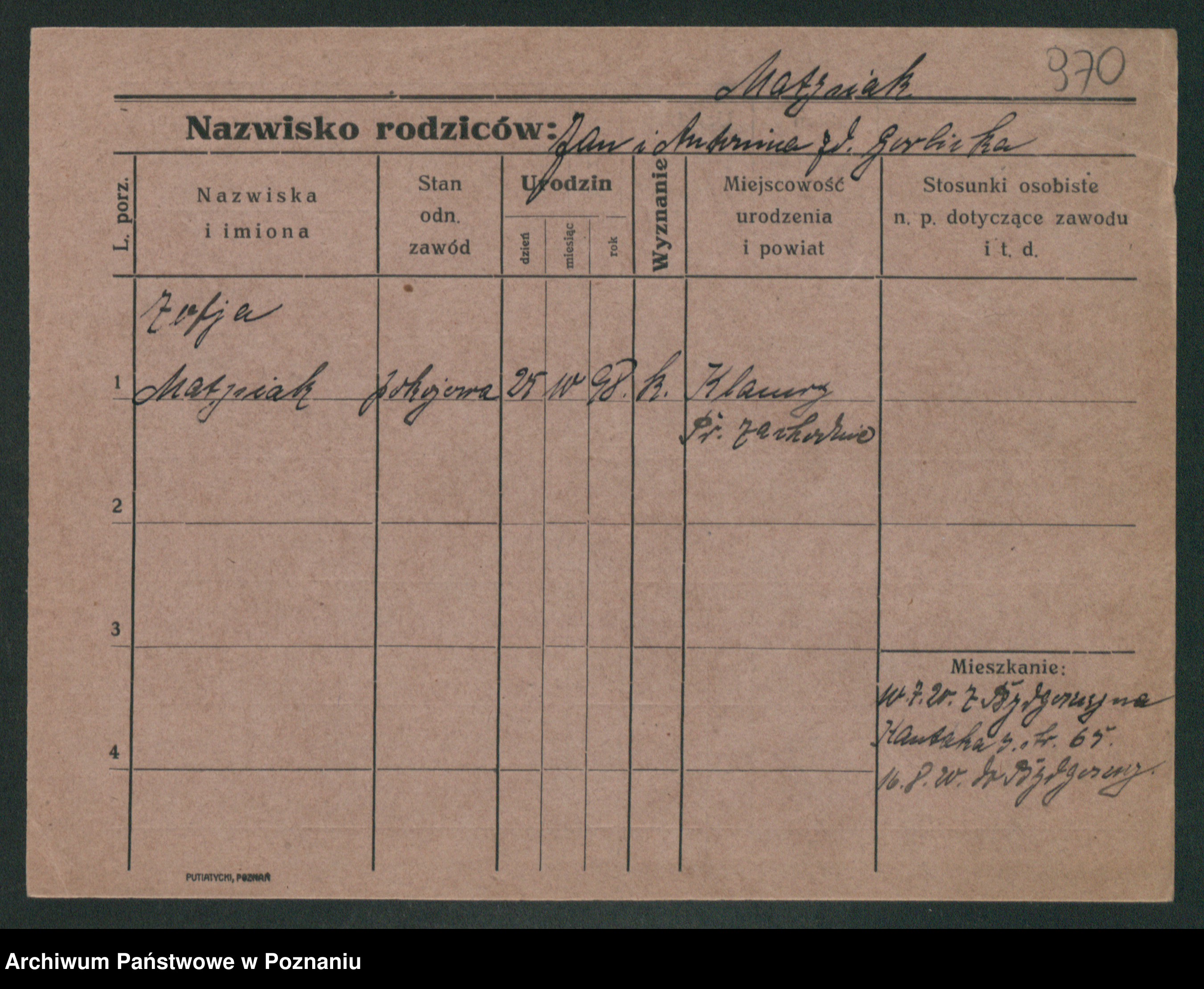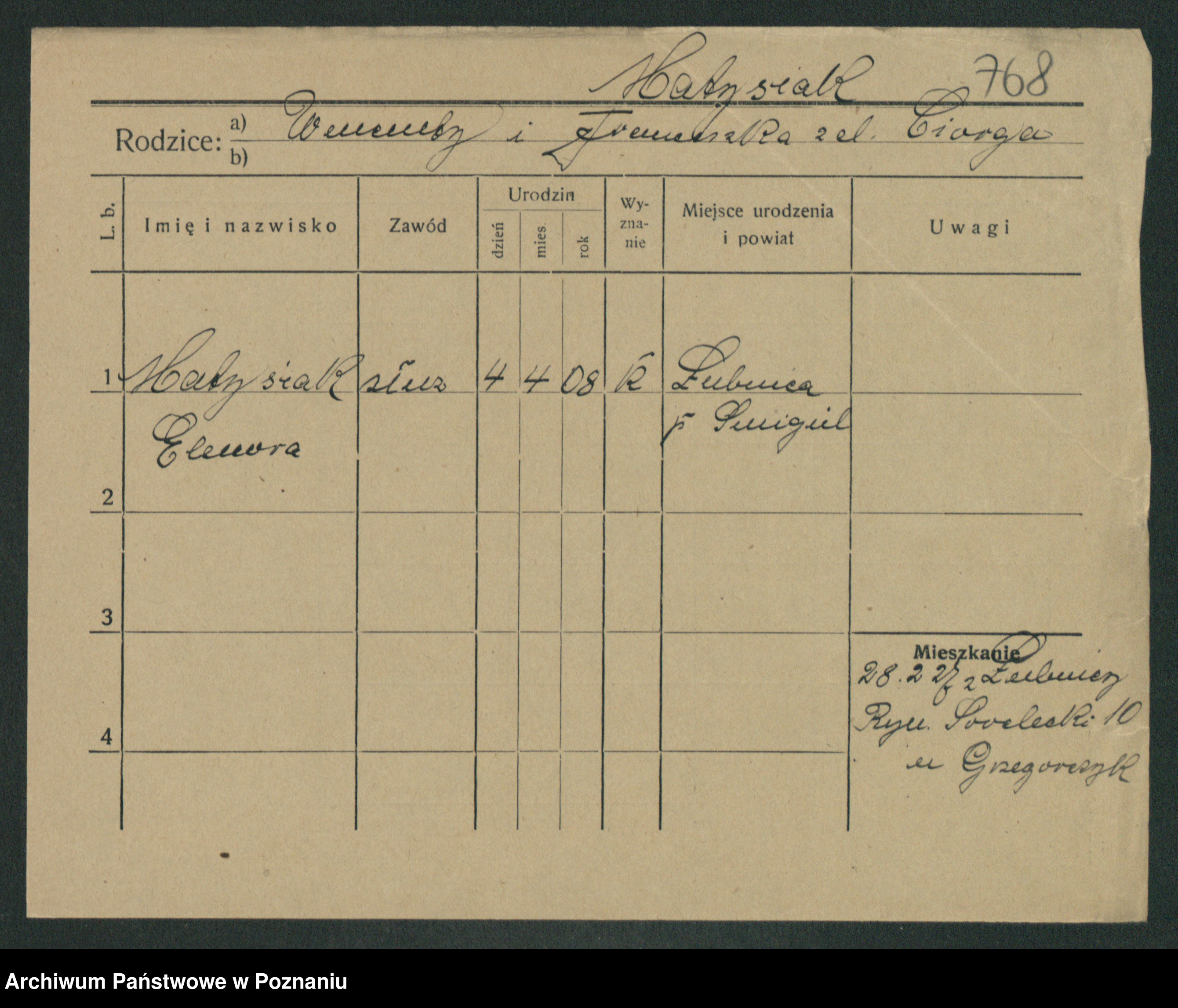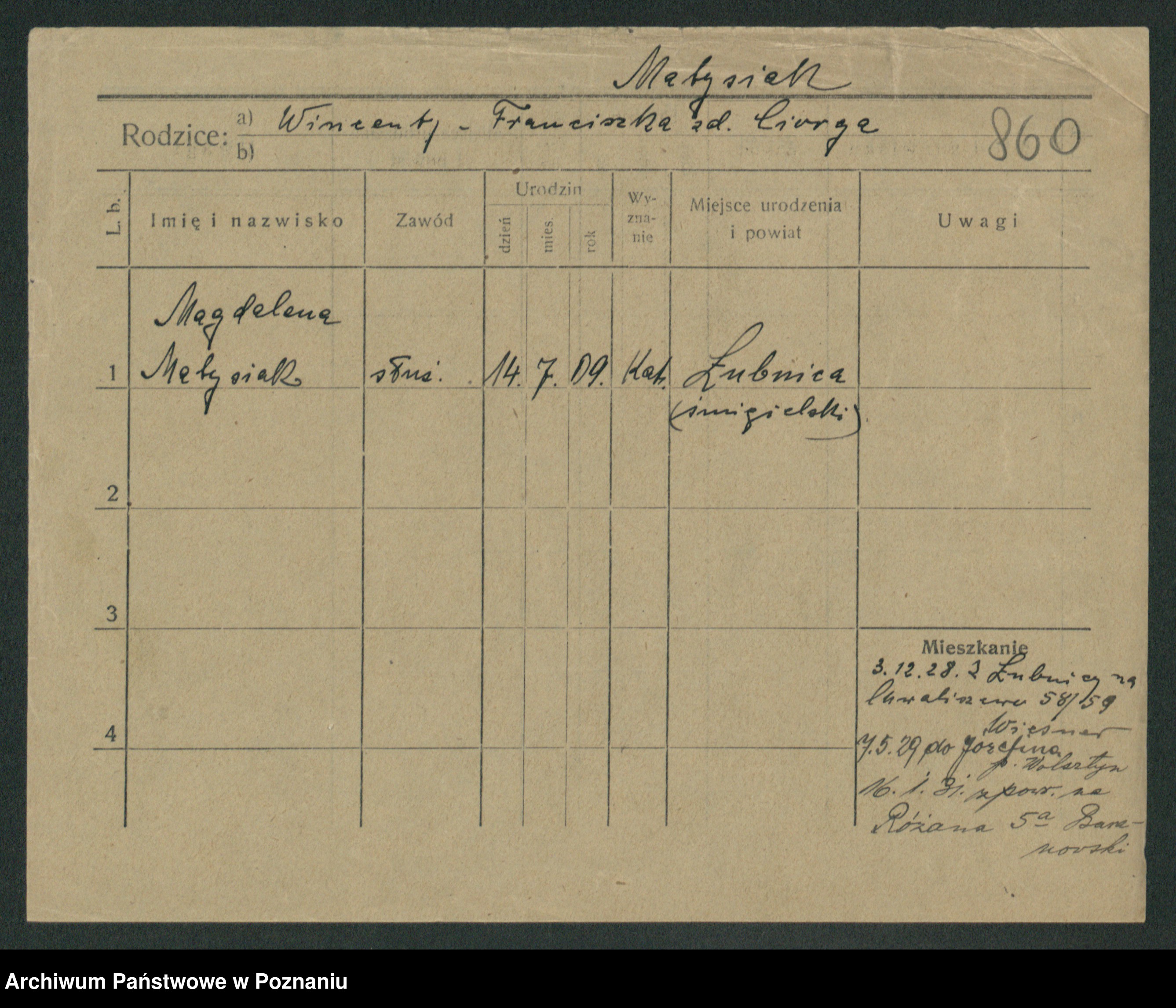 Podgląd karty osobowej dostępny jest po kliknięciu na nazwisko lub ikonkę karty. Można dokonywać powiększenia (ikony na górze) lub przechodzić między kolejnymi skanami (strzałki po bokach).