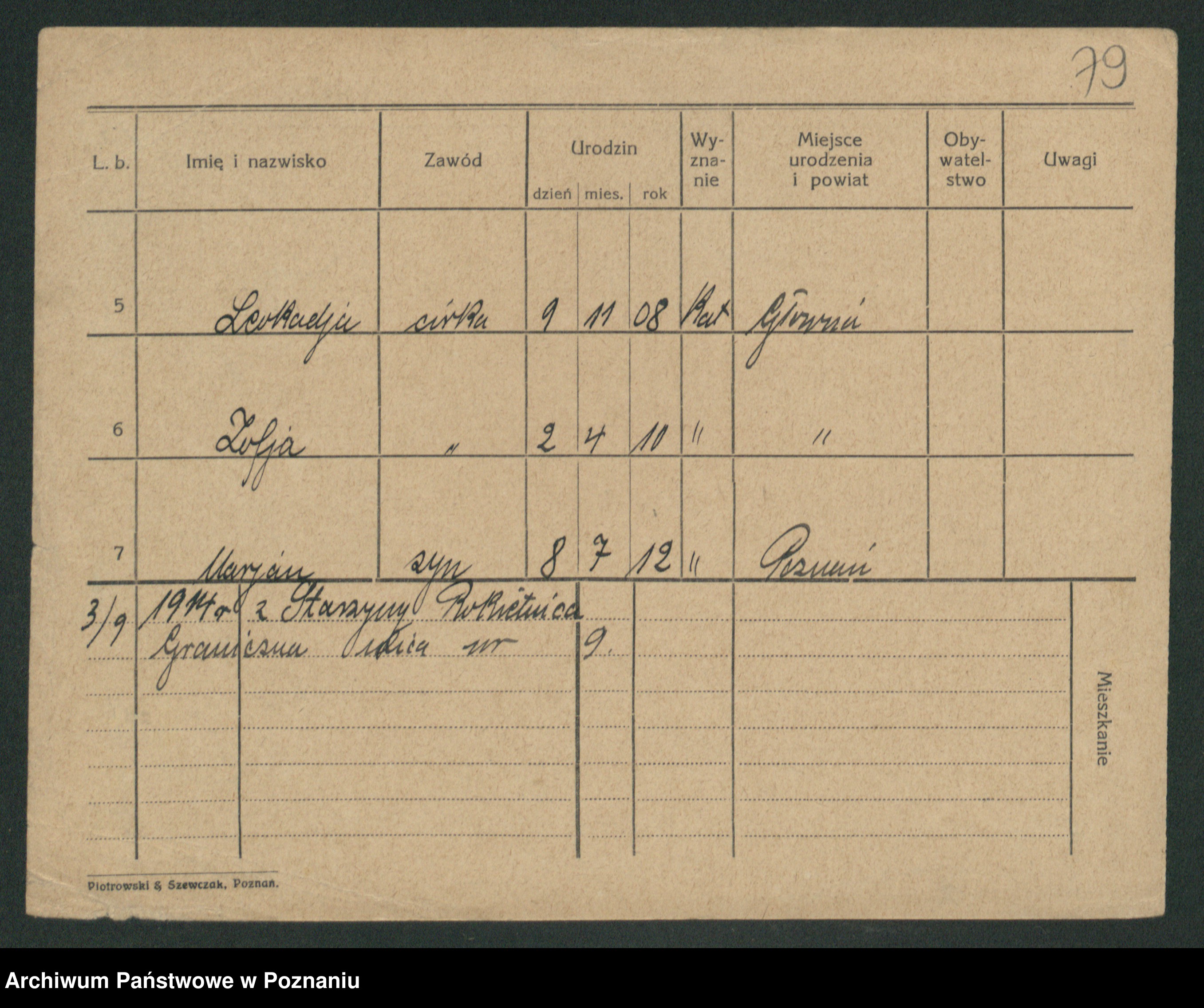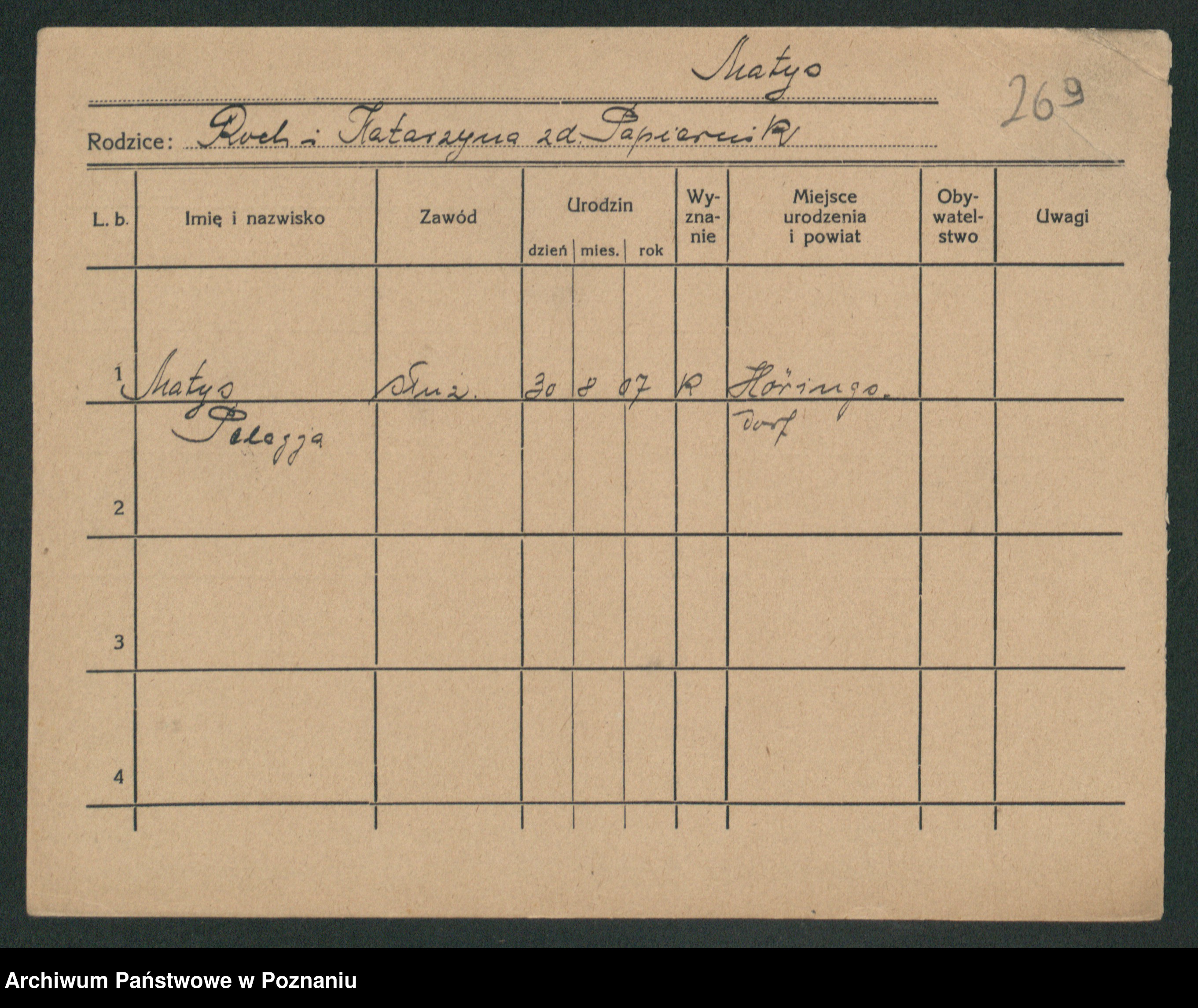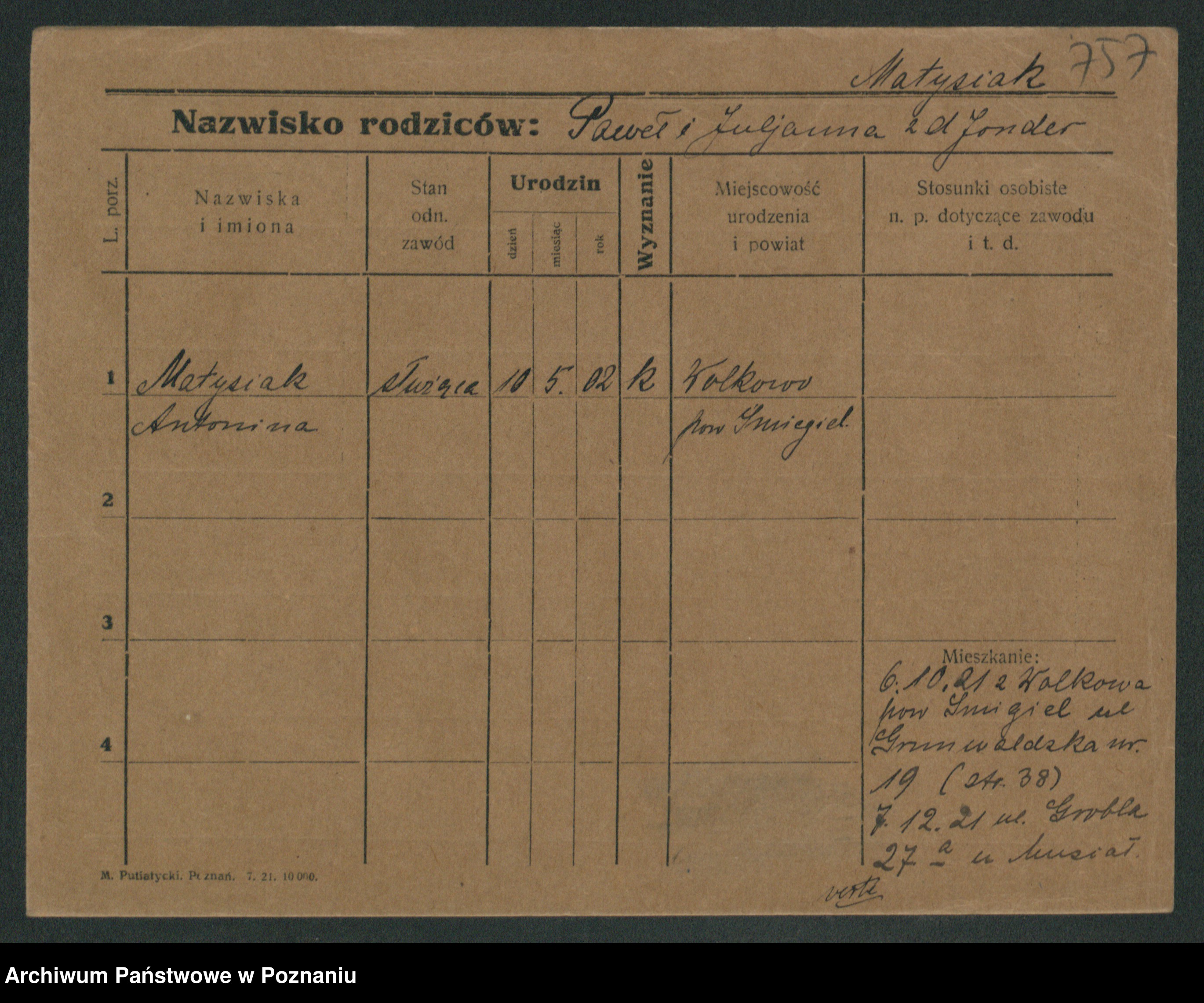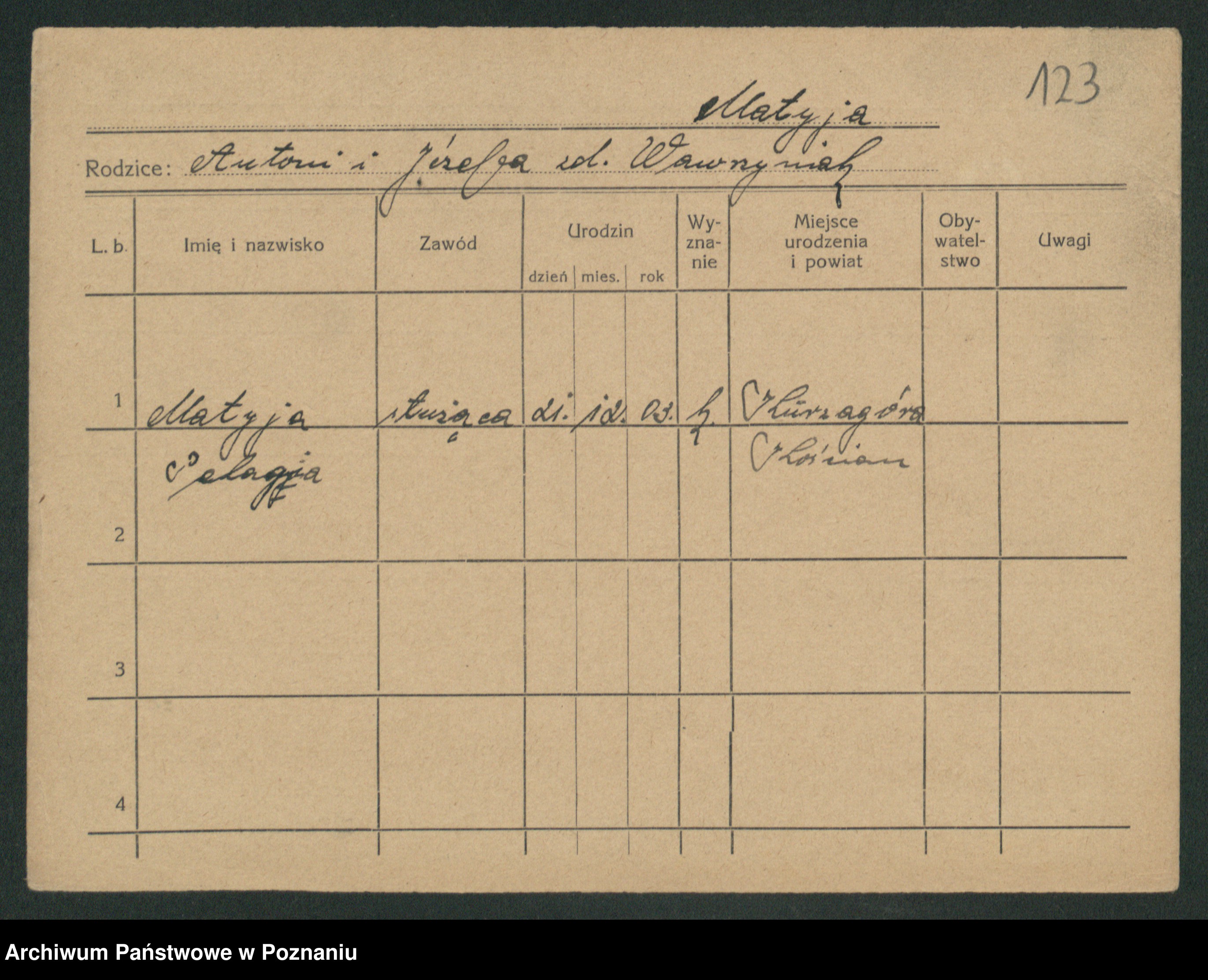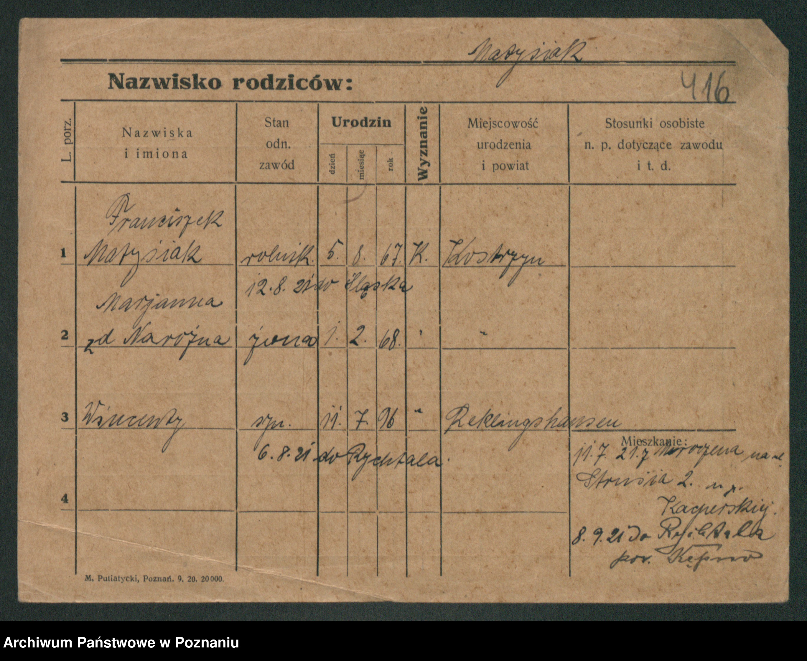 Podgląd karty osobowej dostępny jest po kliknięciu na nazwisko lub ikonkę karty. Można dokonywać powiększenia (ikony na górze) lub przechodzić między kolejnymi skanami (strzałki po bokach).