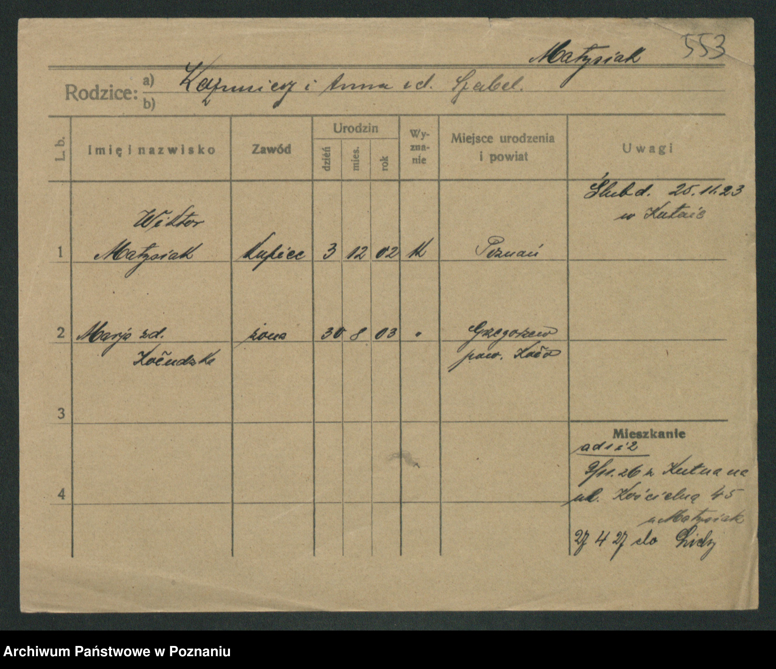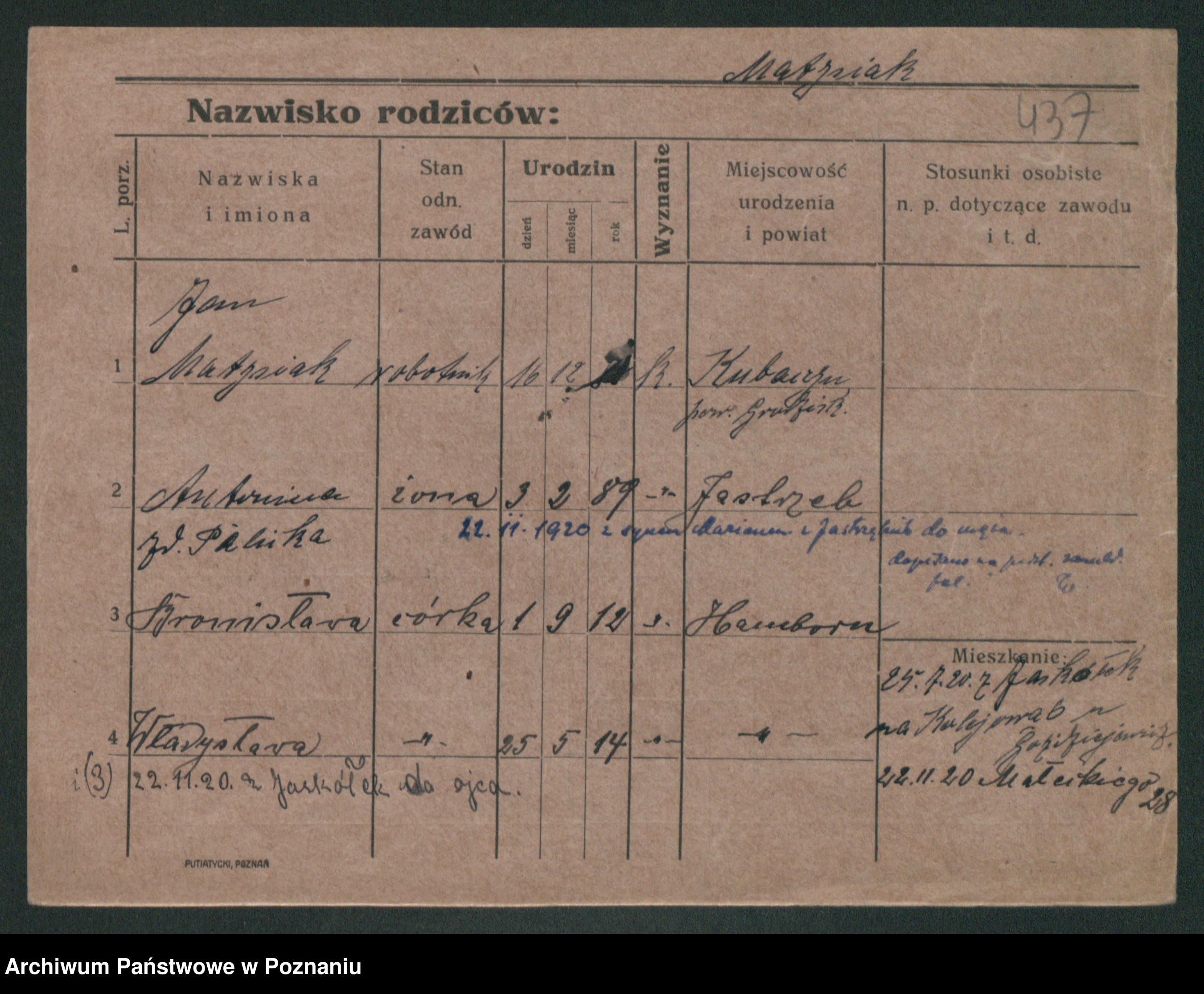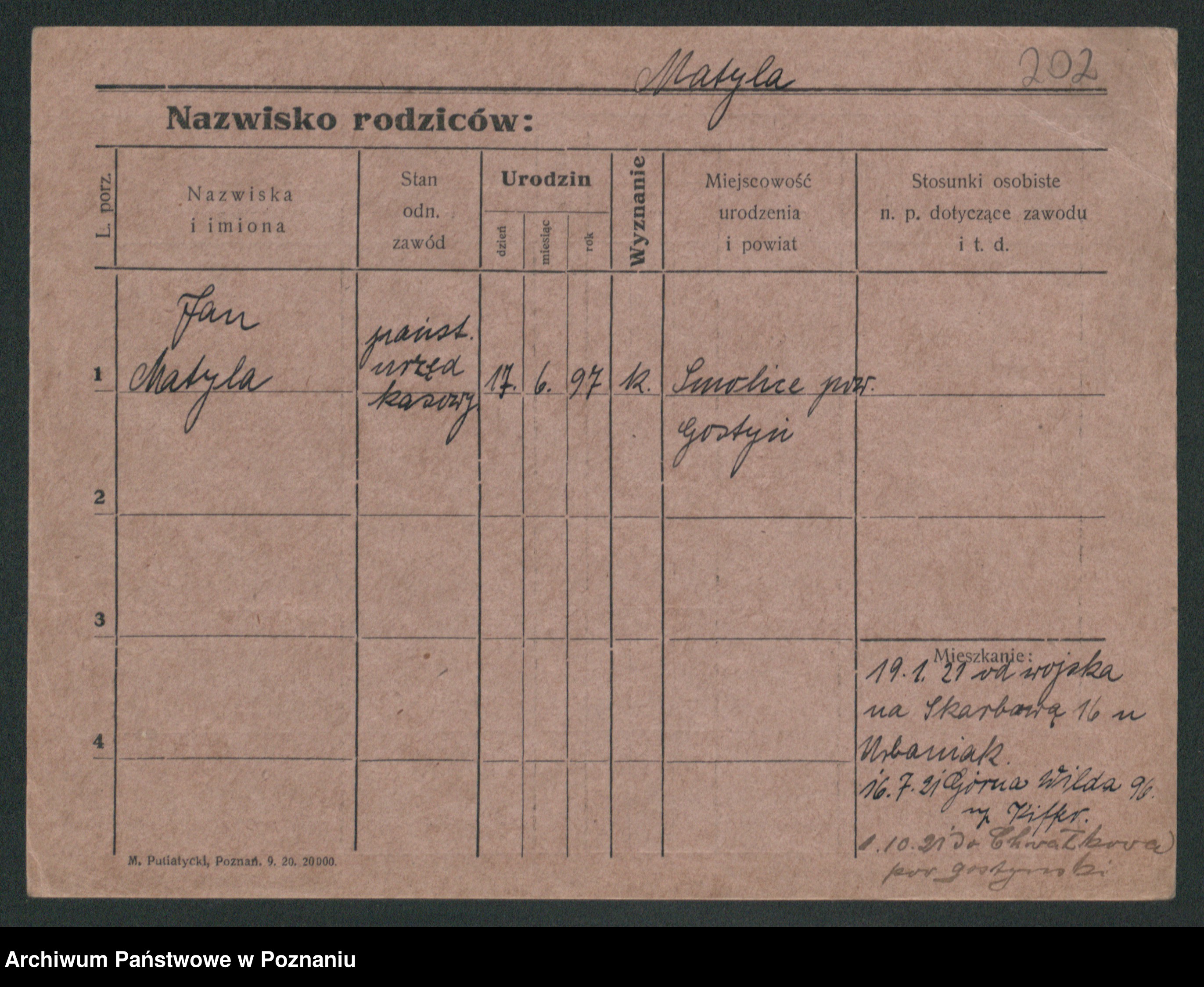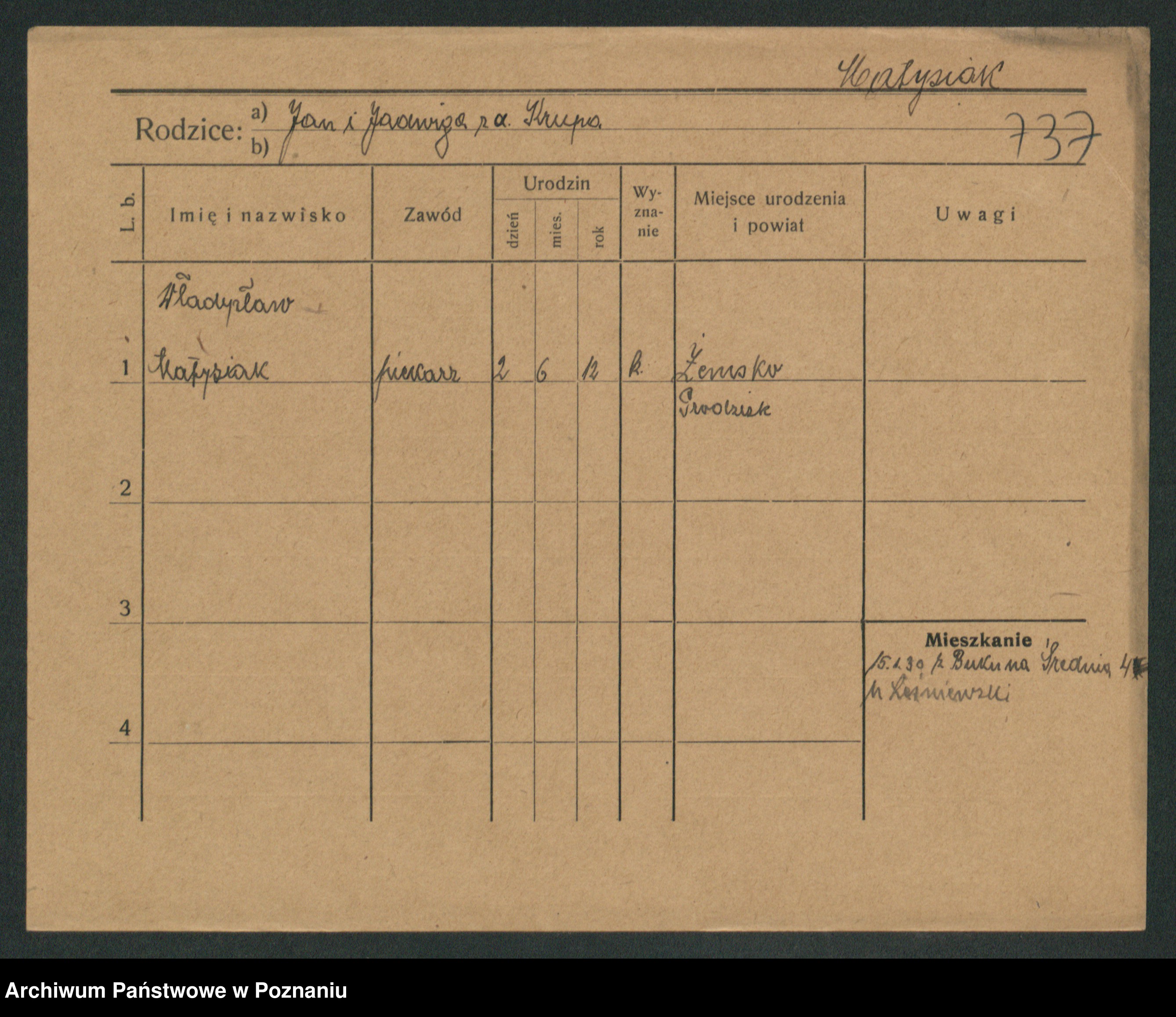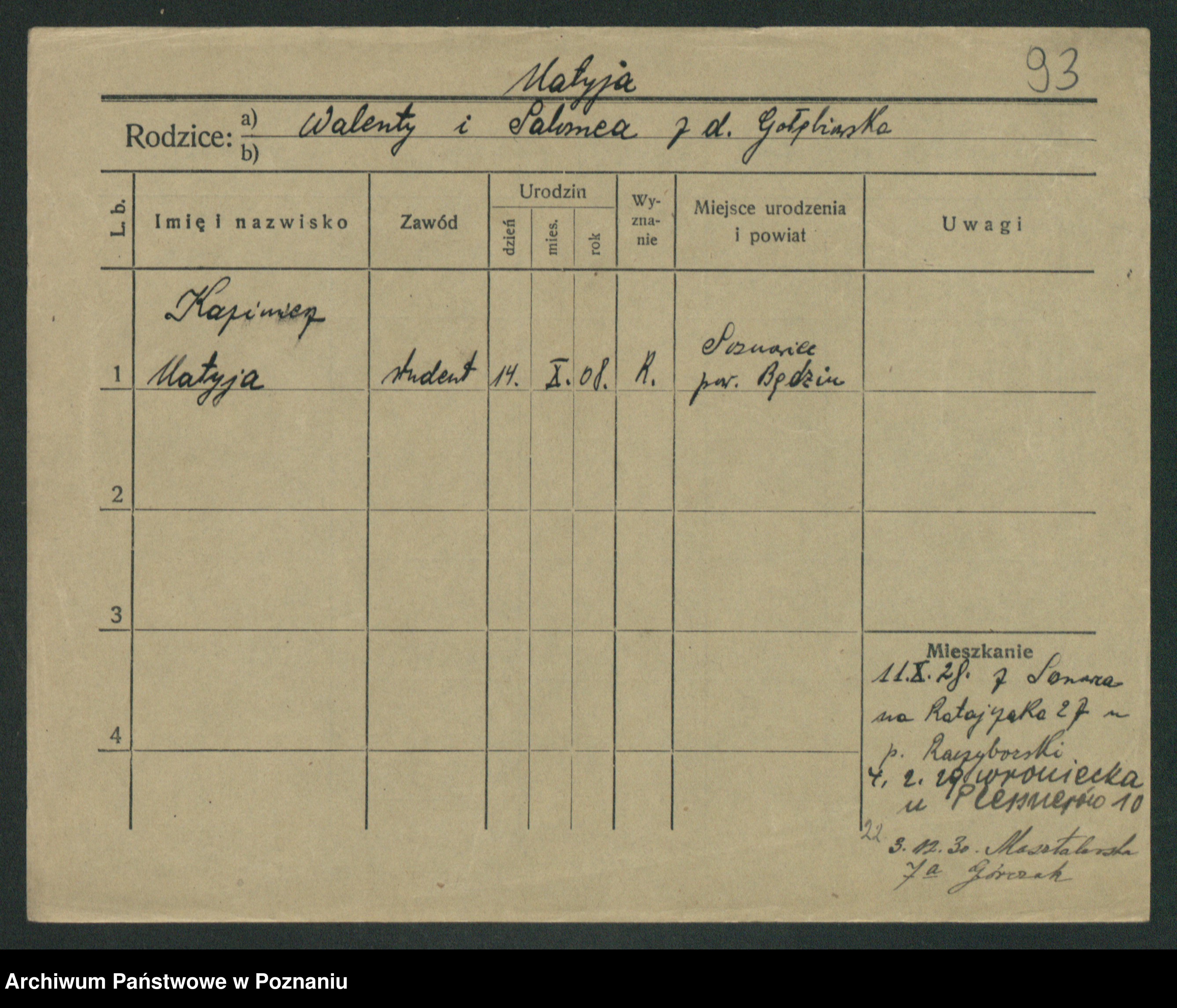 Podgląd karty osobowej dostępny jest po kliknięciu na nazwisko lub ikonkę karty. Można dokonywać powiększenia (ikony na górze) lub przechodzić między kolejnymi skanami (strzałki po bokach).