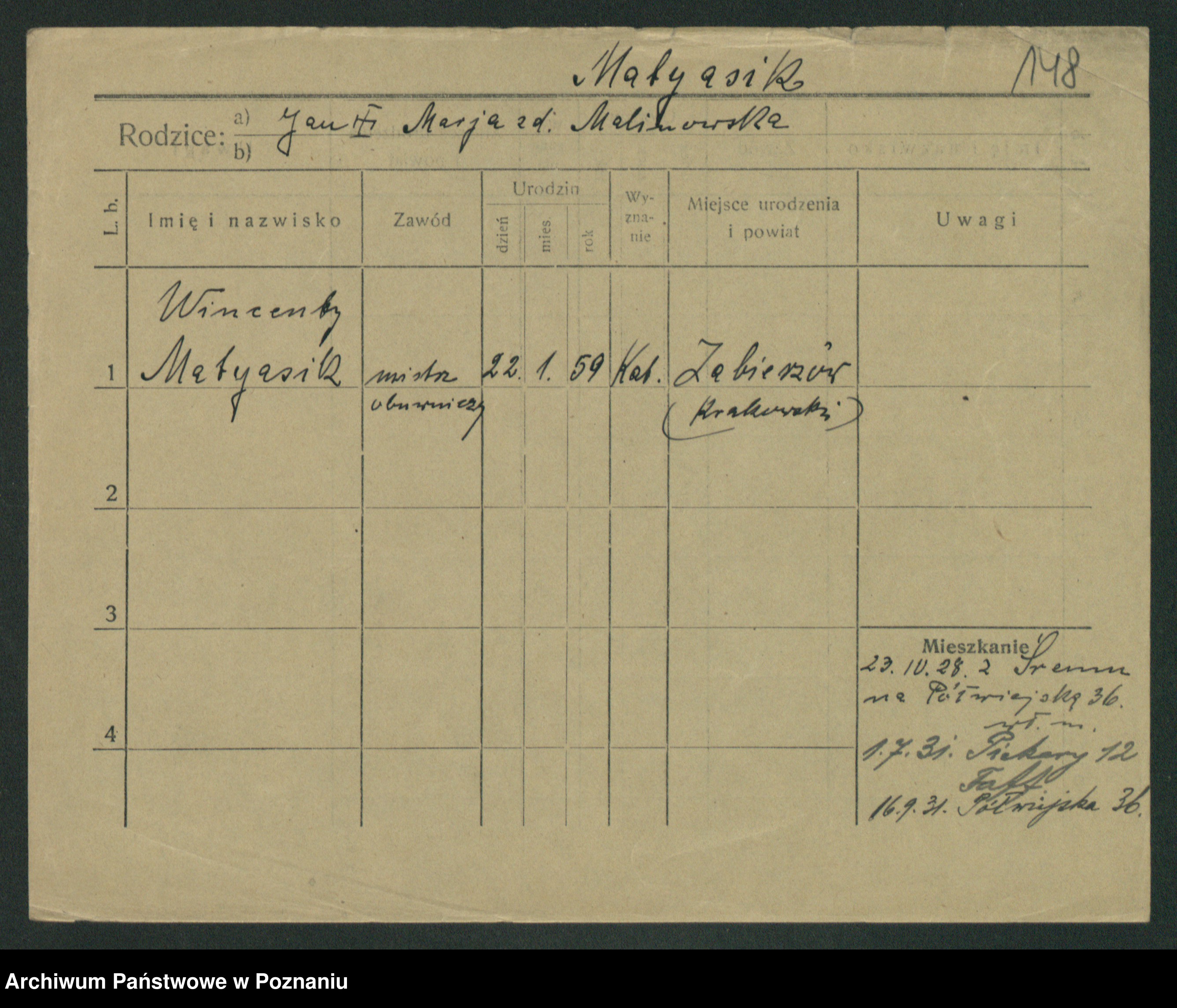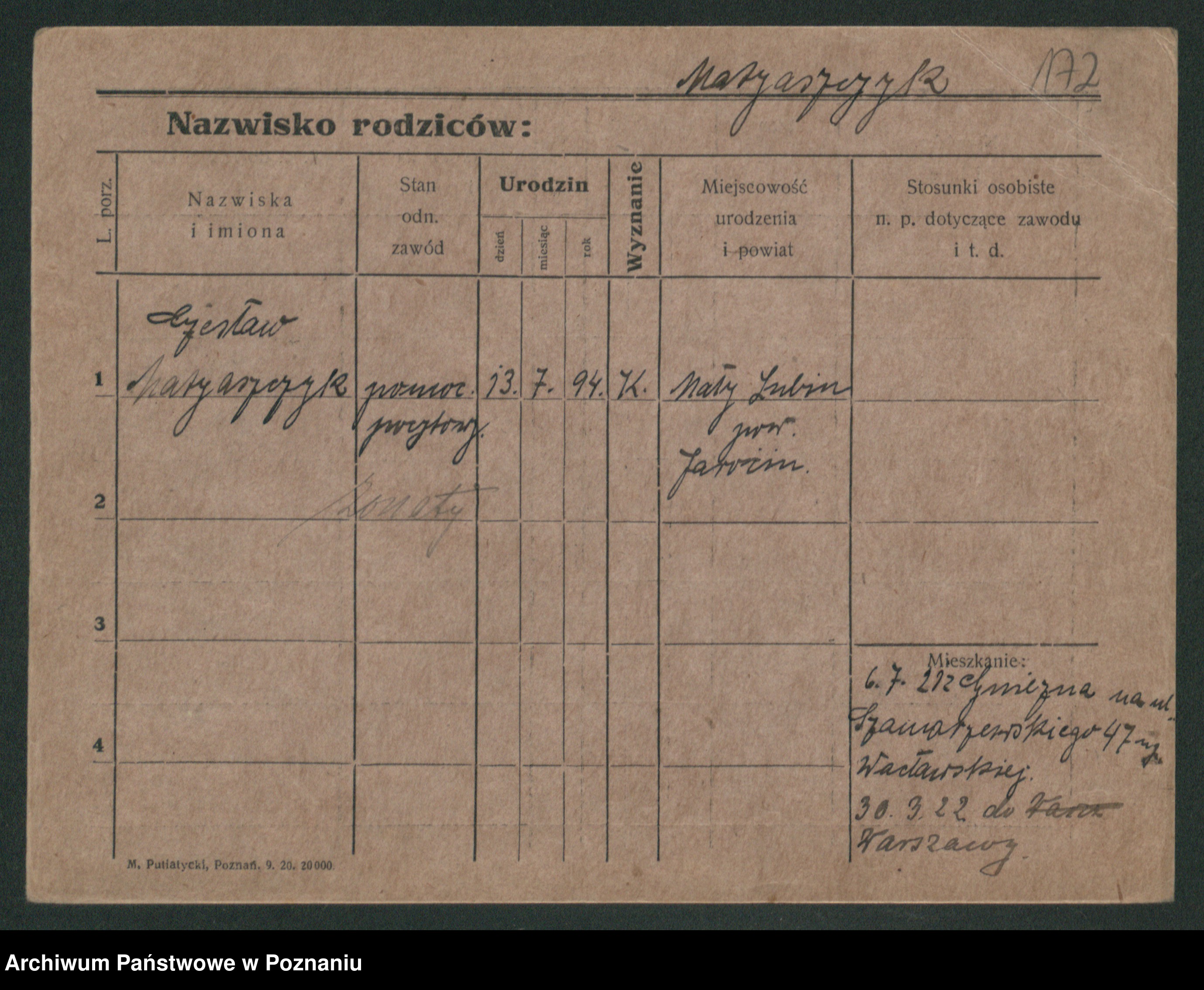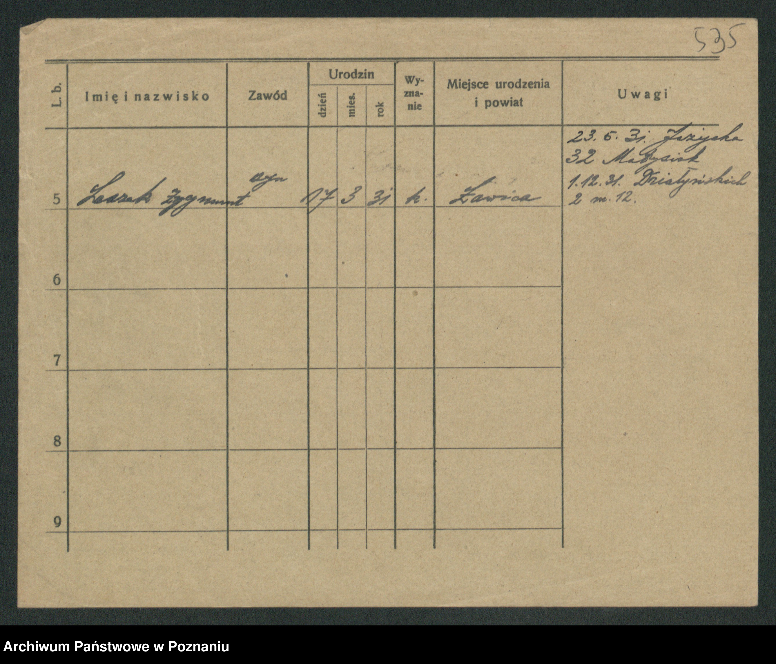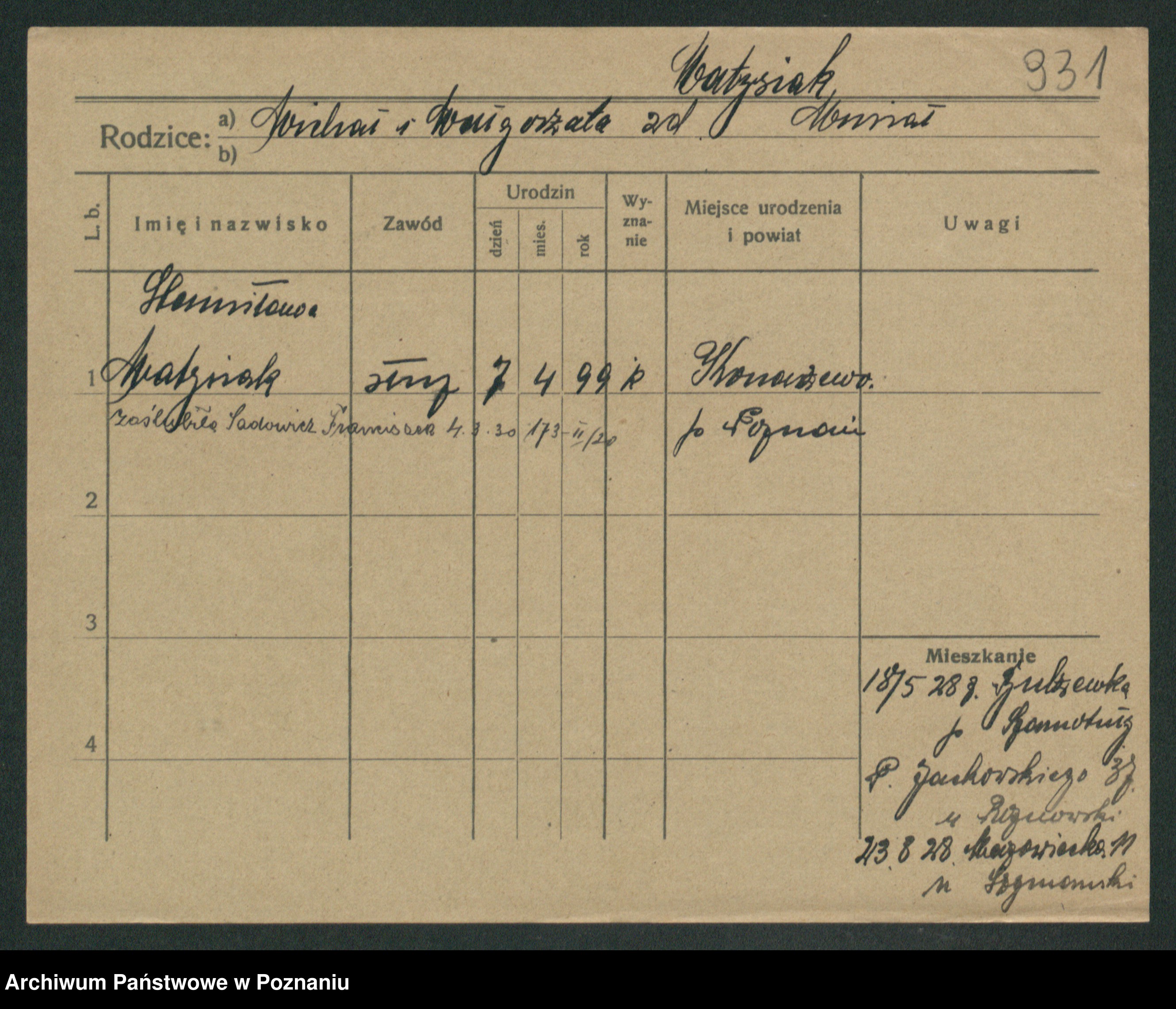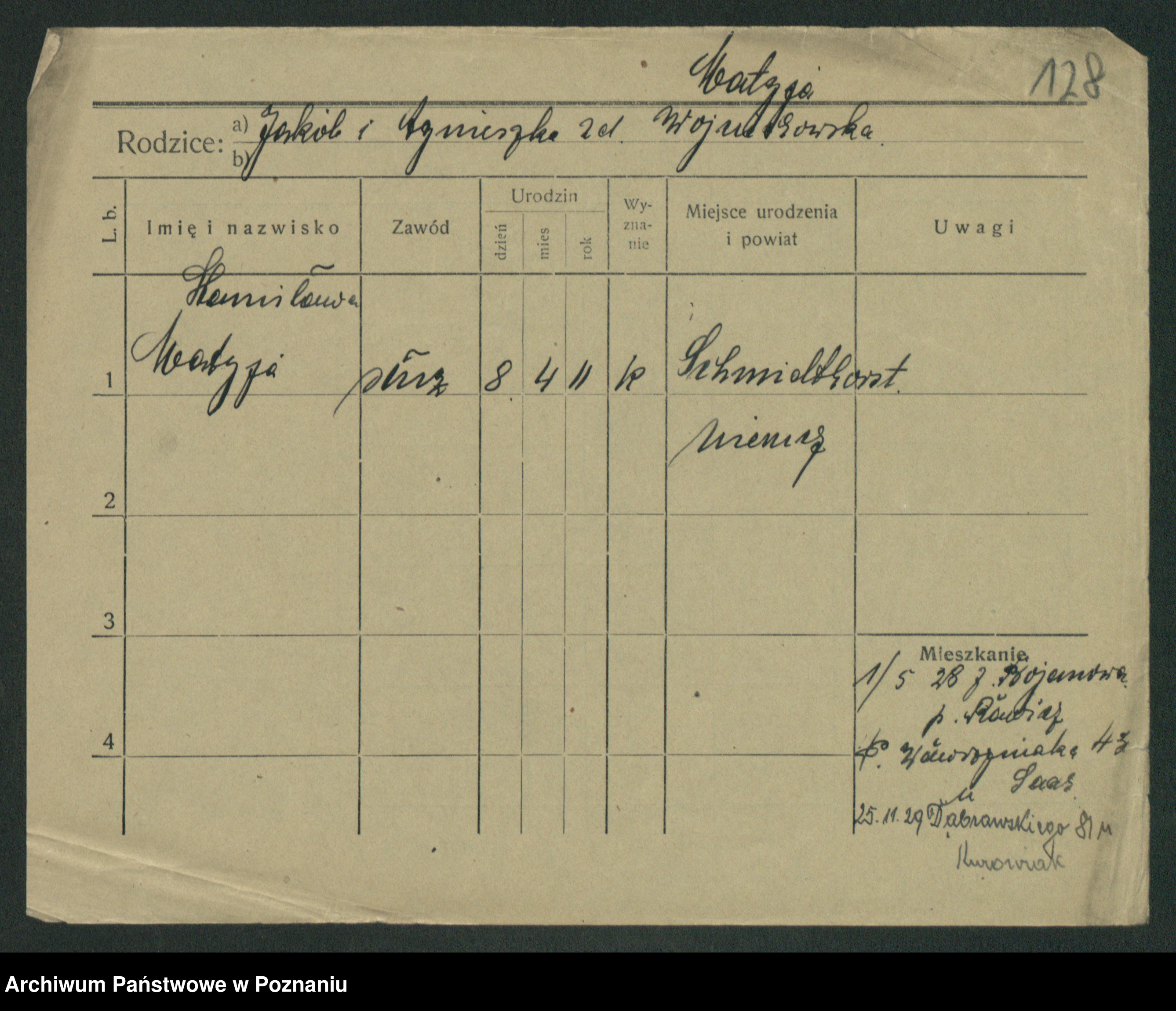 Podgląd karty osobowej dostępny jest po kliknięciu na nazwisko lub ikonkę karty. Można dokonywać powiększenia (ikony na górze) lub przechodzić między kolejnymi skanami (strzałki po bokach).