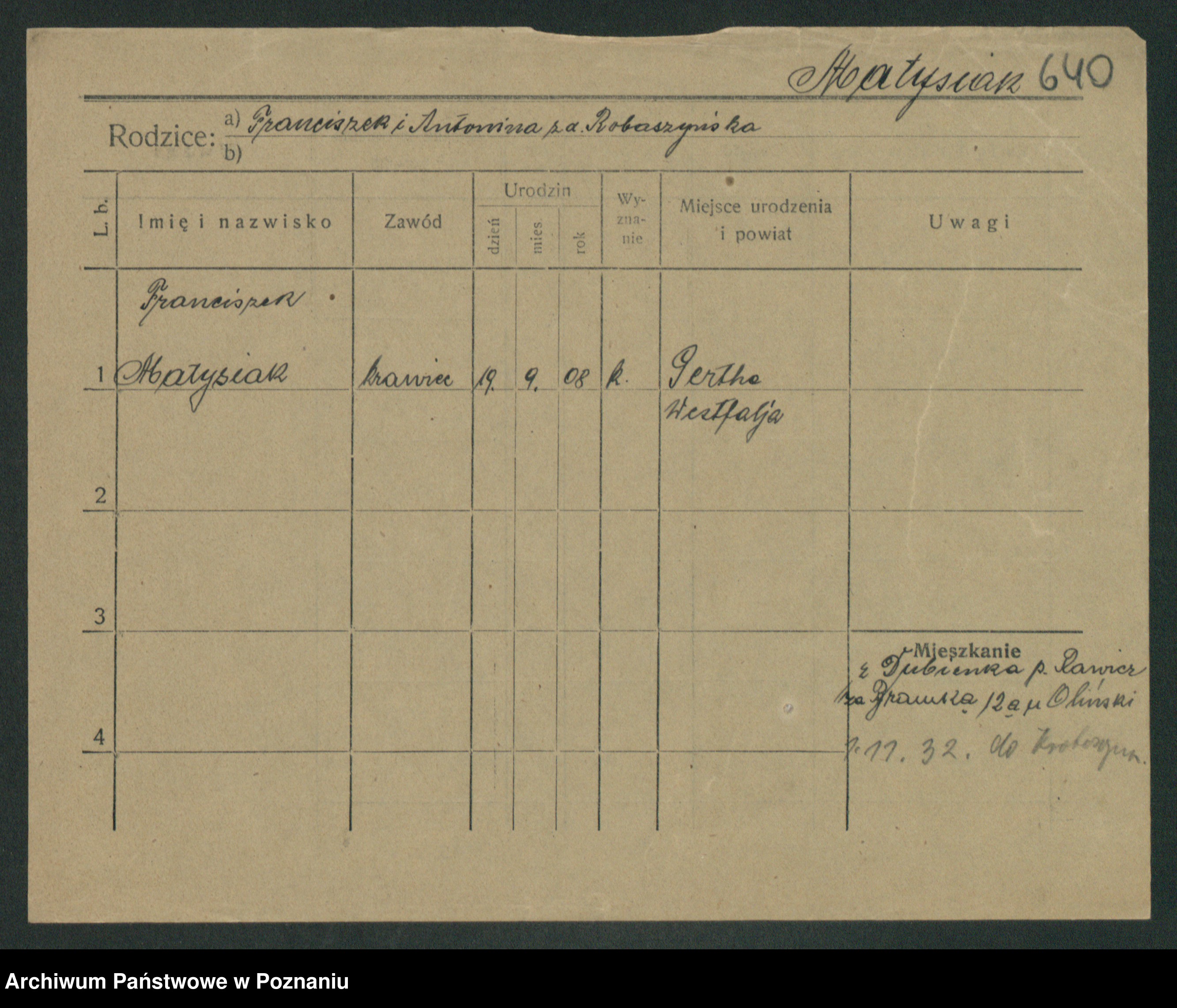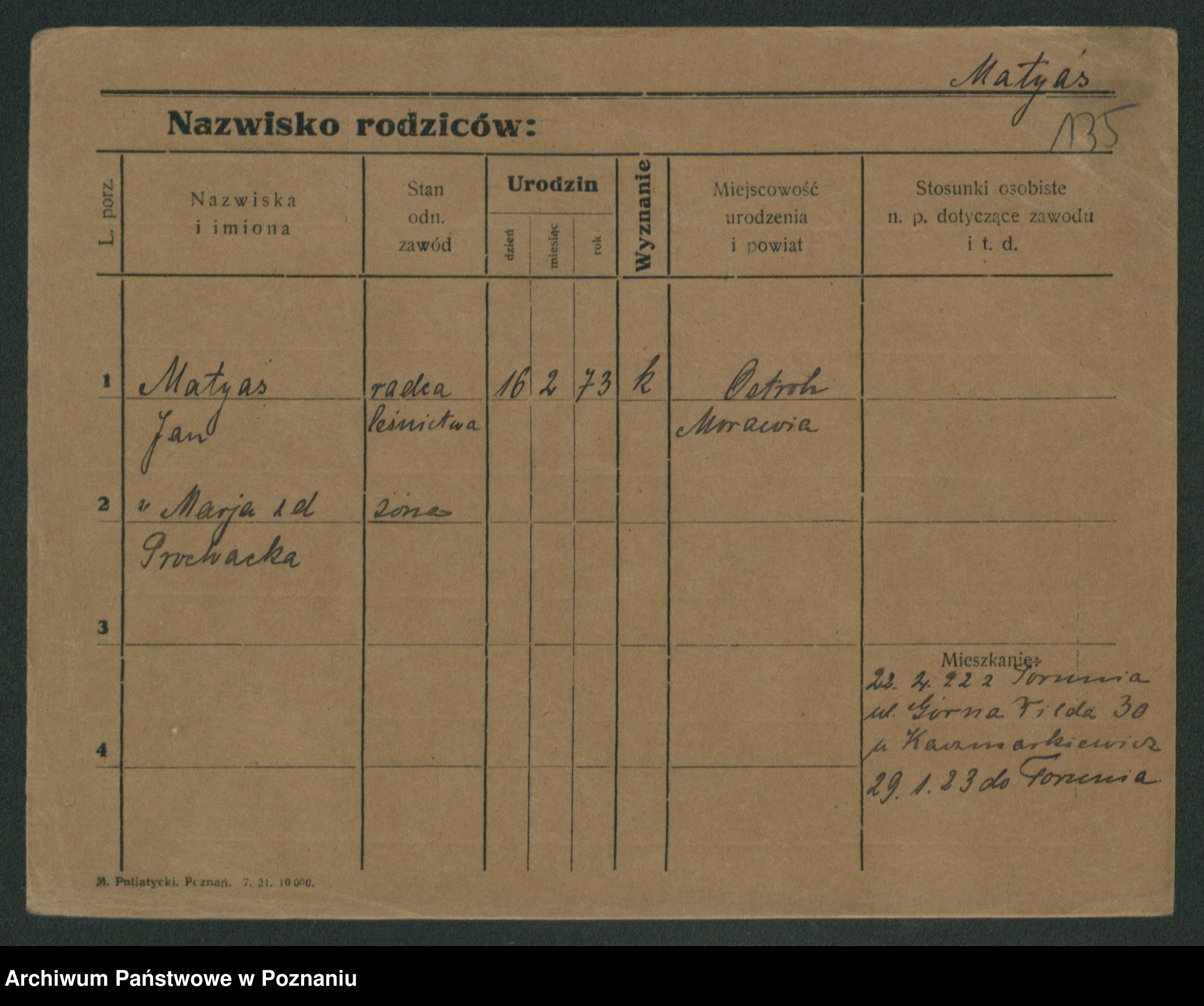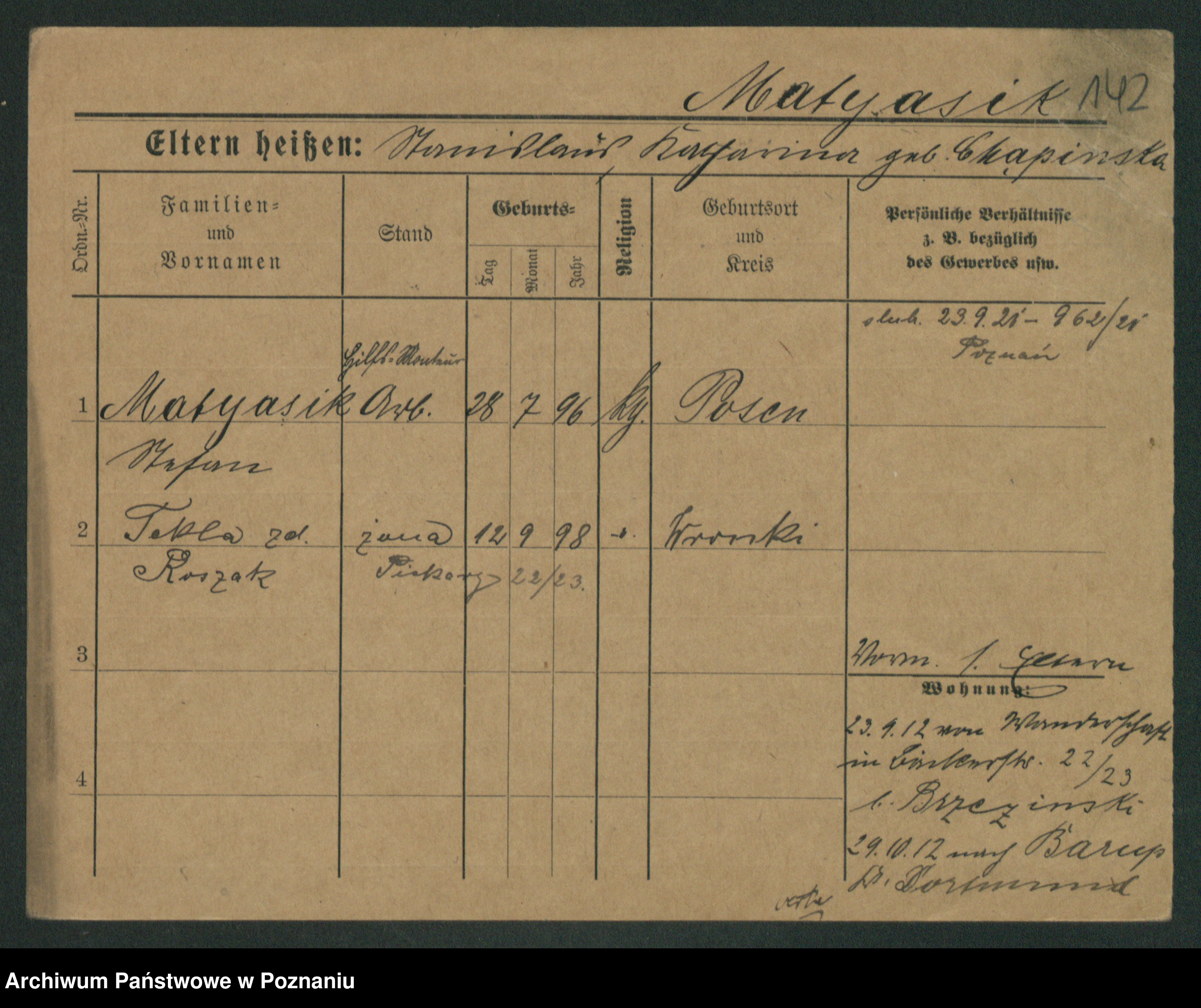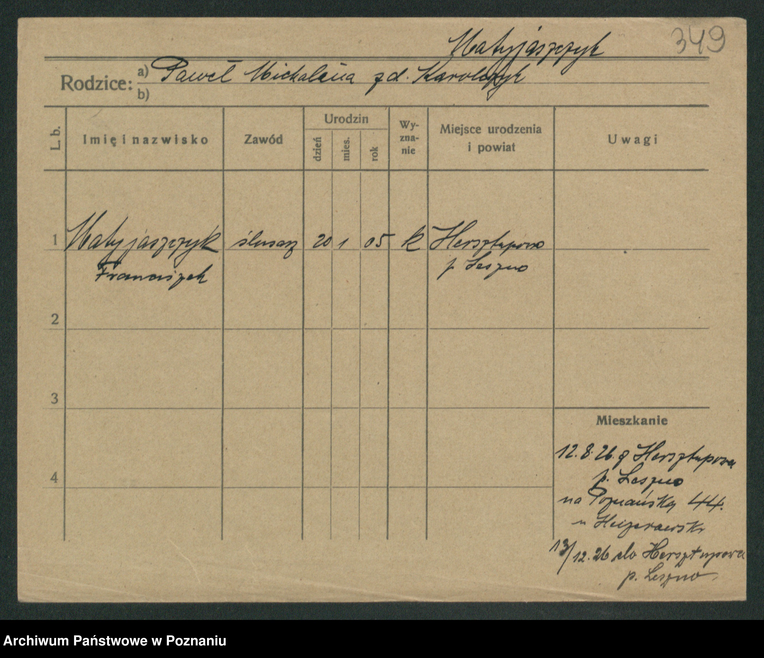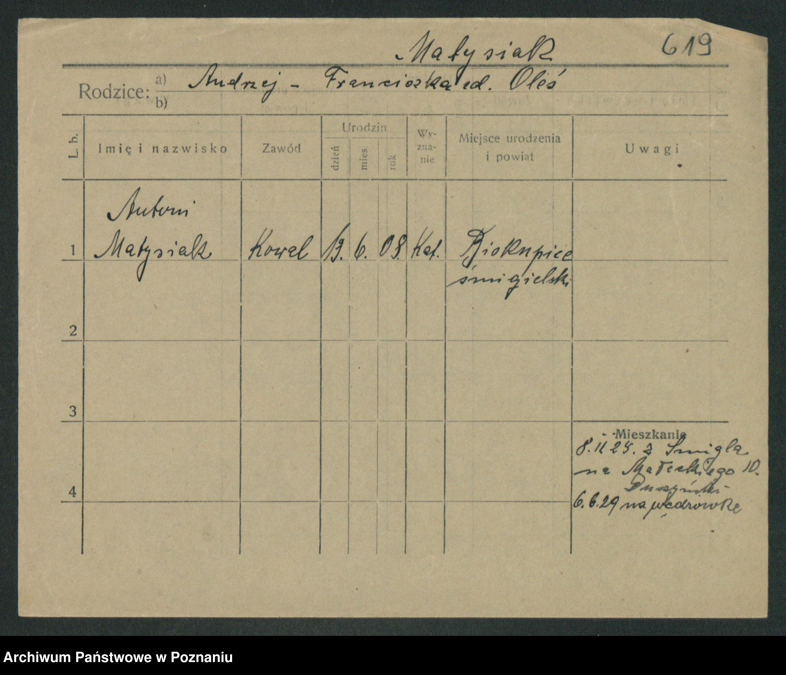 Podgląd karty osobowej dostępny jest po kliknięciu na nazwisko lub ikonkę karty. Można dokonywać powiększenia (ikony na górze) lub przechodzić między kolejnymi skanami (strzałki po bokach).