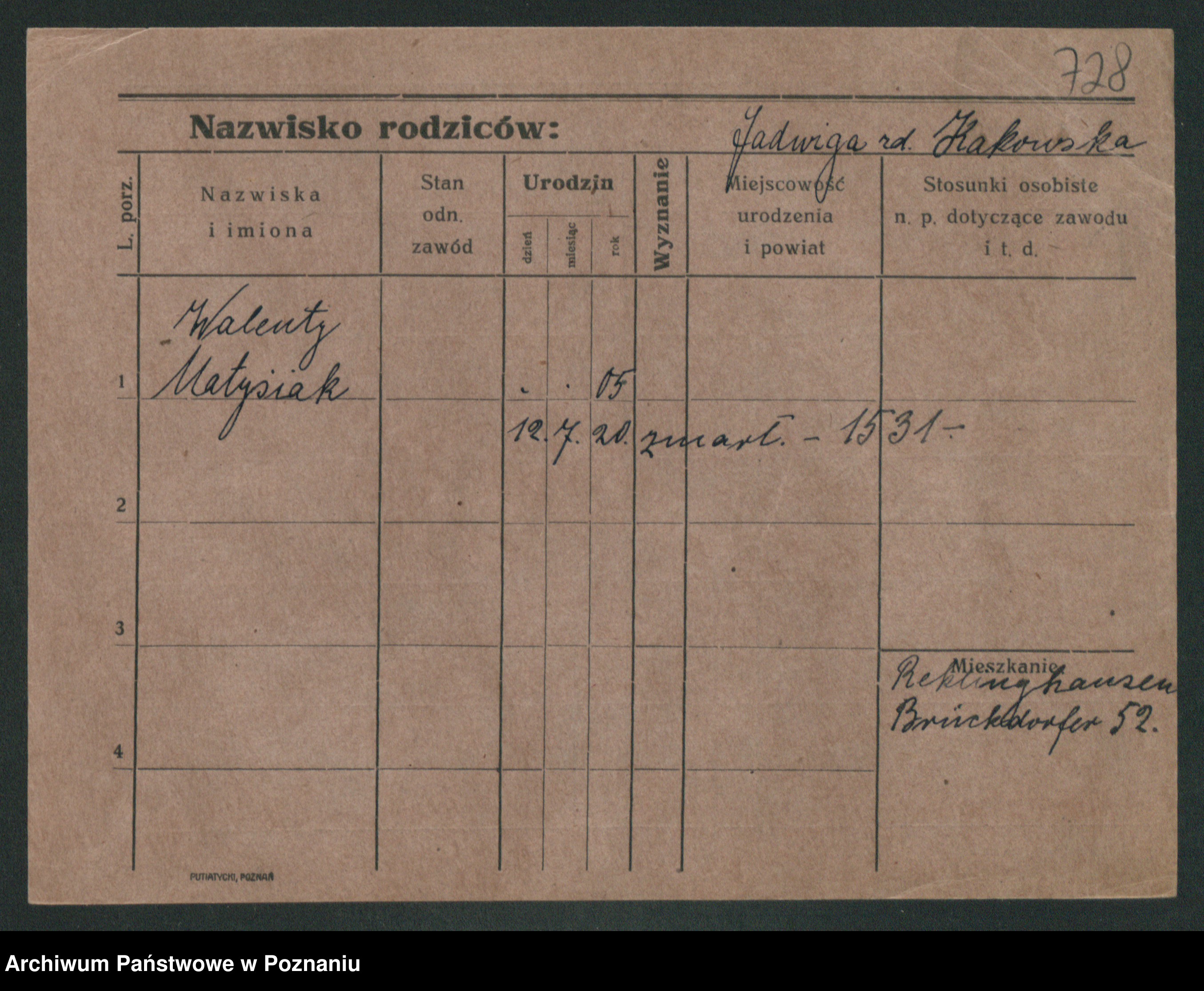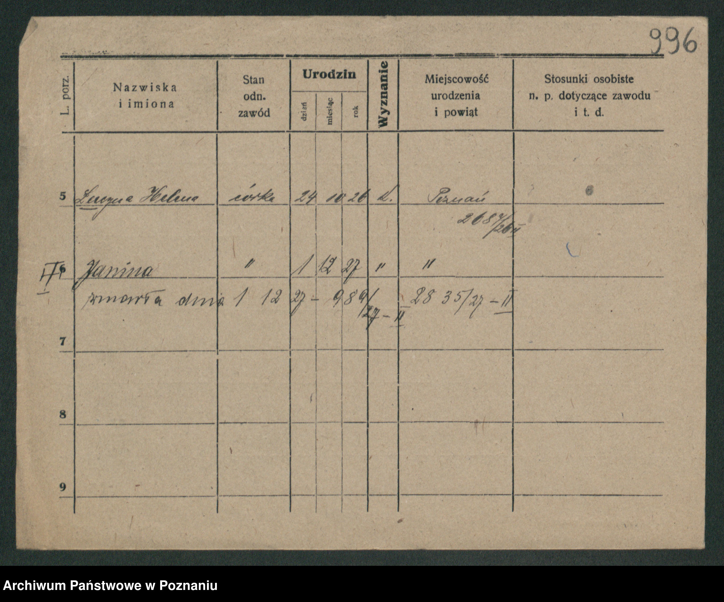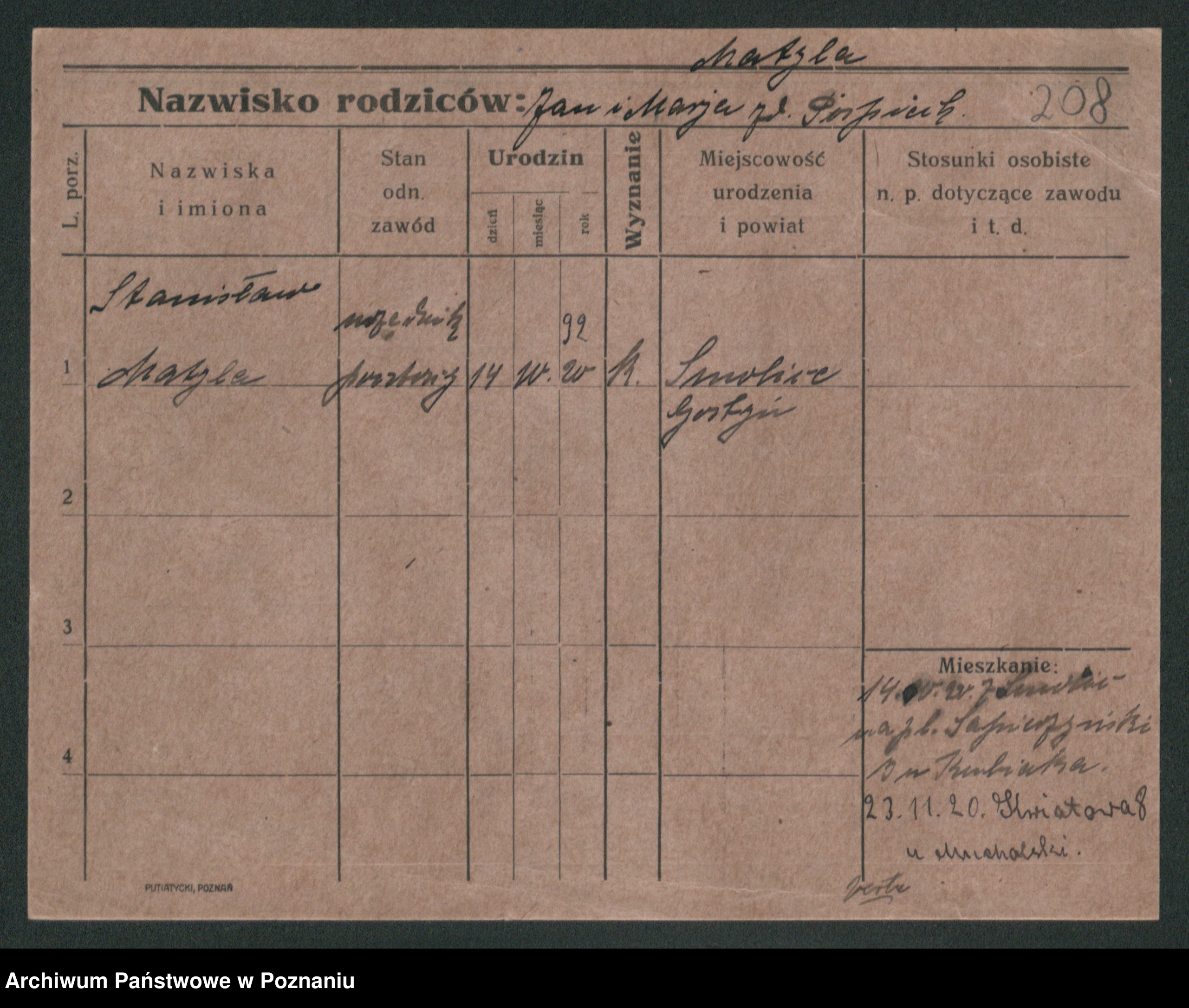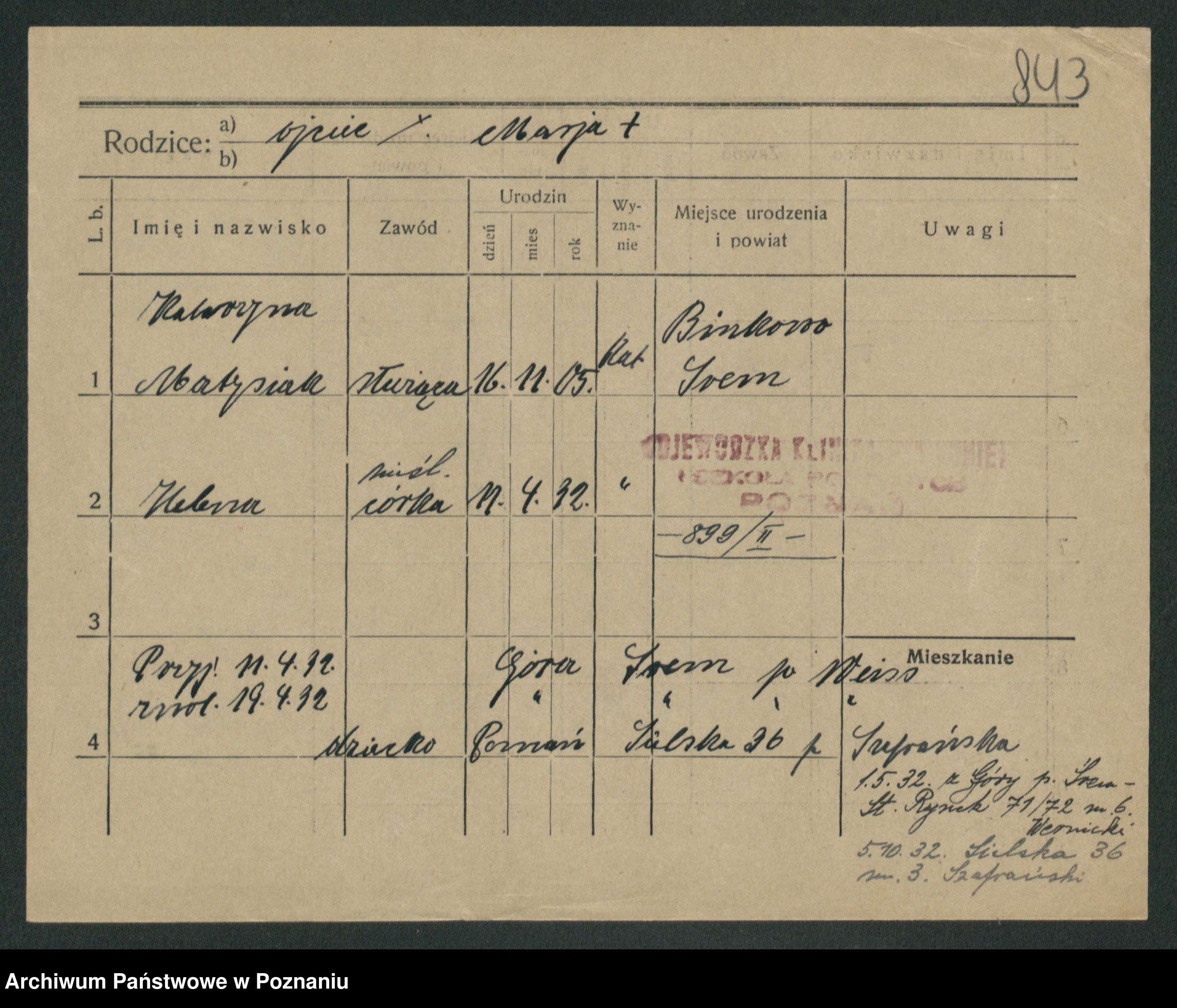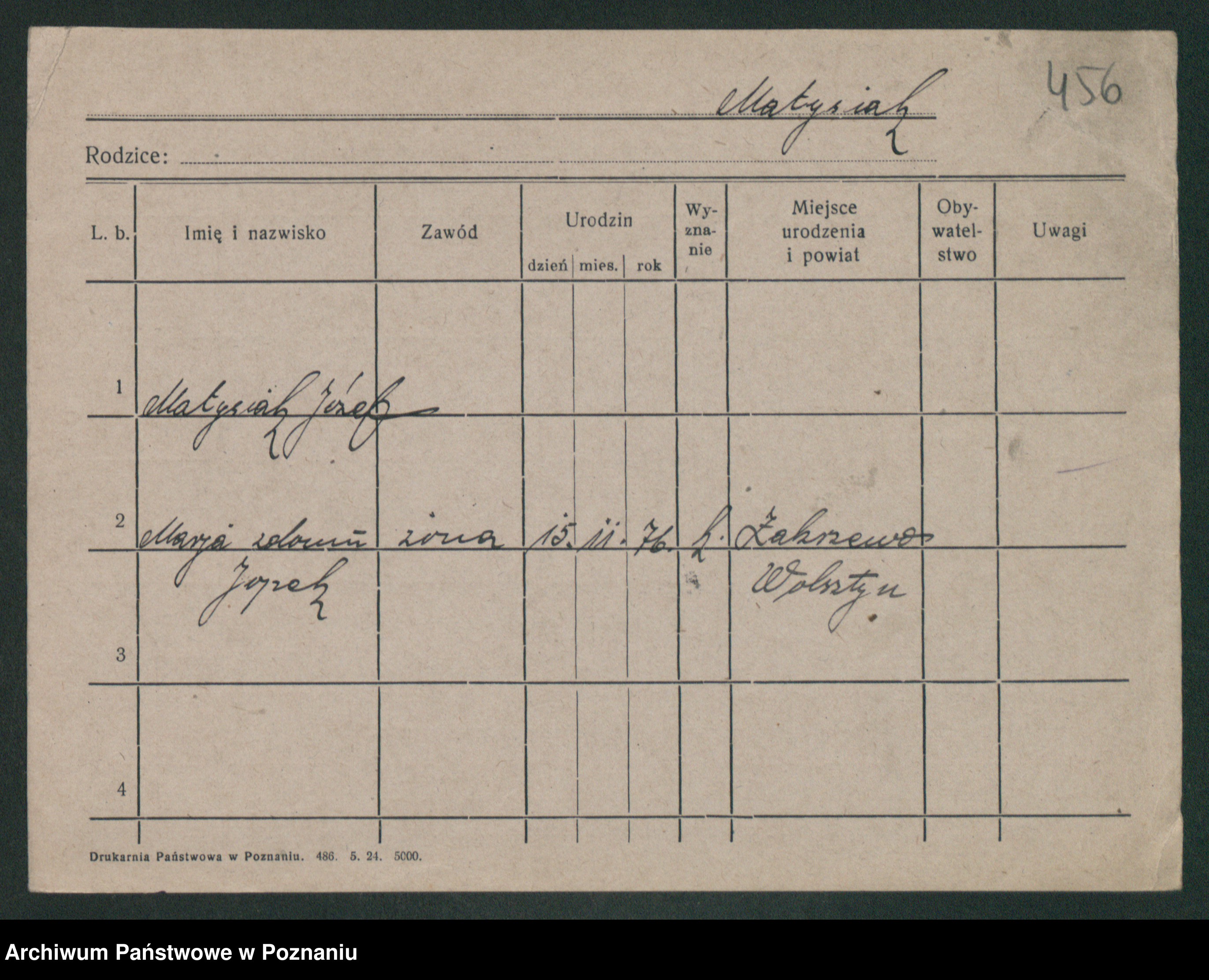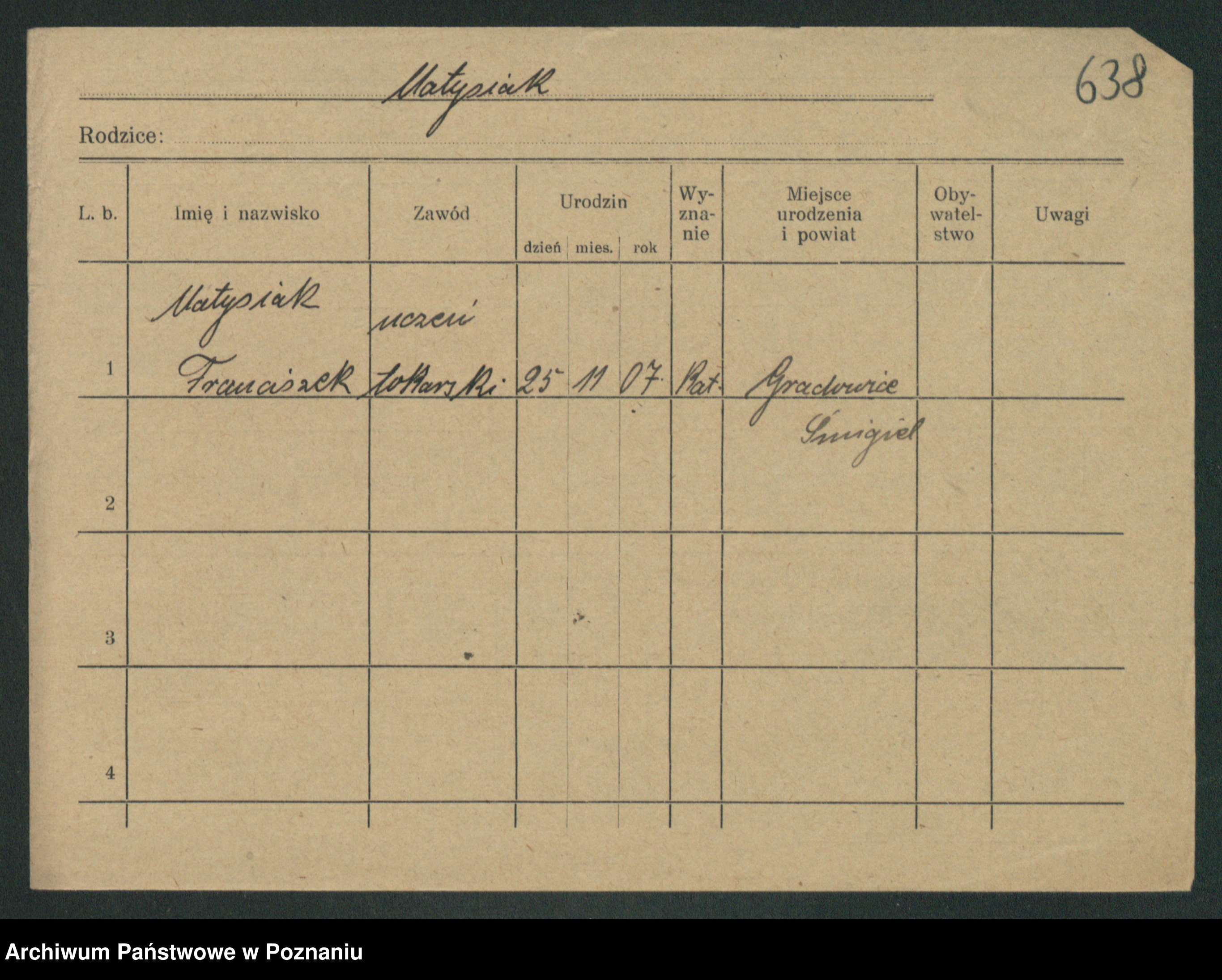 Podgląd karty osobowej dostępny jest po kliknięciu na nazwisko lub ikonkę karty. Można dokonywać powiększenia (ikony na górze) lub przechodzić między kolejnymi skanami (strzałki po bokach).
