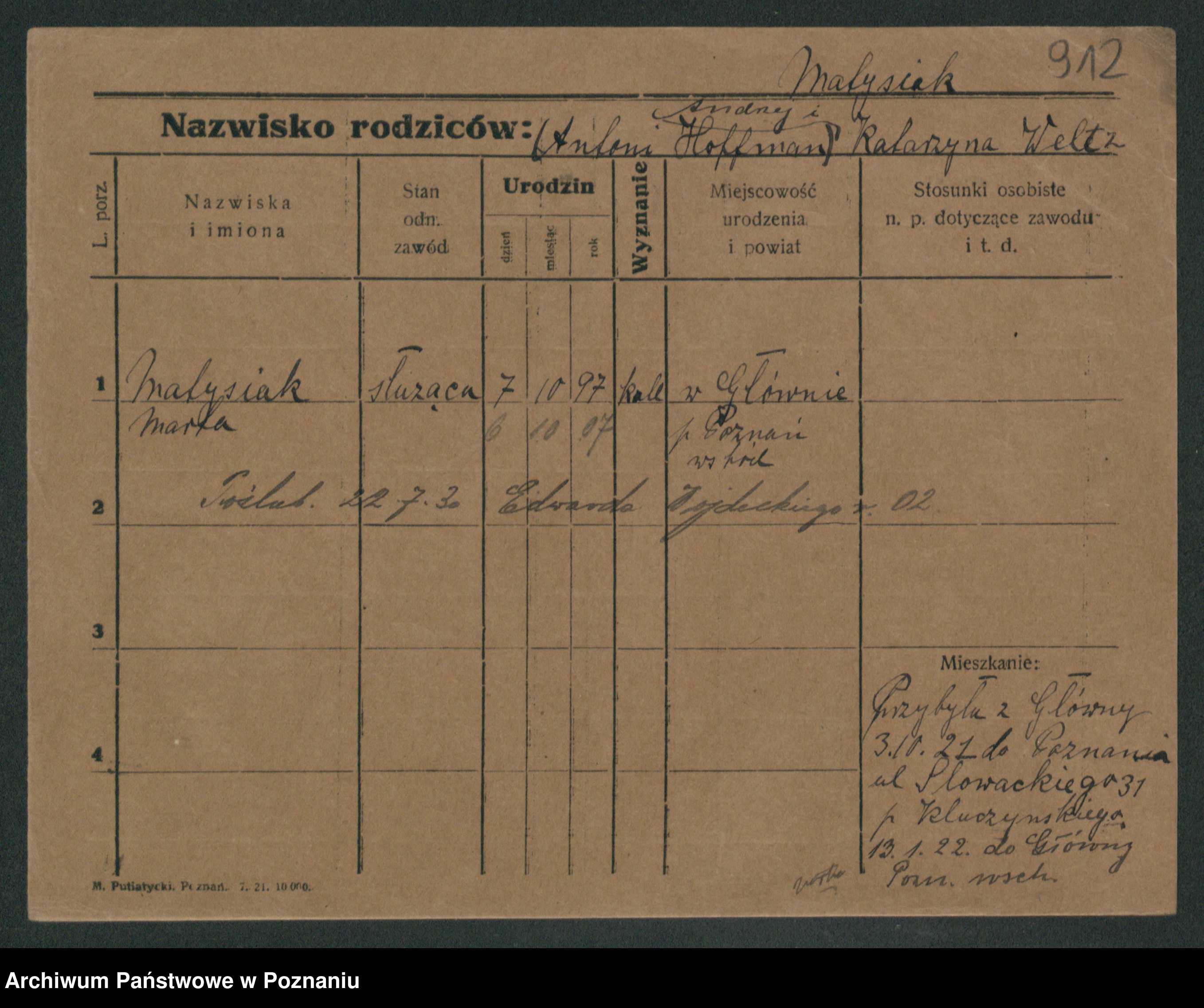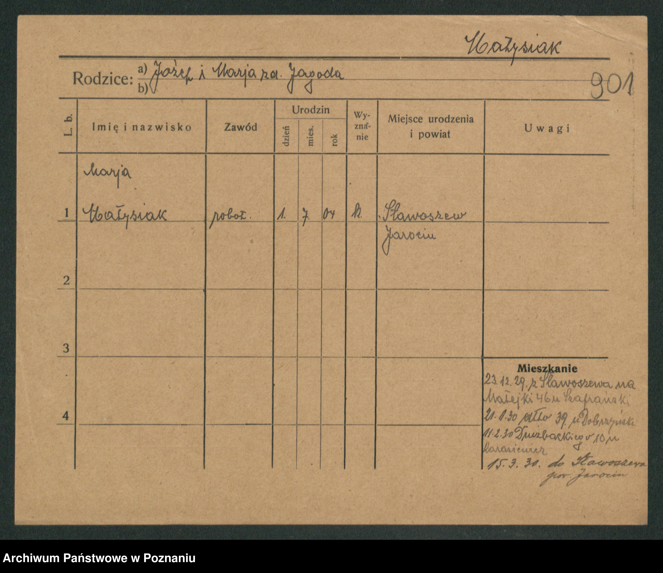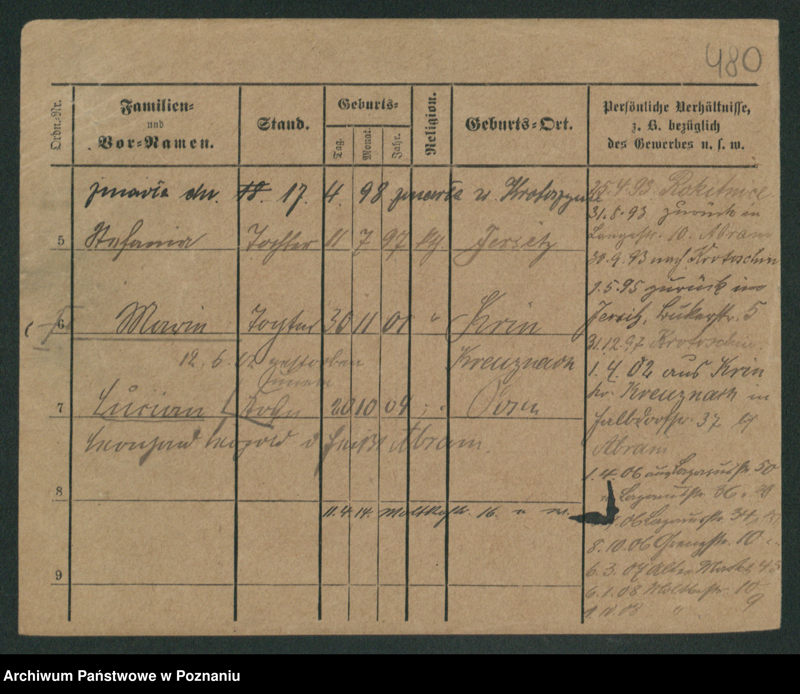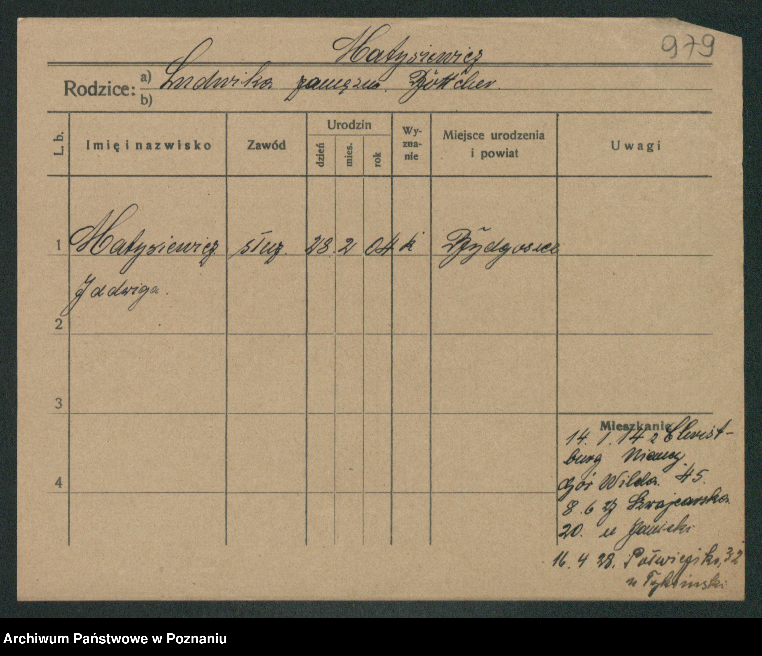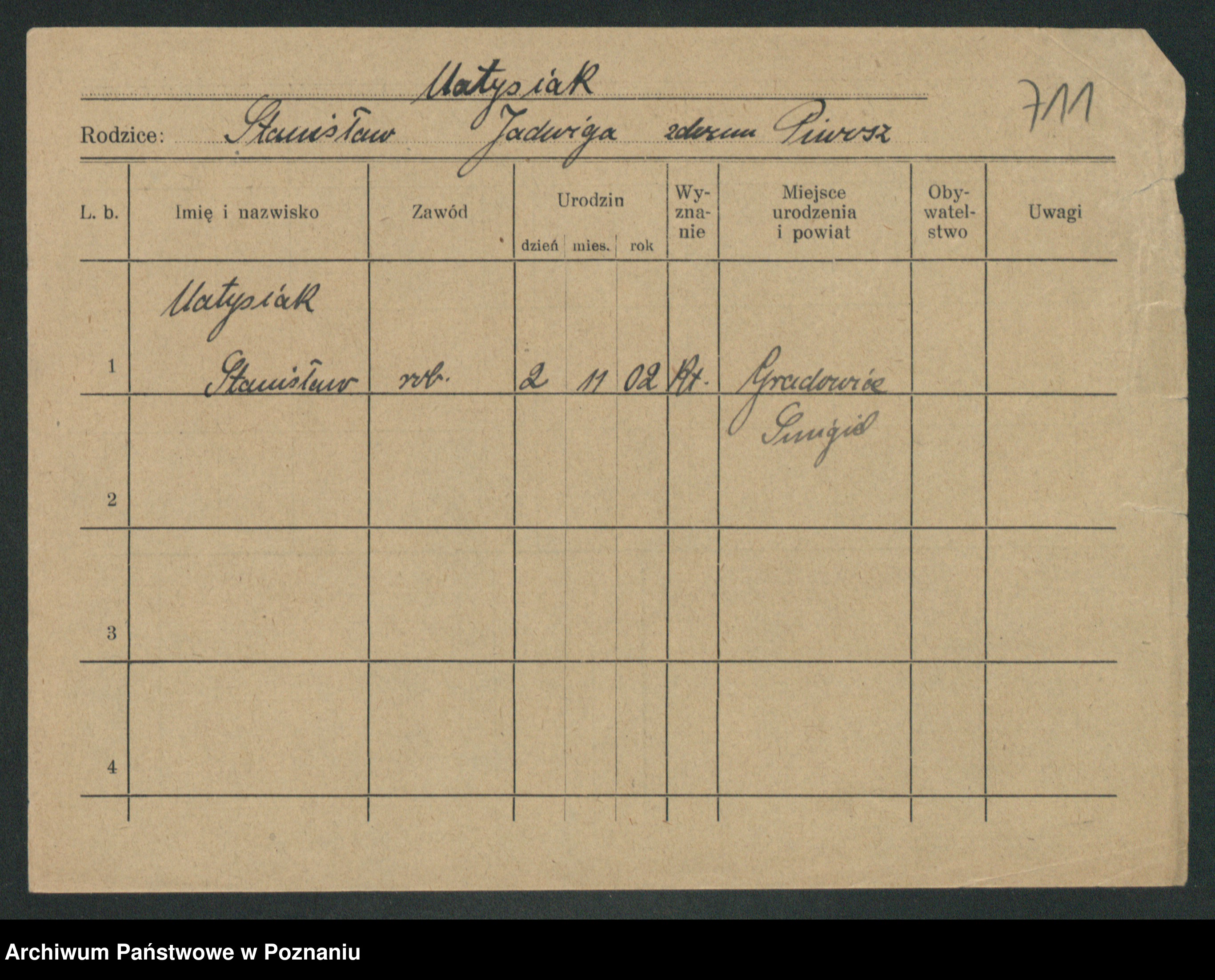 Podgląd karty osobowej dostępny jest po kliknięciu na nazwisko lub ikonkę karty. Można dokonywać powiększenia (ikony na górze) lub przechodzić między kolejnymi skanami (strzałki po bokach).