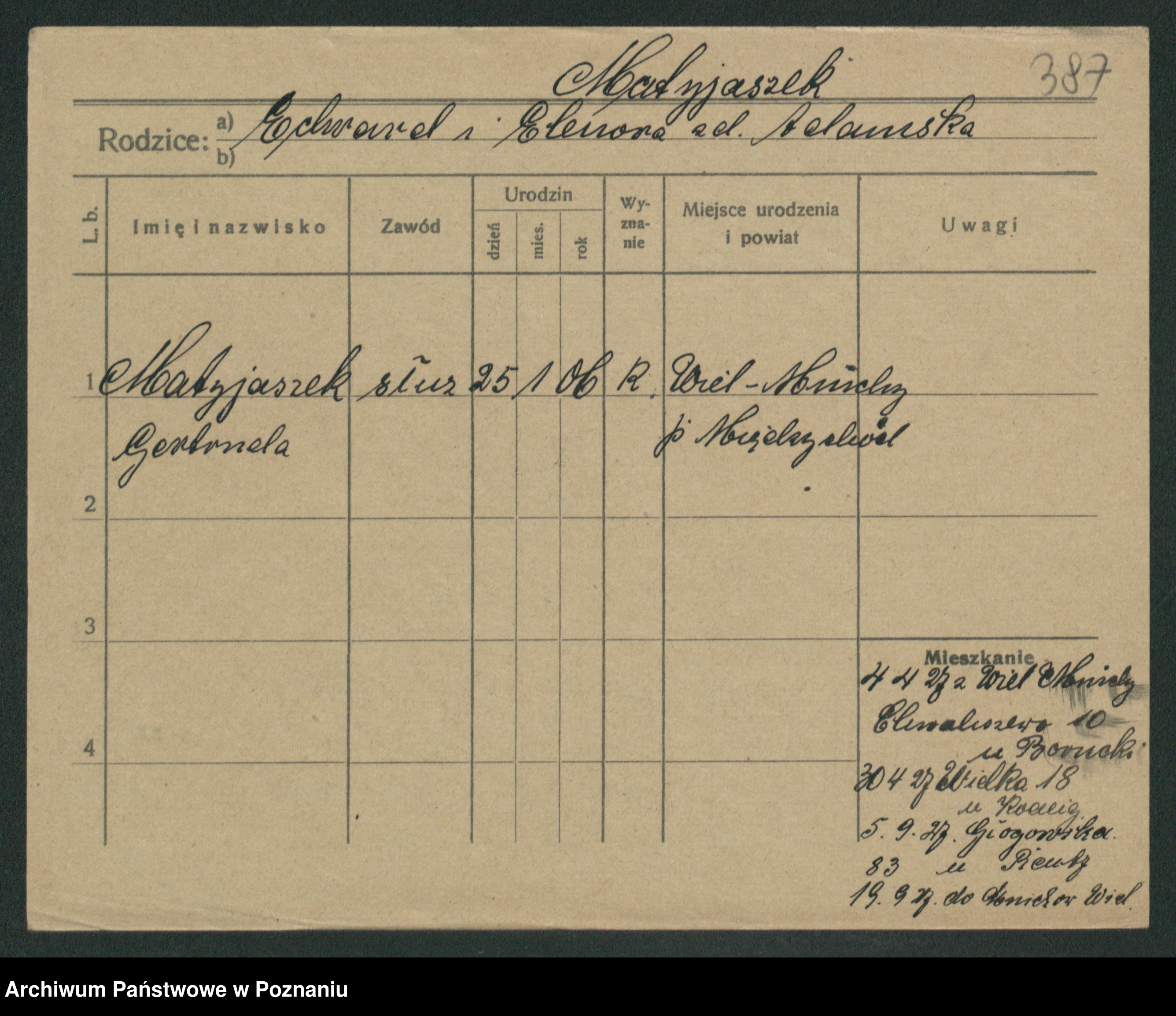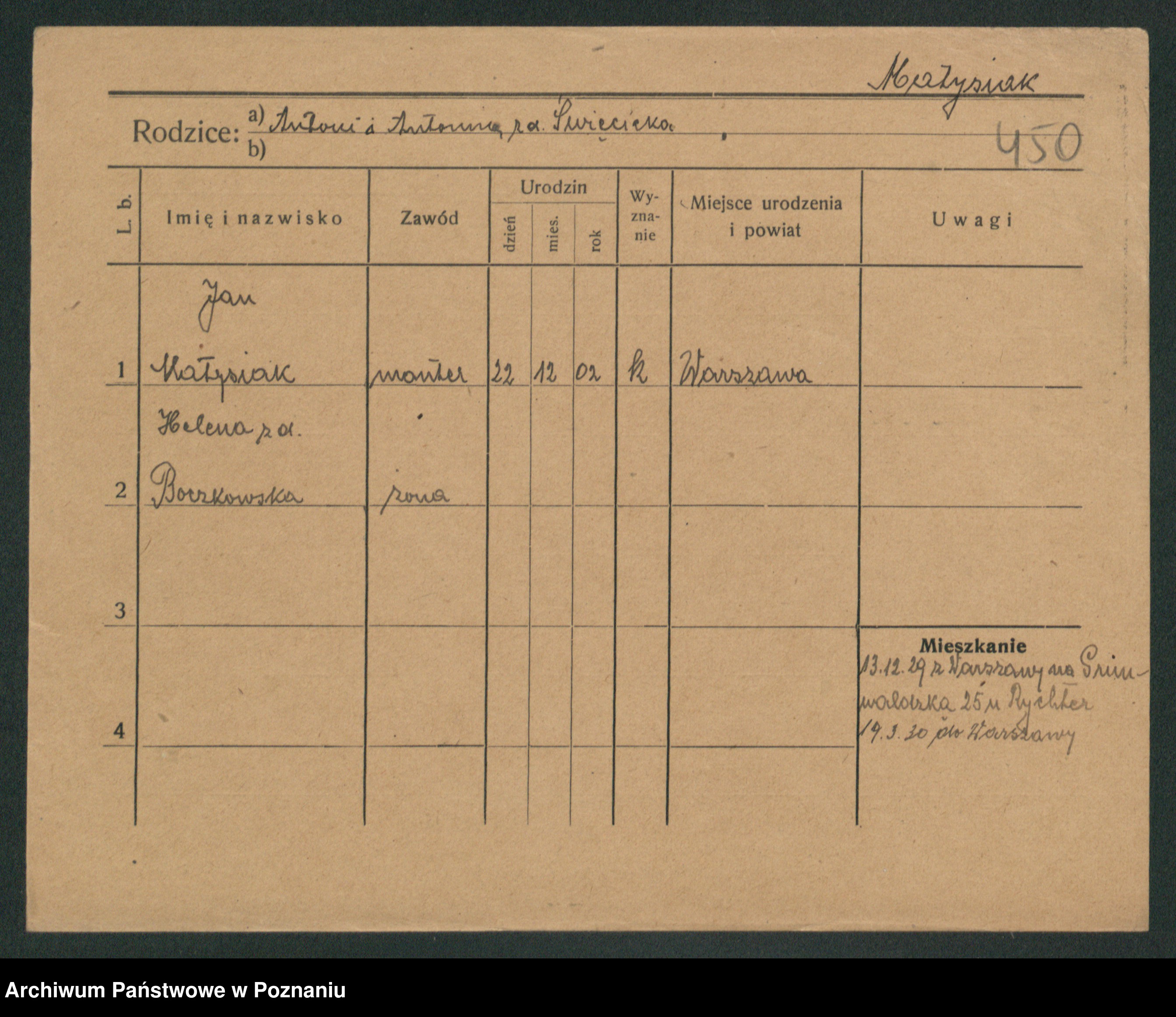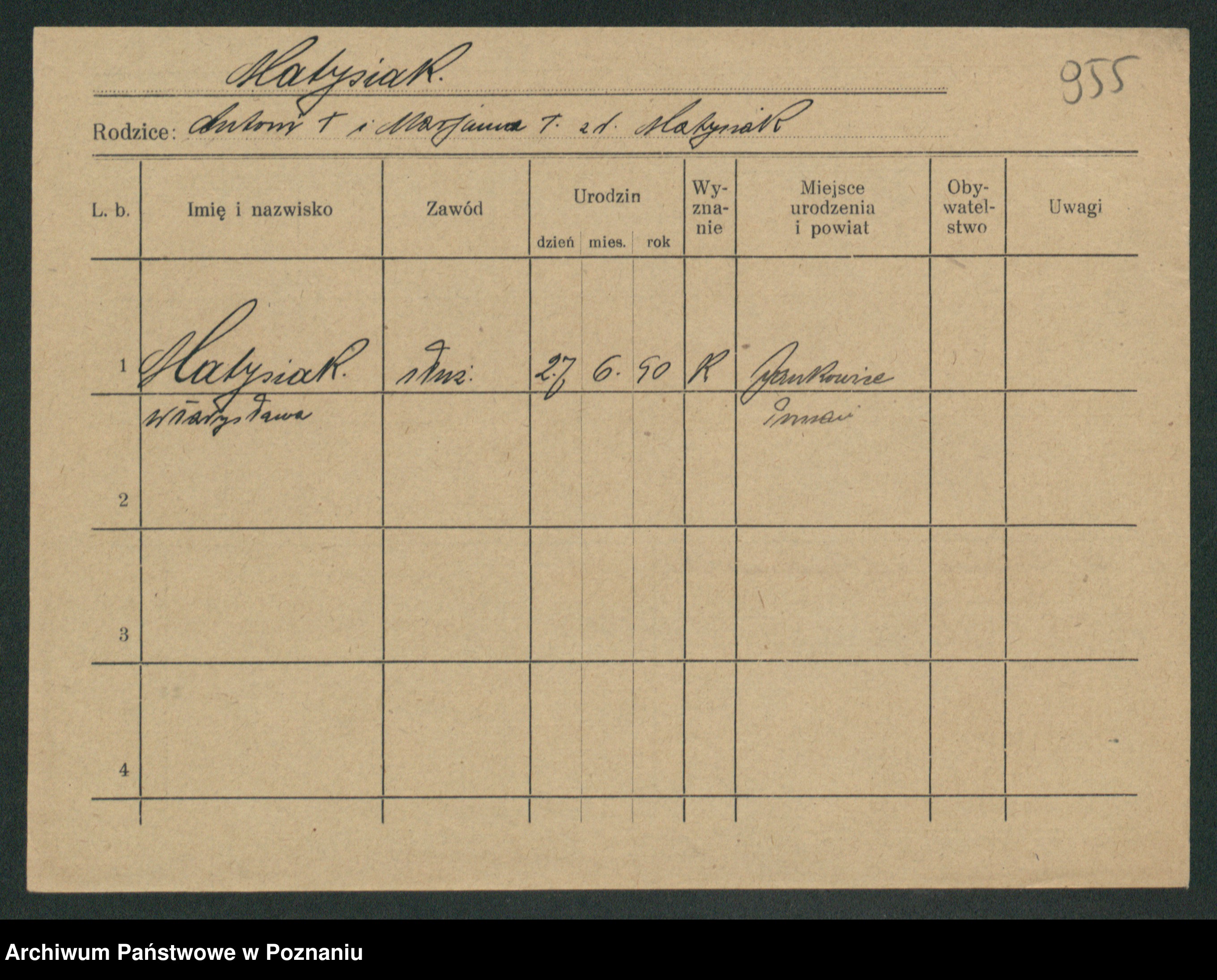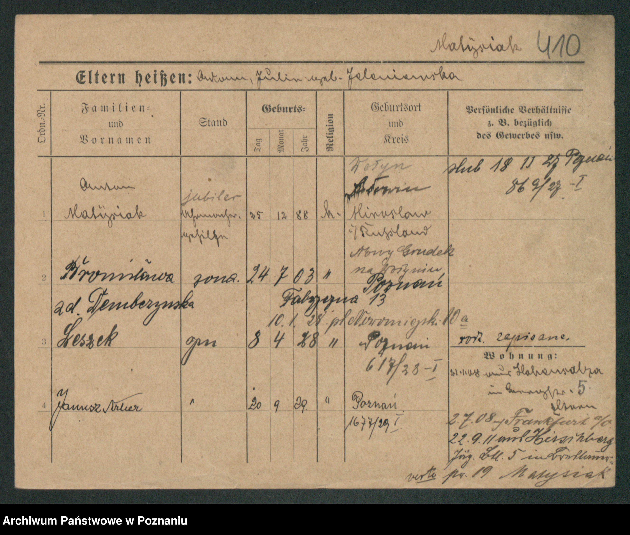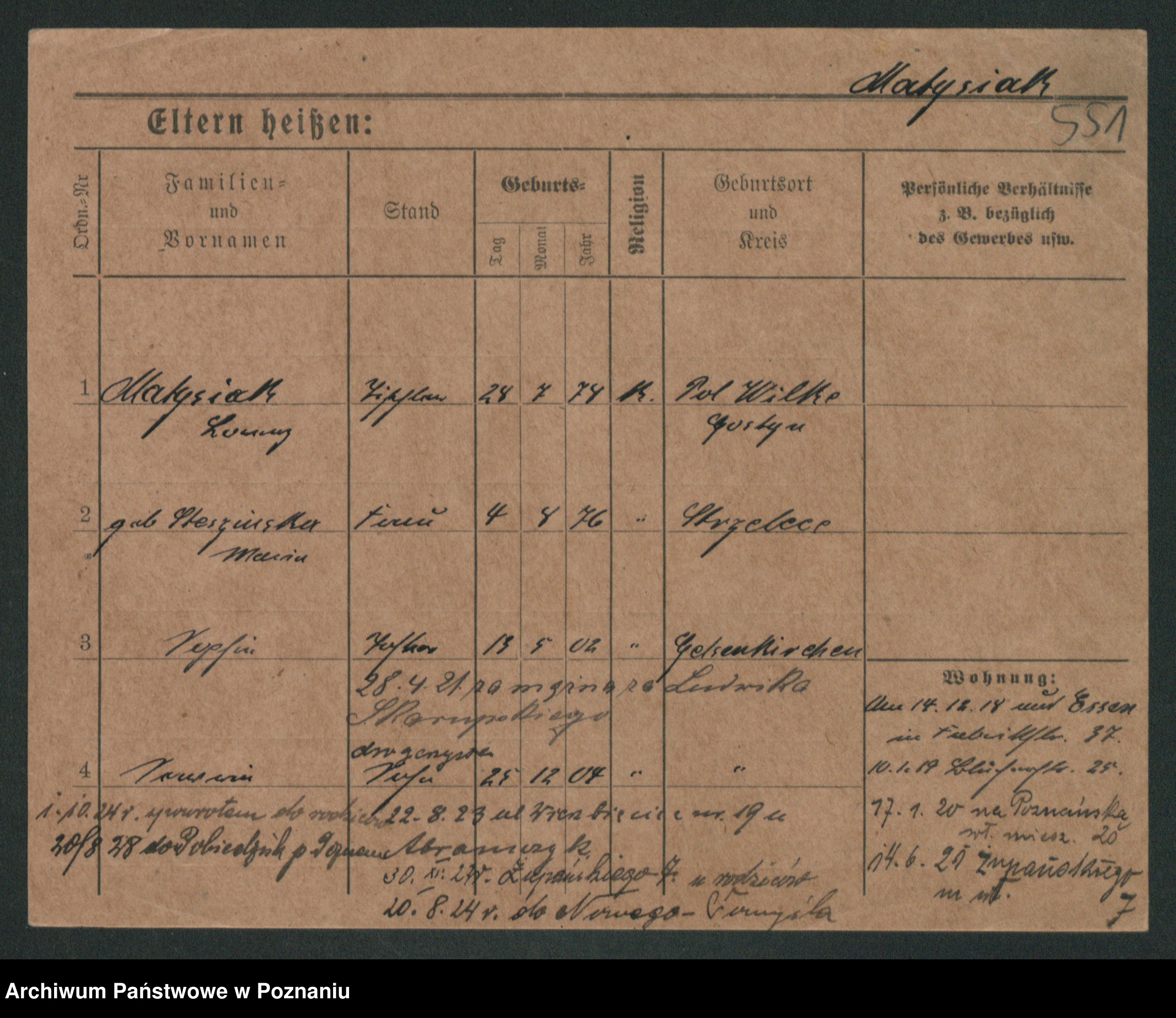 Podgląd karty osobowej dostępny jest po kliknięciu na nazwisko lub ikonkę karty. Można dokonywać powiększenia (ikony na górze) lub przechodzić między kolejnymi skanami (strzałki po bokach).