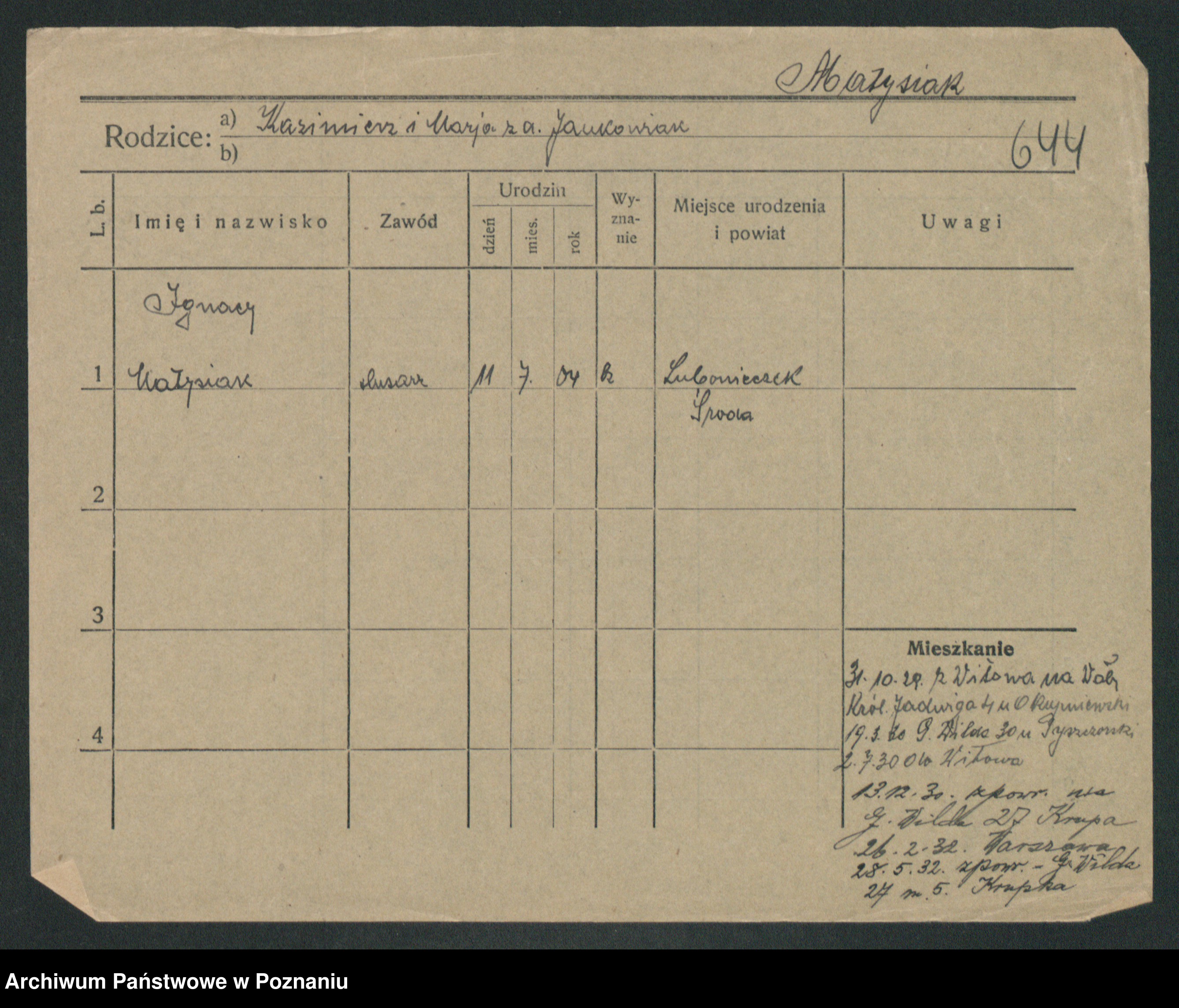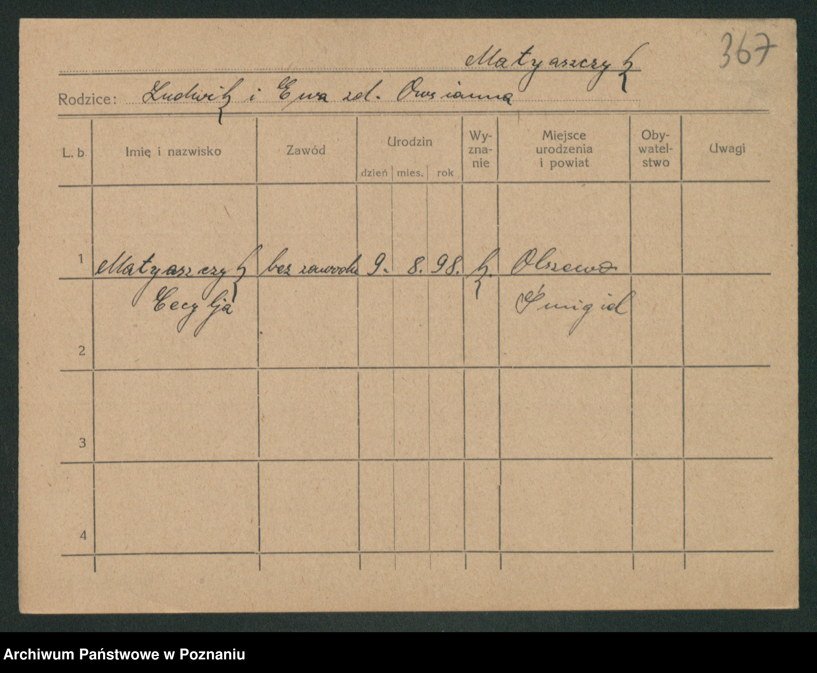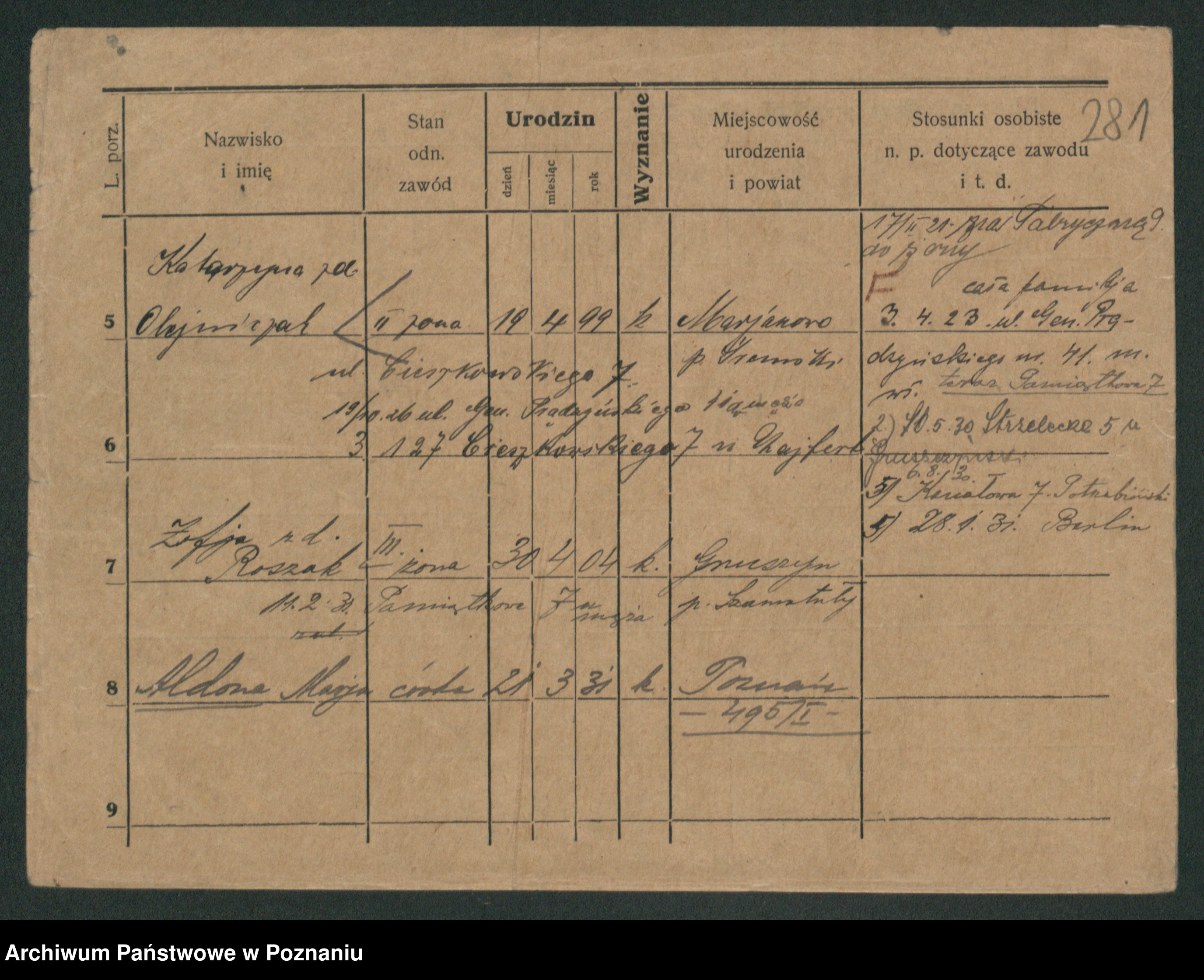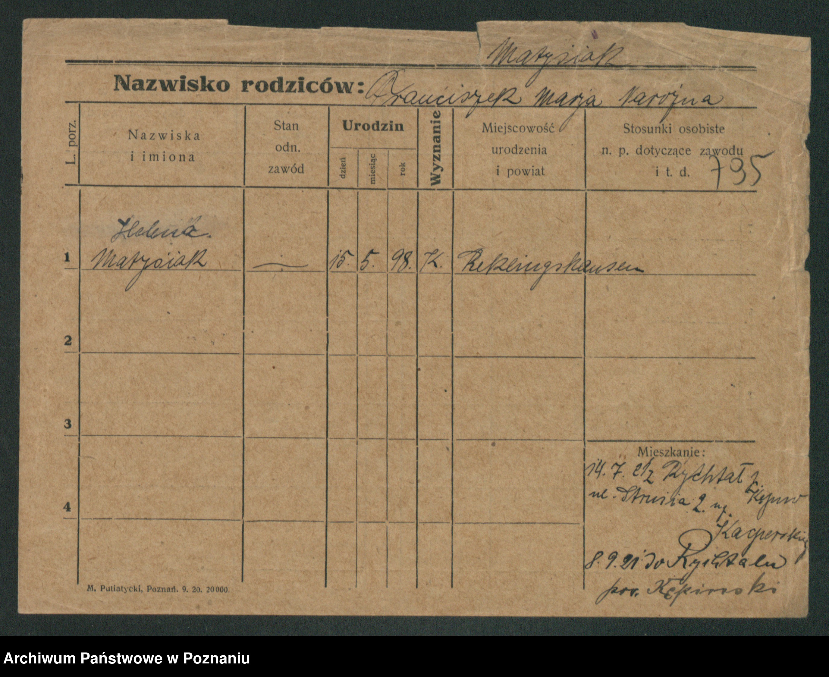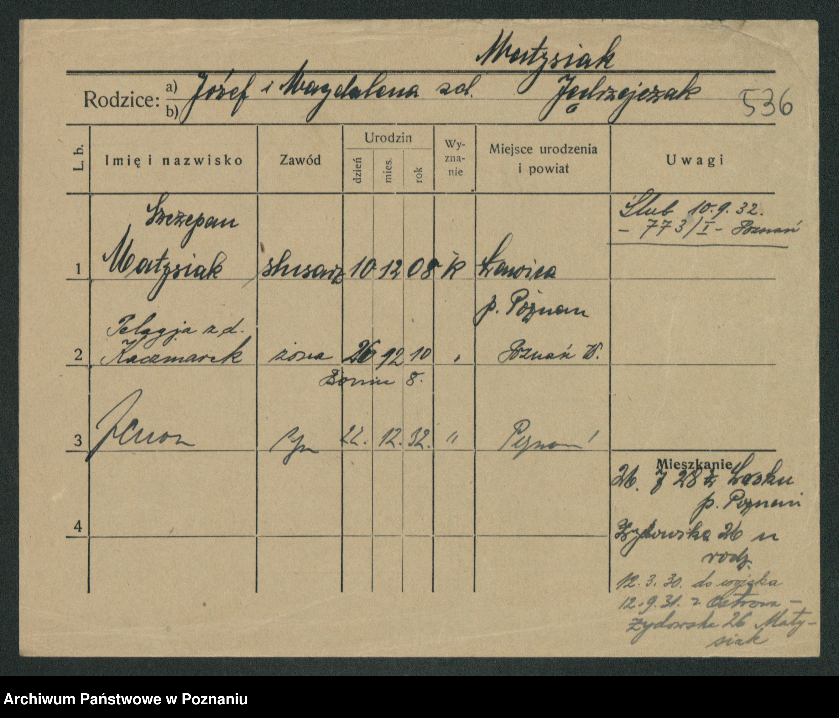 Podgląd karty osobowej dostępny jest po kliknięciu na nazwisko lub ikonkę karty. Można dokonywać powiększenia (ikony na górze) lub przechodzić między kolejnymi skanami (strzałki po bokach).