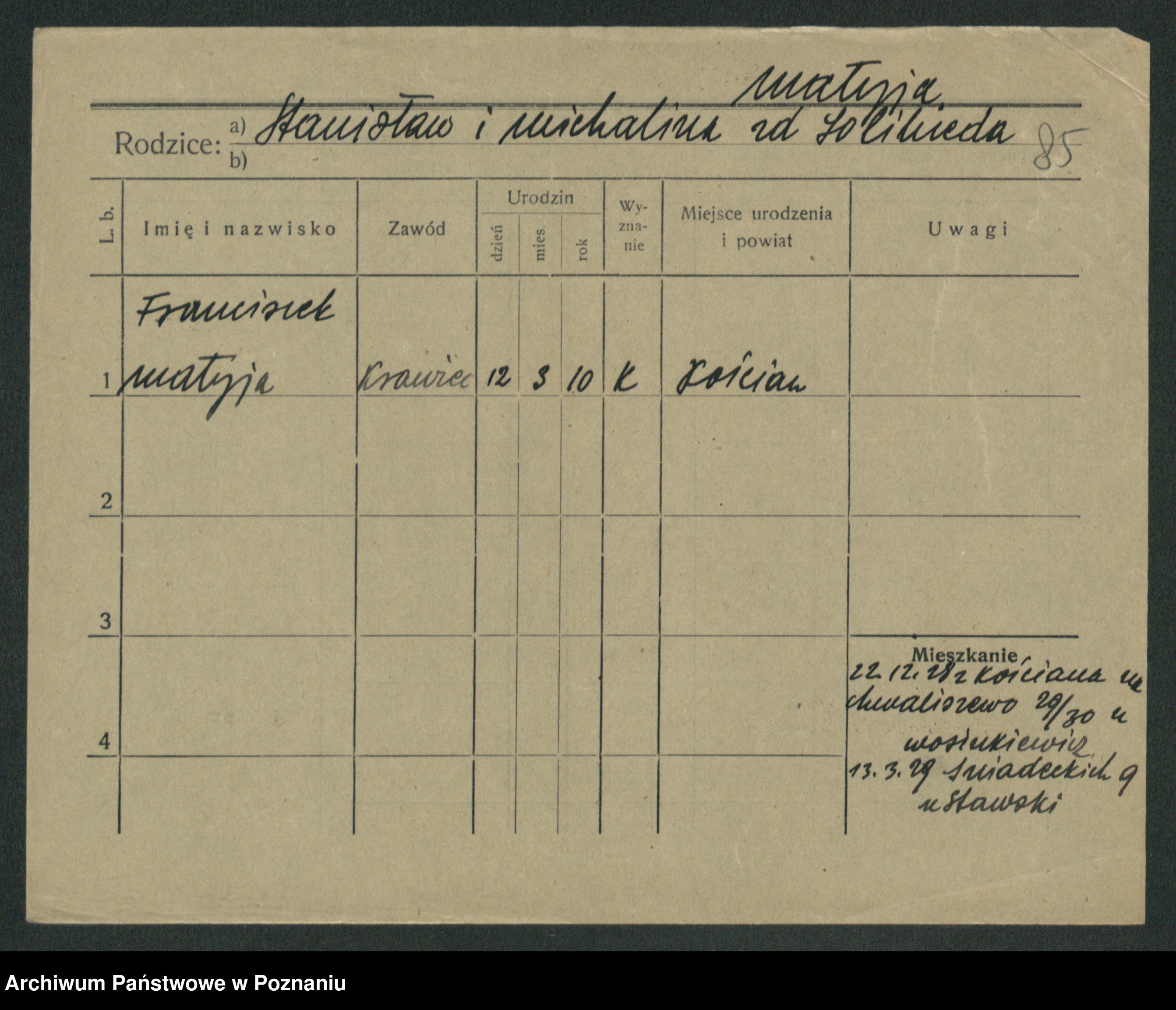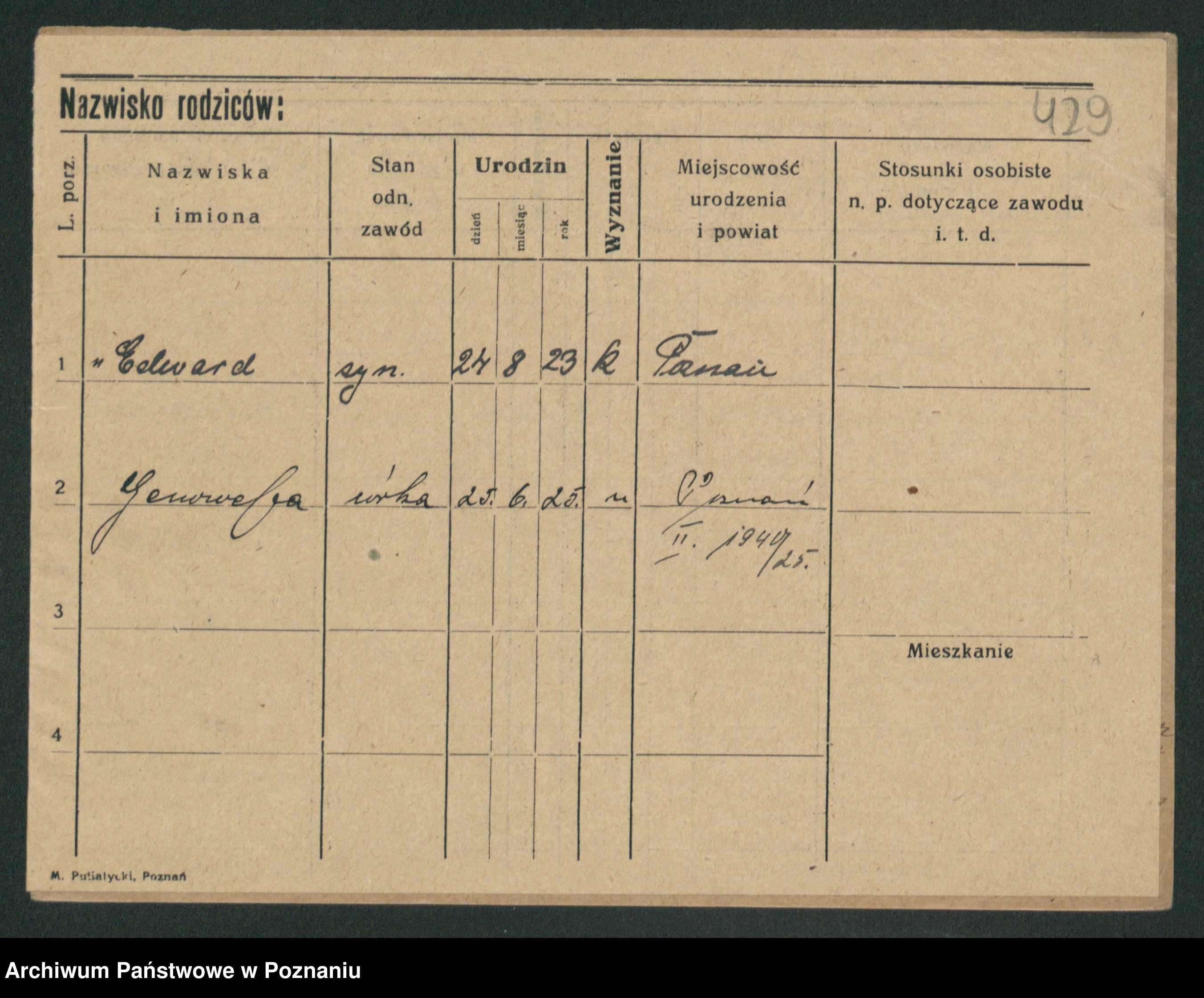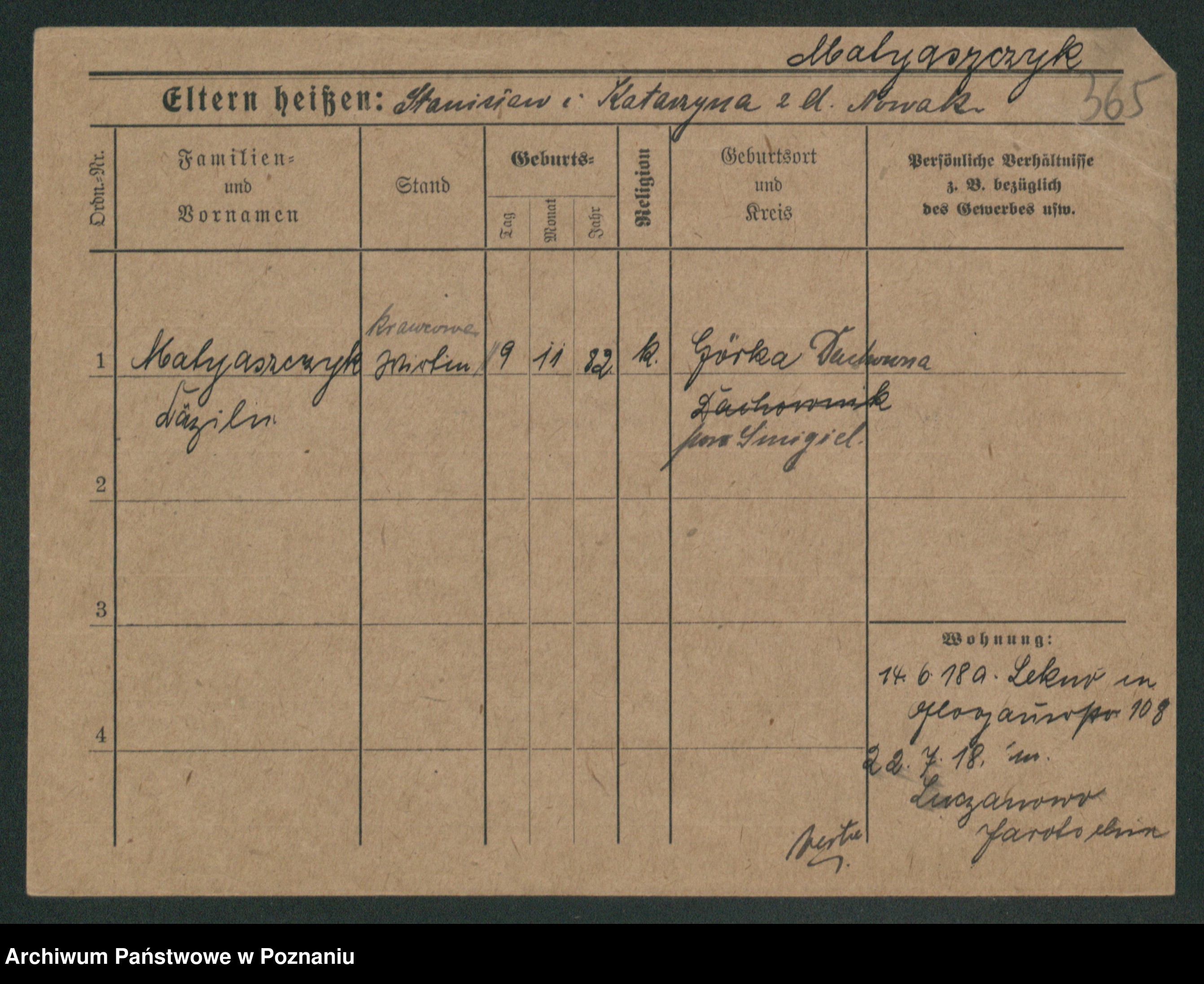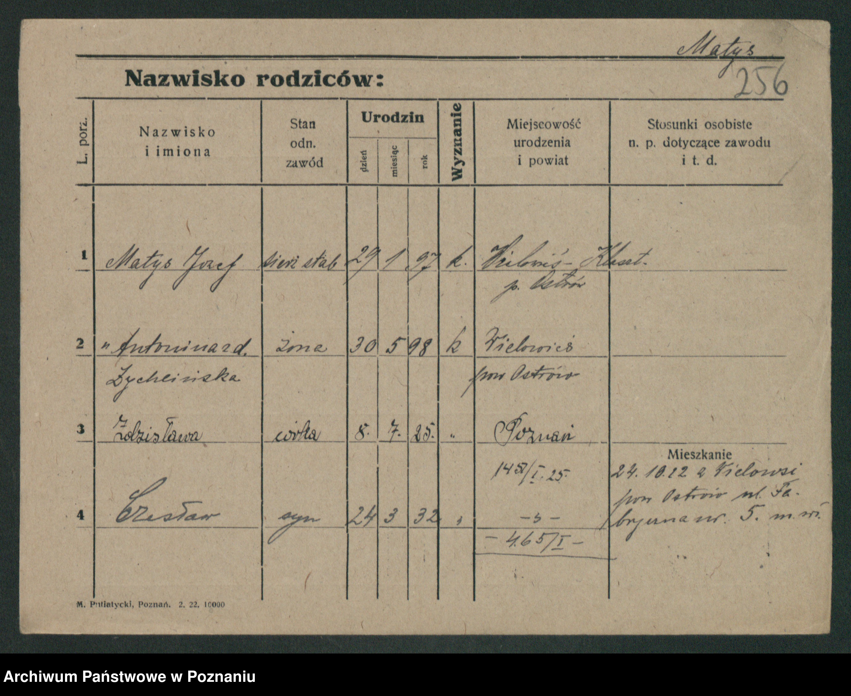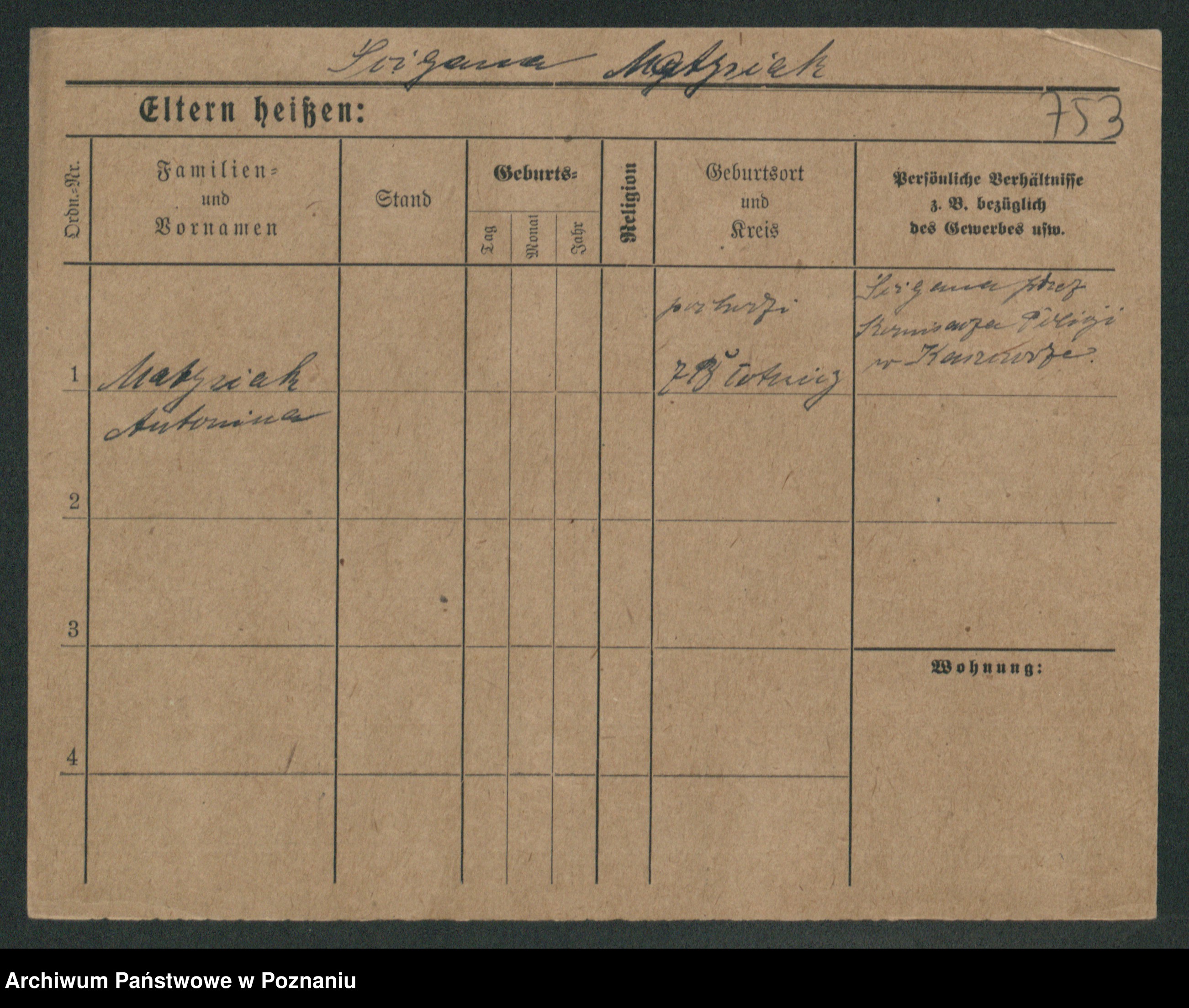 Podgląd karty osobowej dostępny jest po kliknięciu na nazwisko lub ikonkę karty. Można dokonywać powiększenia (ikony na górze) lub przechodzić między kolejnymi skanami (strzałki po bokach).
