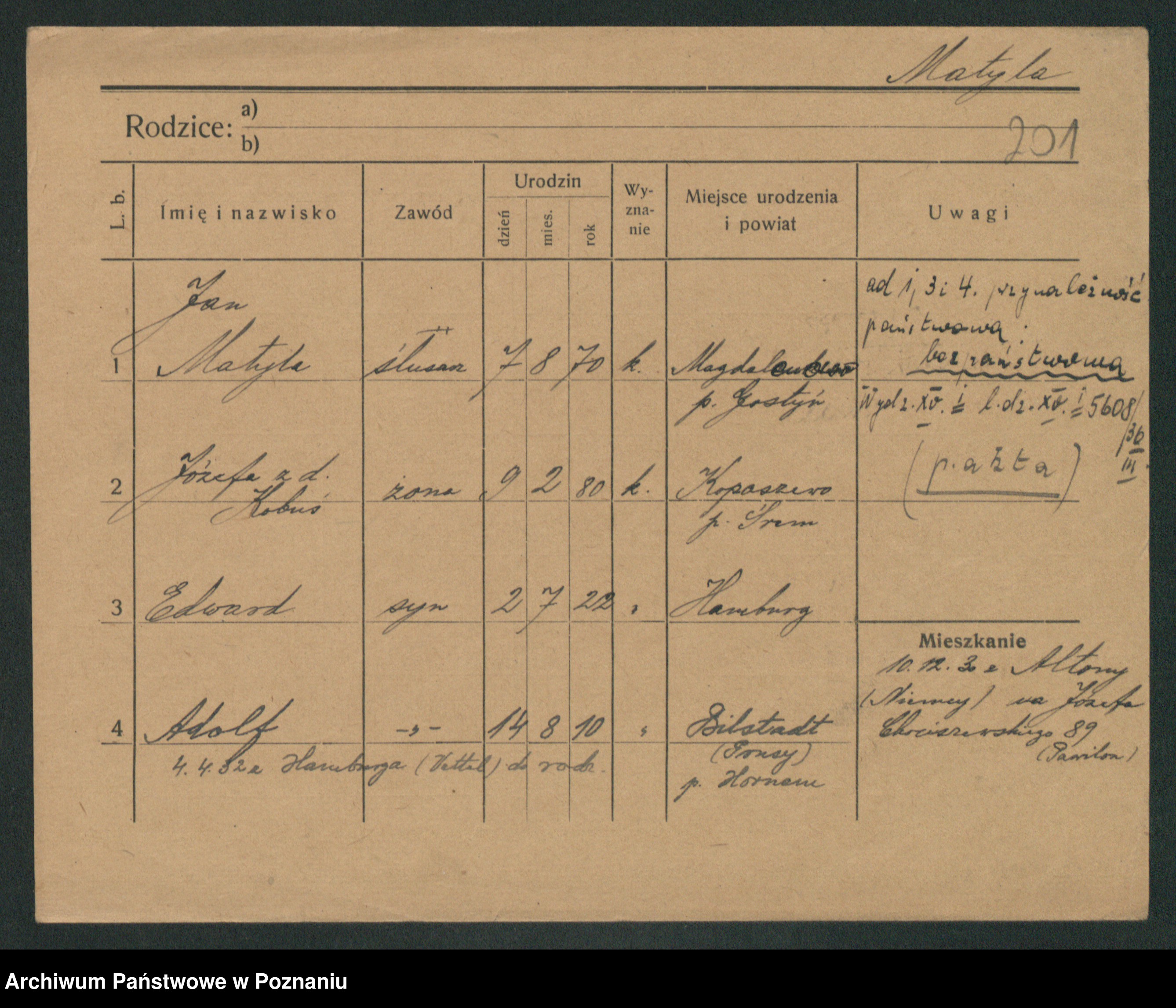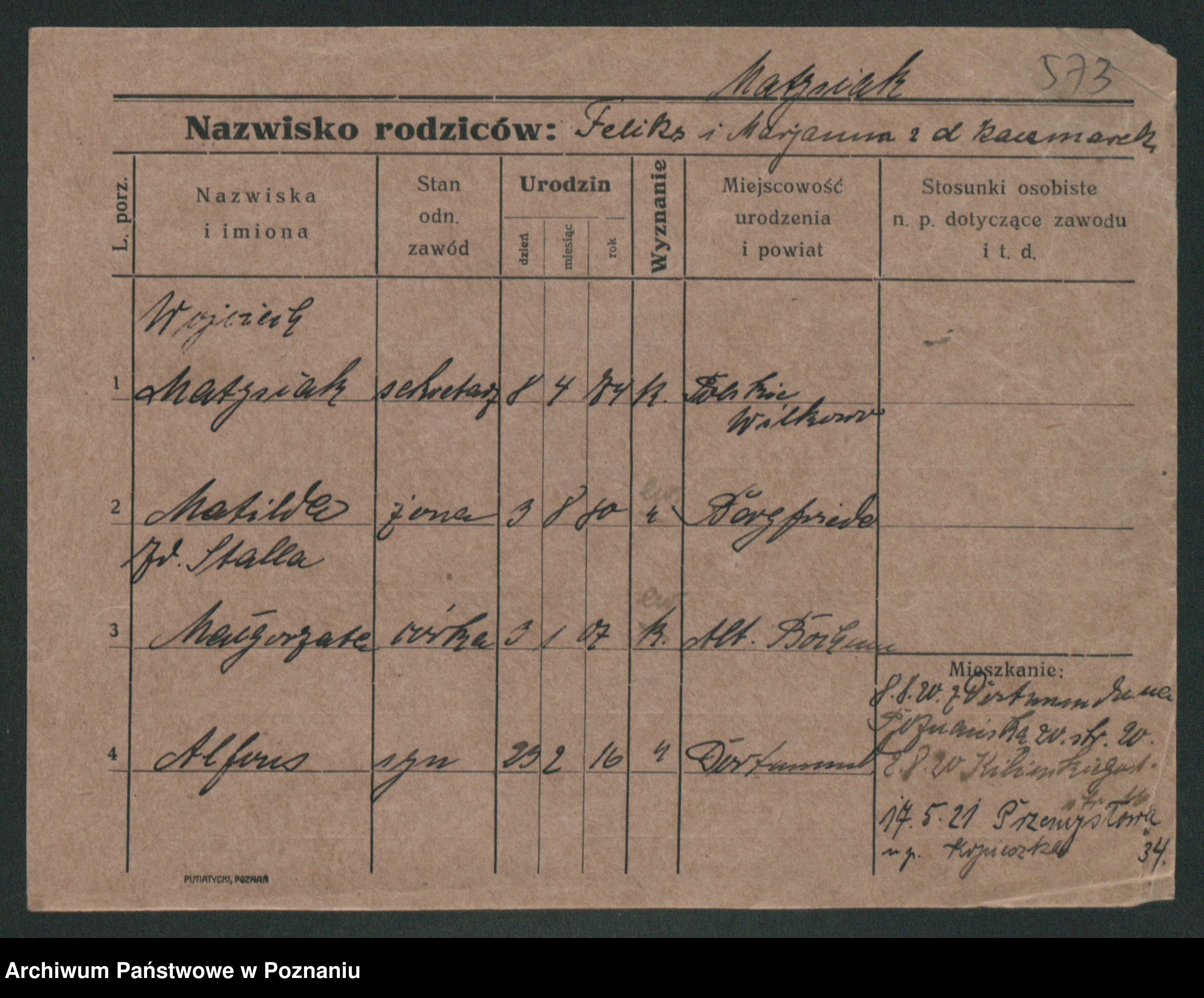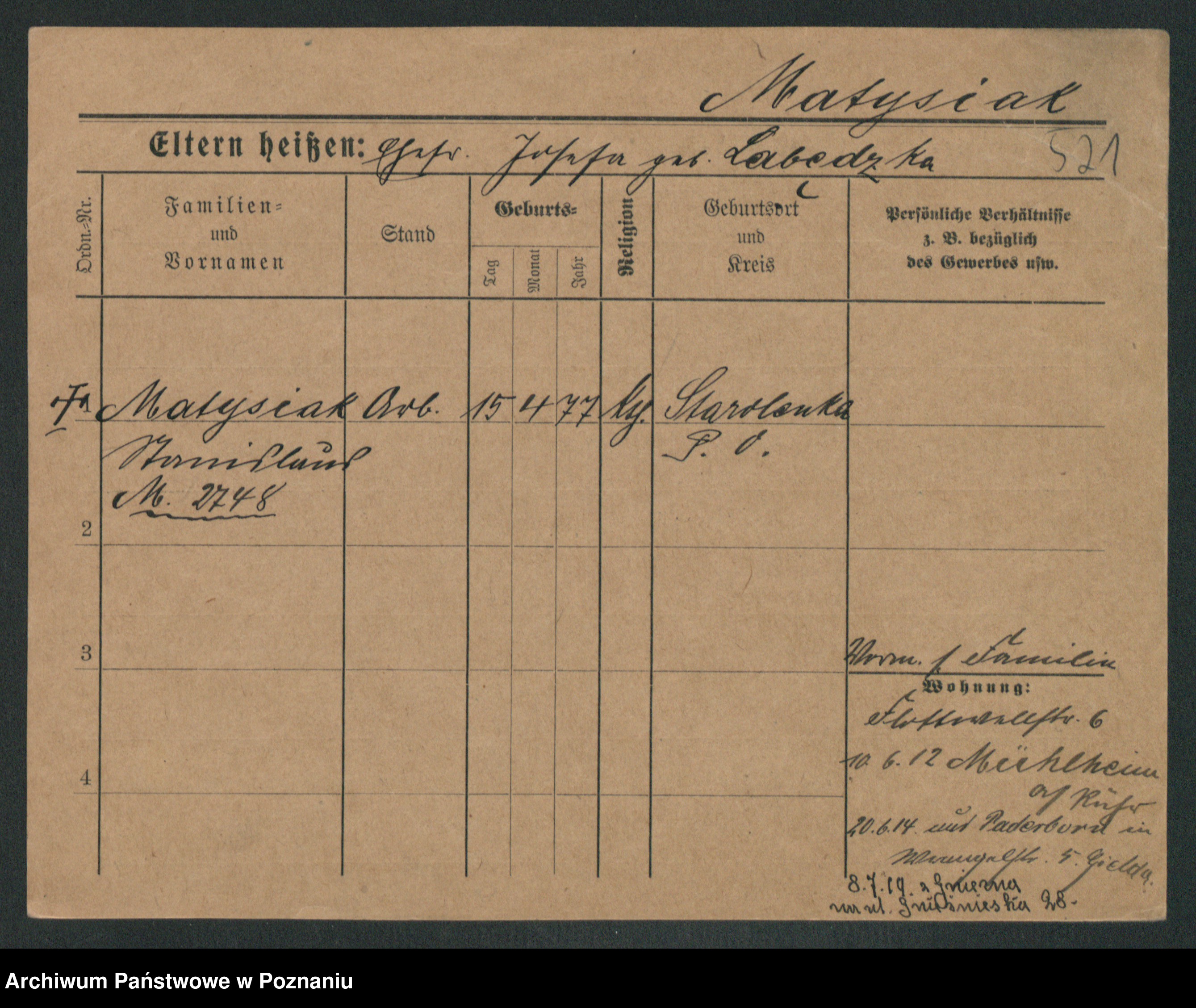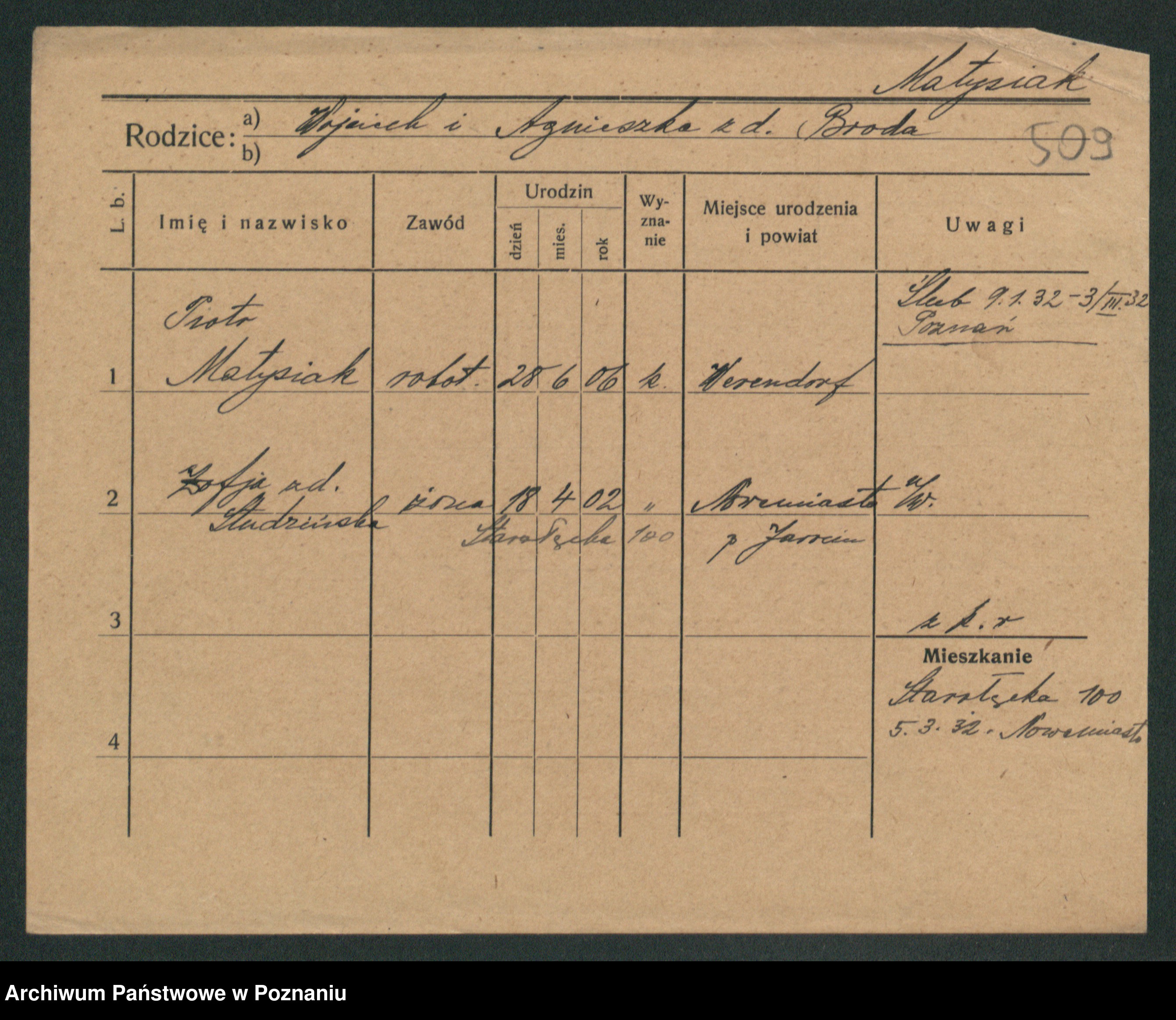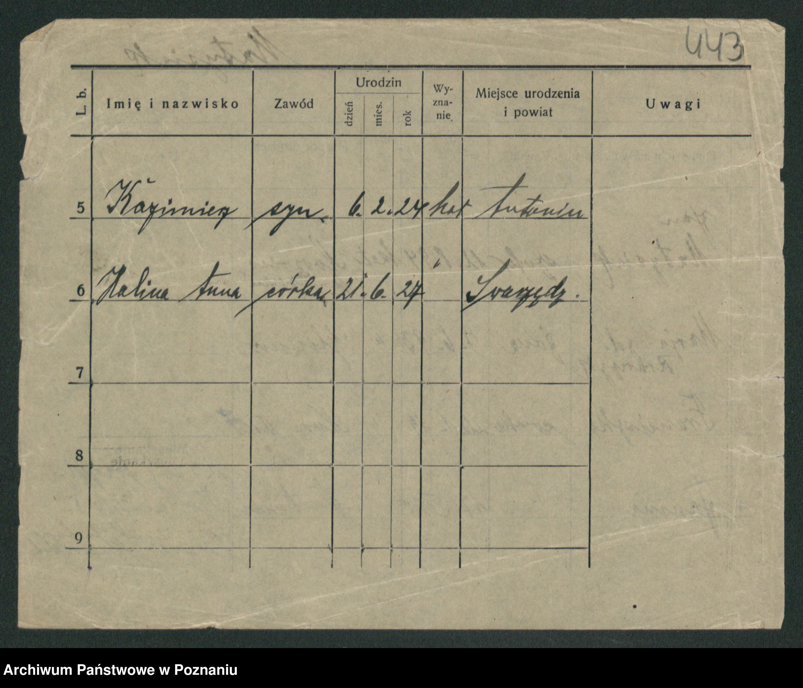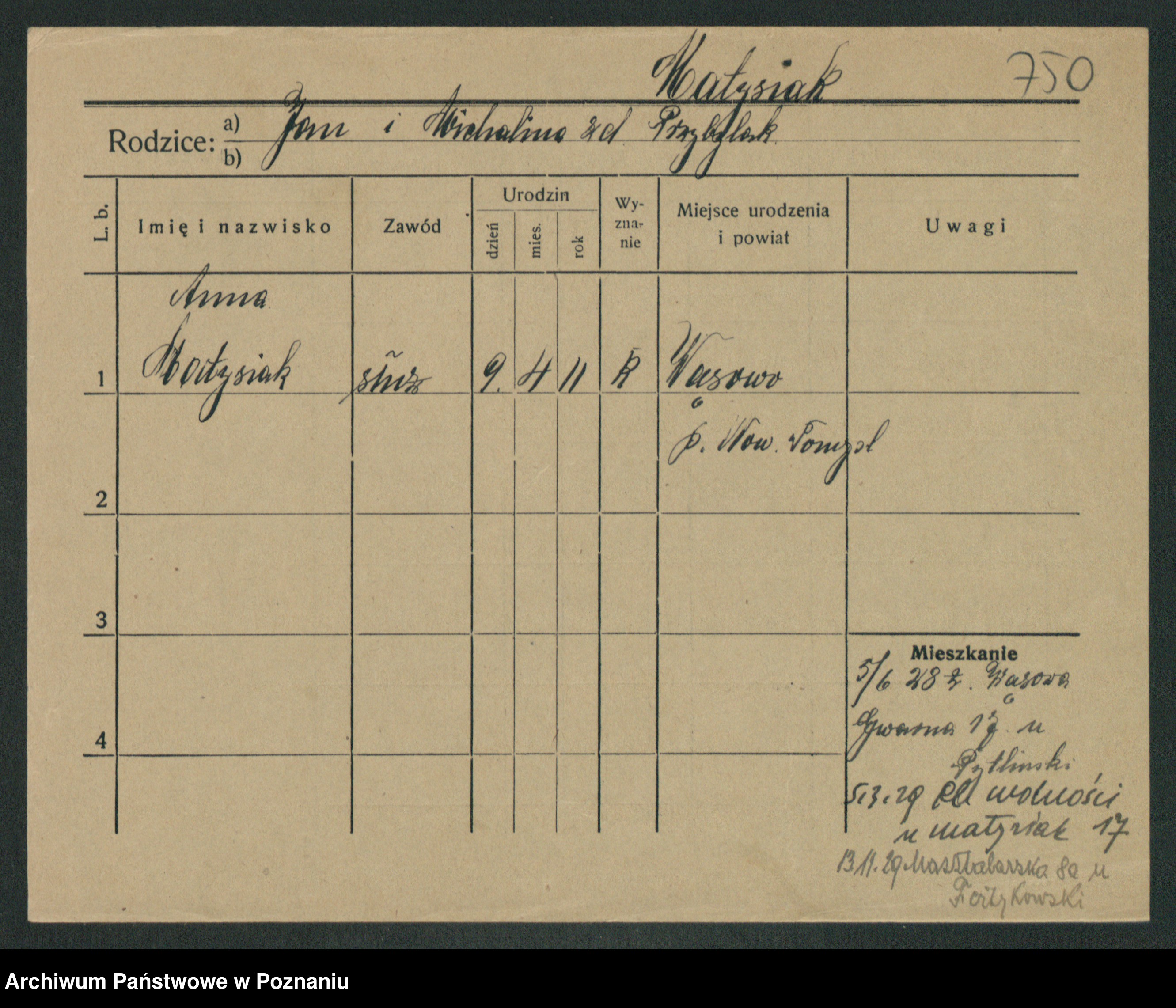 Podgląd karty osobowej dostępny jest po kliknięciu na nazwisko lub ikonkę karty. Można dokonywać powiększenia (ikony na górze) lub przechodzić między kolejnymi skanami (strzałki po bokach).