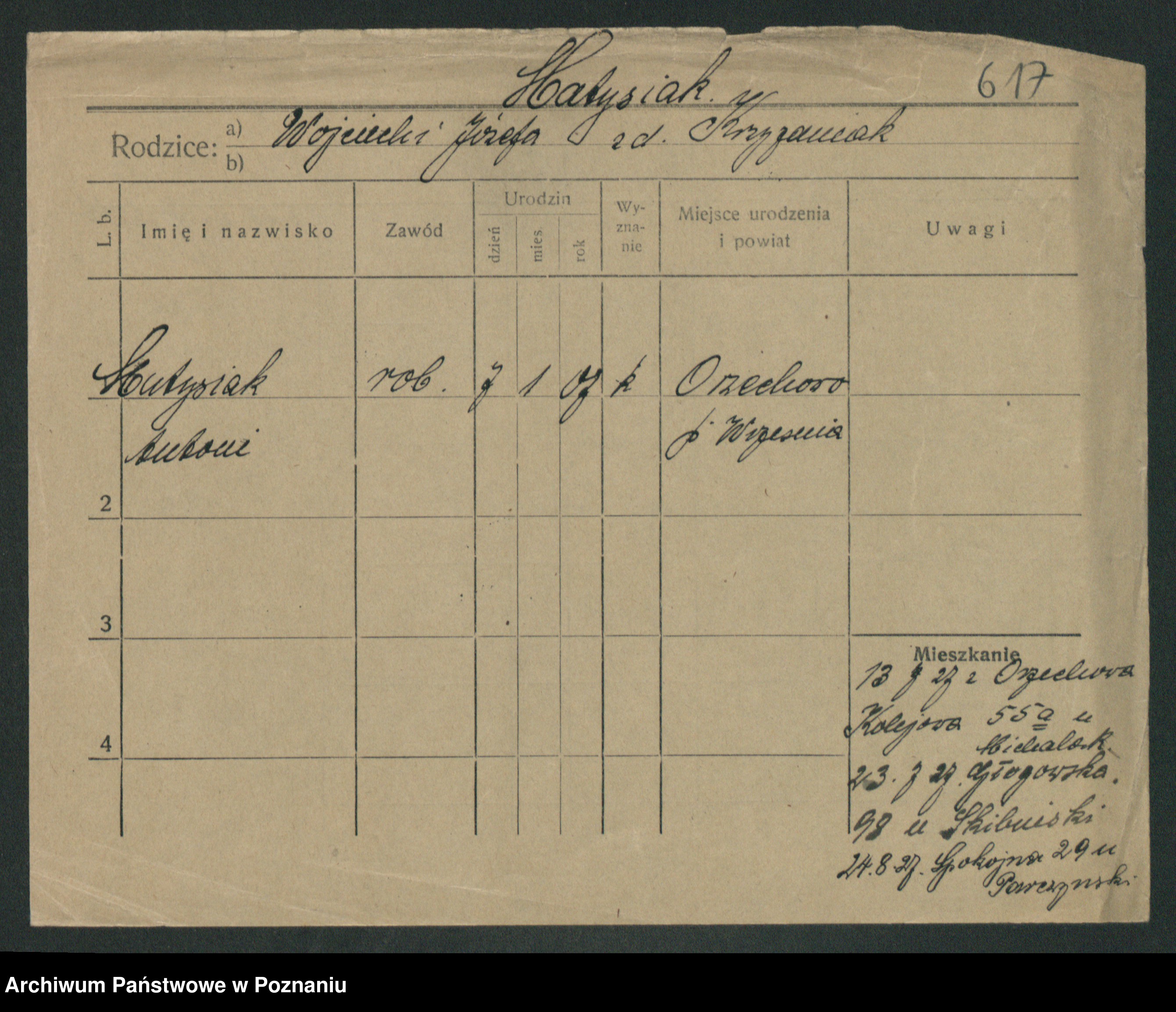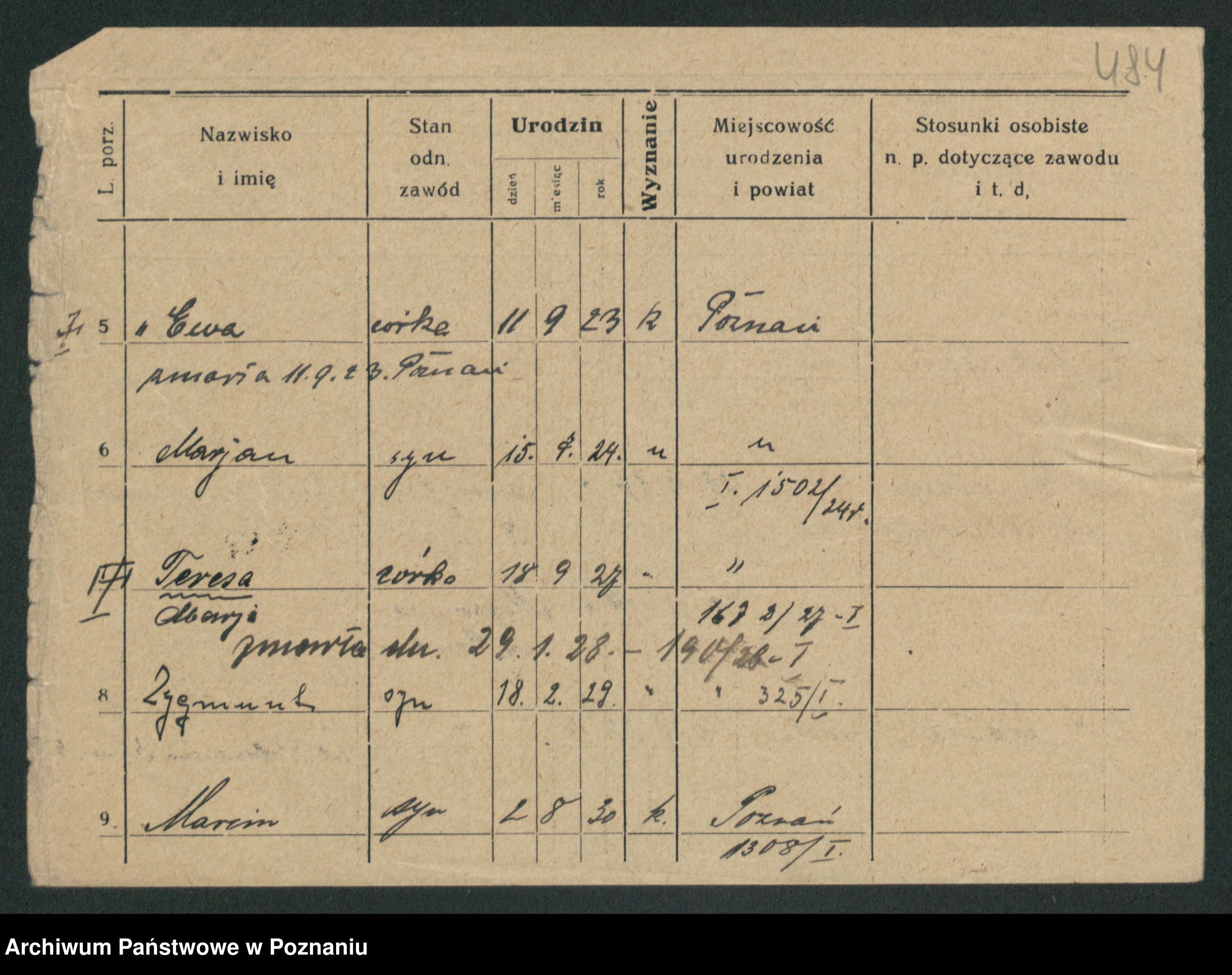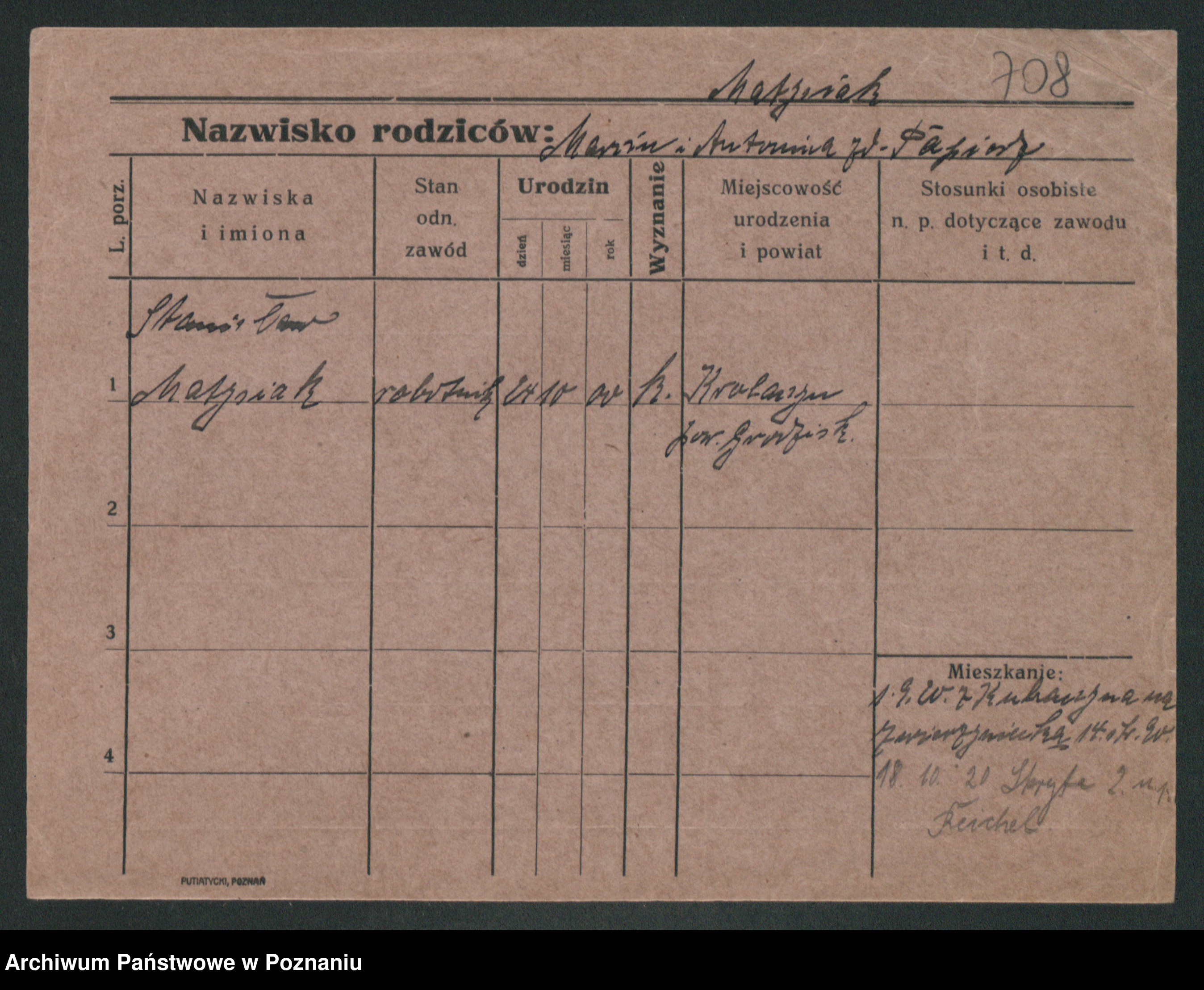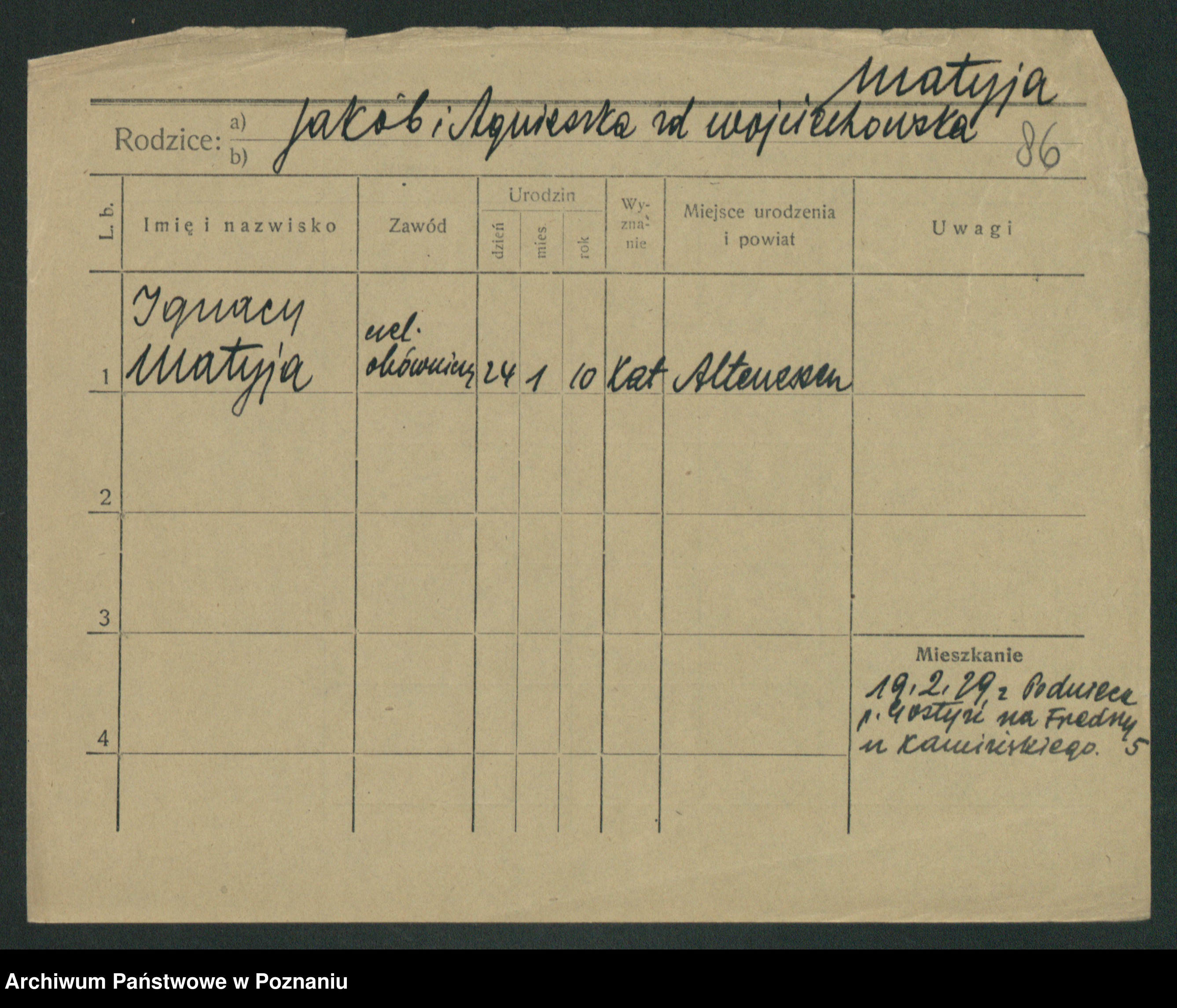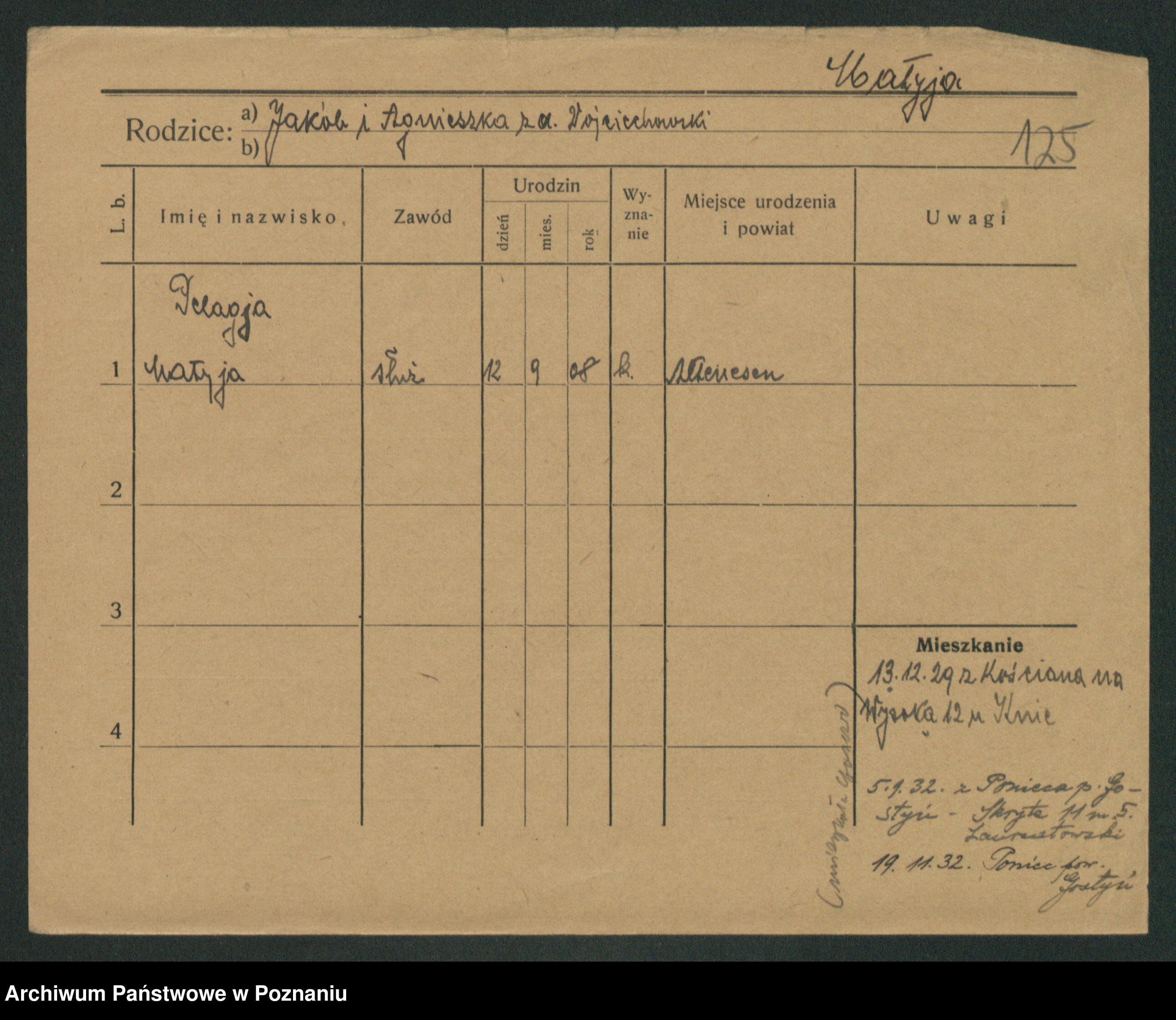 Podgląd karty osobowej dostępny jest po kliknięciu na nazwisko lub ikonkę karty. Można dokonywać powiększenia (ikony na górze) lub przechodzić między kolejnymi skanami (strzałki po bokach).