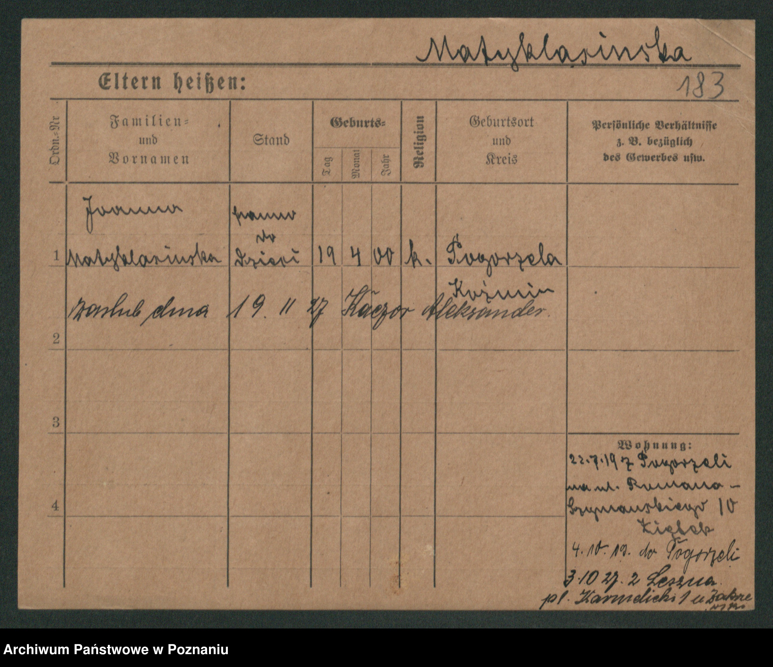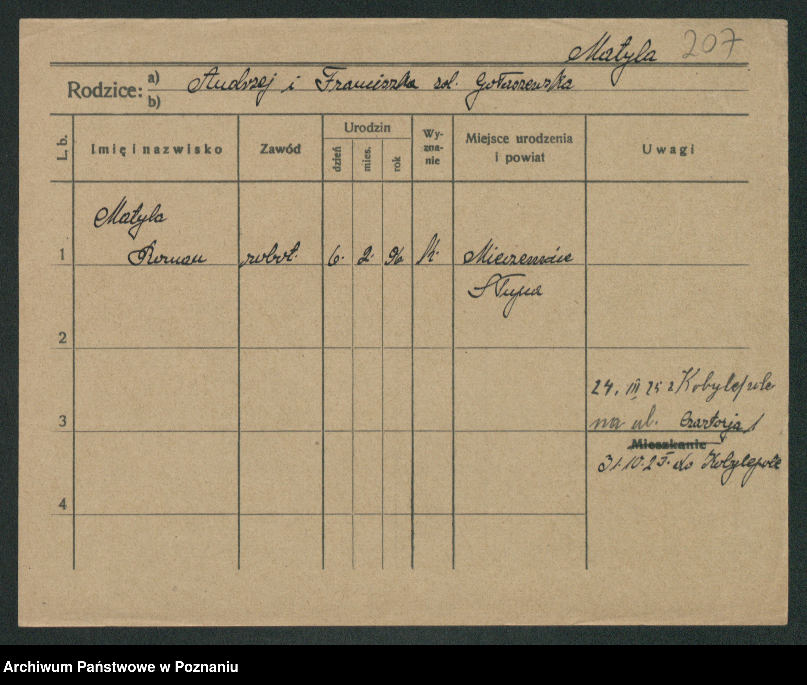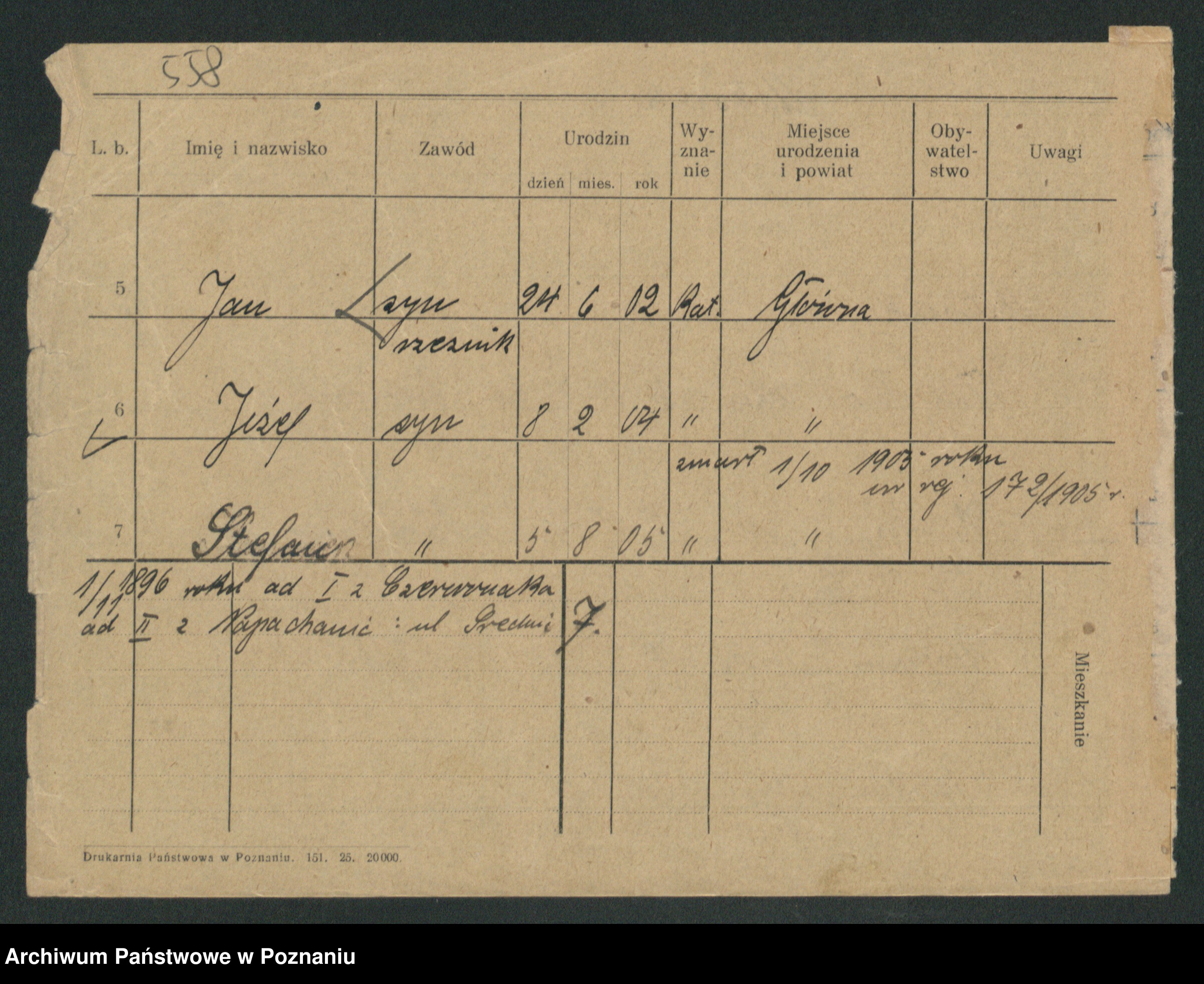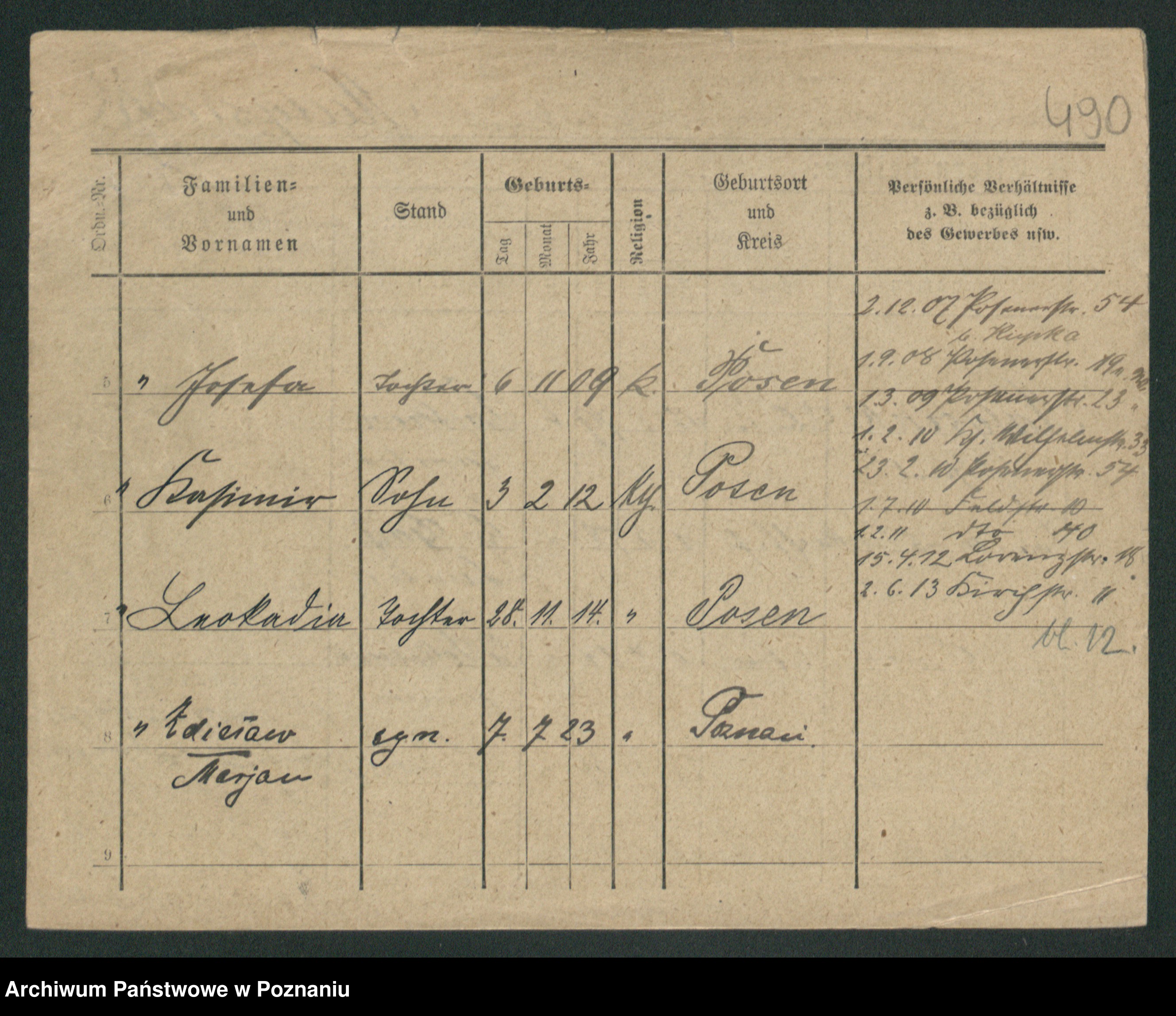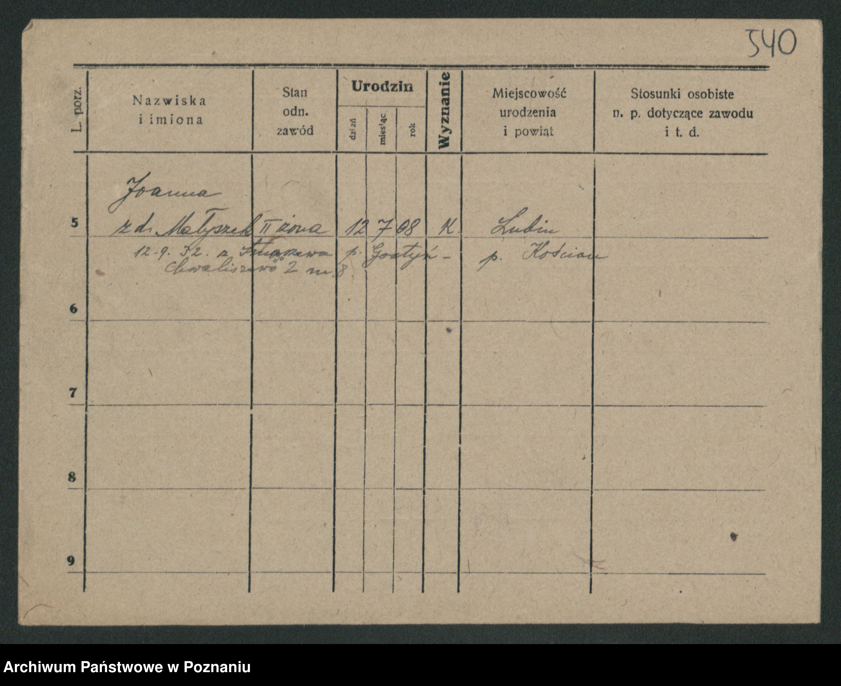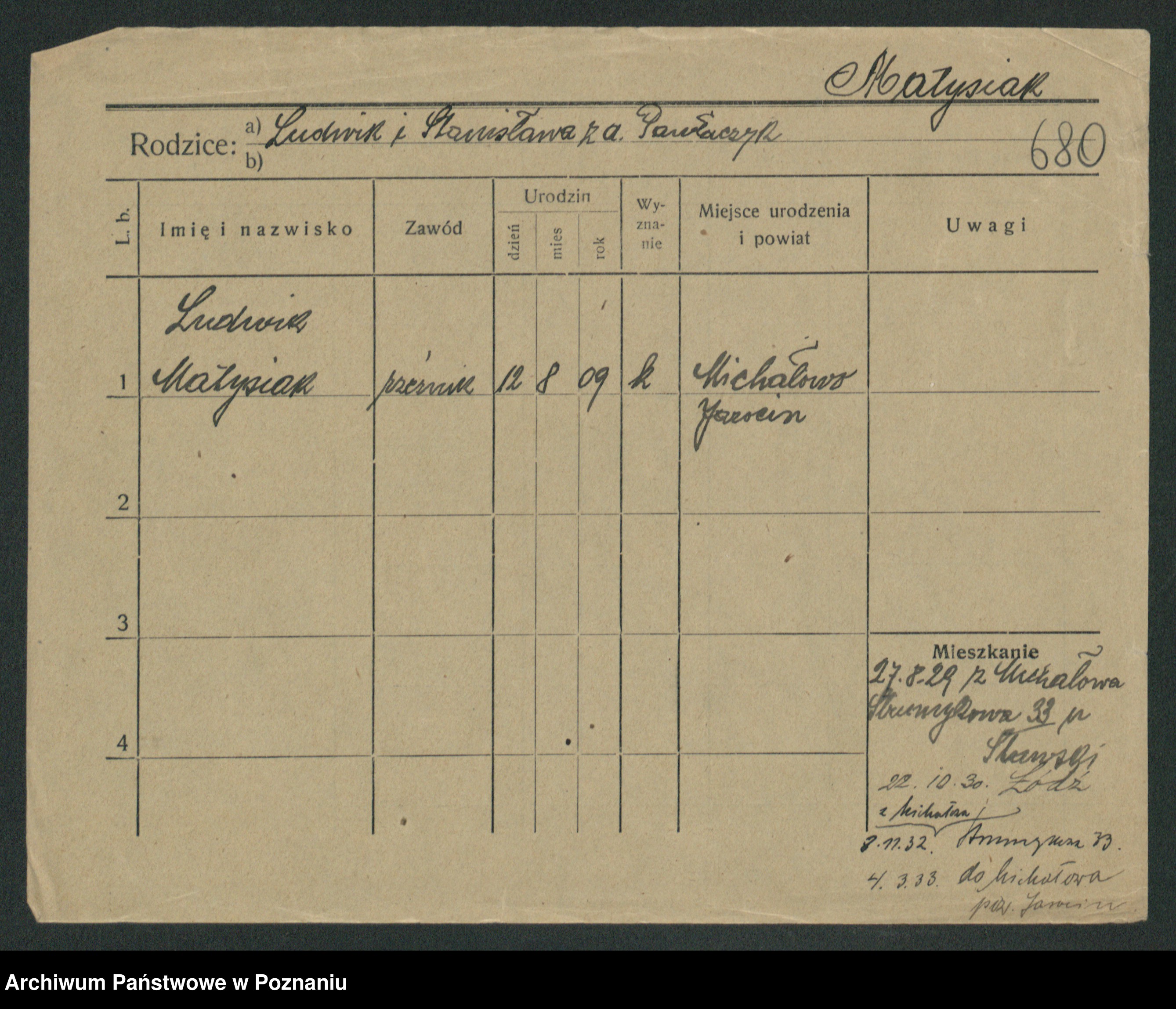 Podgląd karty osobowej dostępny jest po kliknięciu na nazwisko lub ikonkę karty. Można dokonywać powiększenia (ikony na górze) lub przechodzić między kolejnymi skanami (strzałki po bokach).
