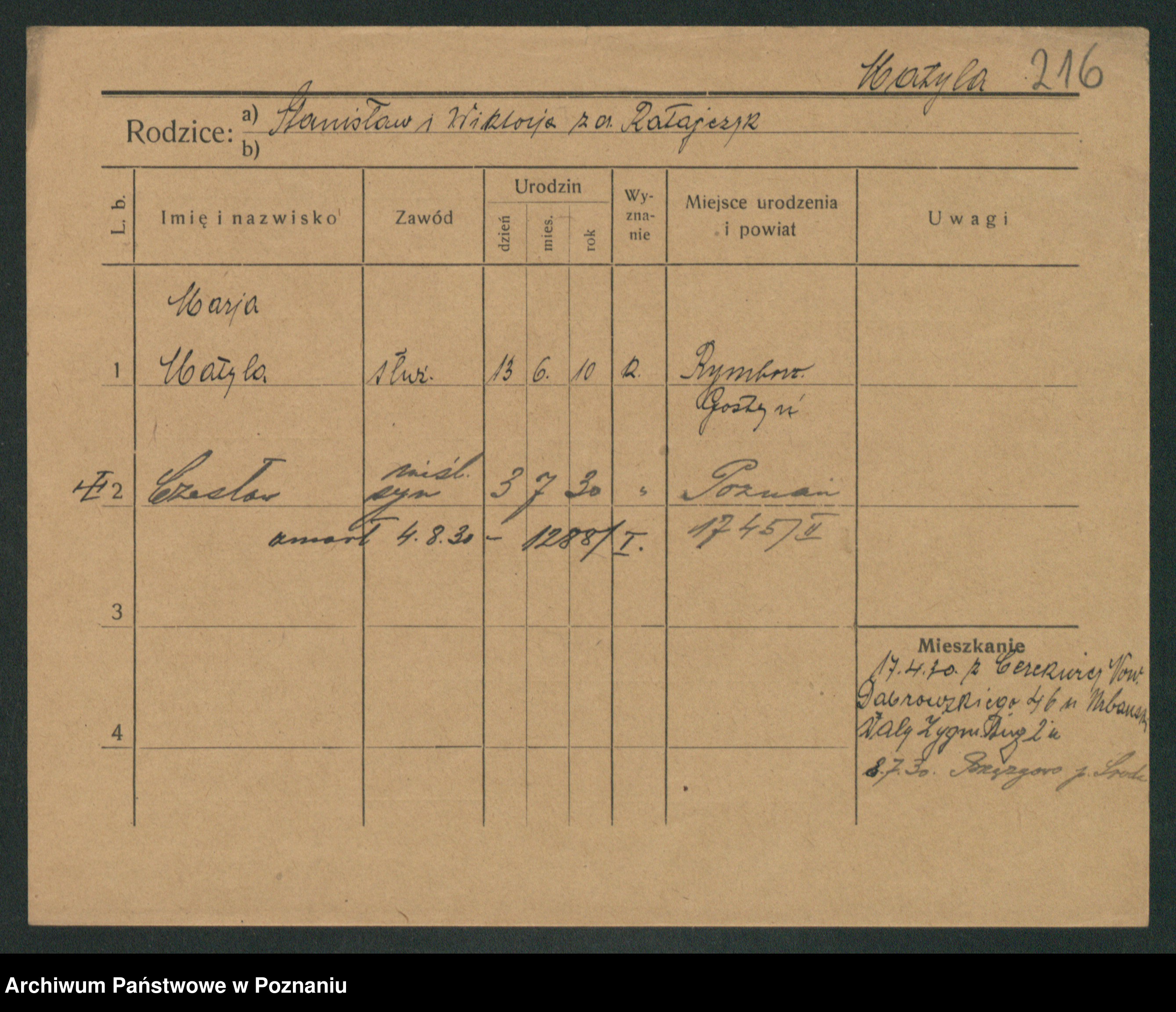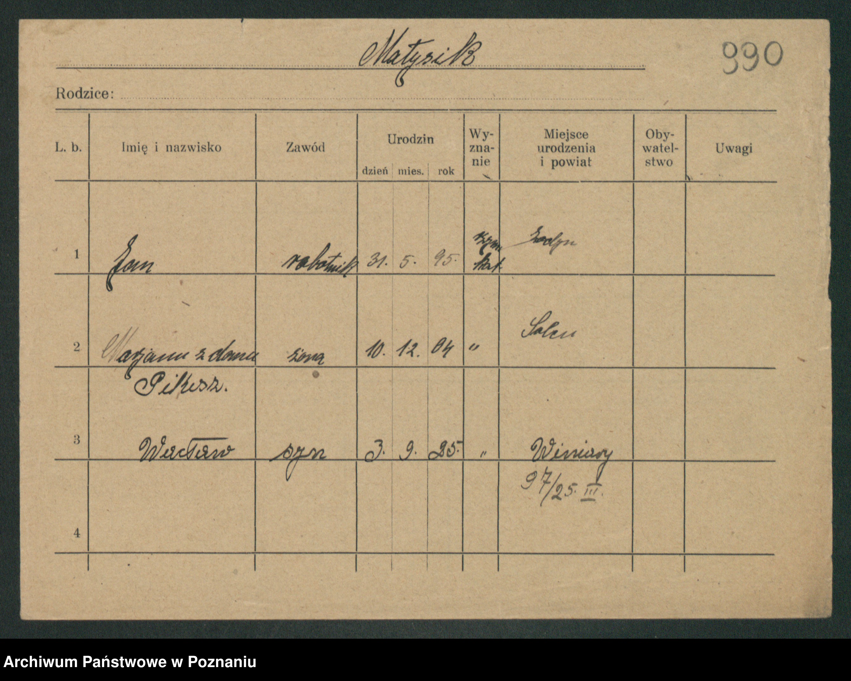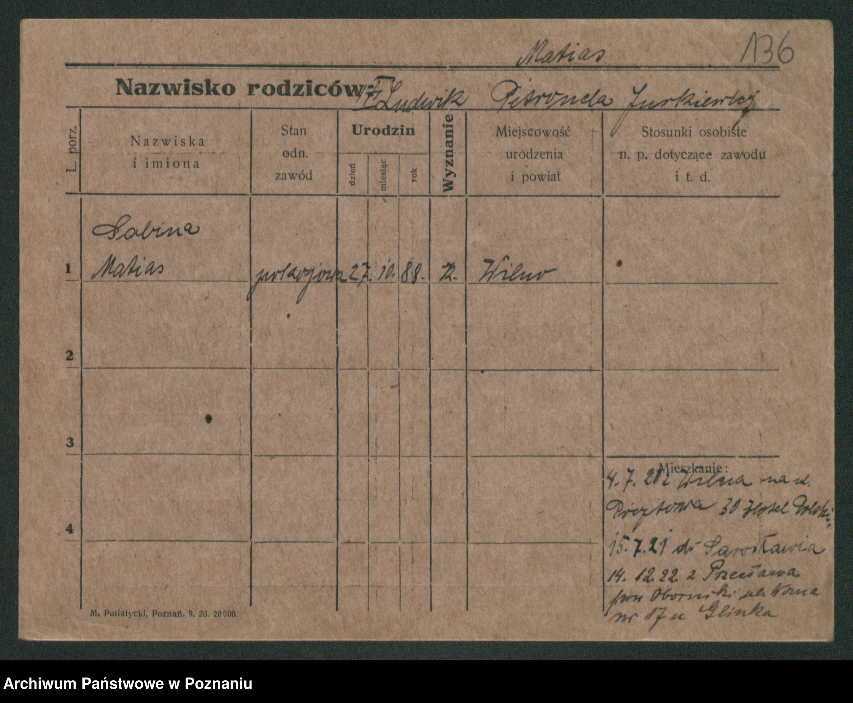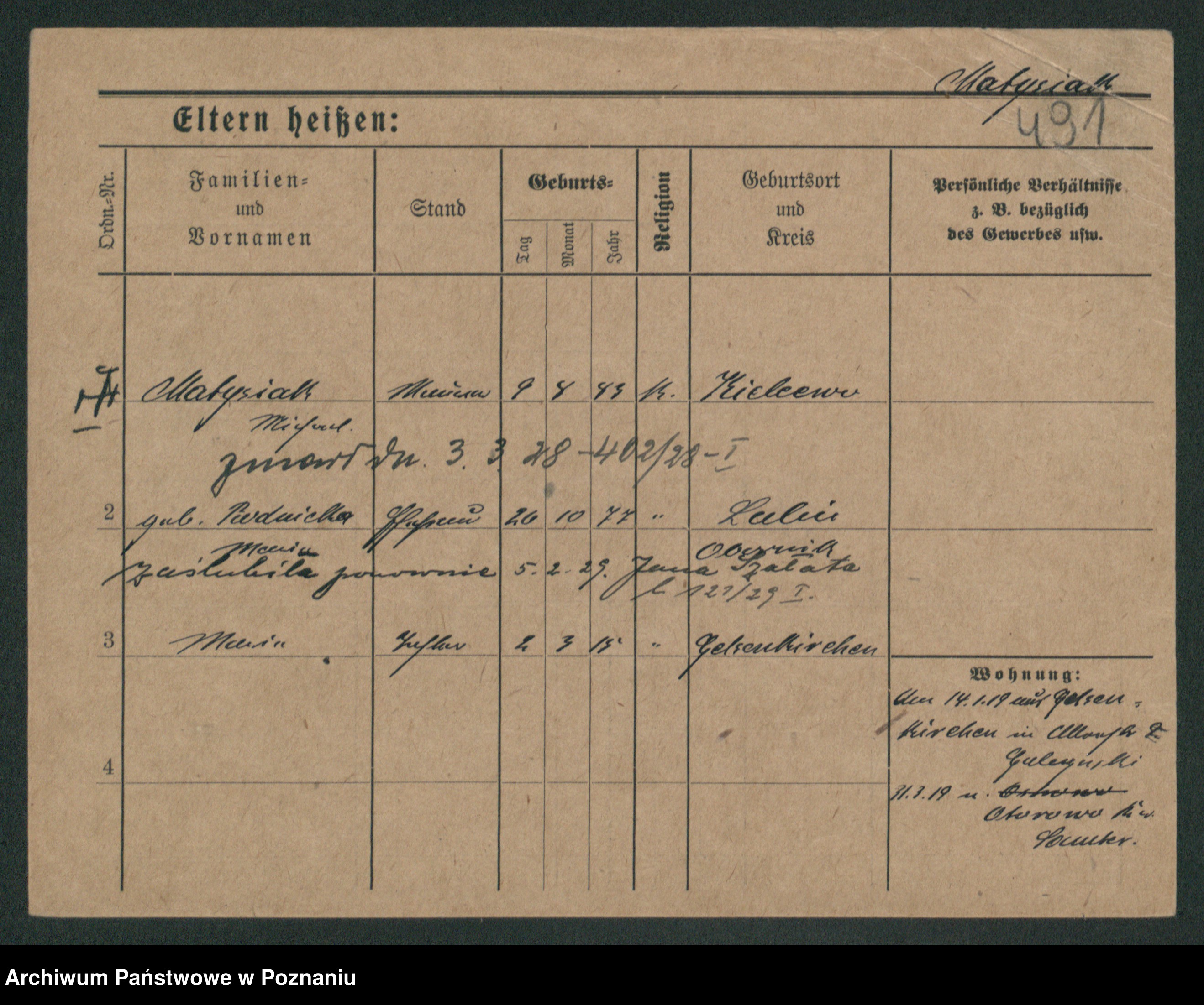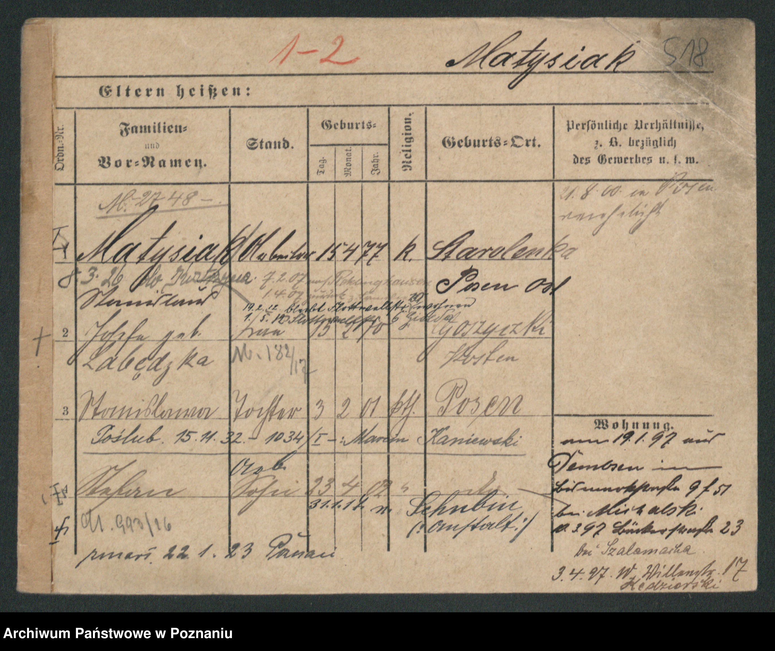 Podgląd karty osobowej dostępny jest po kliknięciu na nazwisko lub ikonkę karty. Można dokonywać powiększenia (ikony na górze) lub przechodzić między kolejnymi skanami (strzałki po bokach).