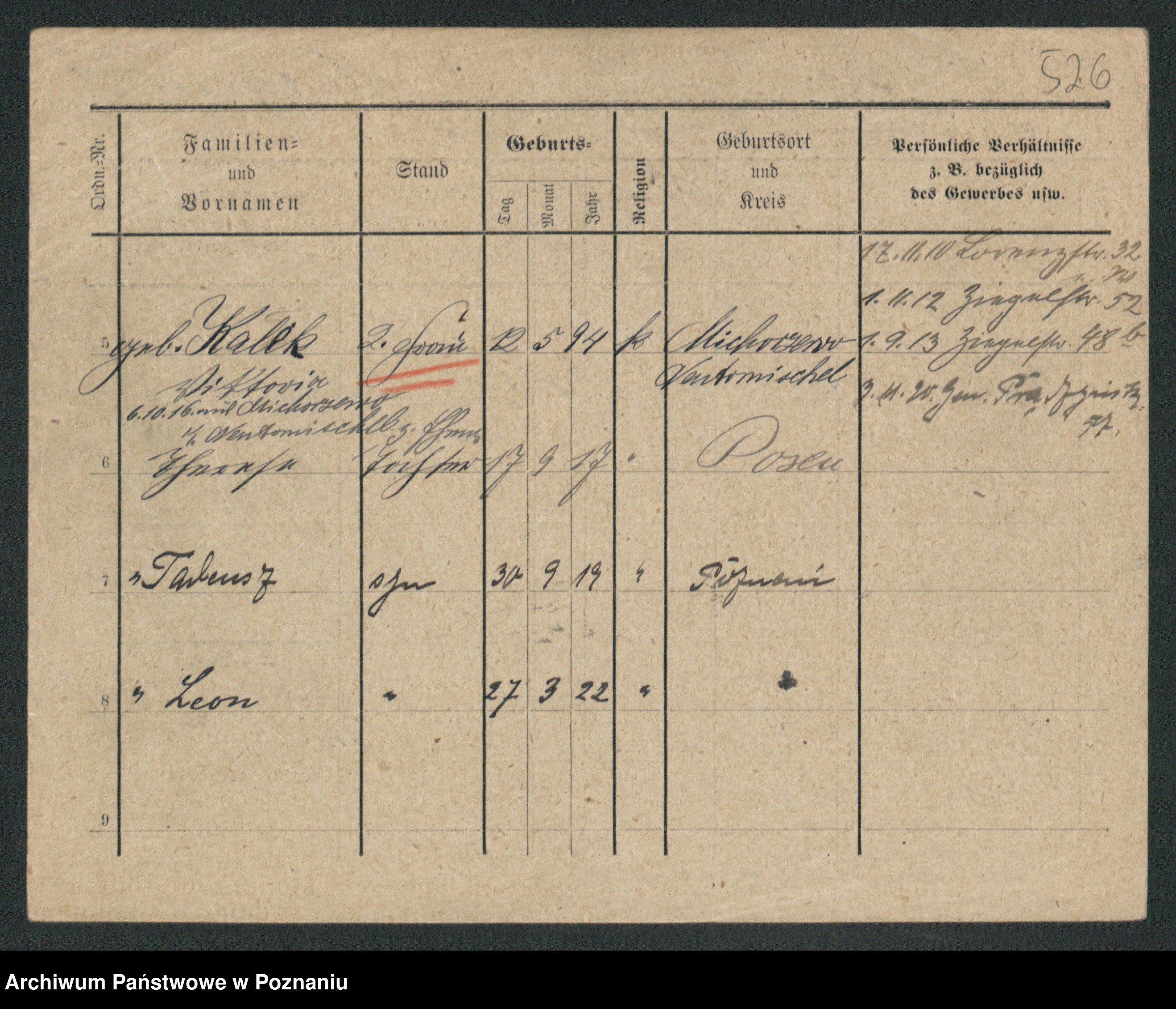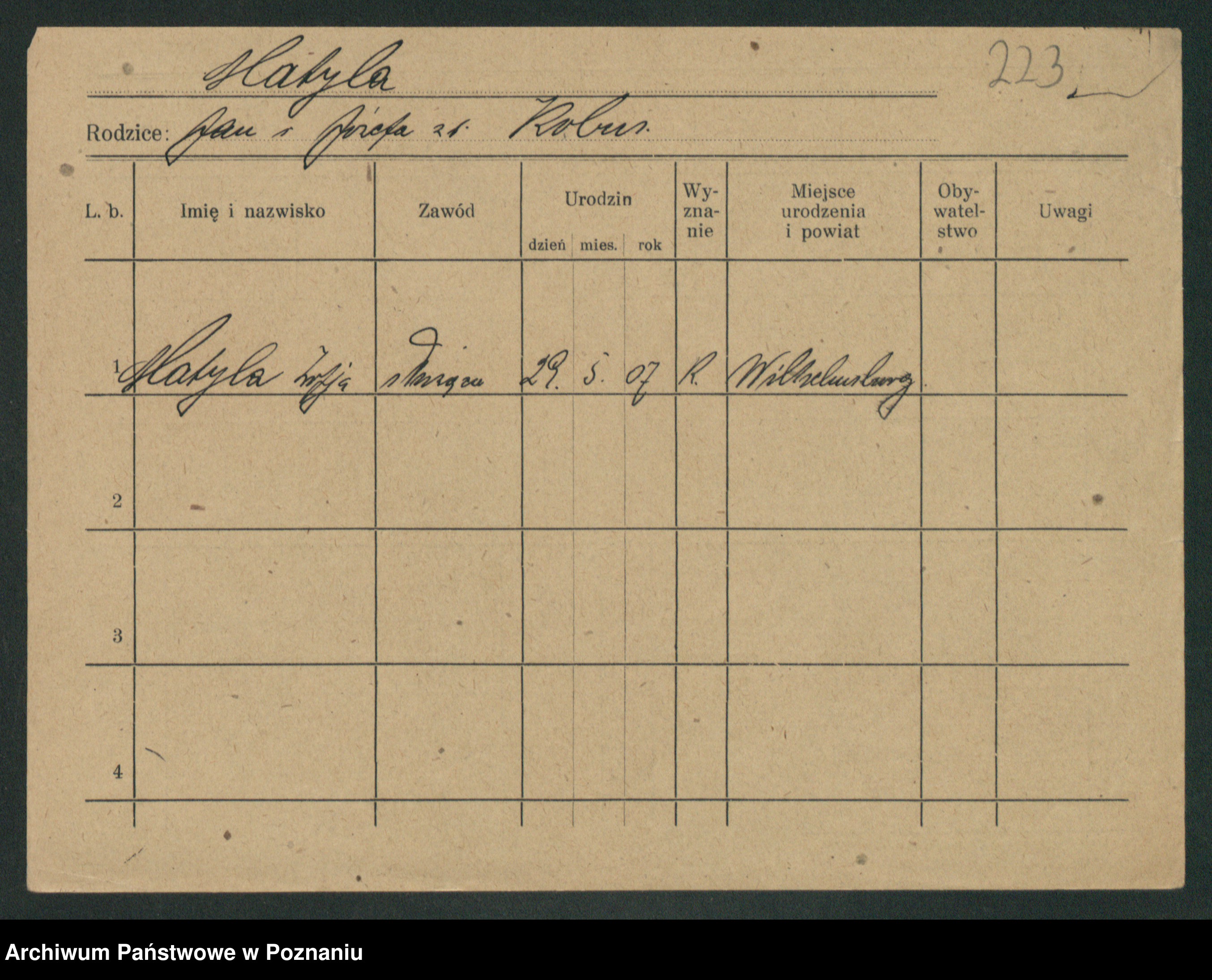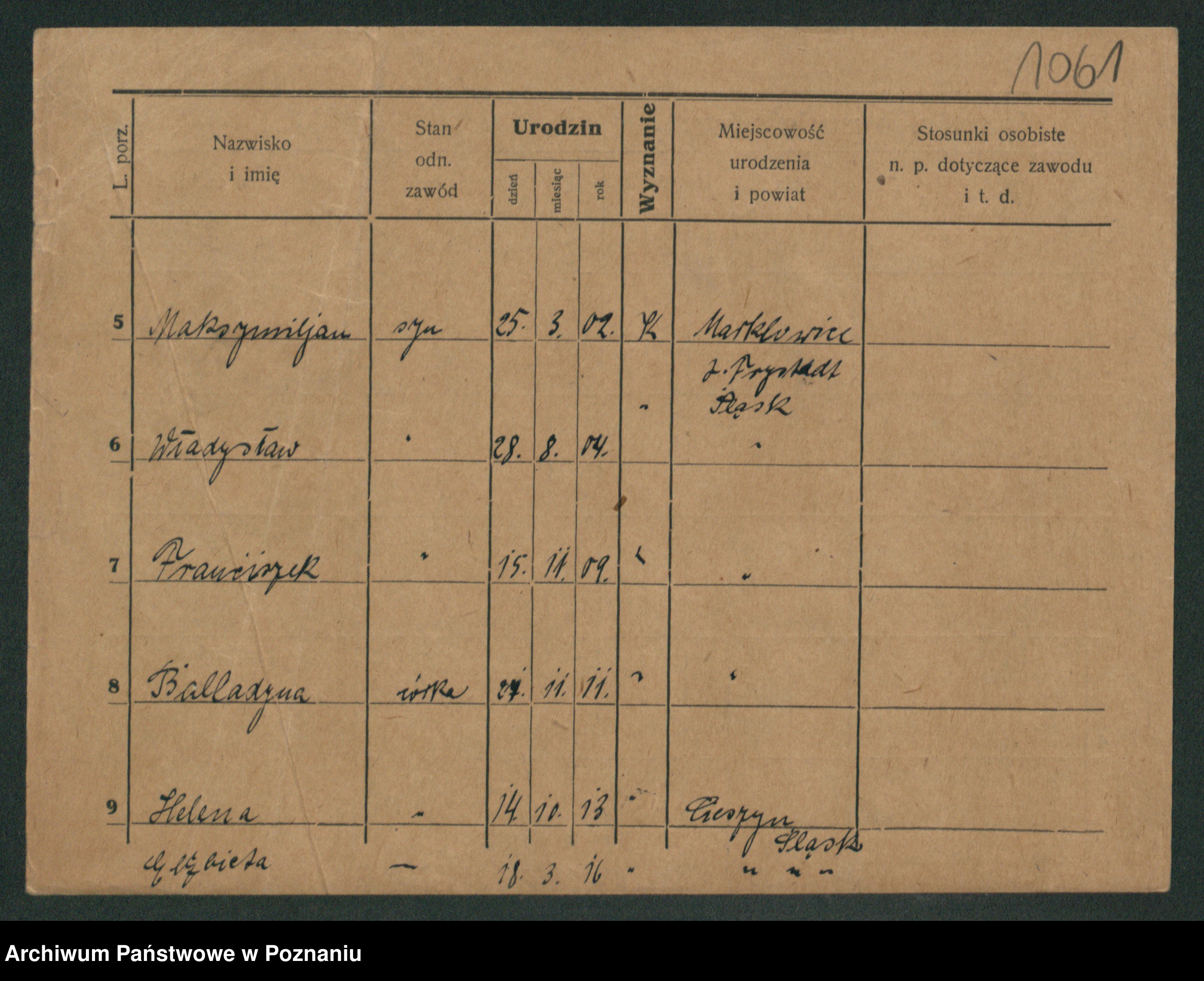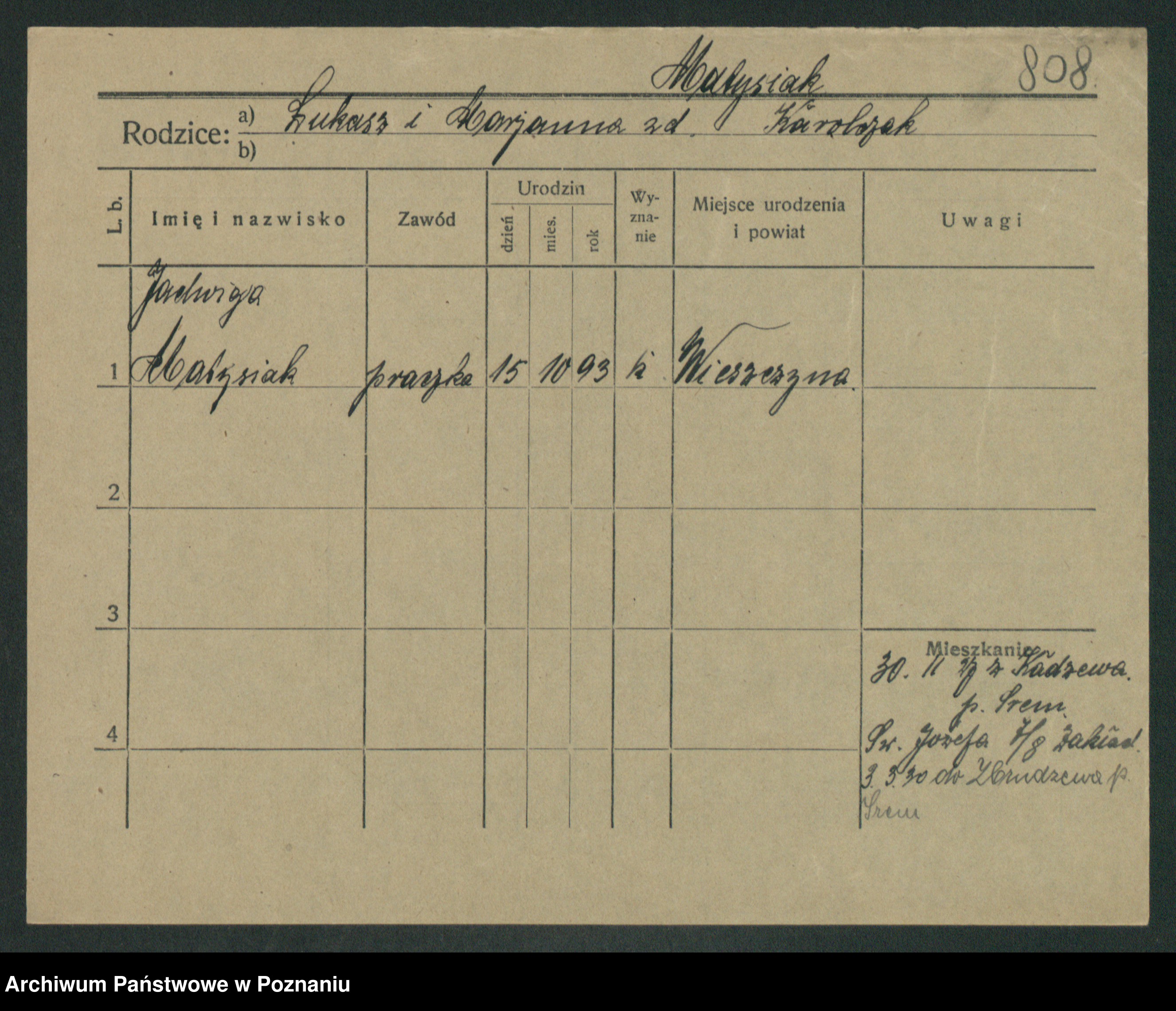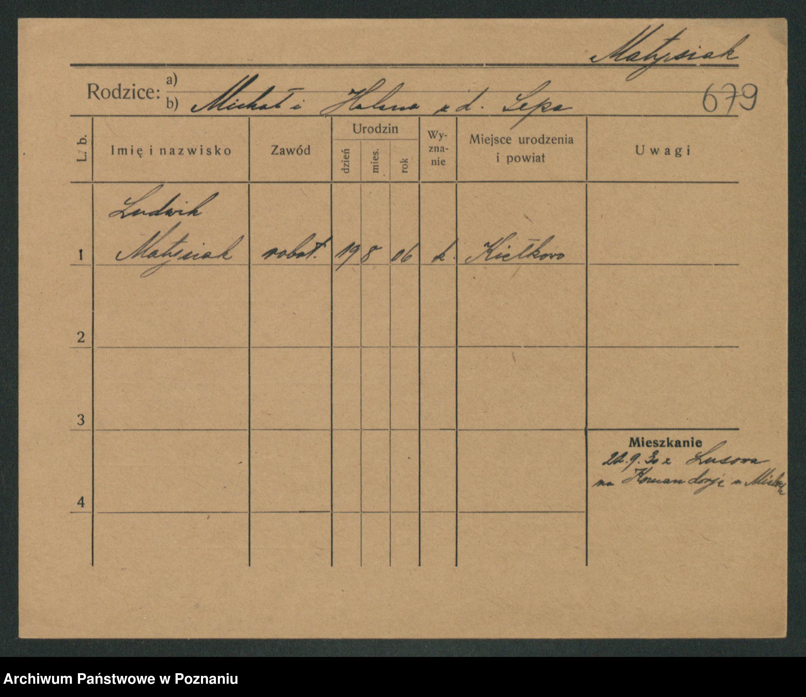 Podgląd karty osobowej dostępny jest po kliknięciu na nazwisko lub ikonkę karty. Można dokonywać powiększenia (ikony na górze) lub przechodzić między kolejnymi skanami (strzałki po bokach).