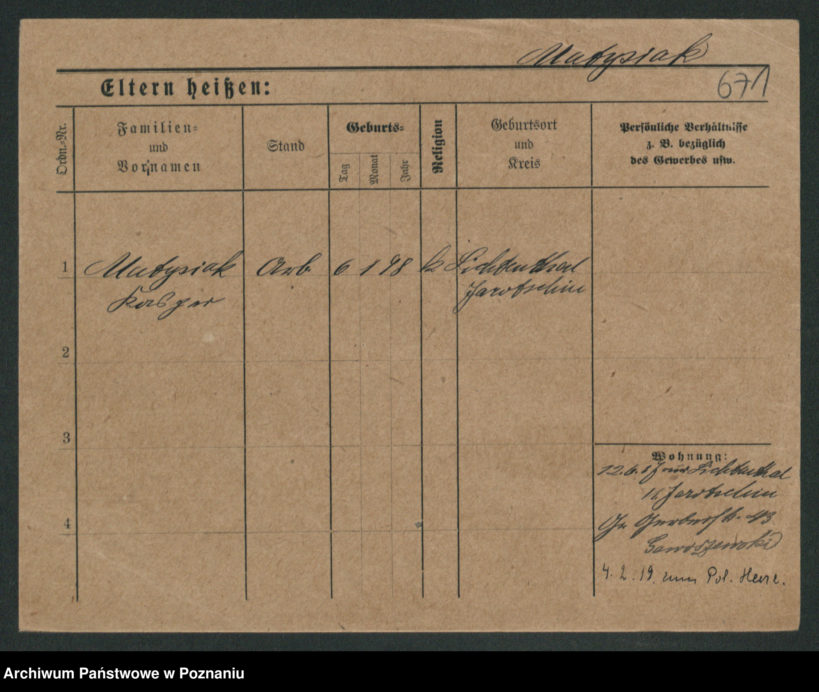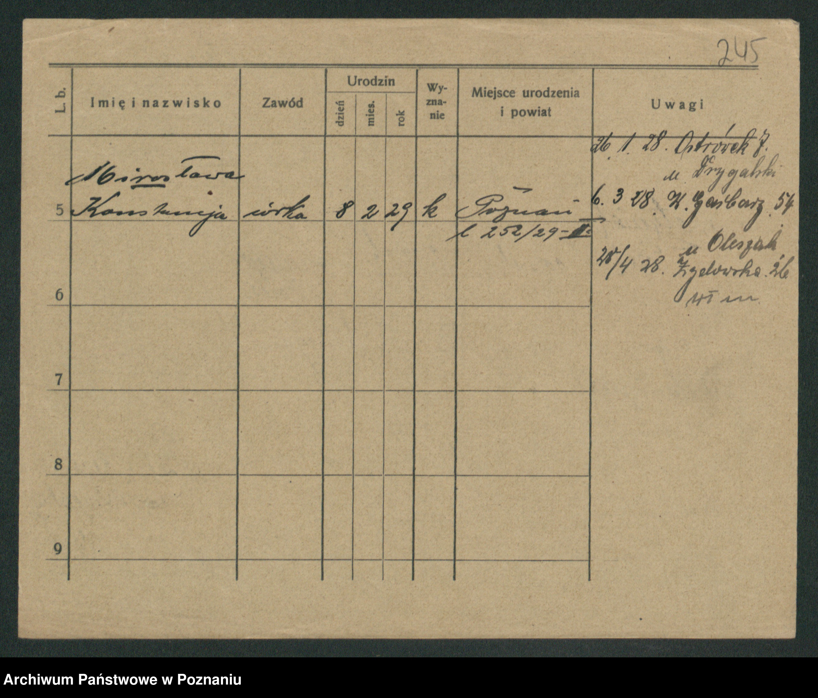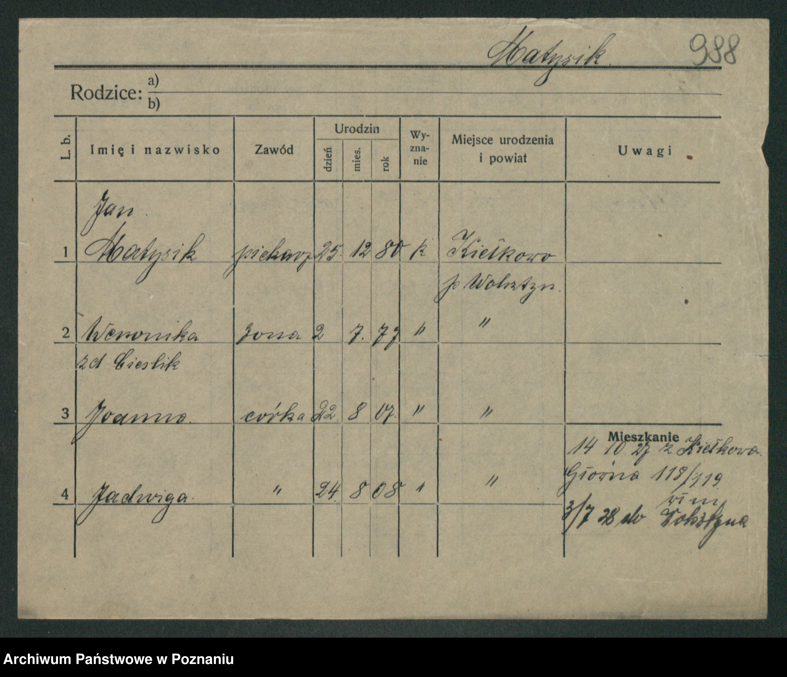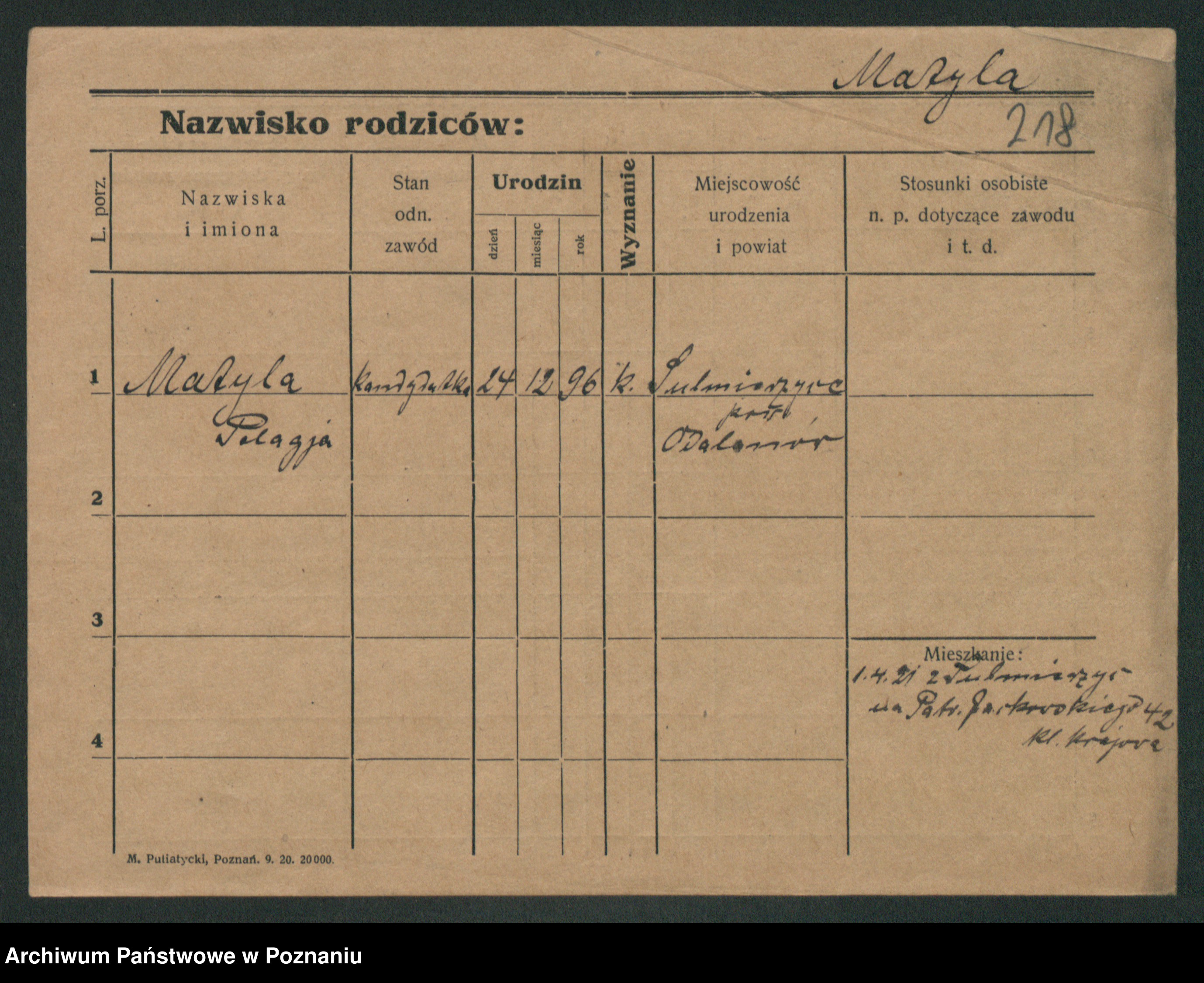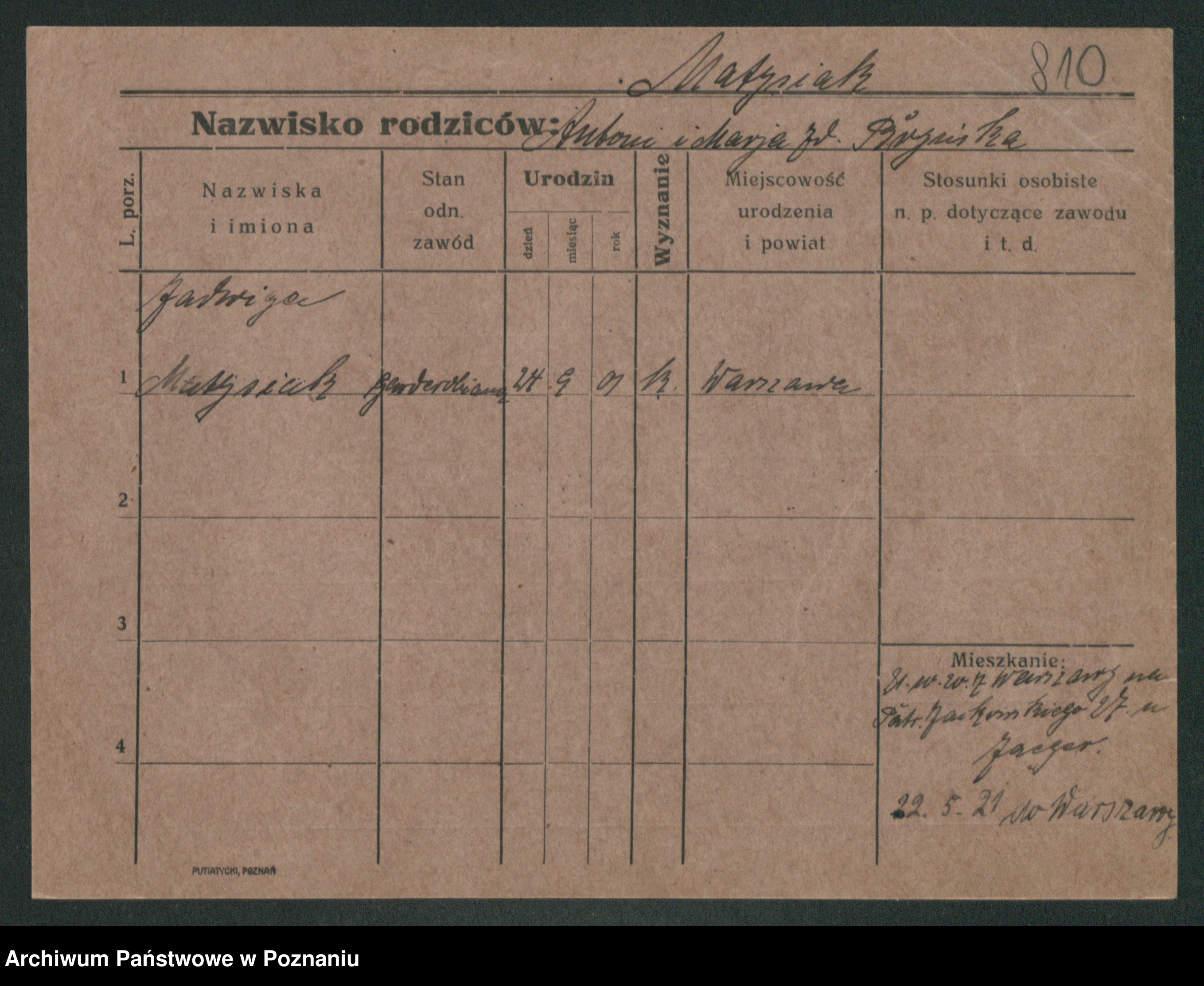Podgląd karty osobowej dostępny jest po kliknięciu na nazwisko lub ikonkę karty. Można dokonywać powiększenia (ikony na górze) lub przechodzić między kolejnymi skanami (strzałki po bokach).