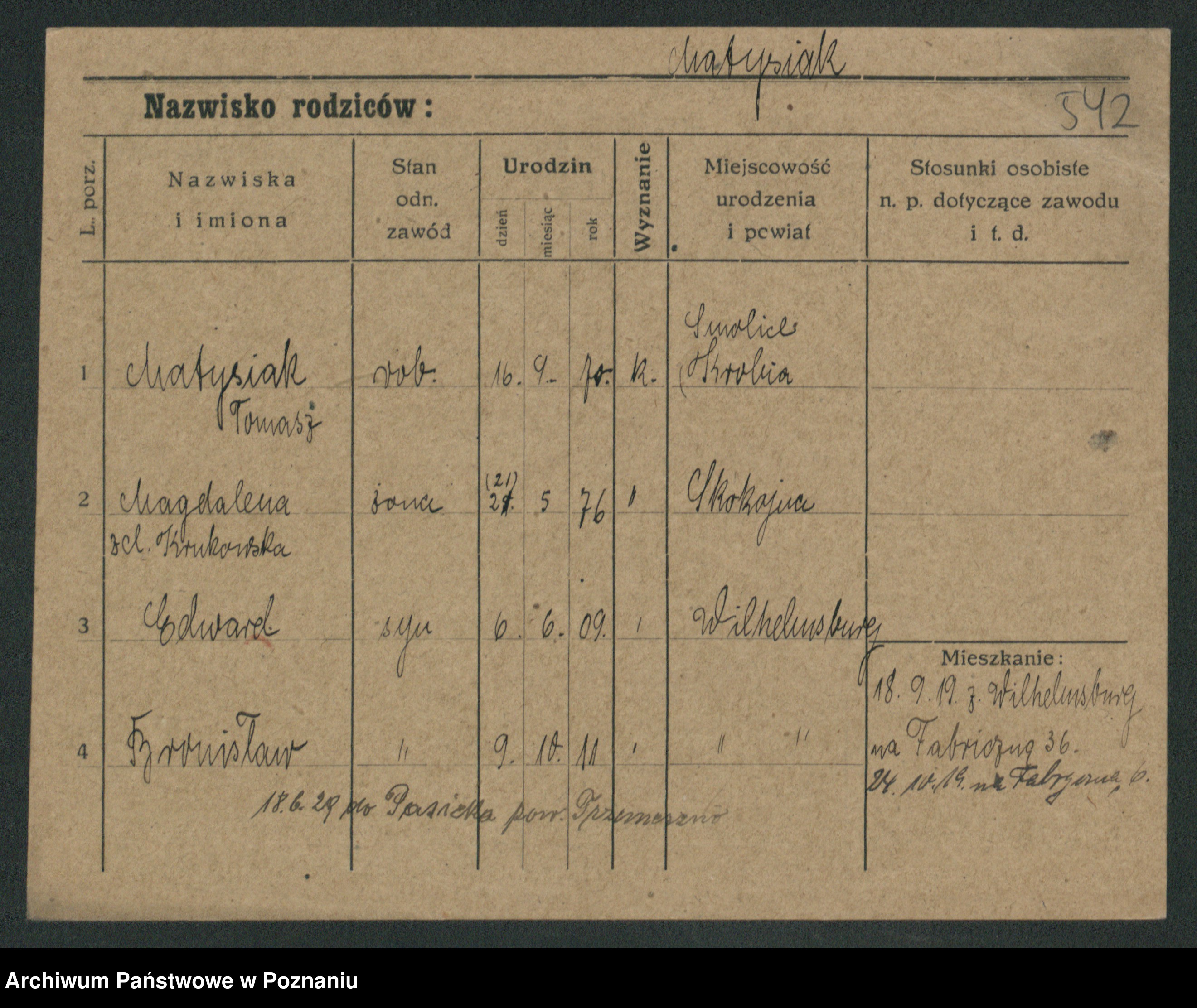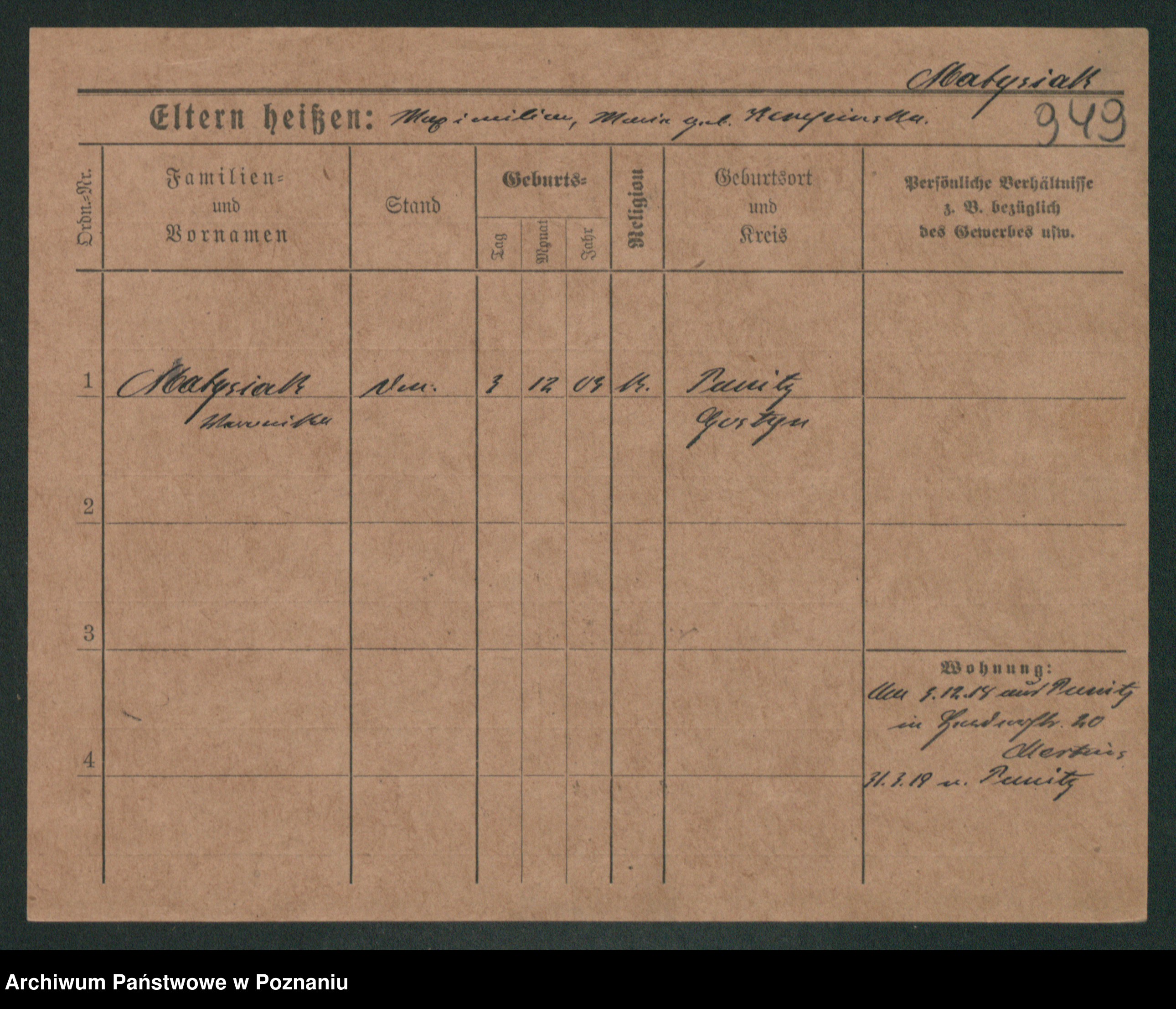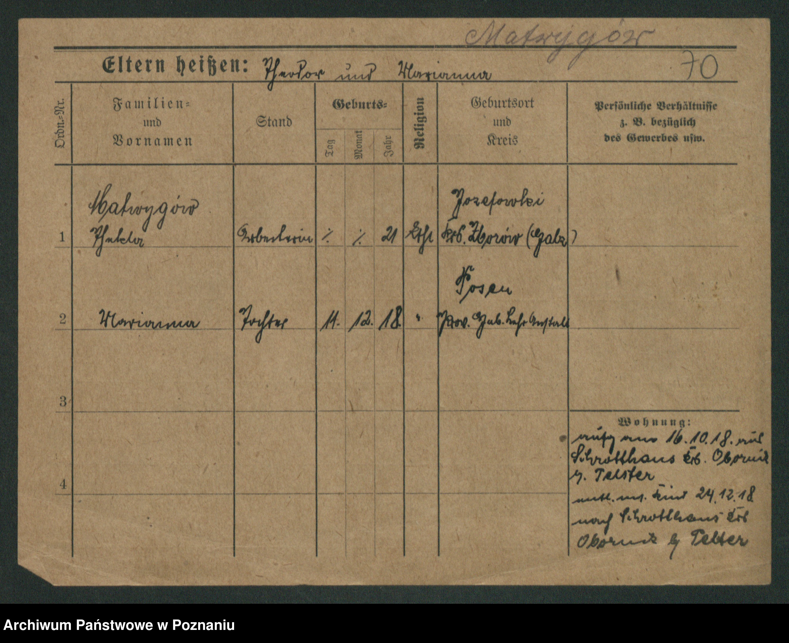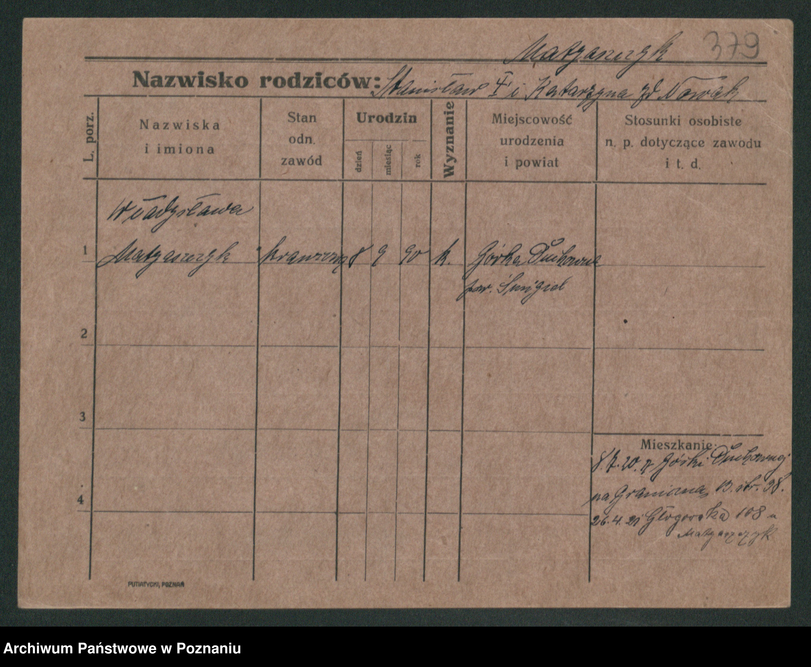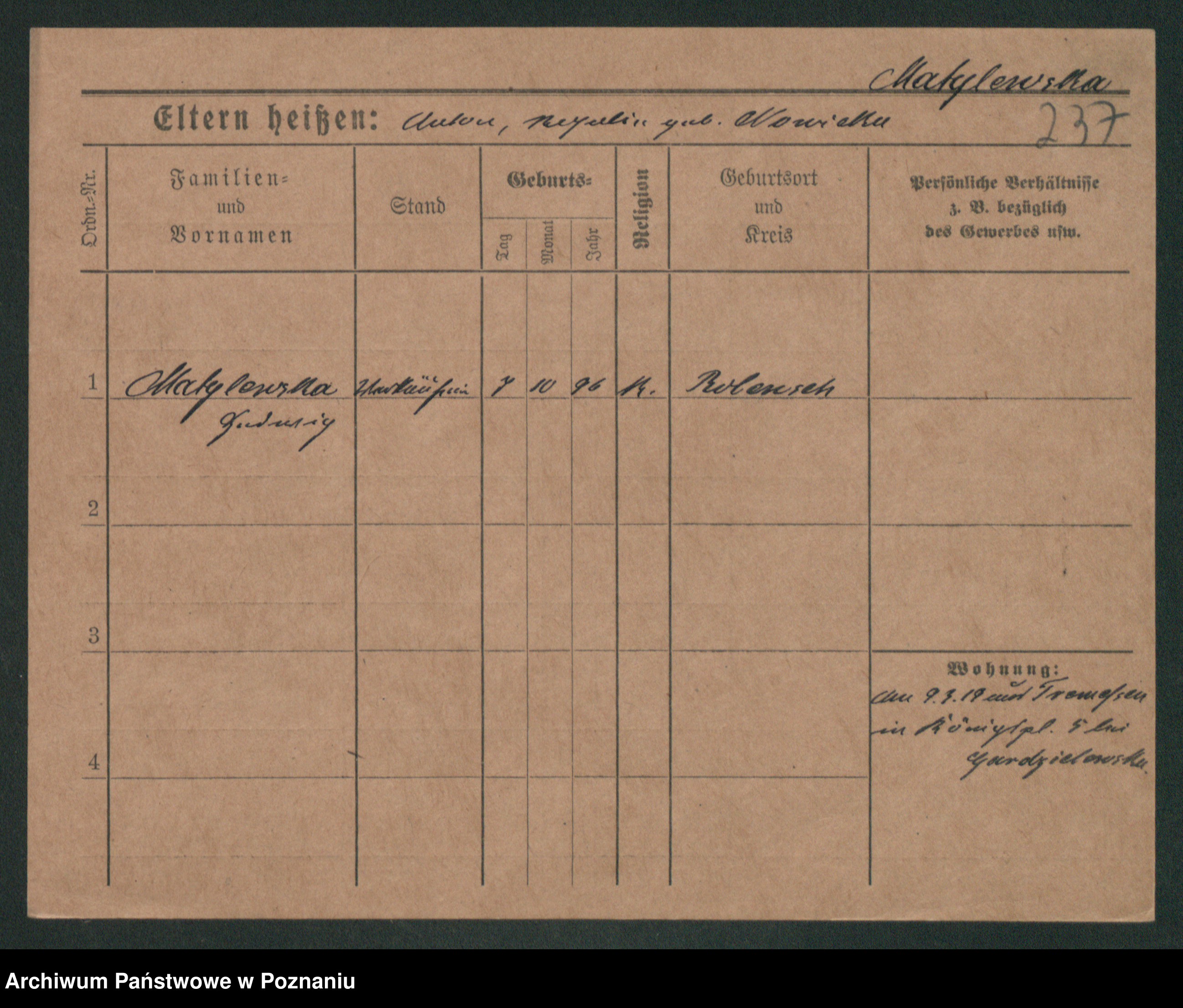 Podgląd karty osobowej dostępny jest po kliknięciu na nazwisko lub ikonkę karty. Można dokonywać powiększenia (ikony na górze) lub przechodzić między kolejnymi skanami (strzałki po bokach).
