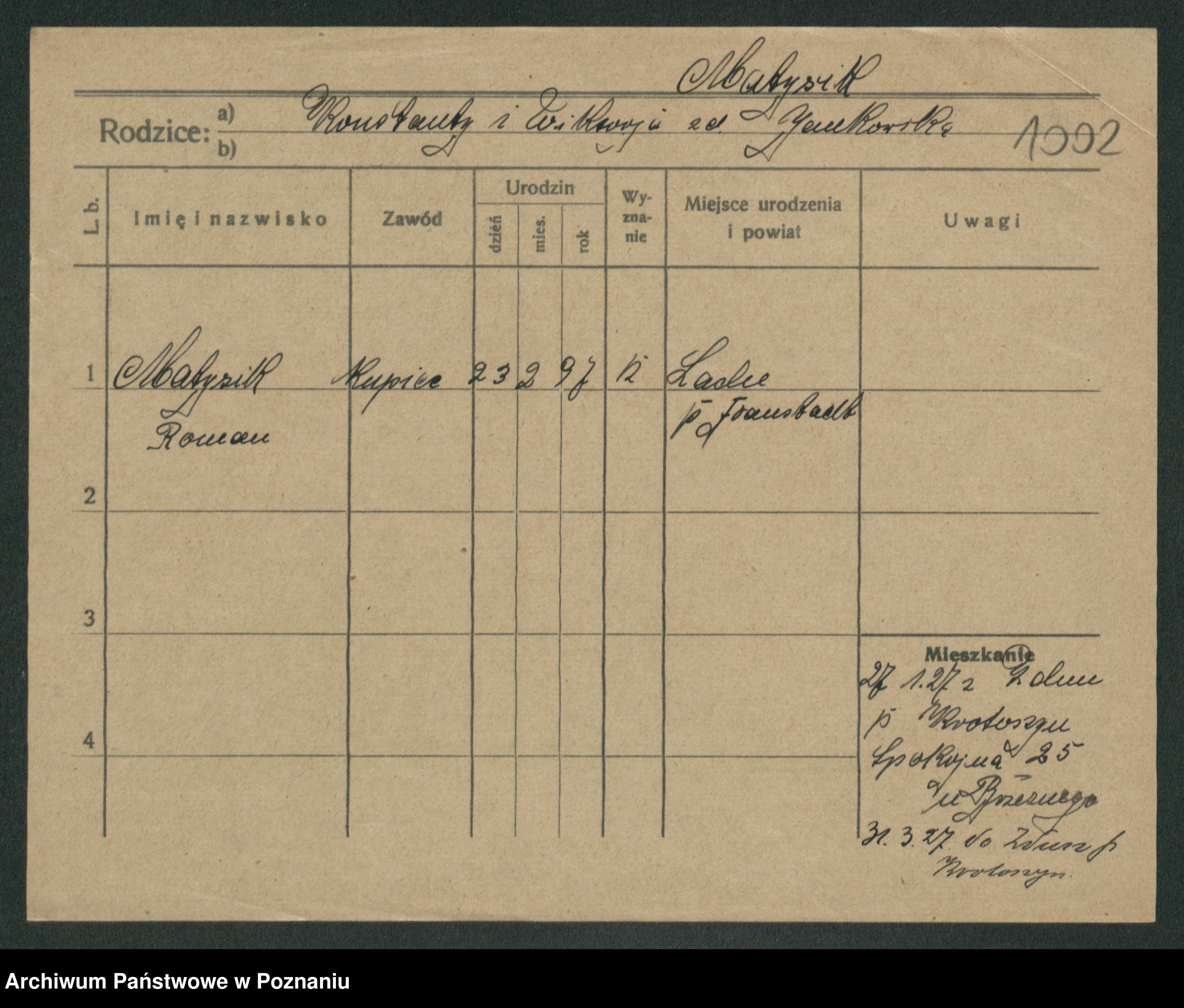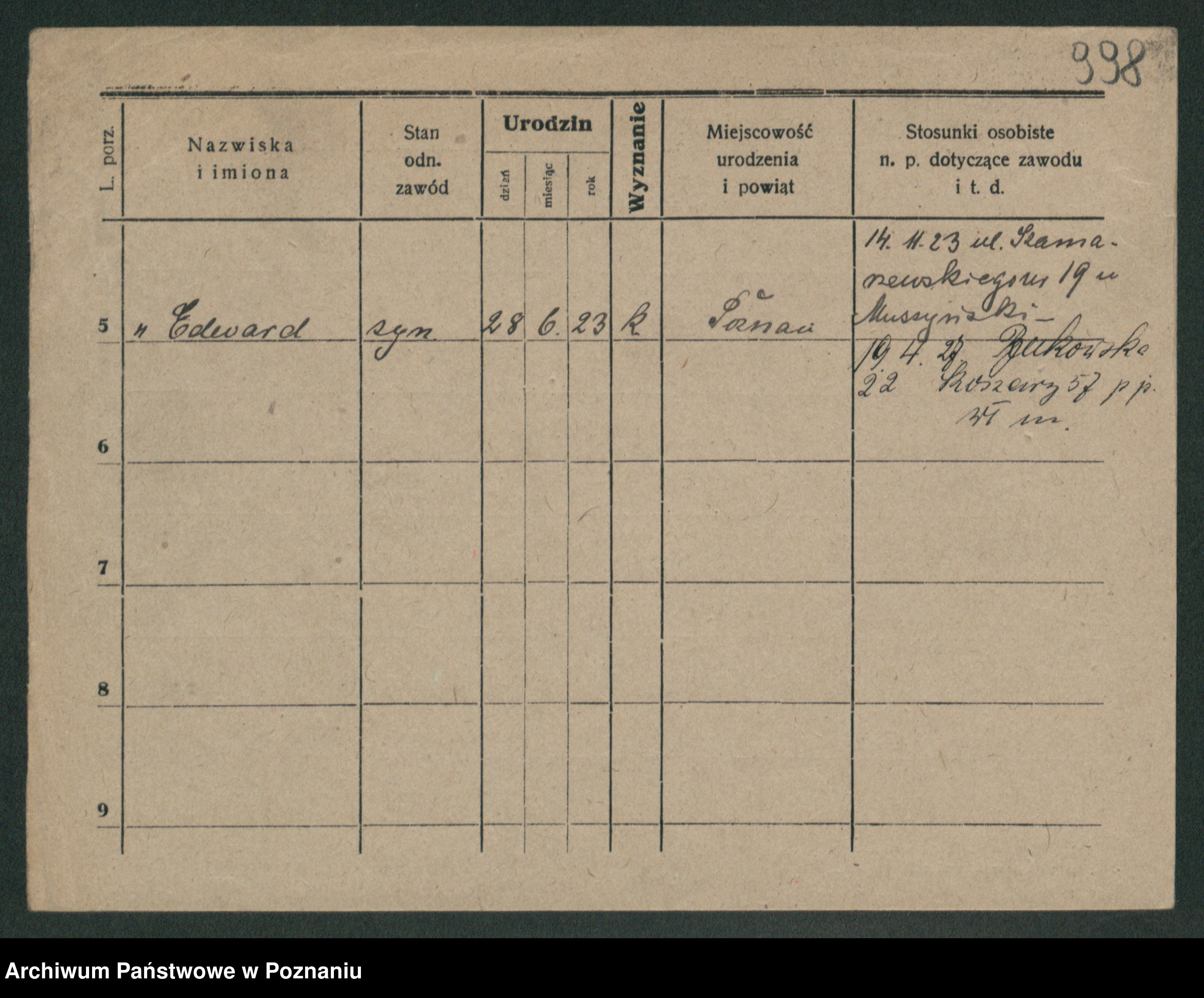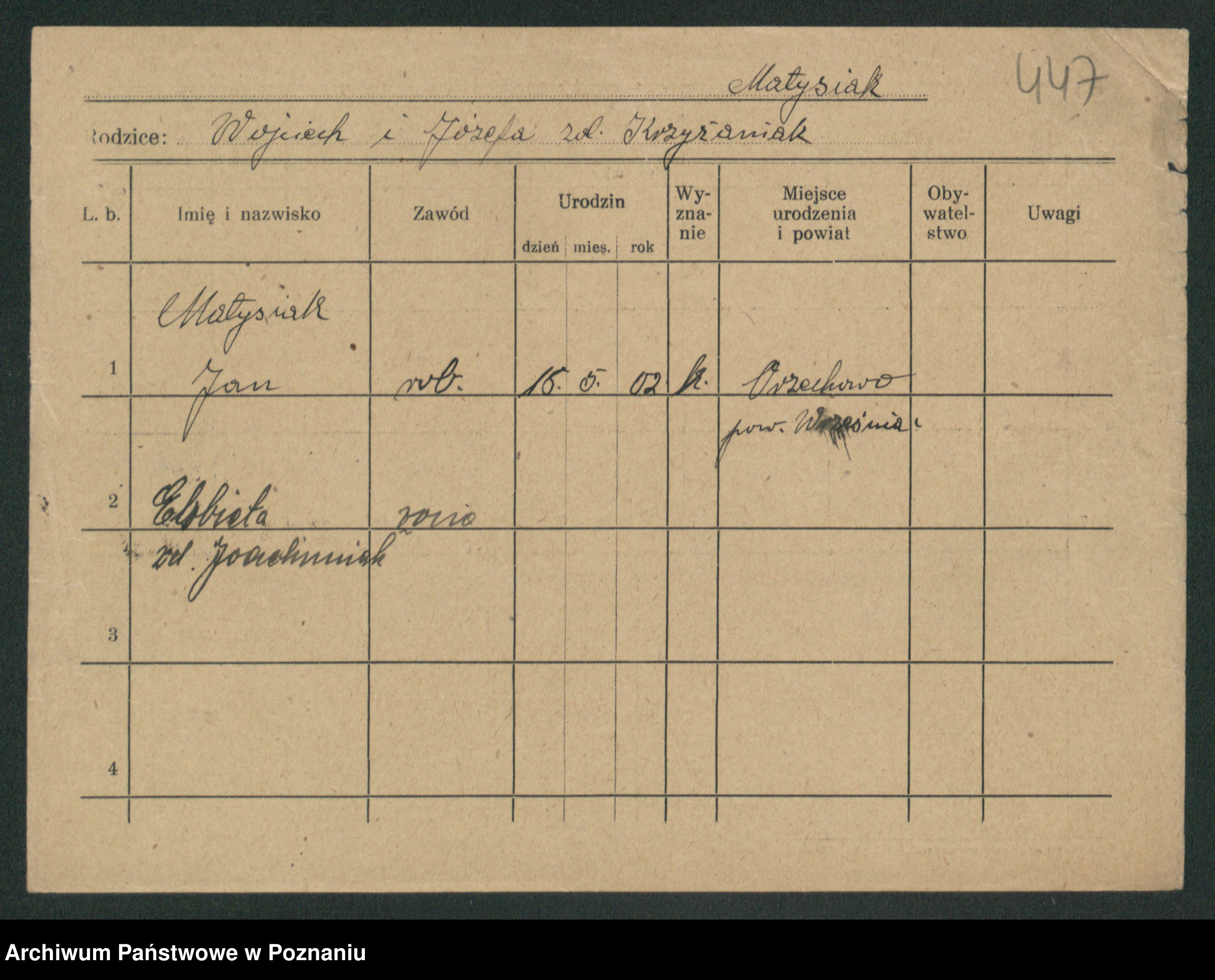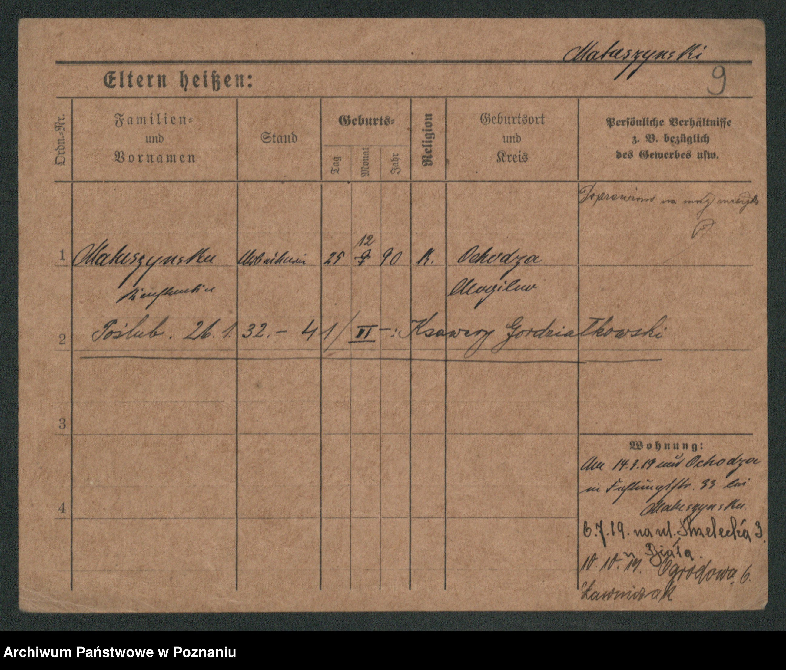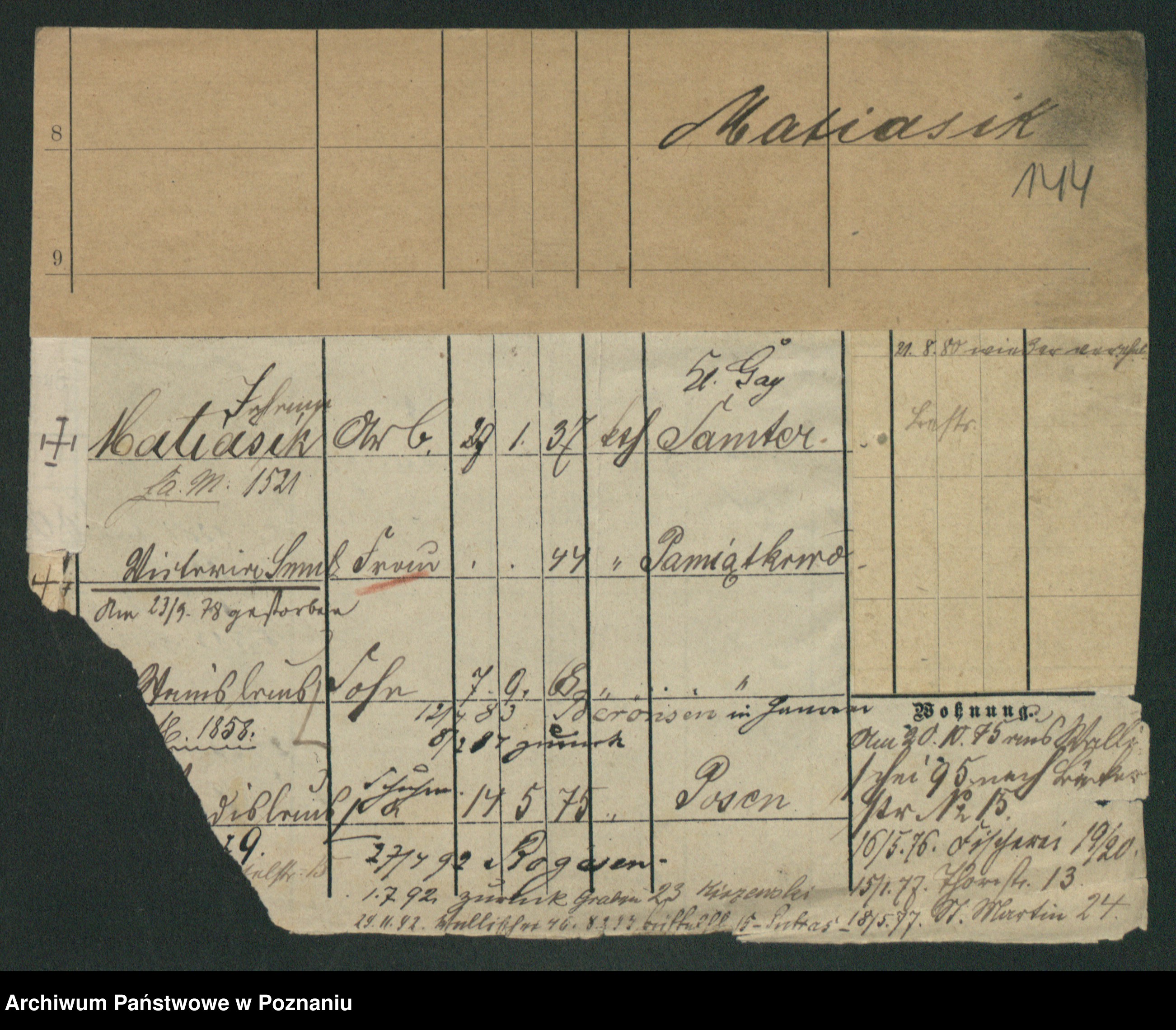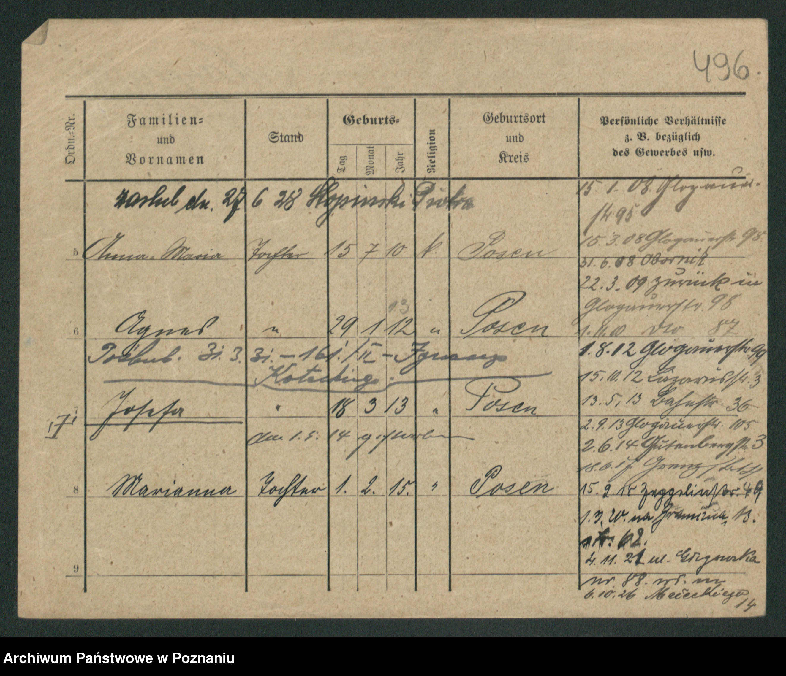 Podgląd karty osobowej dostępny jest po kliknięciu na nazwisko lub ikonkę karty. Można dokonywać powiększenia (ikony na górze) lub przechodzić między kolejnymi skanami (strzałki po bokach).