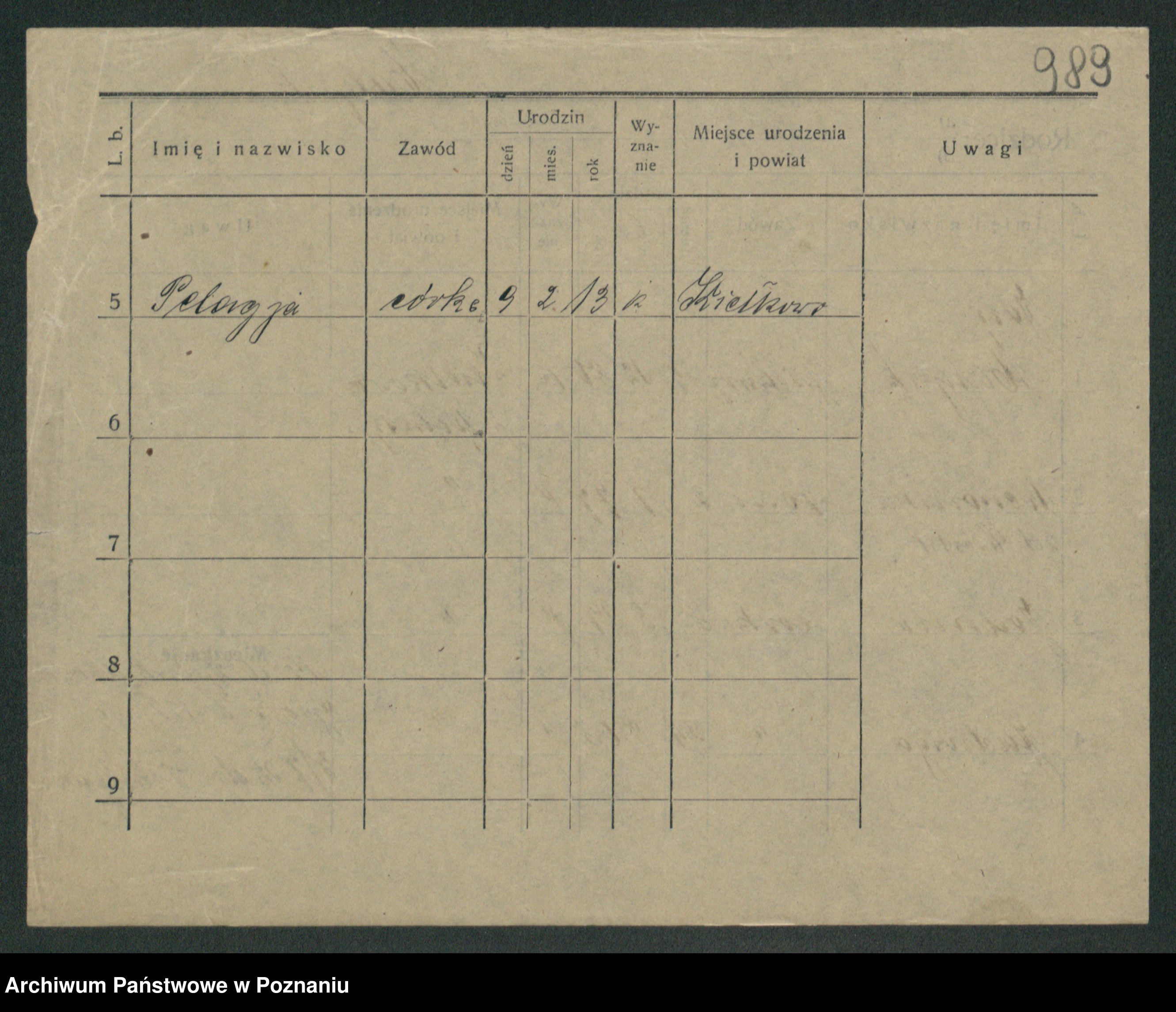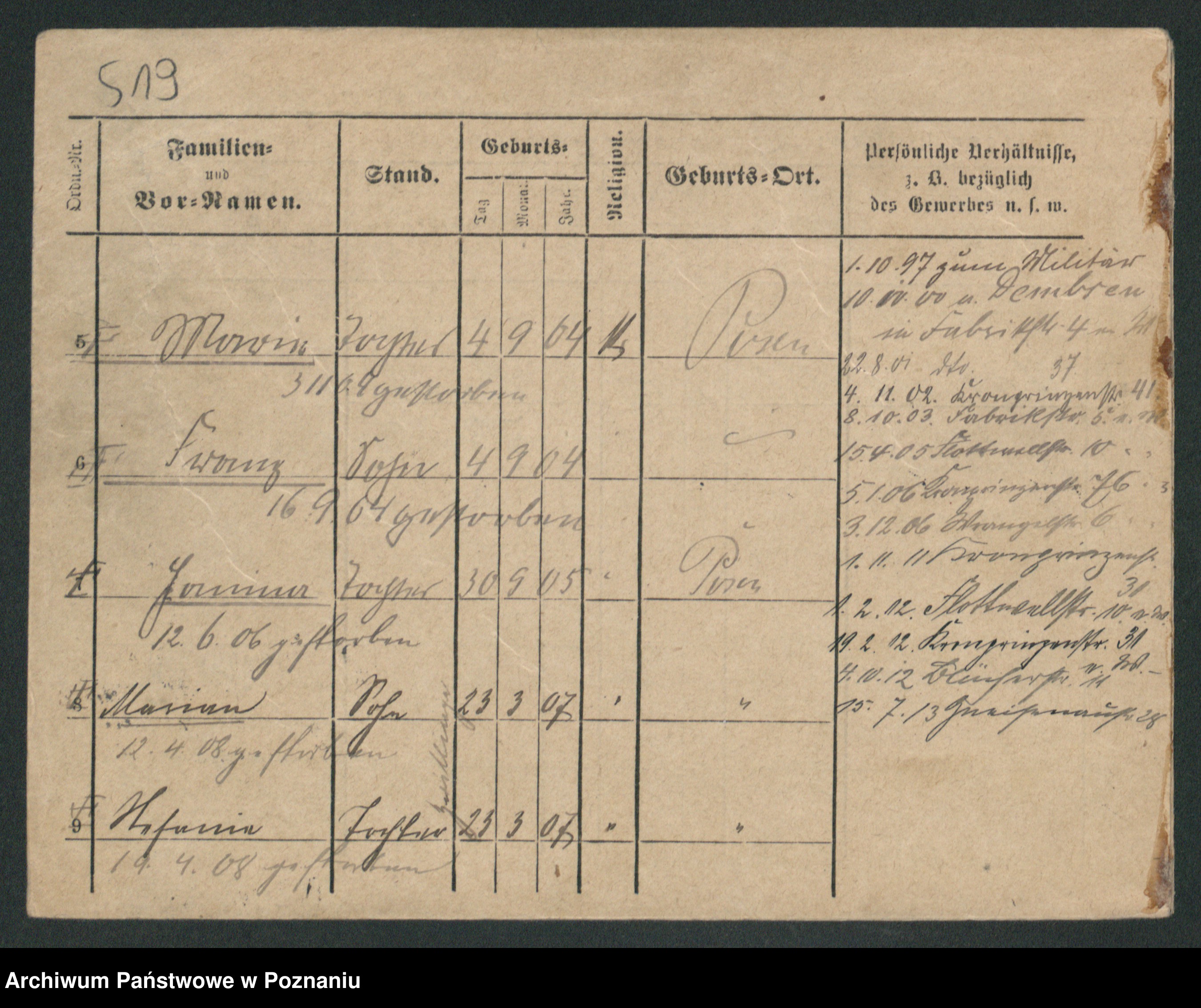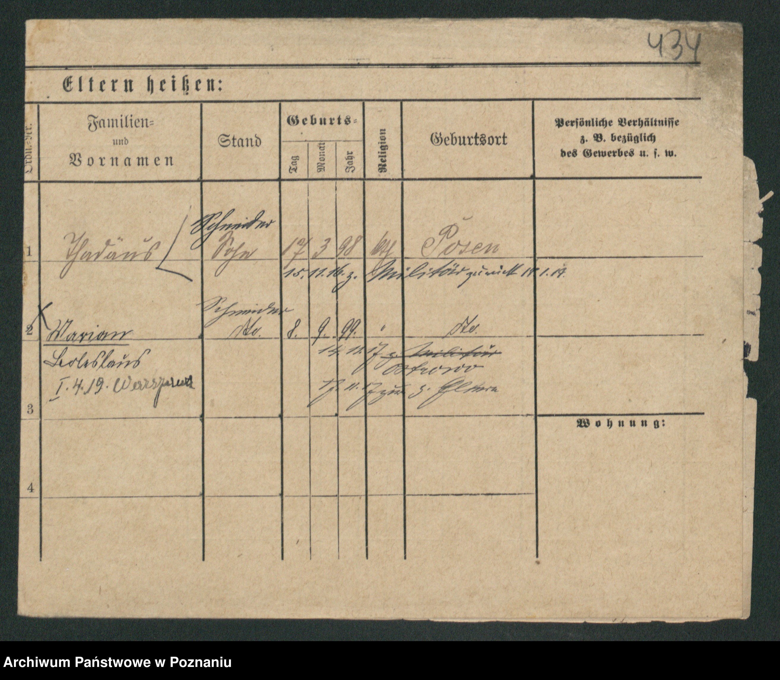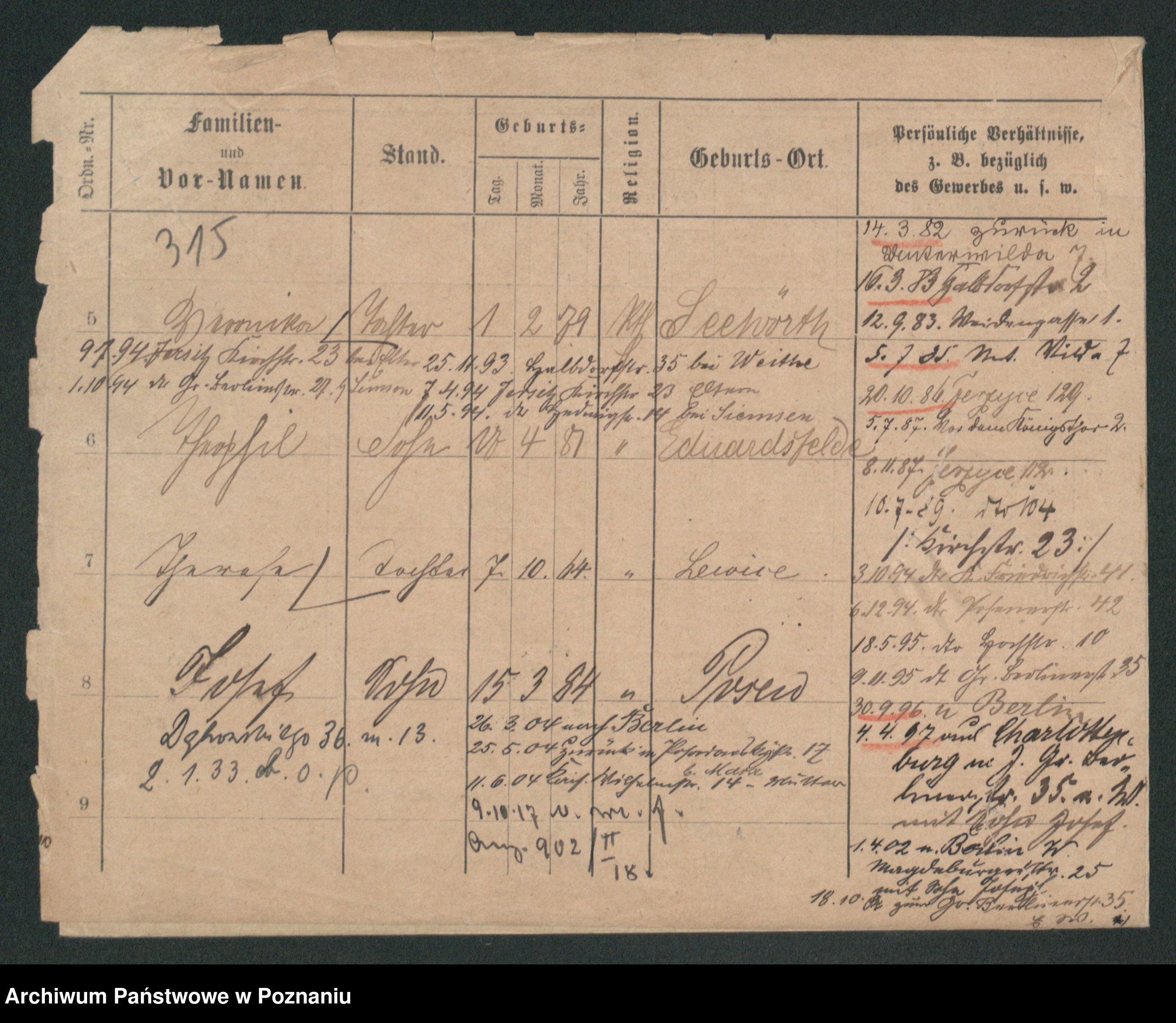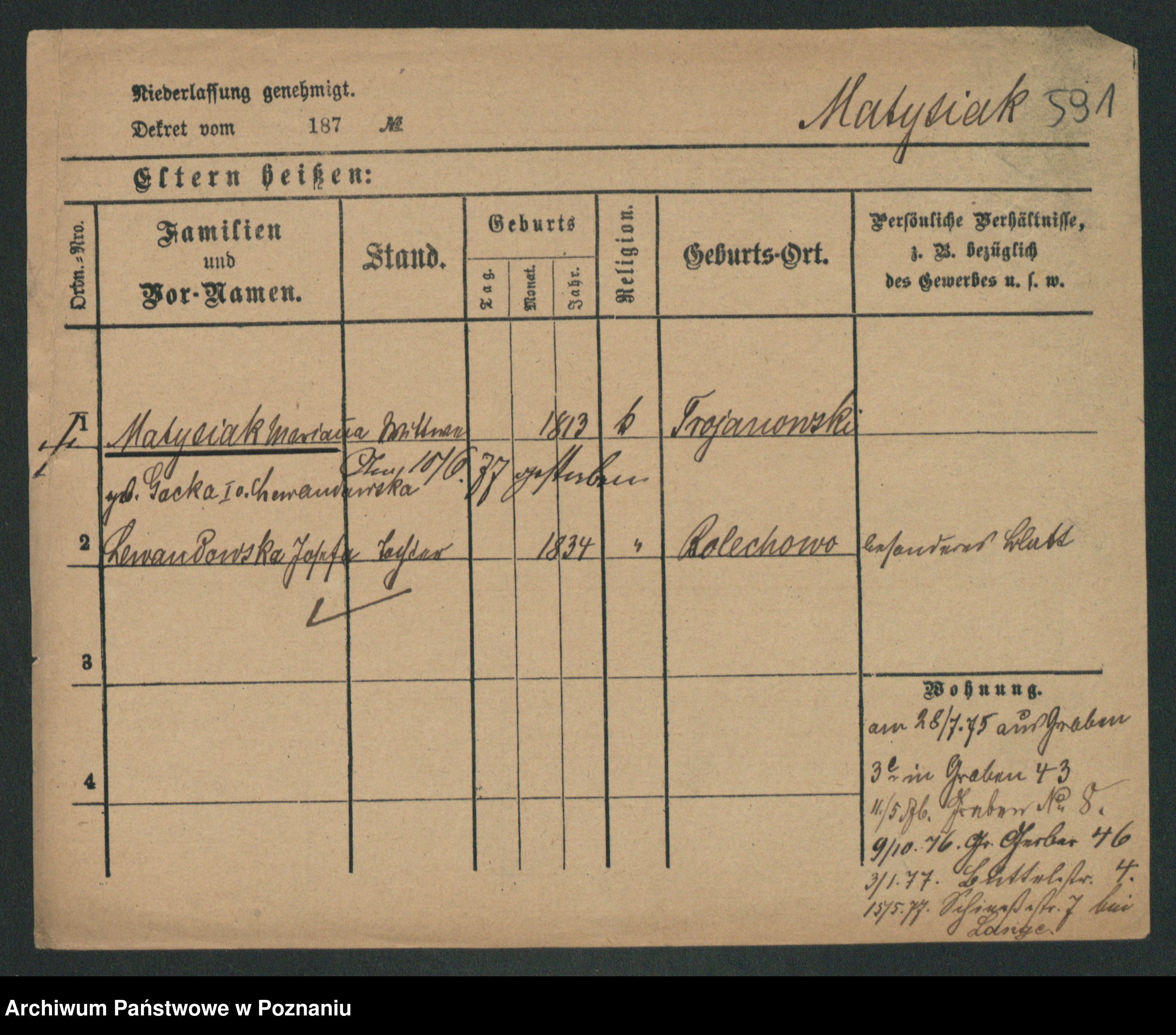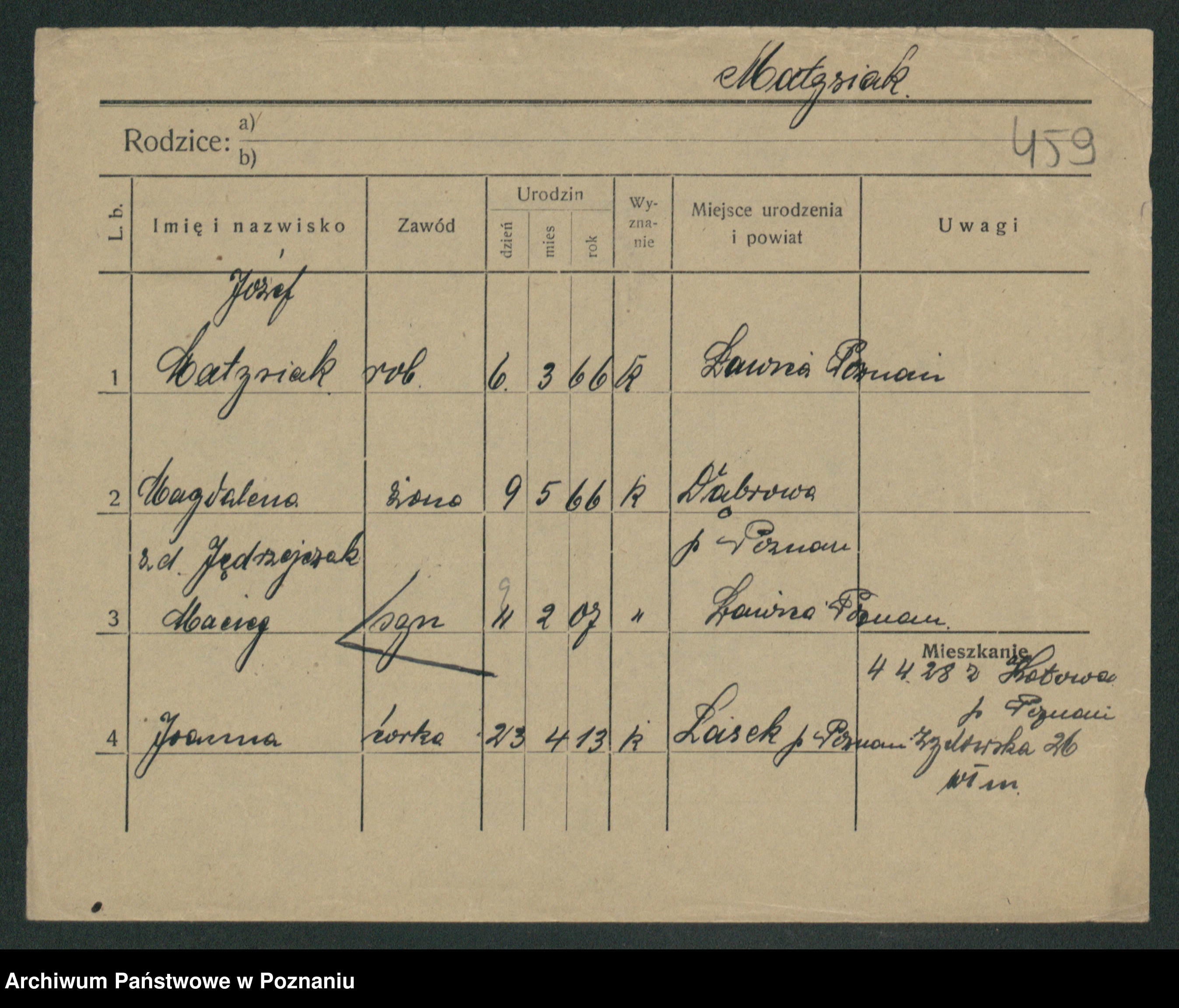 Podgląd karty osobowej dostępny jest po kliknięciu na nazwisko lub ikonkę karty. Można dokonywać powiększenia (ikony na górze) lub przechodzić między kolejnymi skanami (strzałki po bokach).