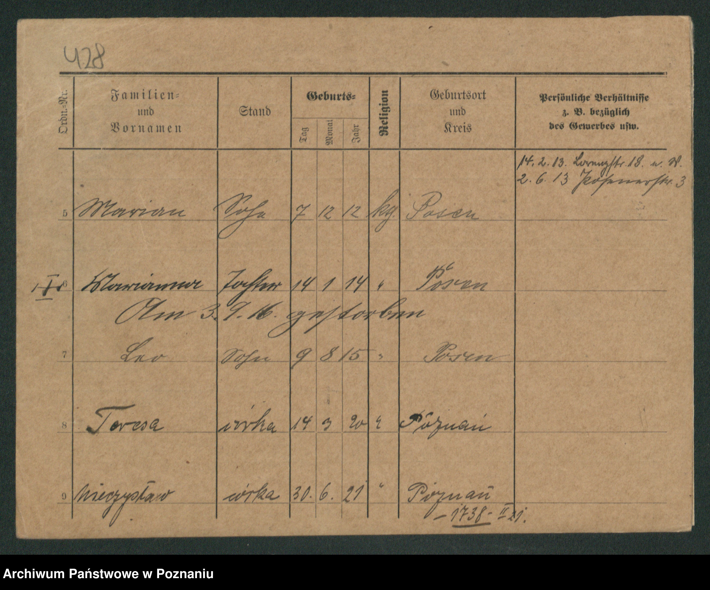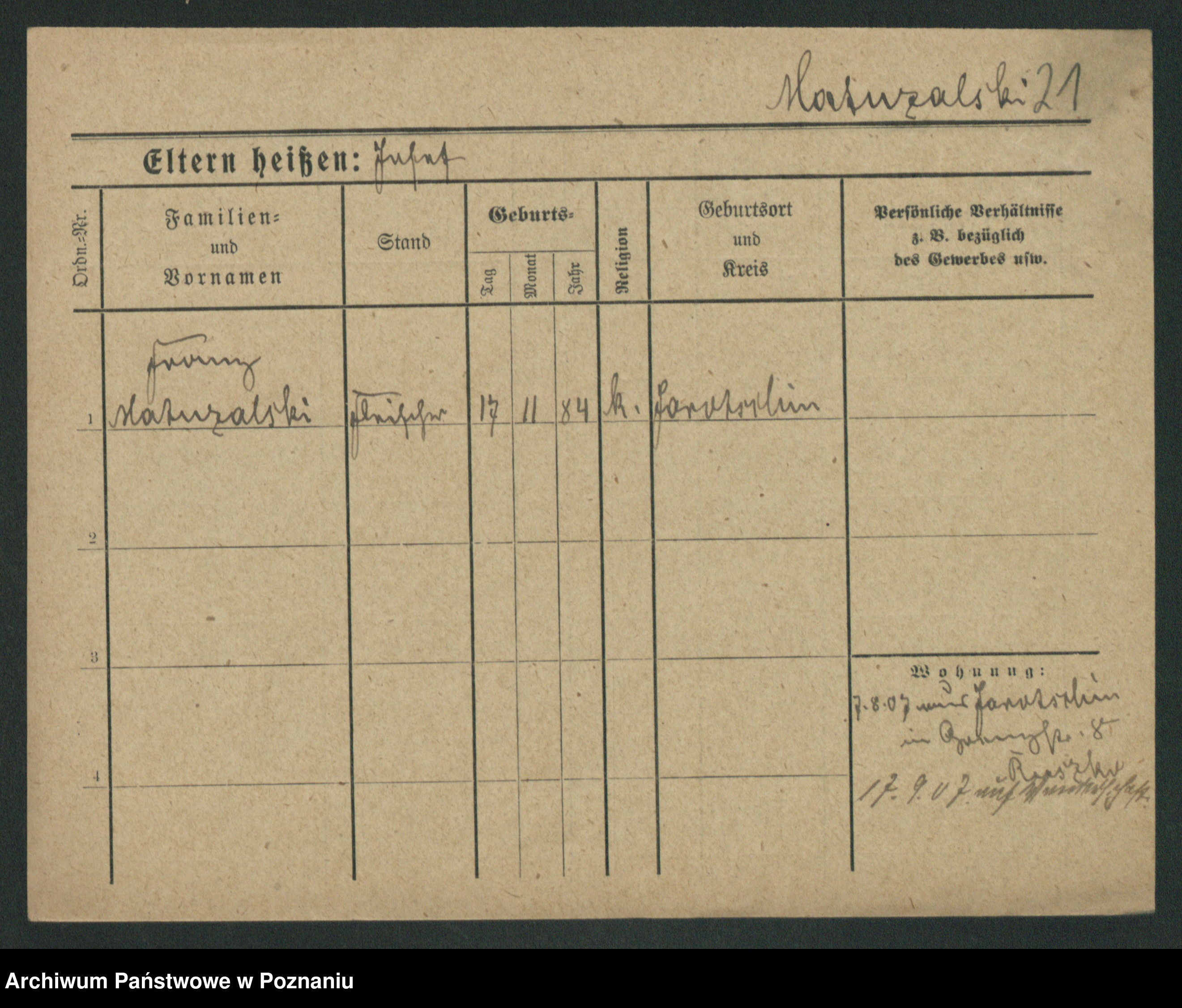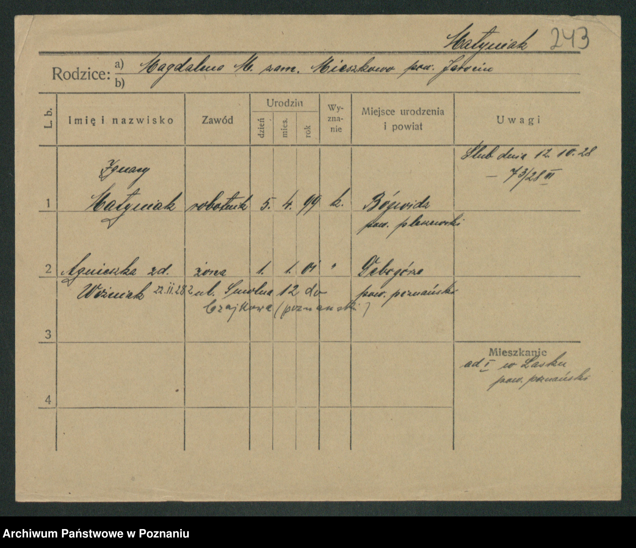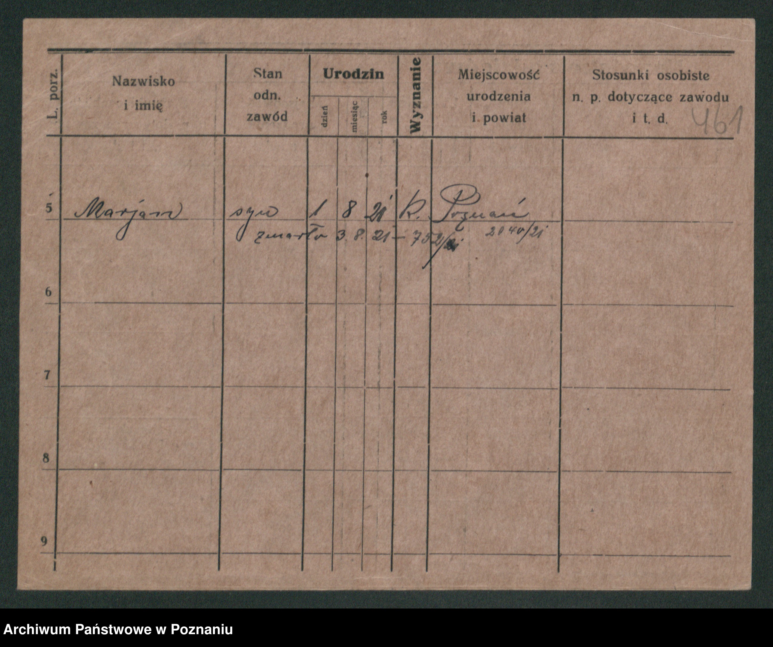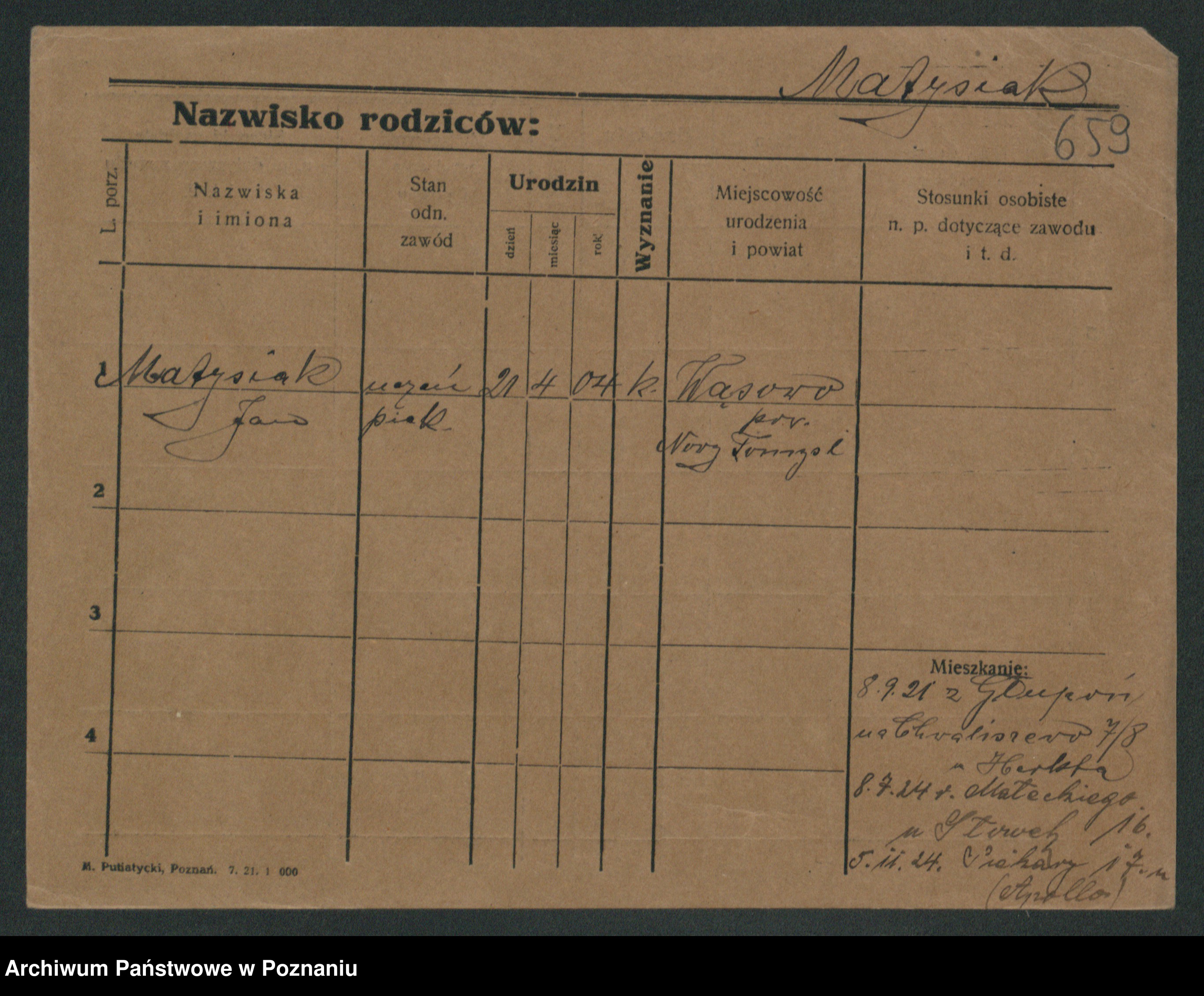 Podgląd karty osobowej dostępny jest po kliknięciu na nazwisko lub ikonkę karty. Można dokonywać powiększenia (ikony na górze) lub przechodzić między kolejnymi skanami (strzałki po bokach).