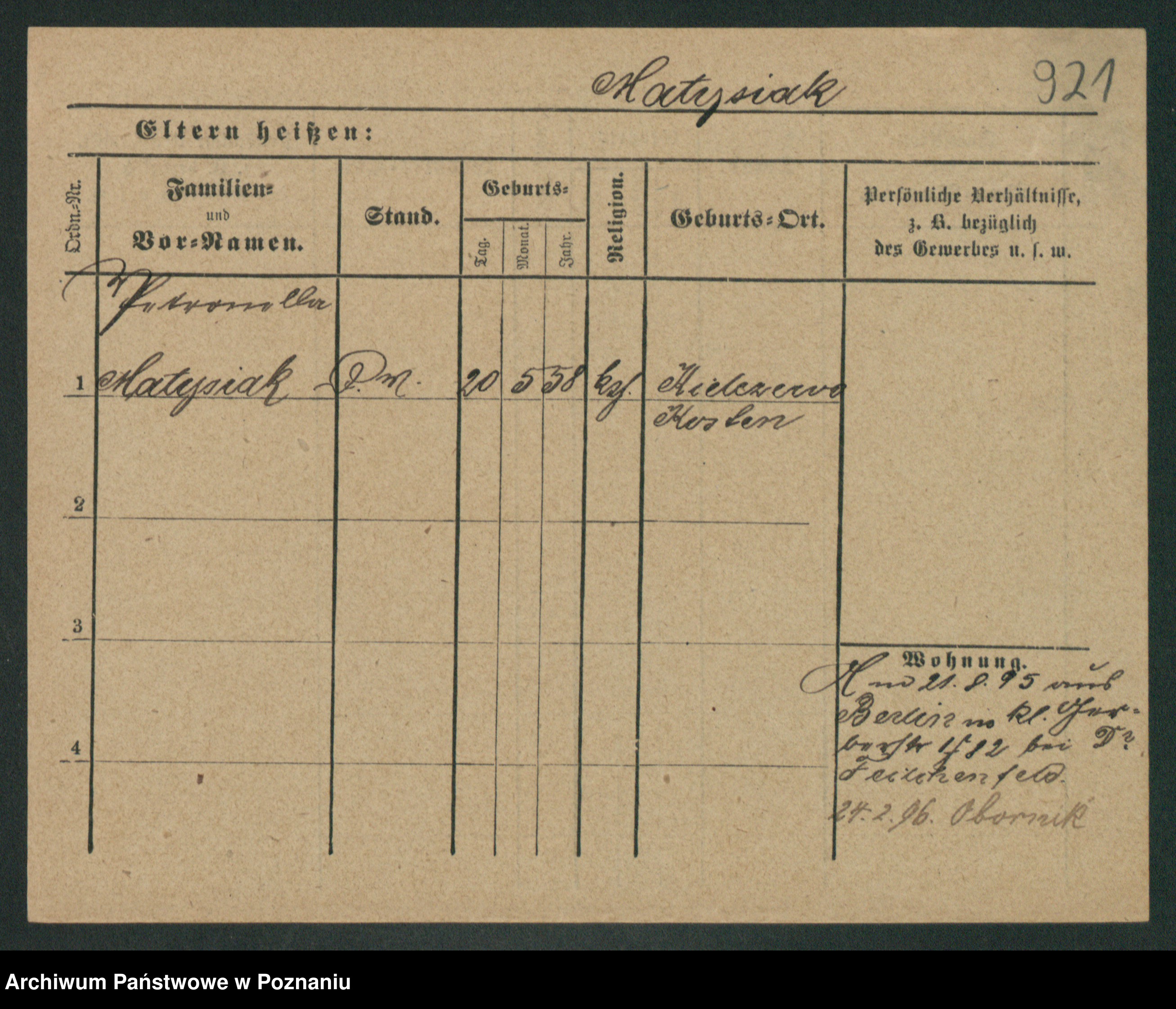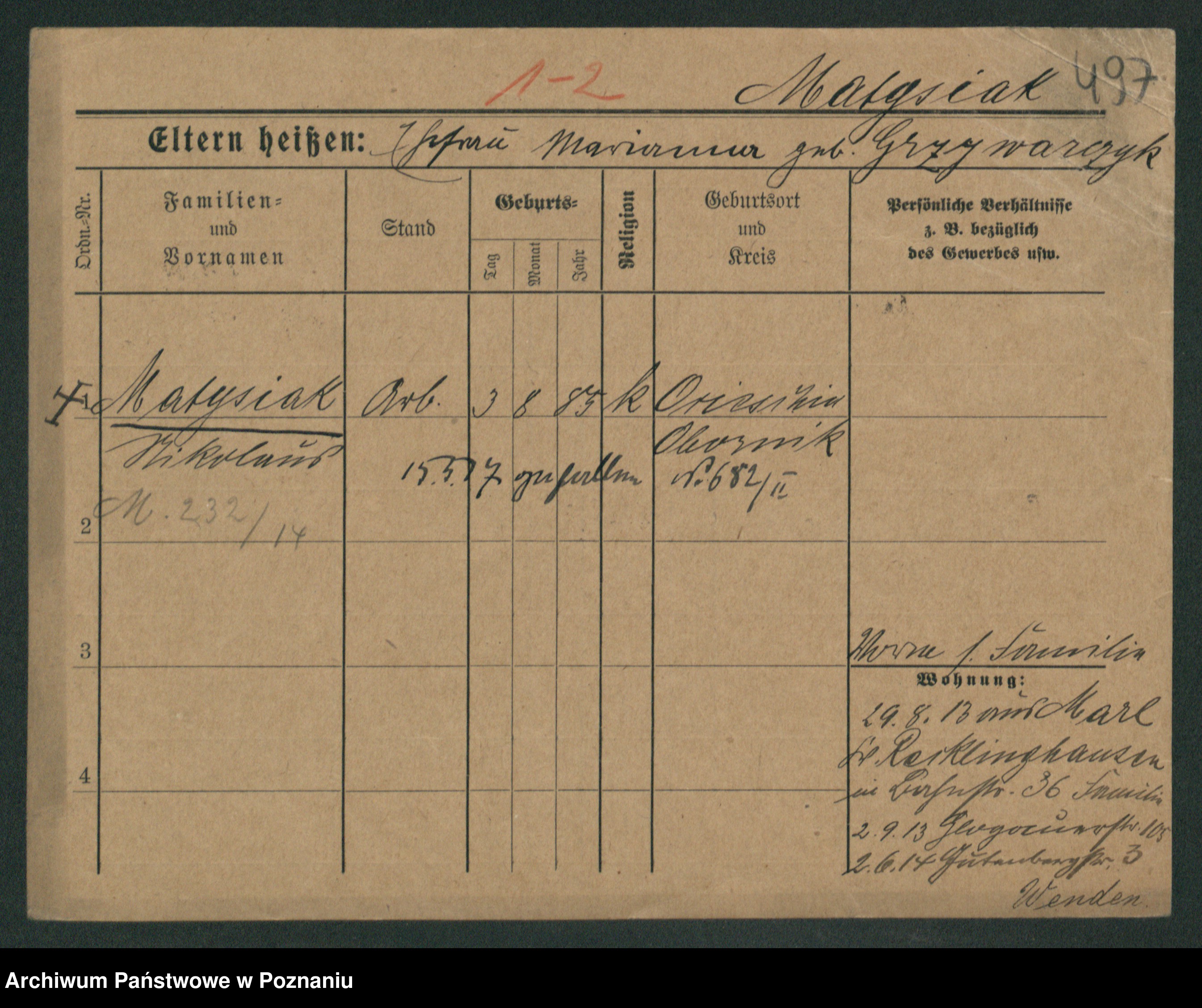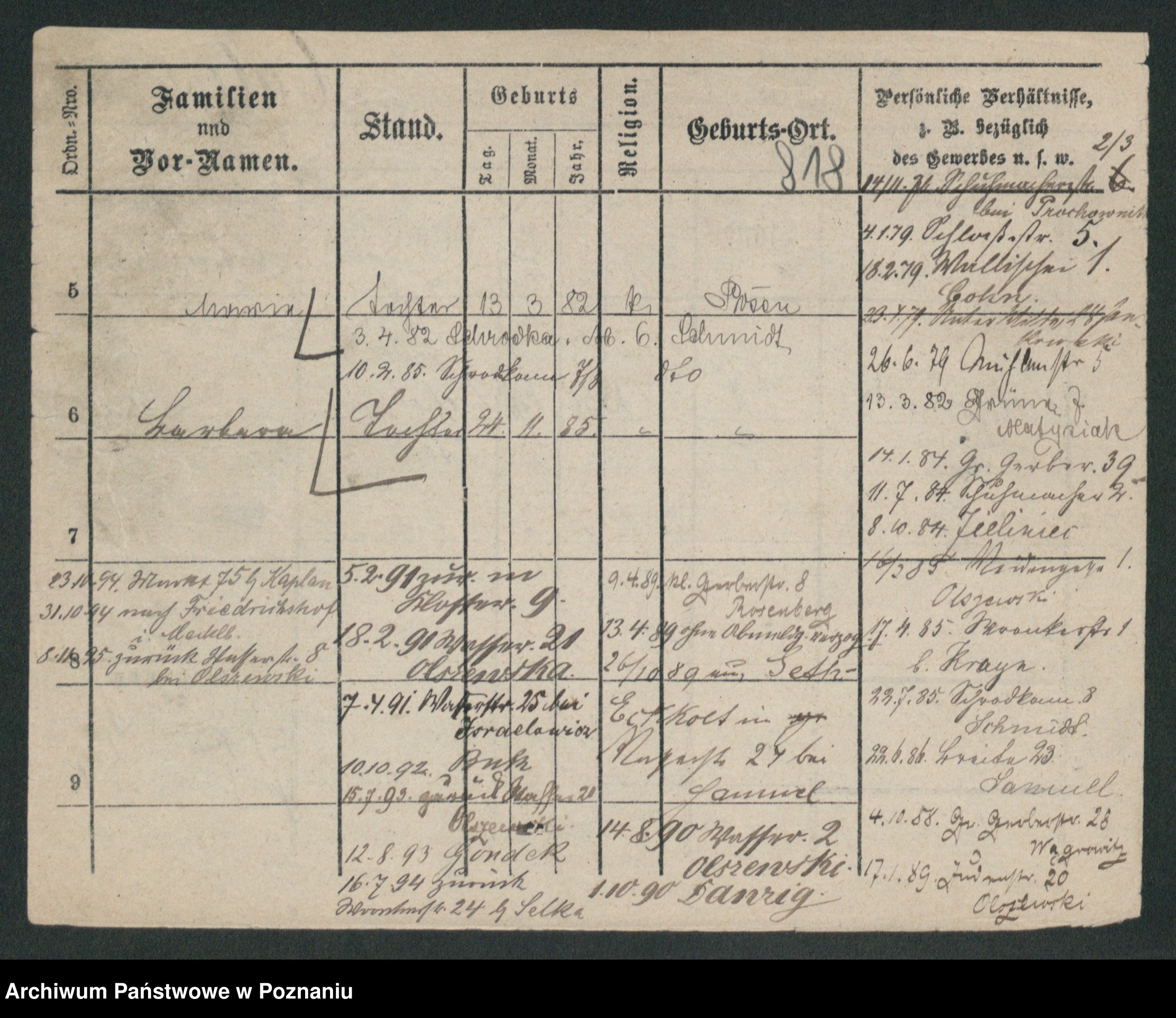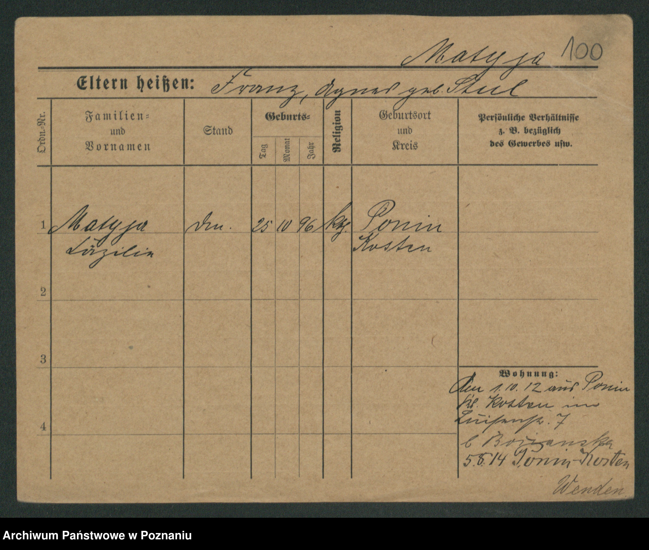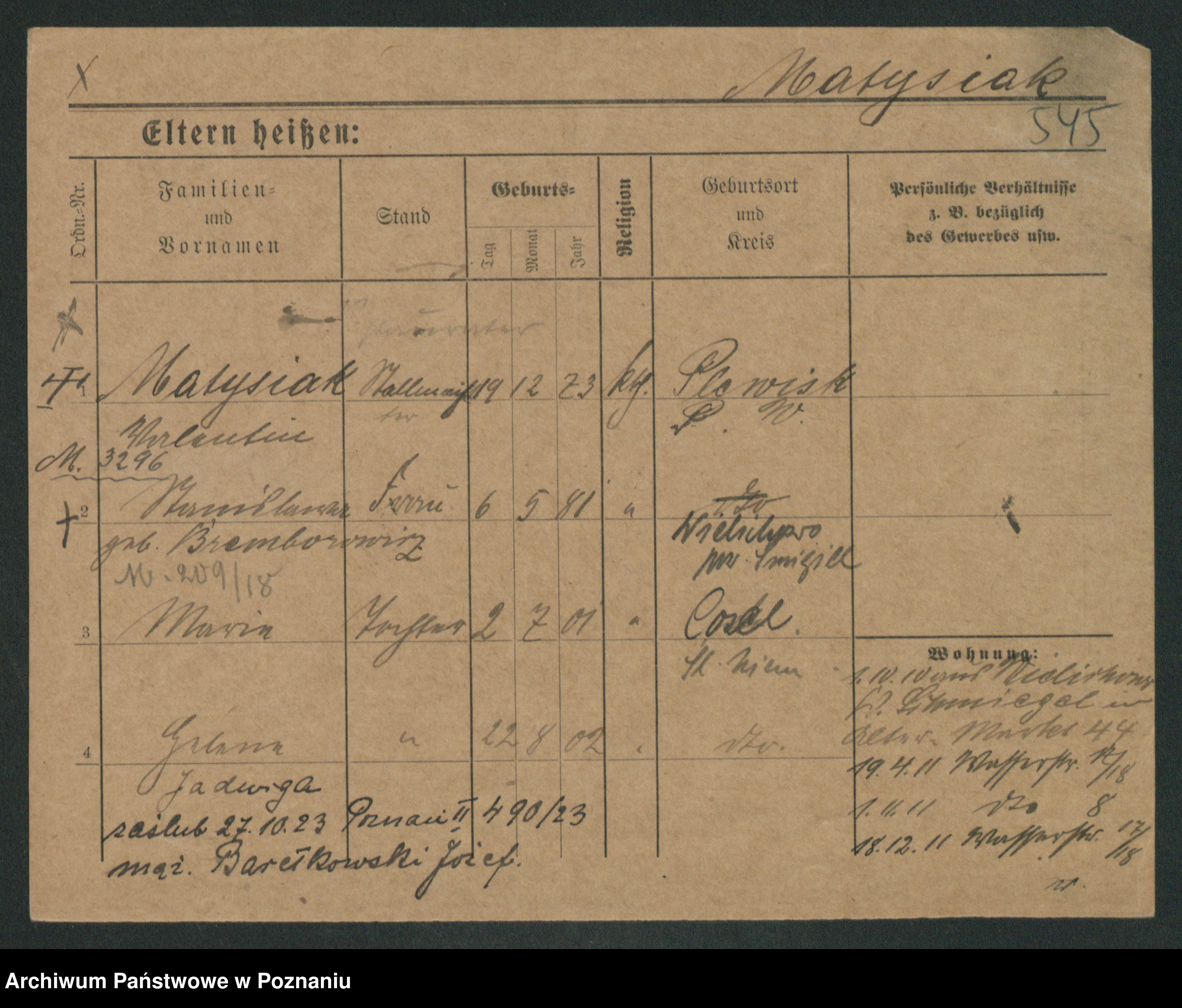 Podgląd karty osobowej dostępny jest po kliknięciu na nazwisko lub ikonkę karty. Można dokonywać powiększenia (ikony na górze) lub przechodzić między kolejnymi skanami (strzałki po bokach).