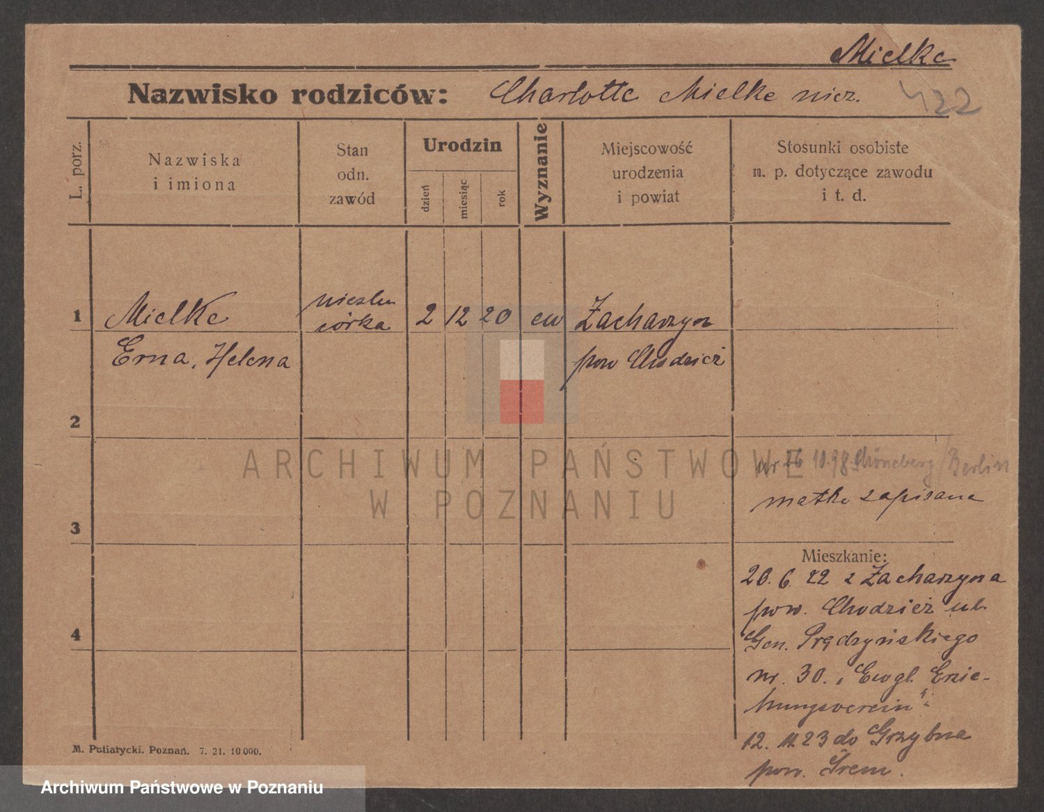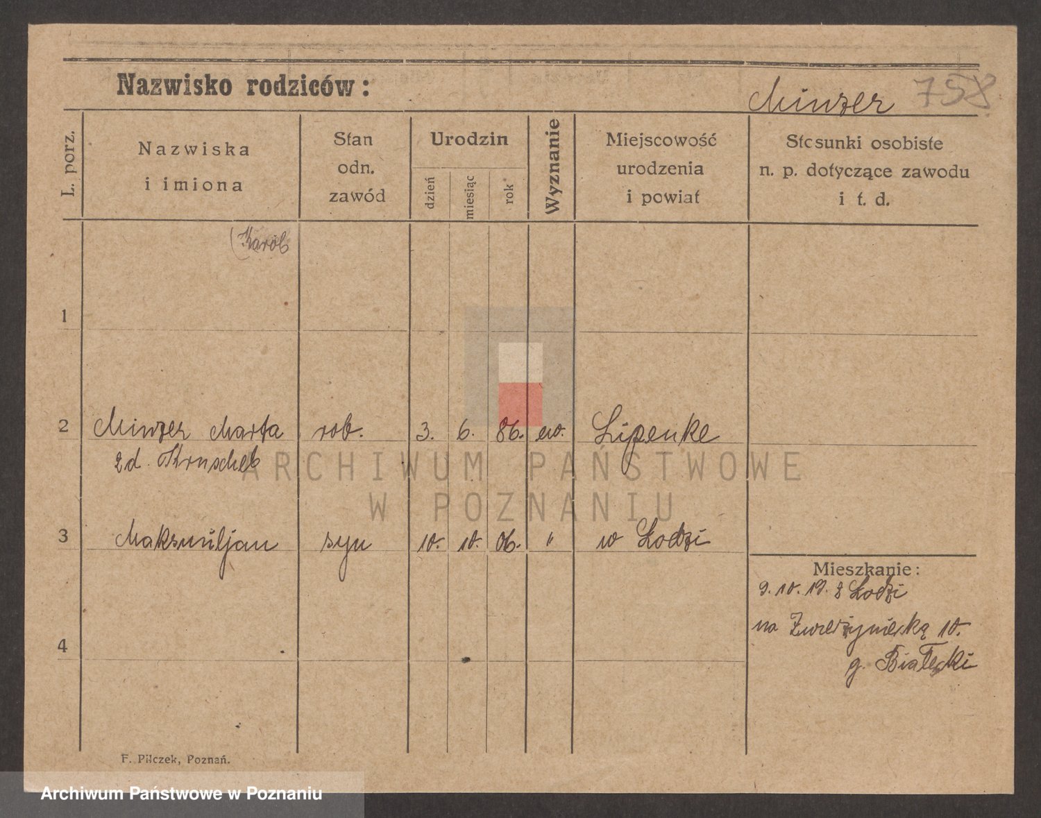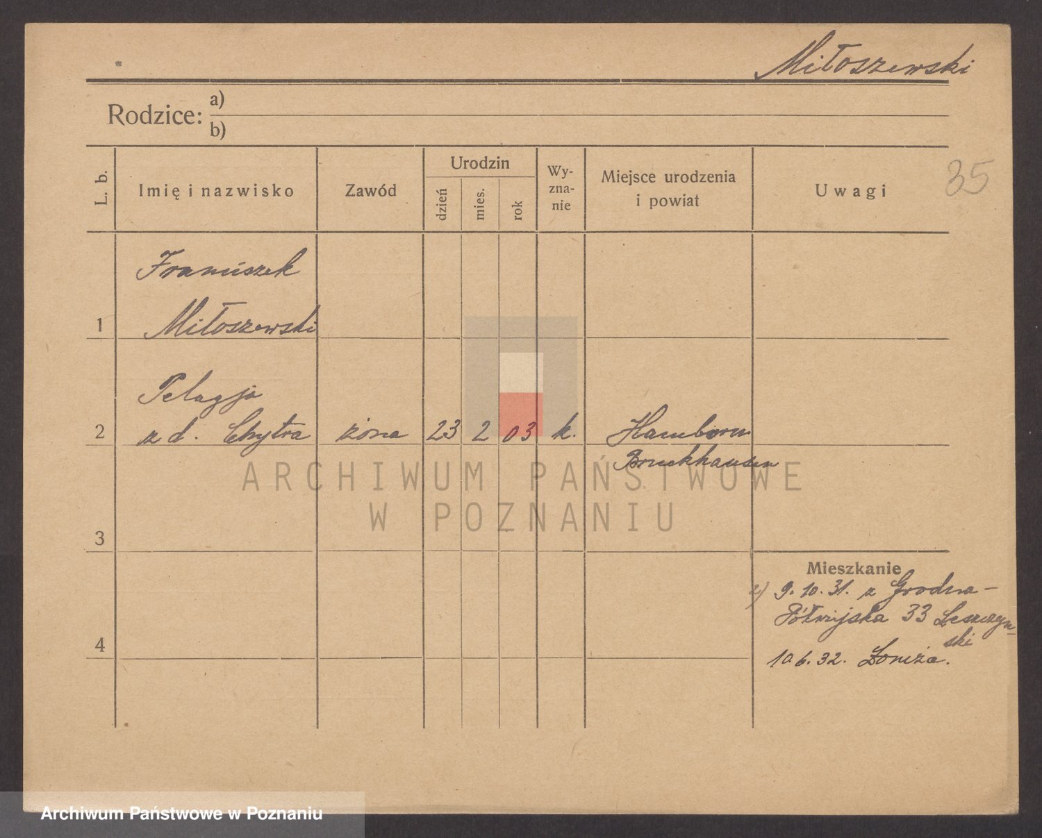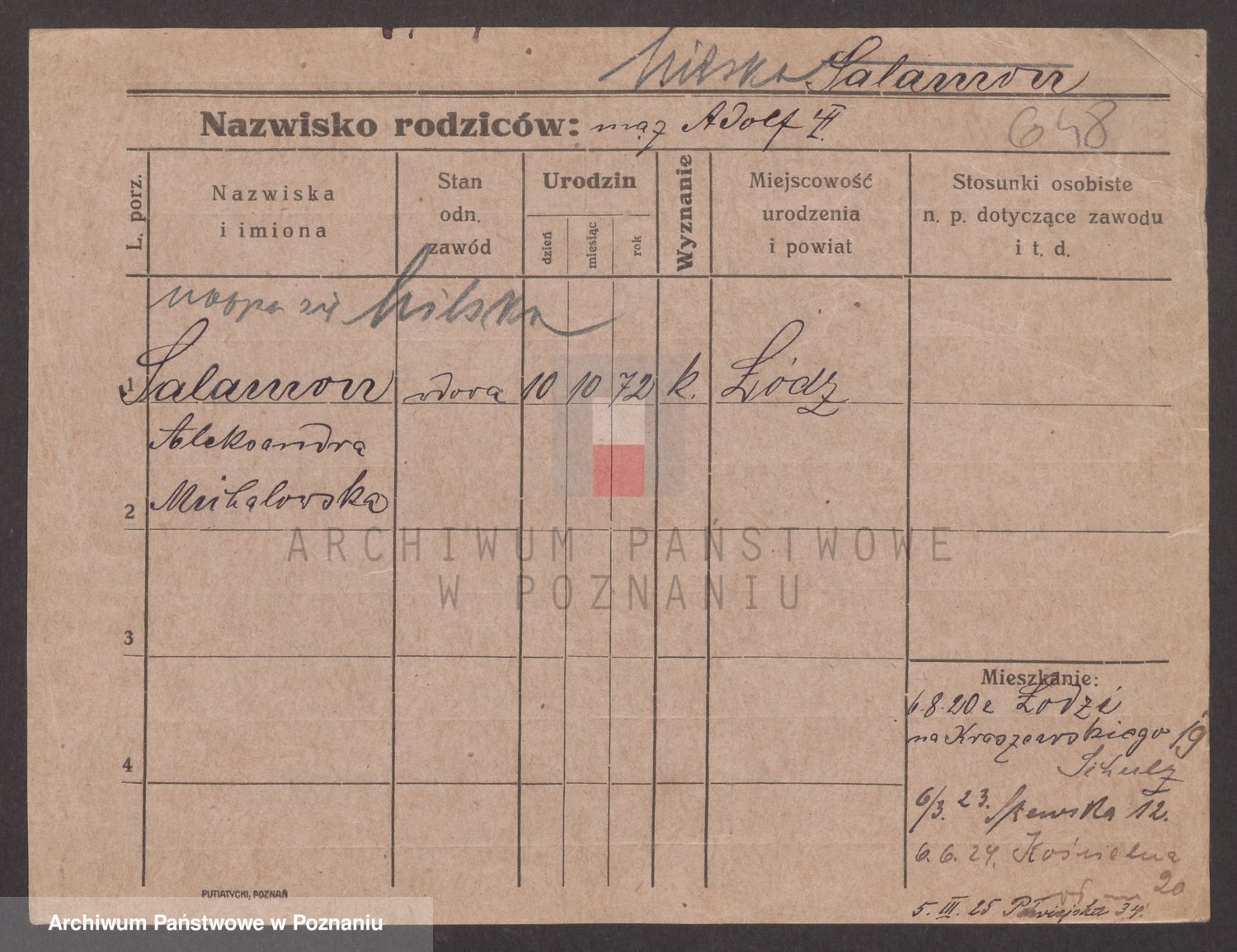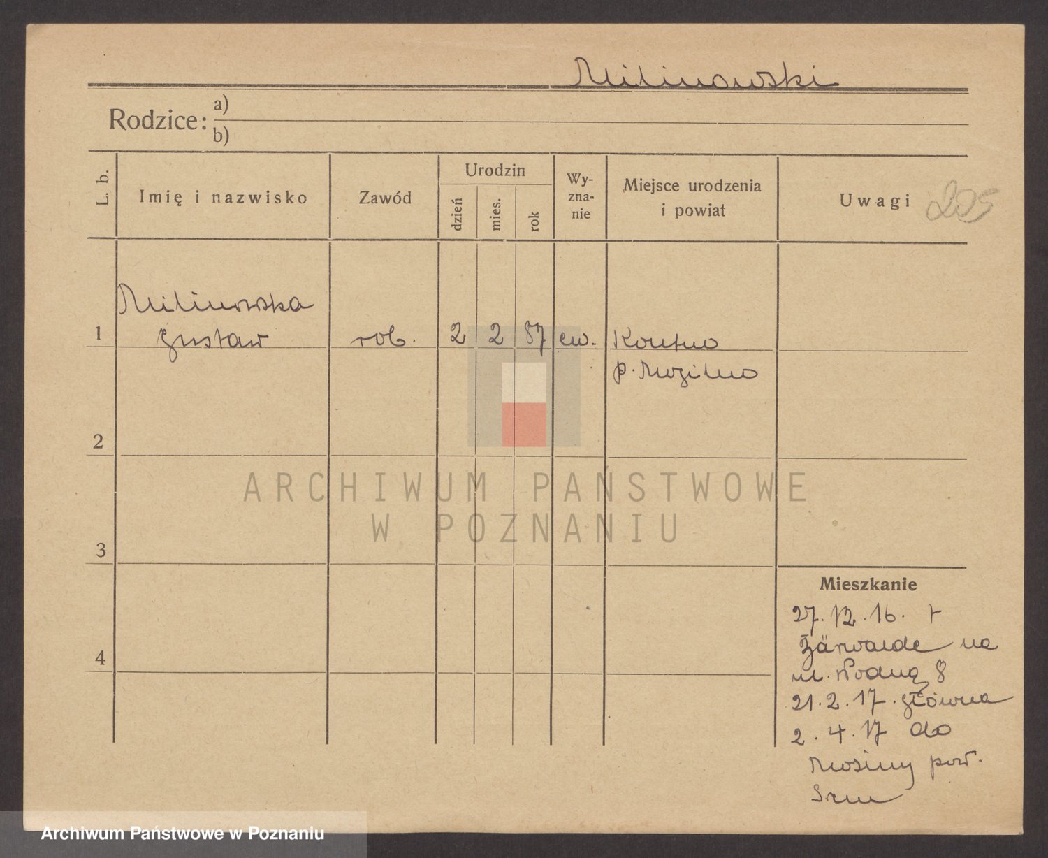 Podgląd karty osobowej dostępny jest po kliknięciu na nazwisko lub ikonkę karty. Można dokonywać powiększenia (ikony na górze) lub przechodzić między kolejnymi skanami (strzałki po bokach).